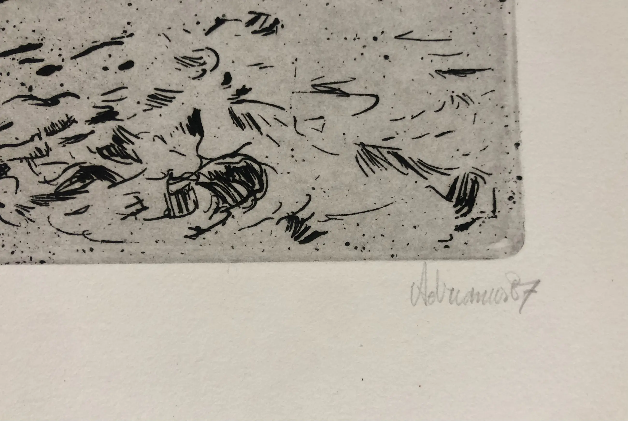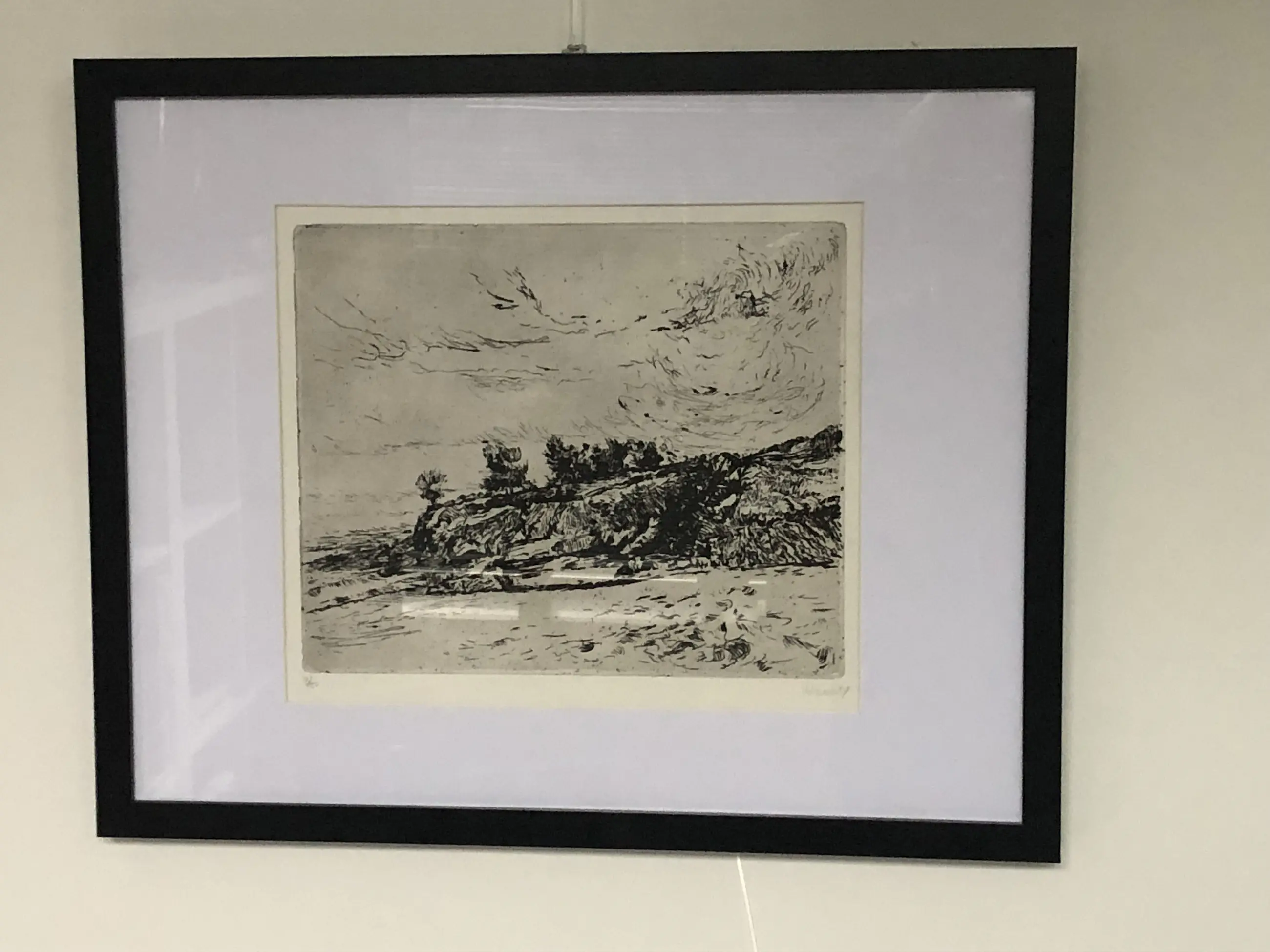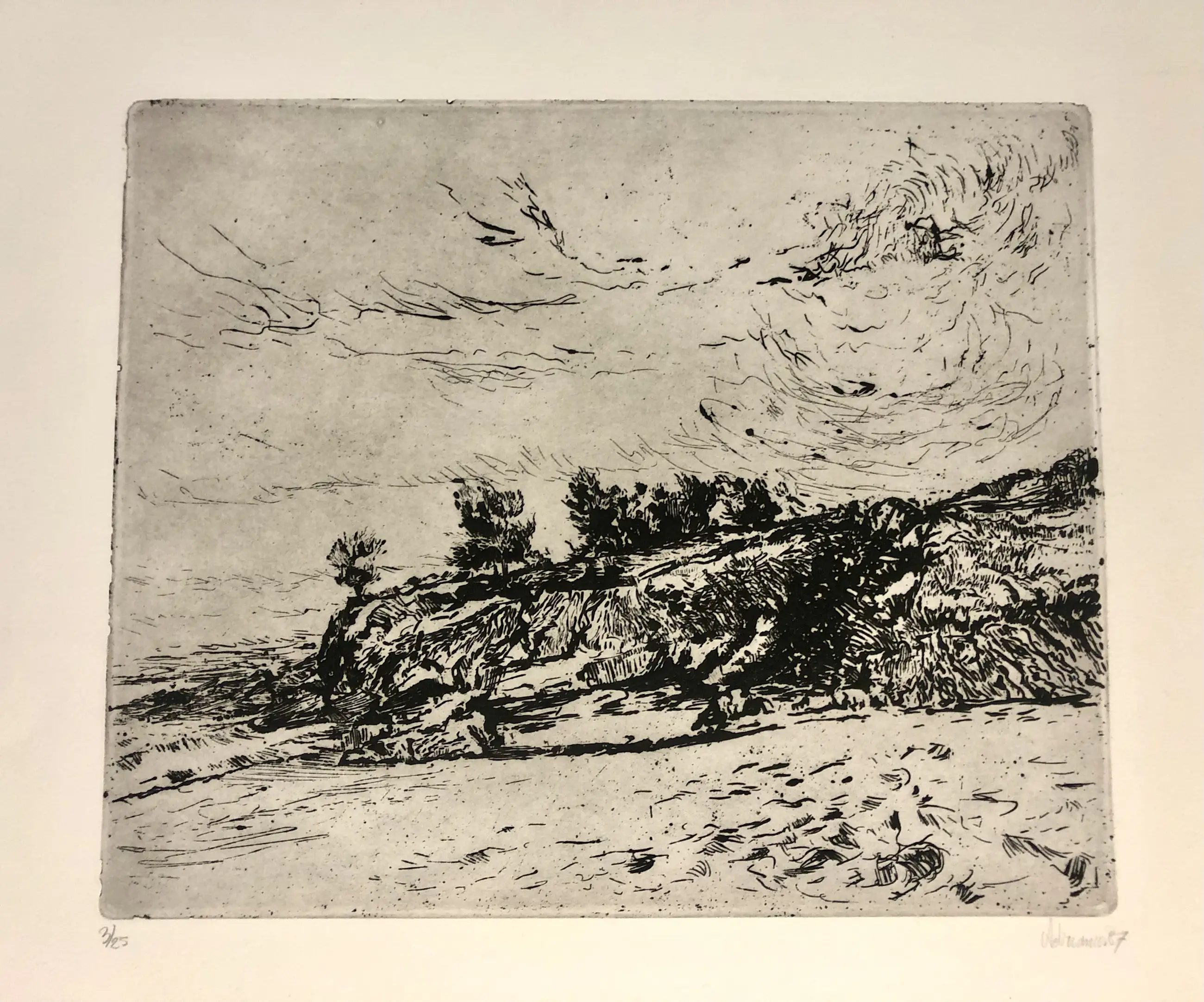 Prachtig ruig Spaans landschap in kleine oplage, gevat in nette houten lijst en passe-partout. Tijdens zijn academietijd aan de Academie voor Beeldende Kunsten in Utrecht (1979-1984) bekwaamt Adri Dijkhorst zich onder meer in het maken van diepdrukken, zinketsen en kopergravures. Na zijn opleiding aan de kunstacademie gaat hij zich vooral toeleggen op het schilderen van landschappen in olieverf.