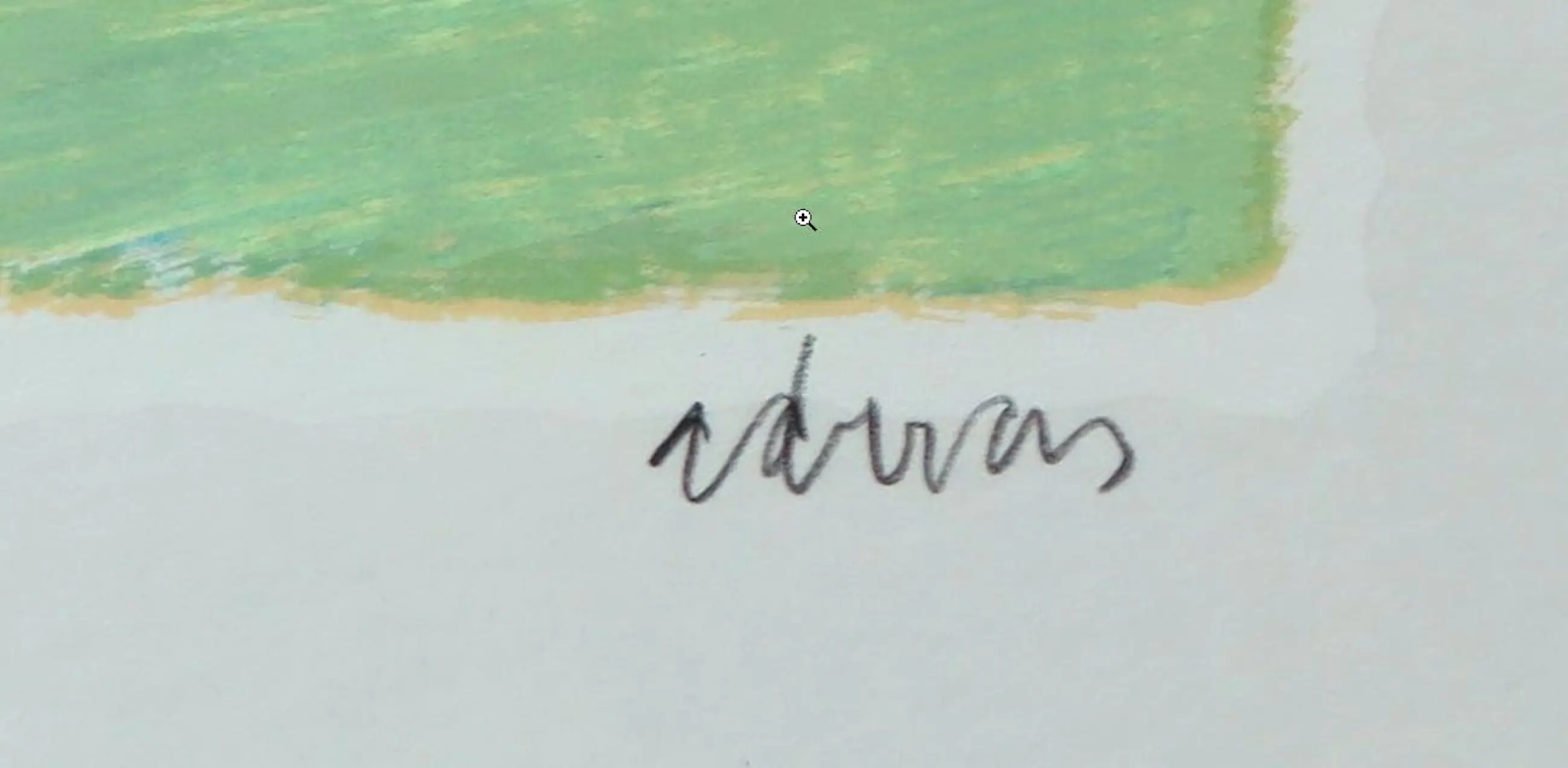 Zeeefdruk bobbelt licht en heeft een potlood kleurig streep (+- 7 cm) tussen de passe-partout en zeefdruk in op het papier links onder. De zeefdruk is zeer goede staat.