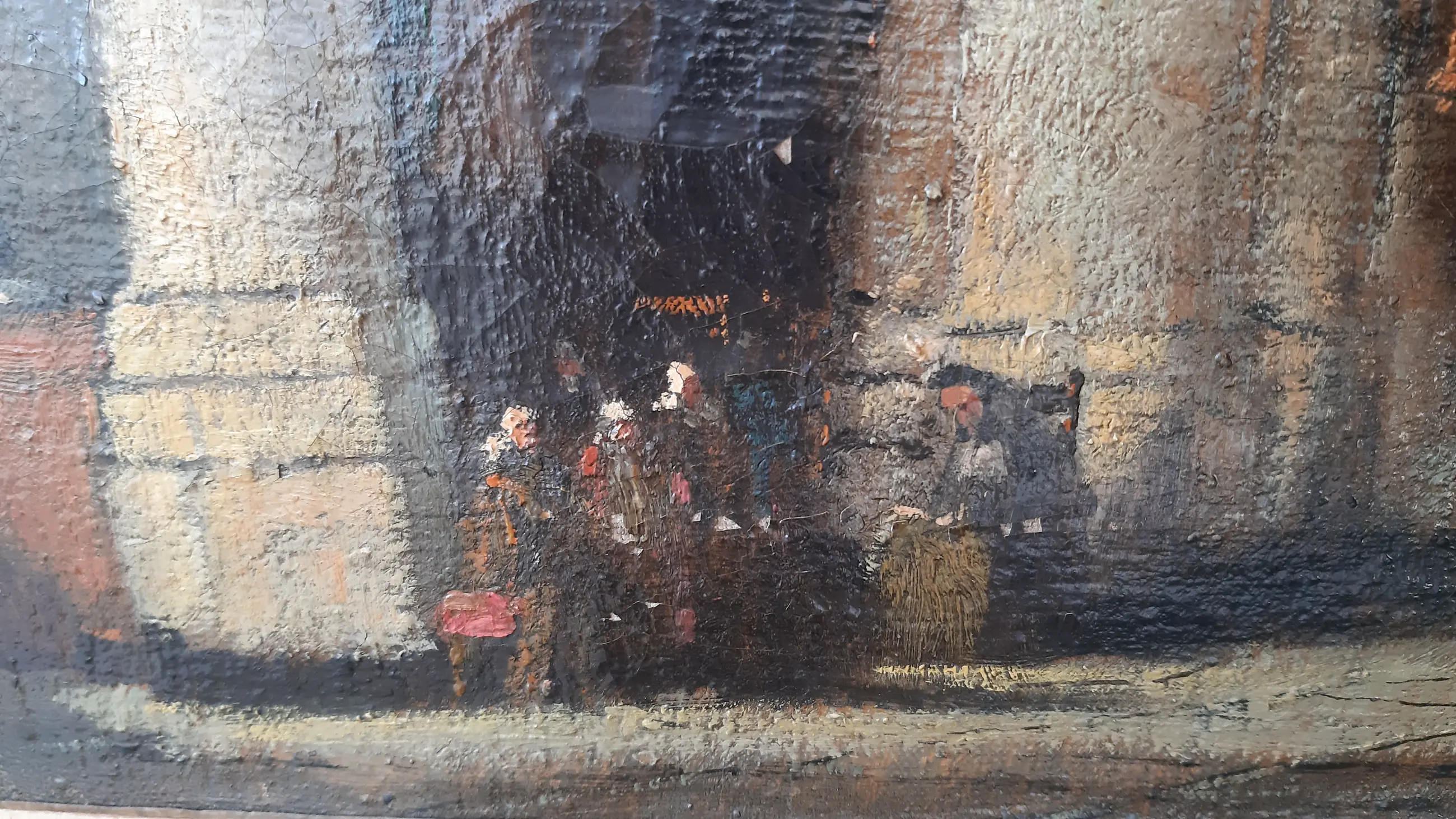 Het schilderij oogt wat donker, maar de details zijn sprankelend, zoals de witte mutsen van de nietige vrouwenfiguurtjes en het heldere blauw en groen van de buitenwereld achter de ramen.