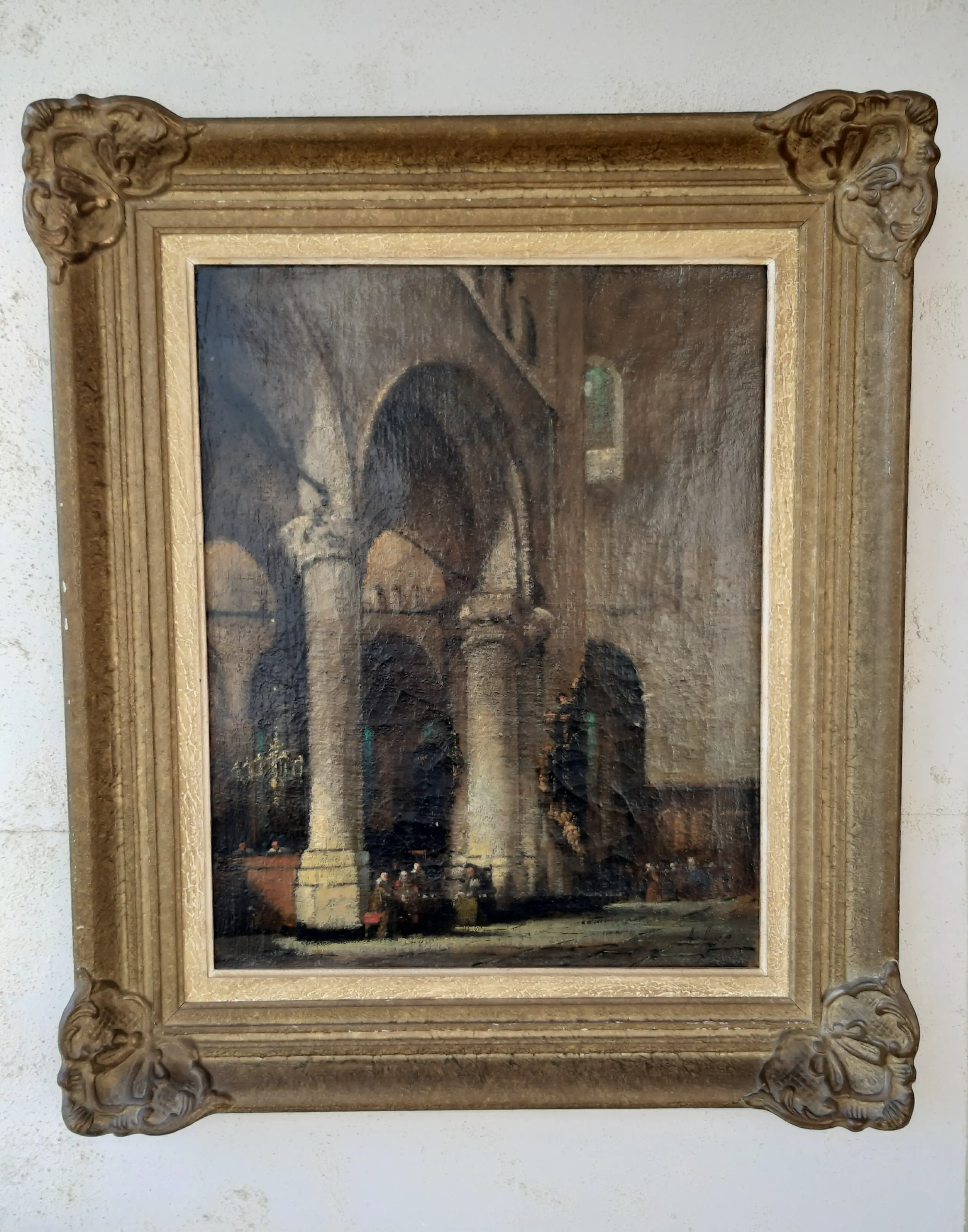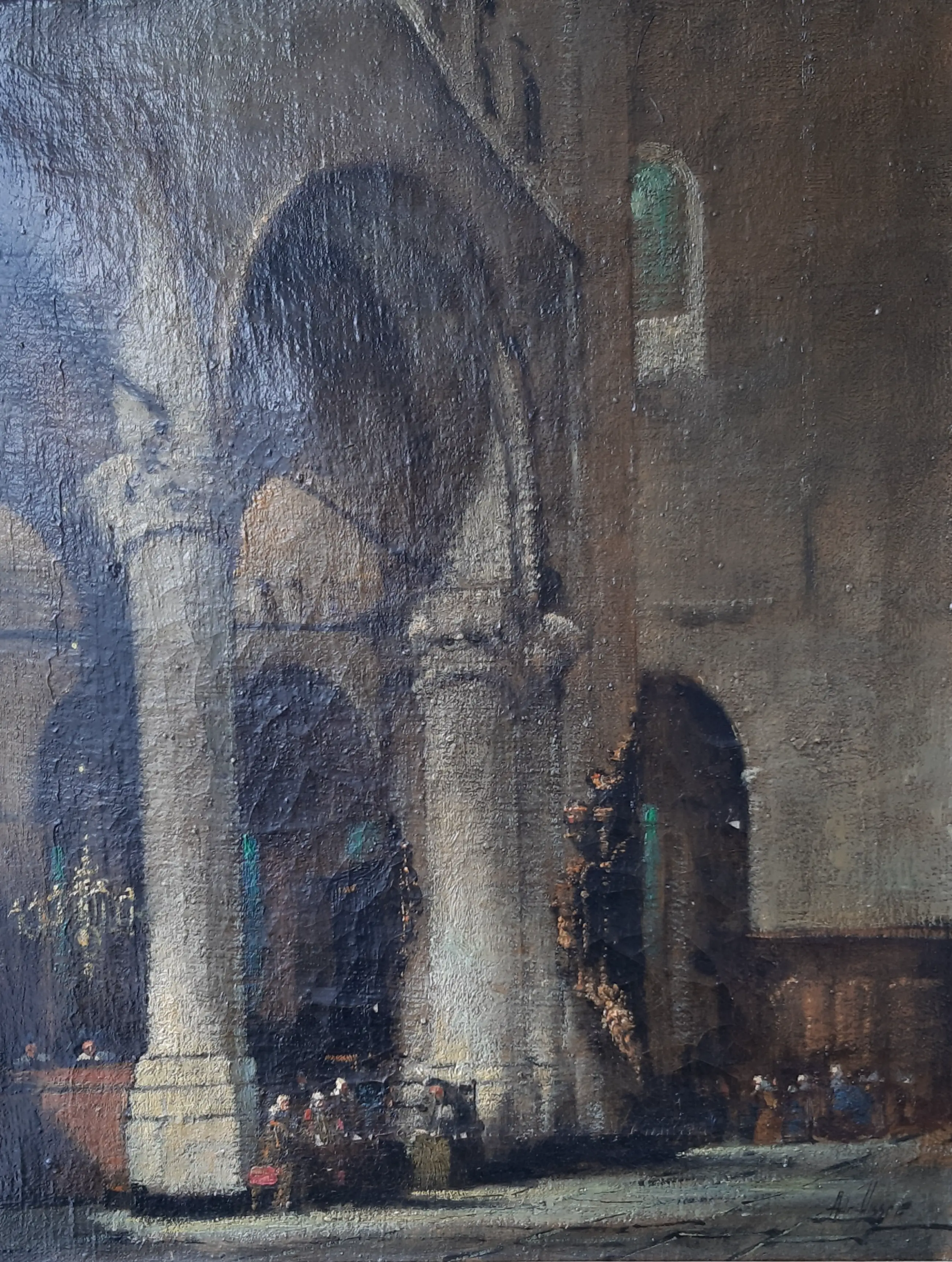 Dit is een van de kerkinterieurs waarmee Adri Visser zijn bekendheid verwierf. In de imposante kerkarchitectuur met de zware zuilen en de bogen haaks op de hoge achtermuur, ogen de mensfiguurtjes nietig, aangegeven met enkele toetsjes verf. Vooral het wit van de mutsen van de vrouwen springt eruit. In de achtermuur van de kerk zorgt een enkel raam voor helder licht met blauw en groen van de buitenwereld voor de levendigheid in de verder statige compositie. Maar ook de kroonluchter is flonkerend detail.