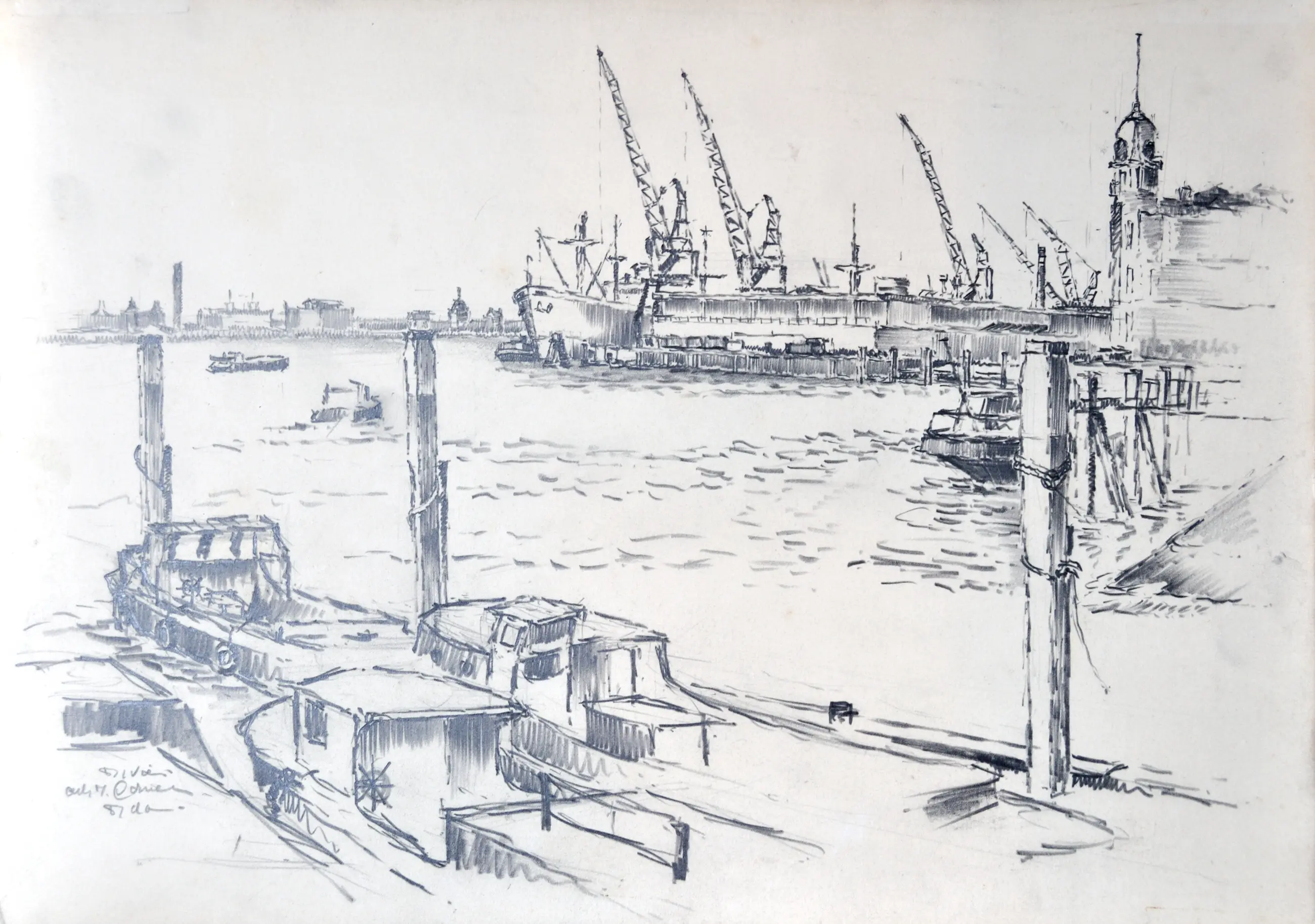 Havengezicht in Rotterdam - gesigneerde potloodtekening - begin jaren '50