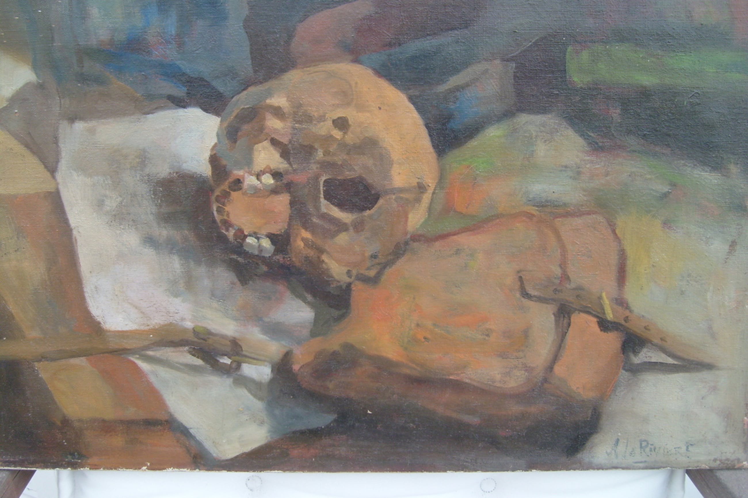 afm. 41x57 / zonder lijst. Het werk "Stilleven met schedel, tas en hoed / 1910./ r.o.gesigneerd