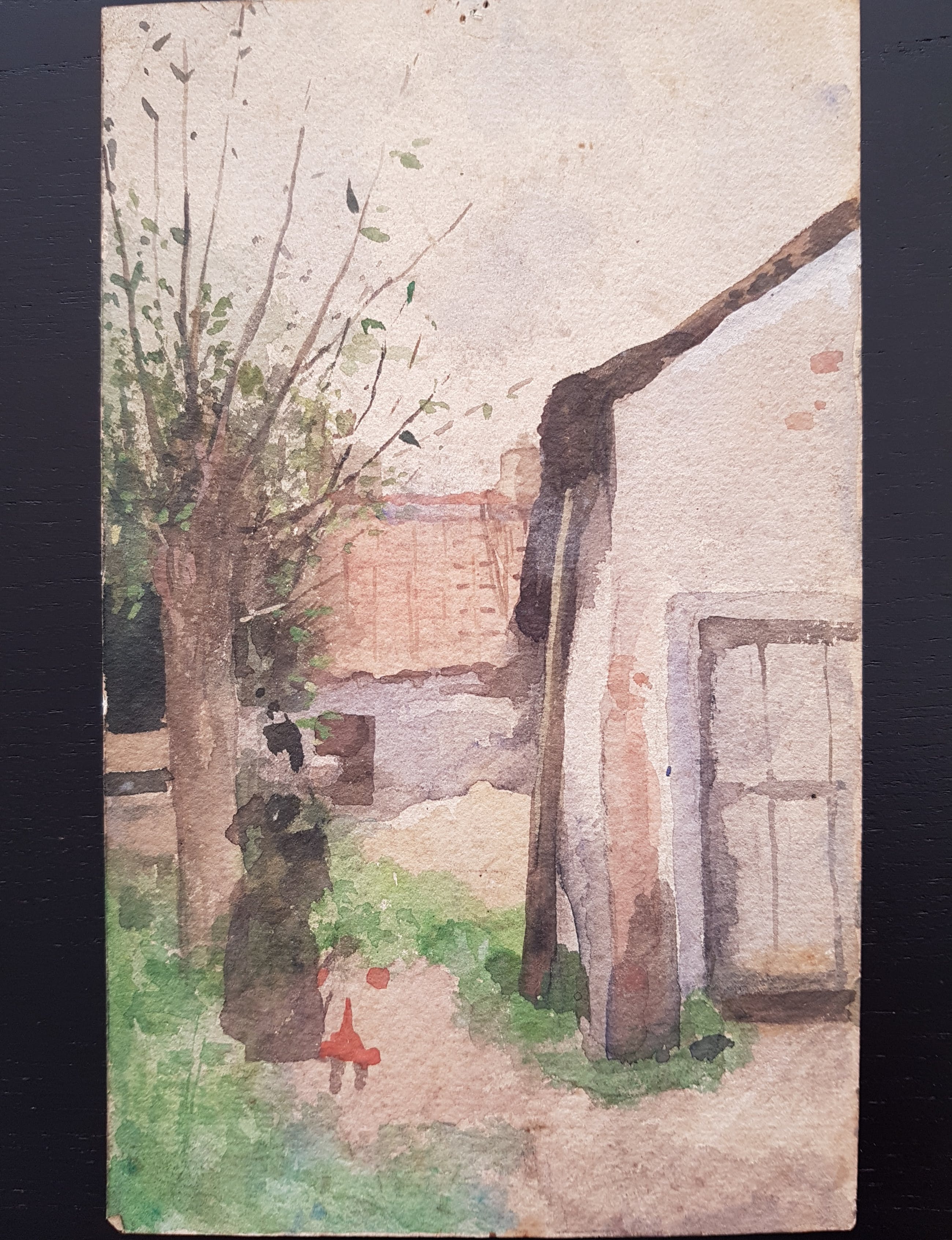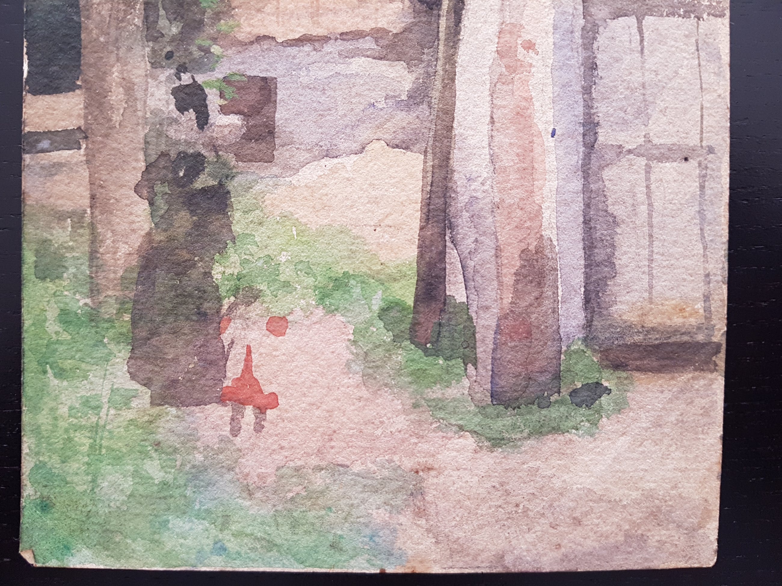 Adriaan la Rivière's Vrouw met hondje bij een boerderij is een vlot opgezet impressionistisch aquarel.
