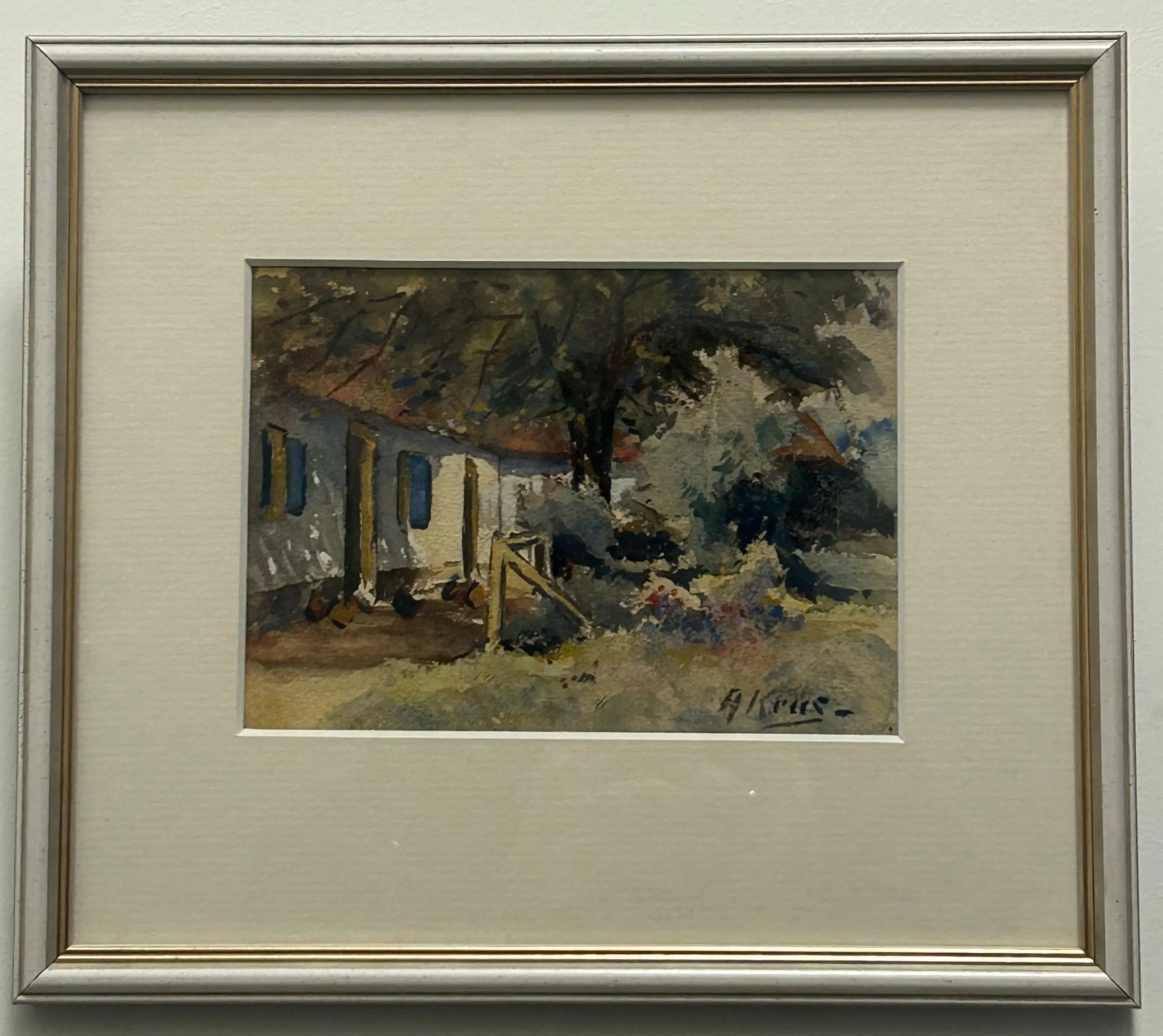 Aquarel van Adriaan Keus met een aanzicht van een boerderij en een stukje omliggend landschap, waarin kippen zijn weergegeven. Het werk is geplaatst achter een passe-partout en ingelijst in een strak wit-grijs frame met een subtiel goudkleurig randje.