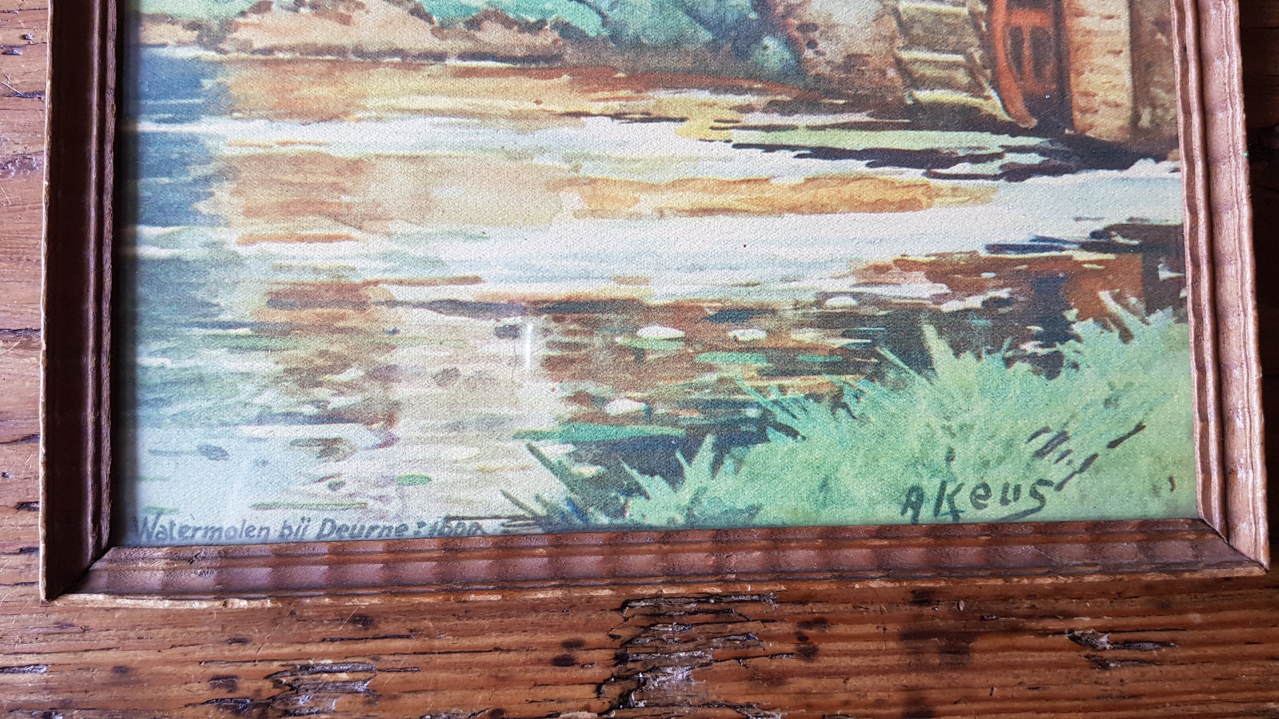 Mooi schilderijtje van Adriaan Keus.De watermolen in Deurne (Noord Brabant).Ingelijst door L.F. v.d. Hurk in Bergen op Zoom.