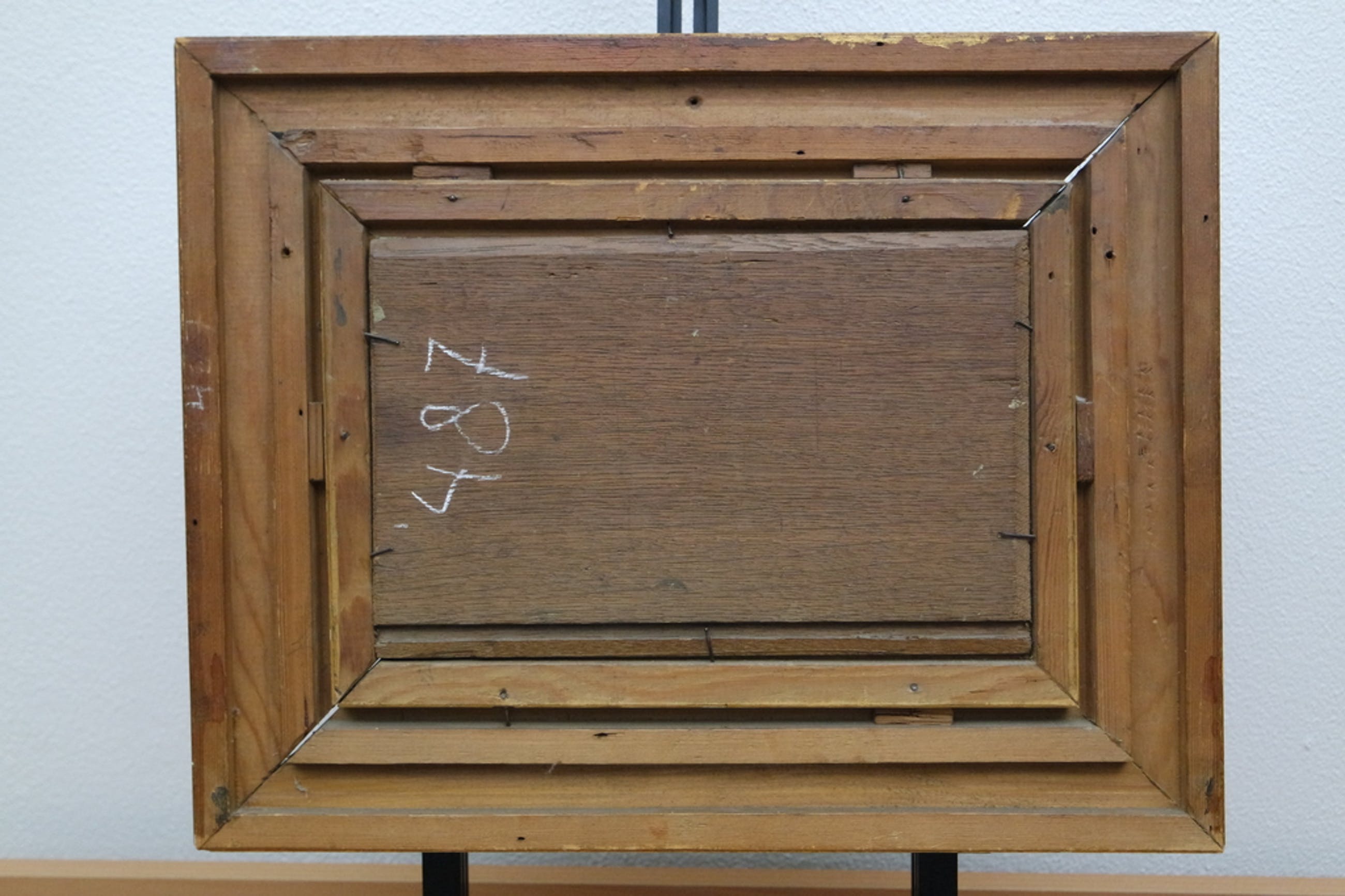 Afmetingen paneel: 27,5 cm. x 17,5 cm. , met lijst 44 cm. x 34 cm. Conditie: goed. In het paneel zit een haarfijn horizontaal scheurtje. Dit is echter niet storend. Het schilderij wordt verzekerd verzonden. Afhalen is ook een mogelijkheid.