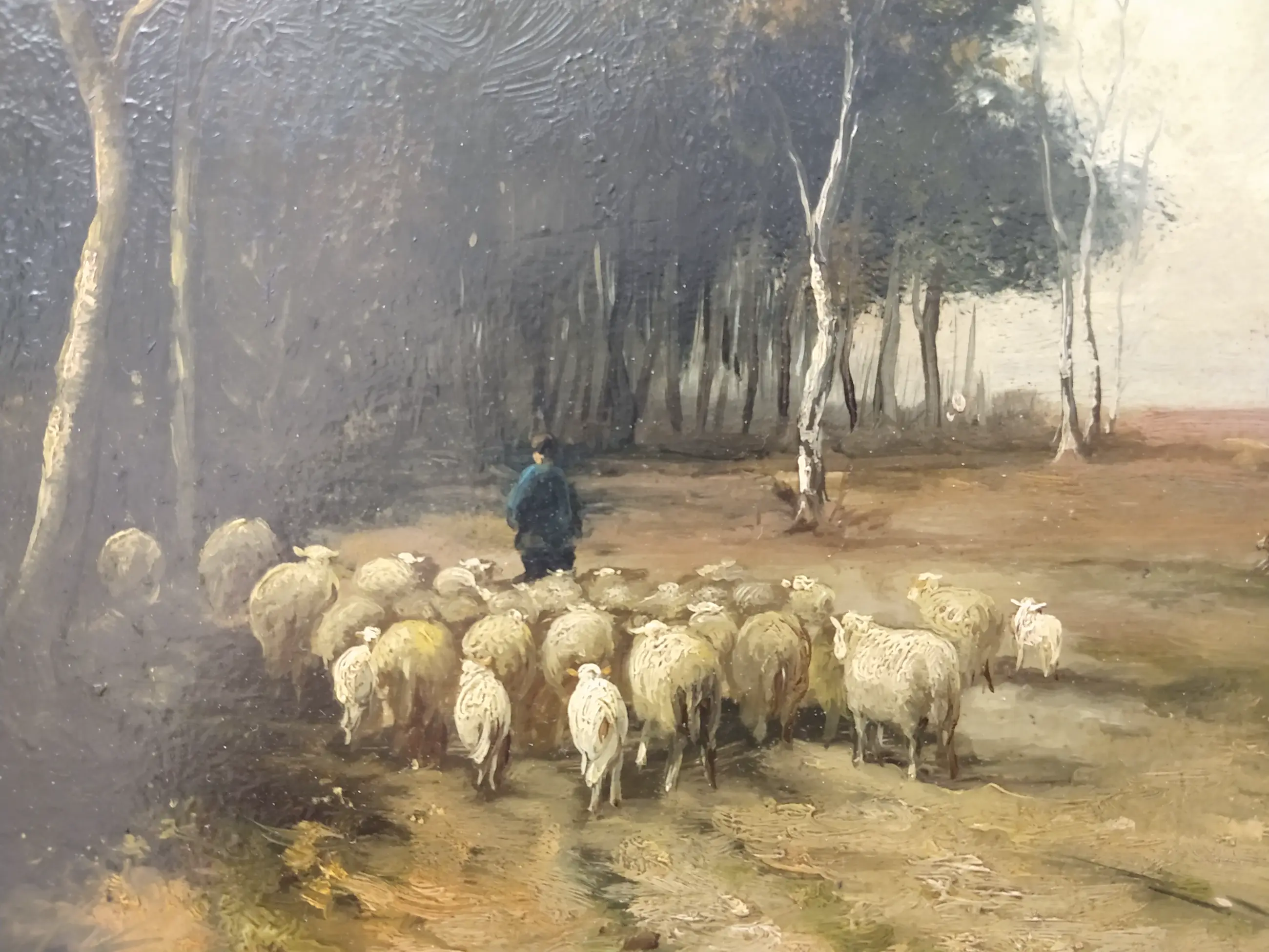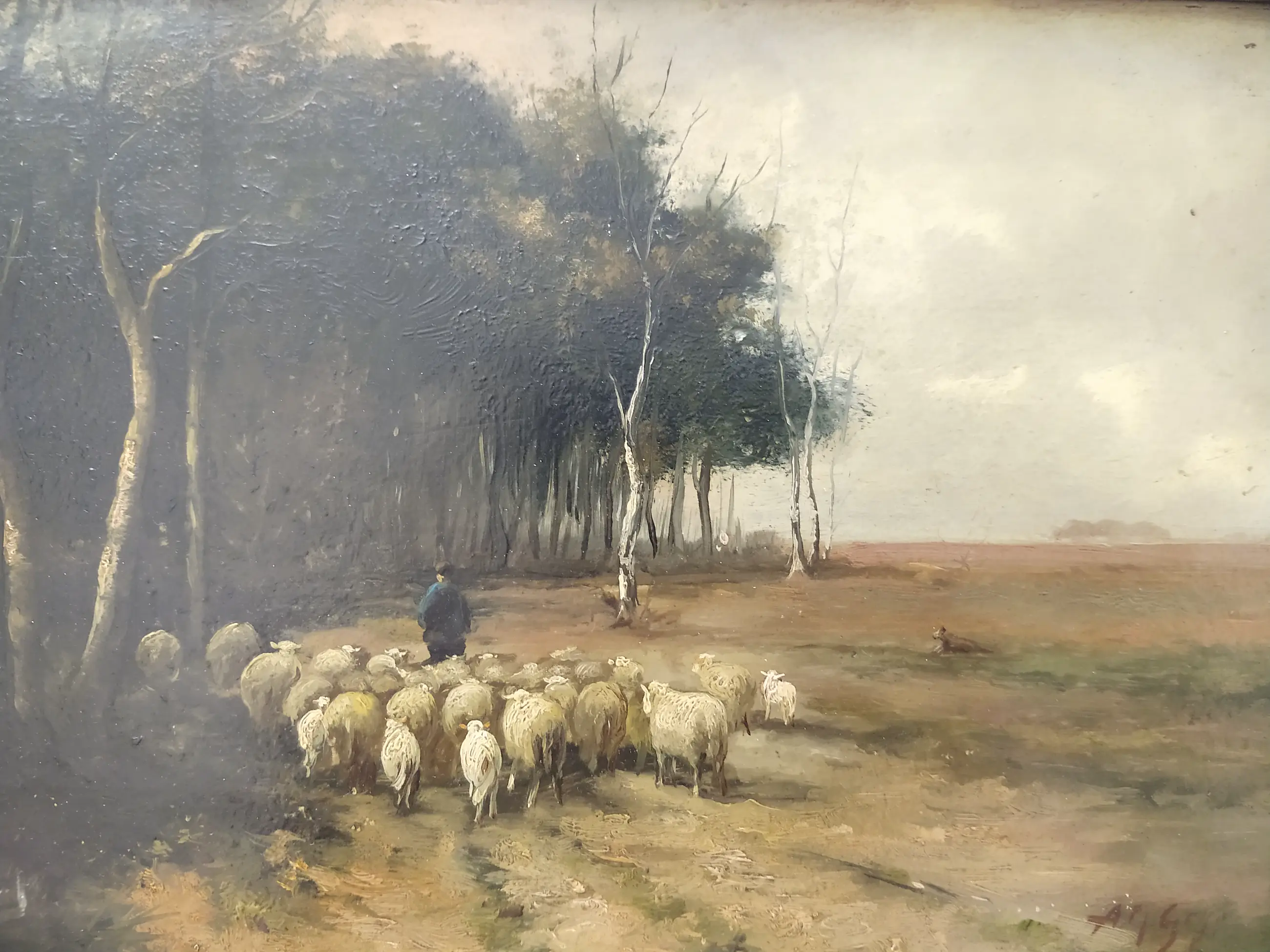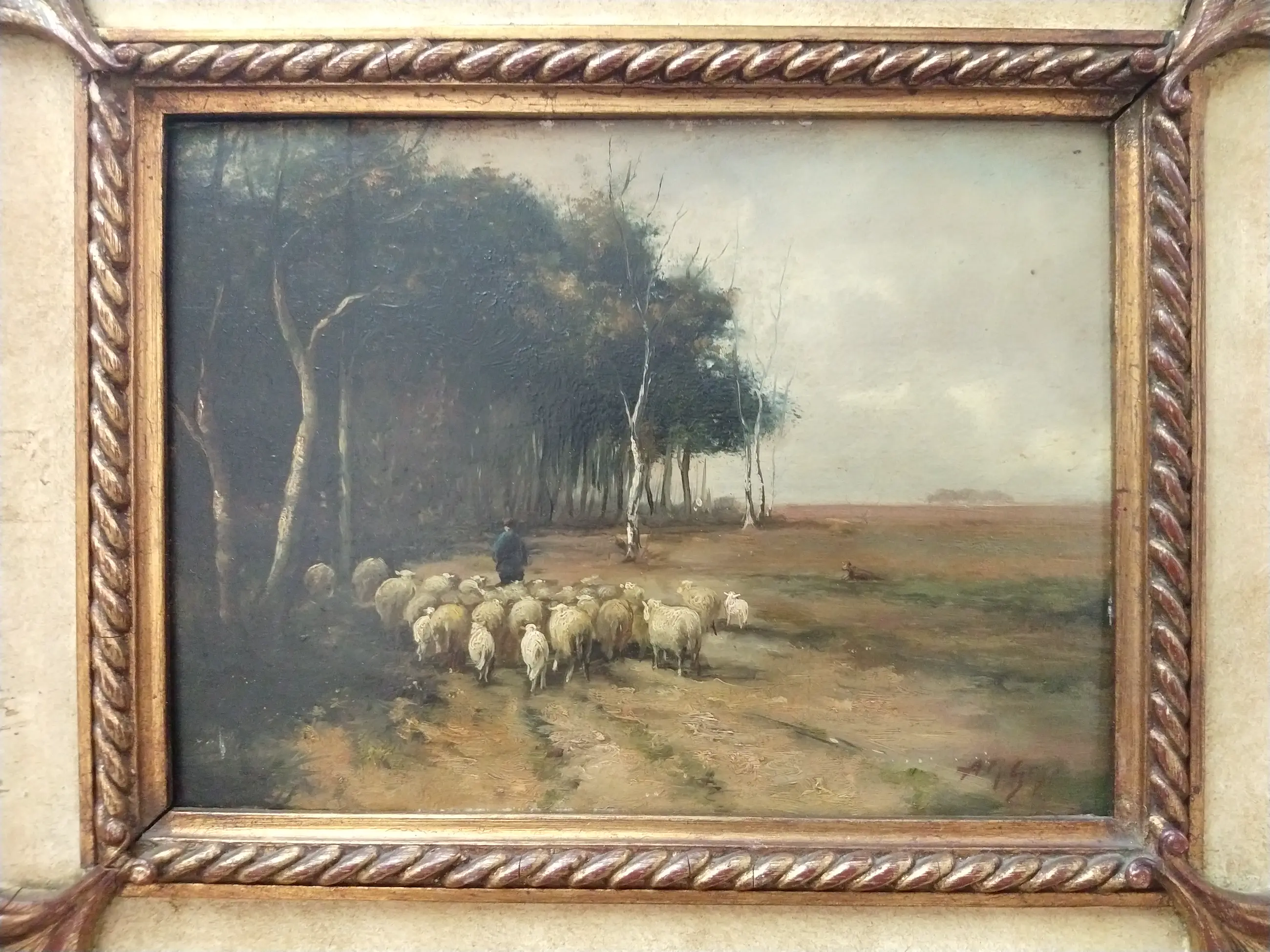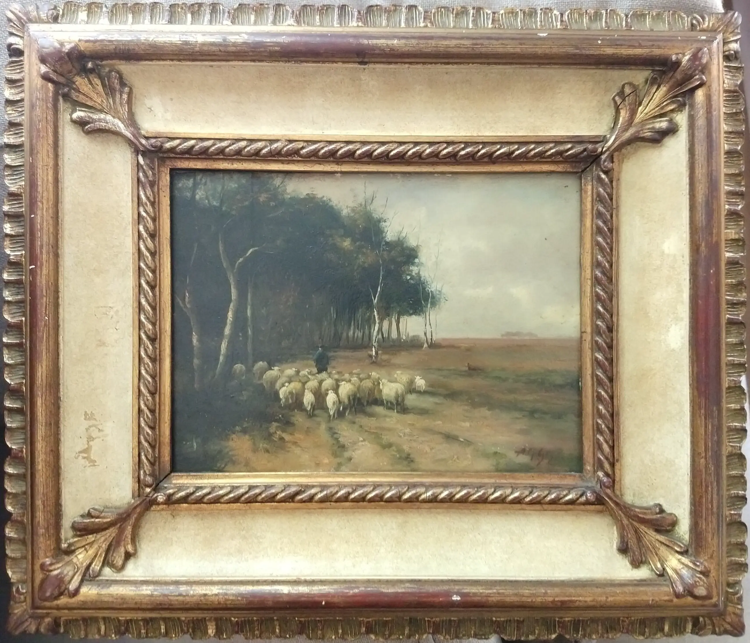 Am Geijp (1855-1926). Schaapsherder met kudde. Gesigneerd. Olieverf op paneel. Het schilderij is geplaatst in de originele lijst met paarlemoerkleurige binnenrand. Het schilderij en de lijst zijn in goede staat. Afmetingen: Inclusief lijst 35x40 cm. Exclusief lijst 18x24 cm.