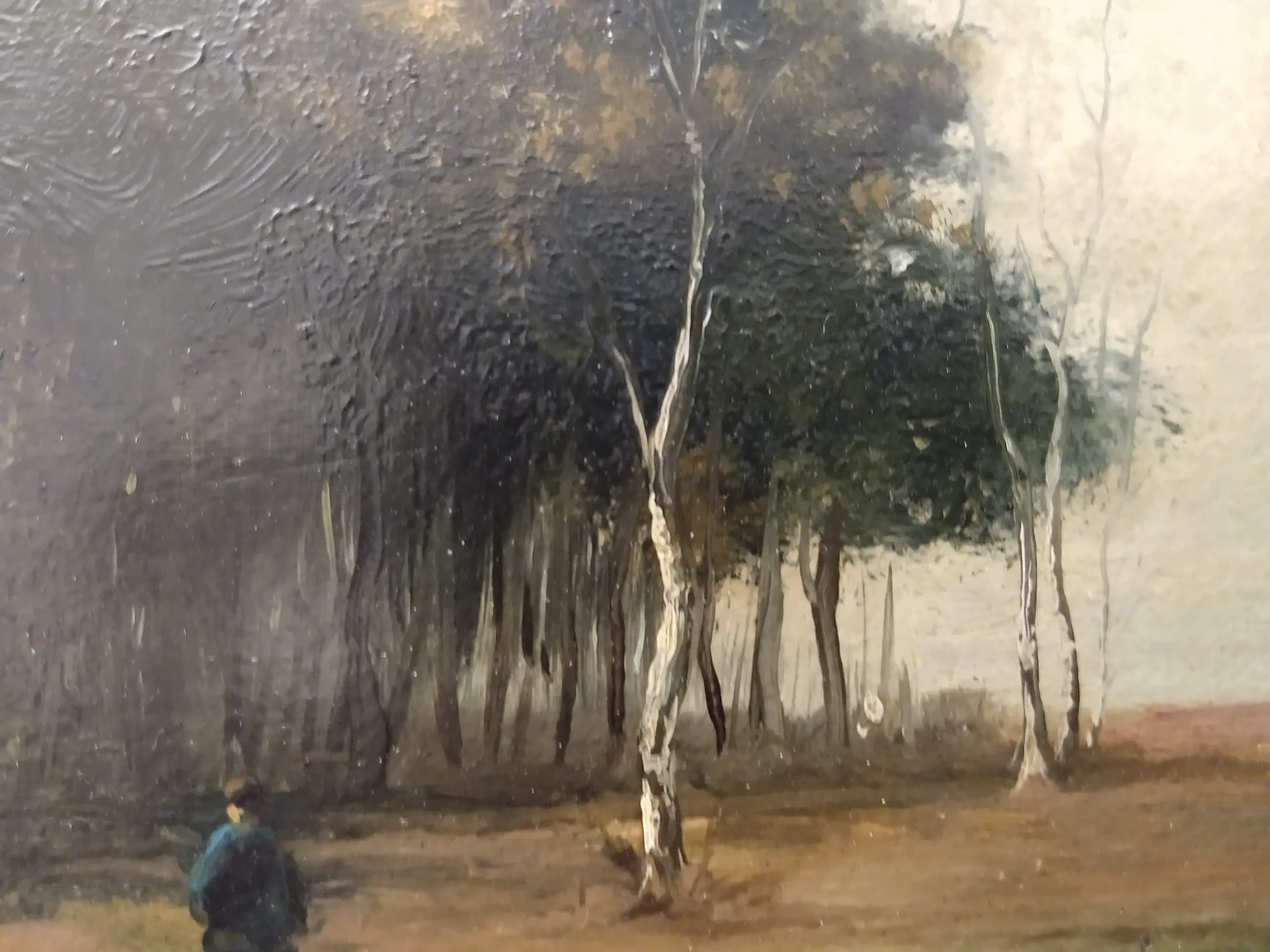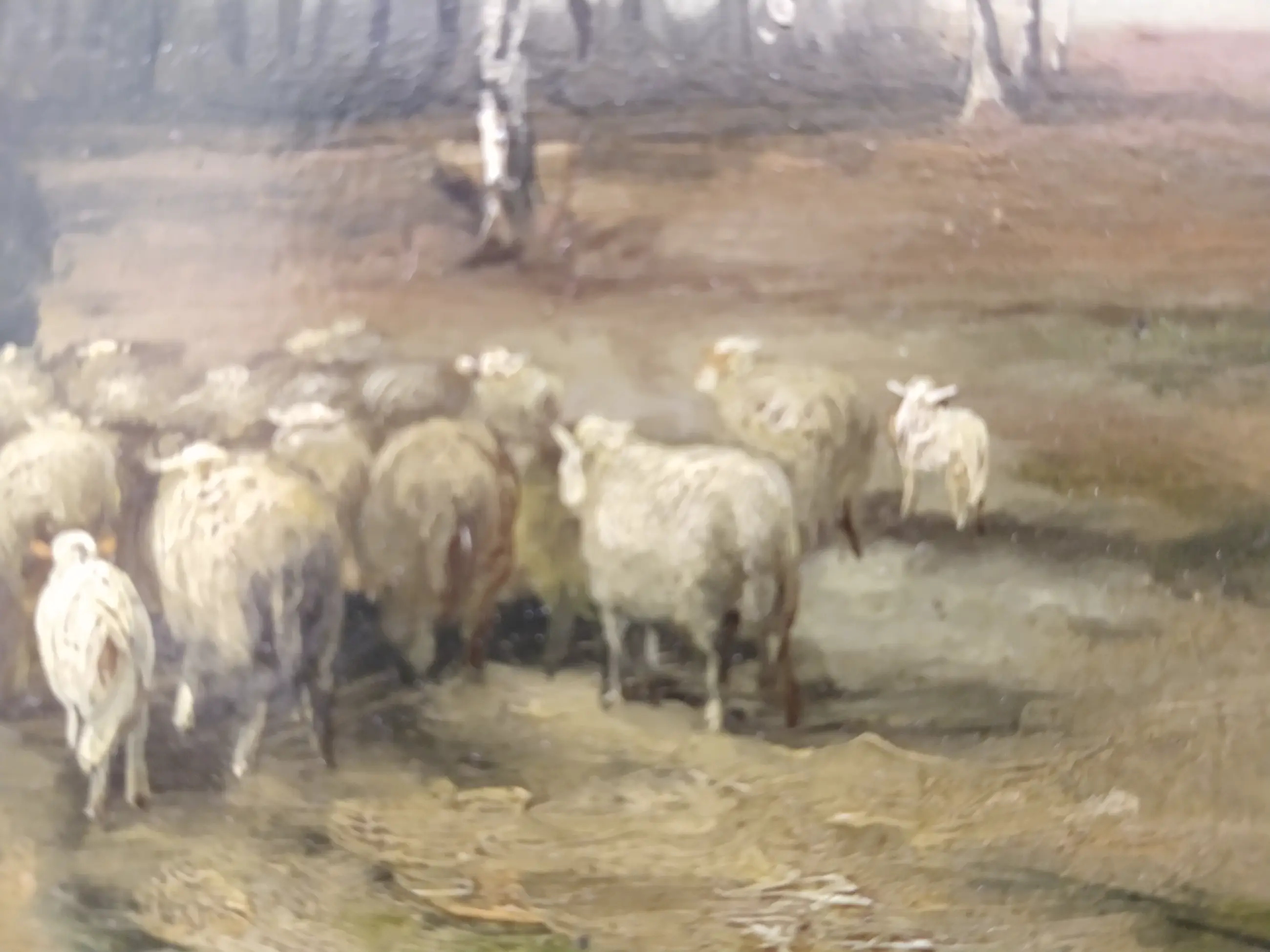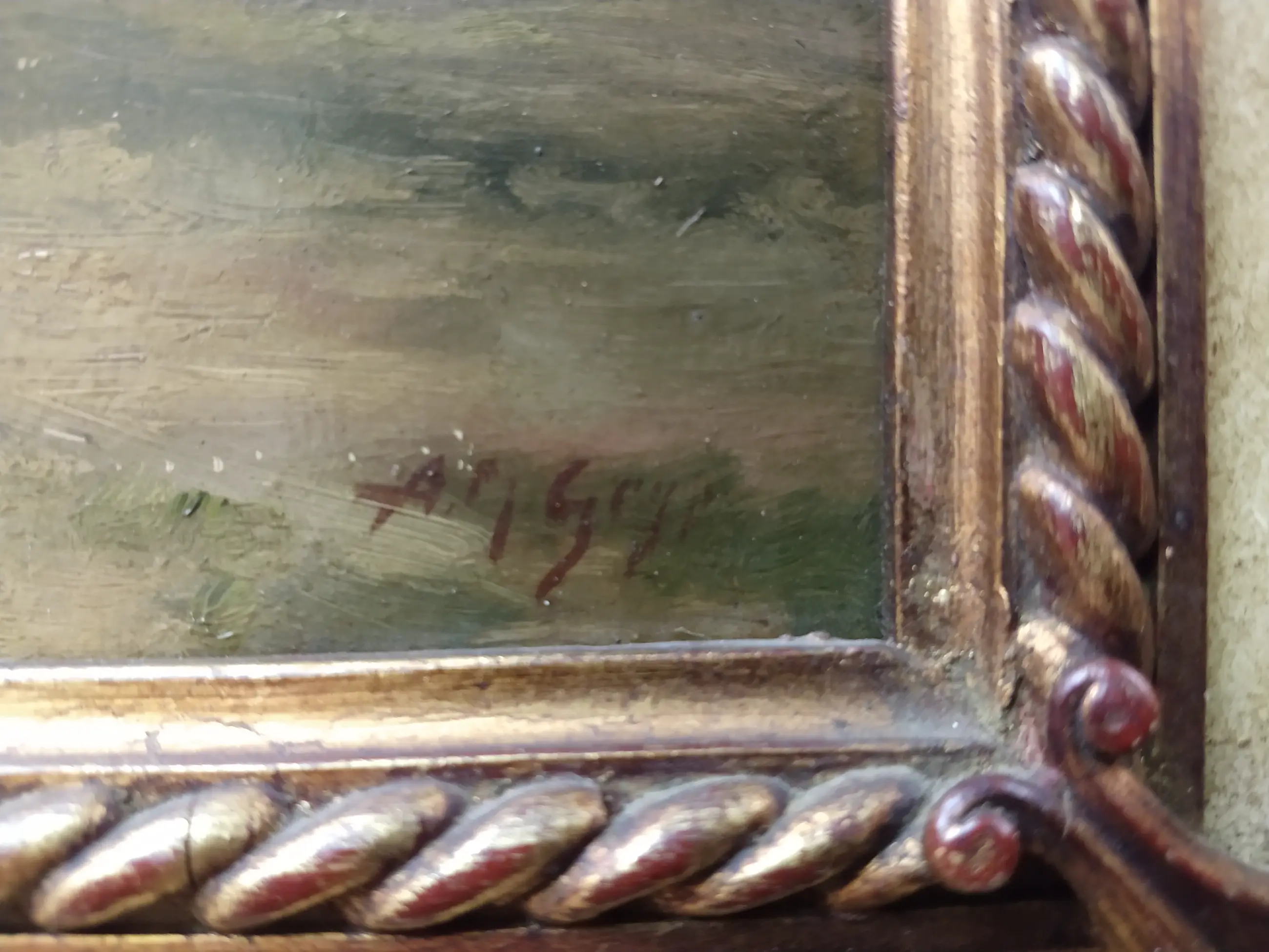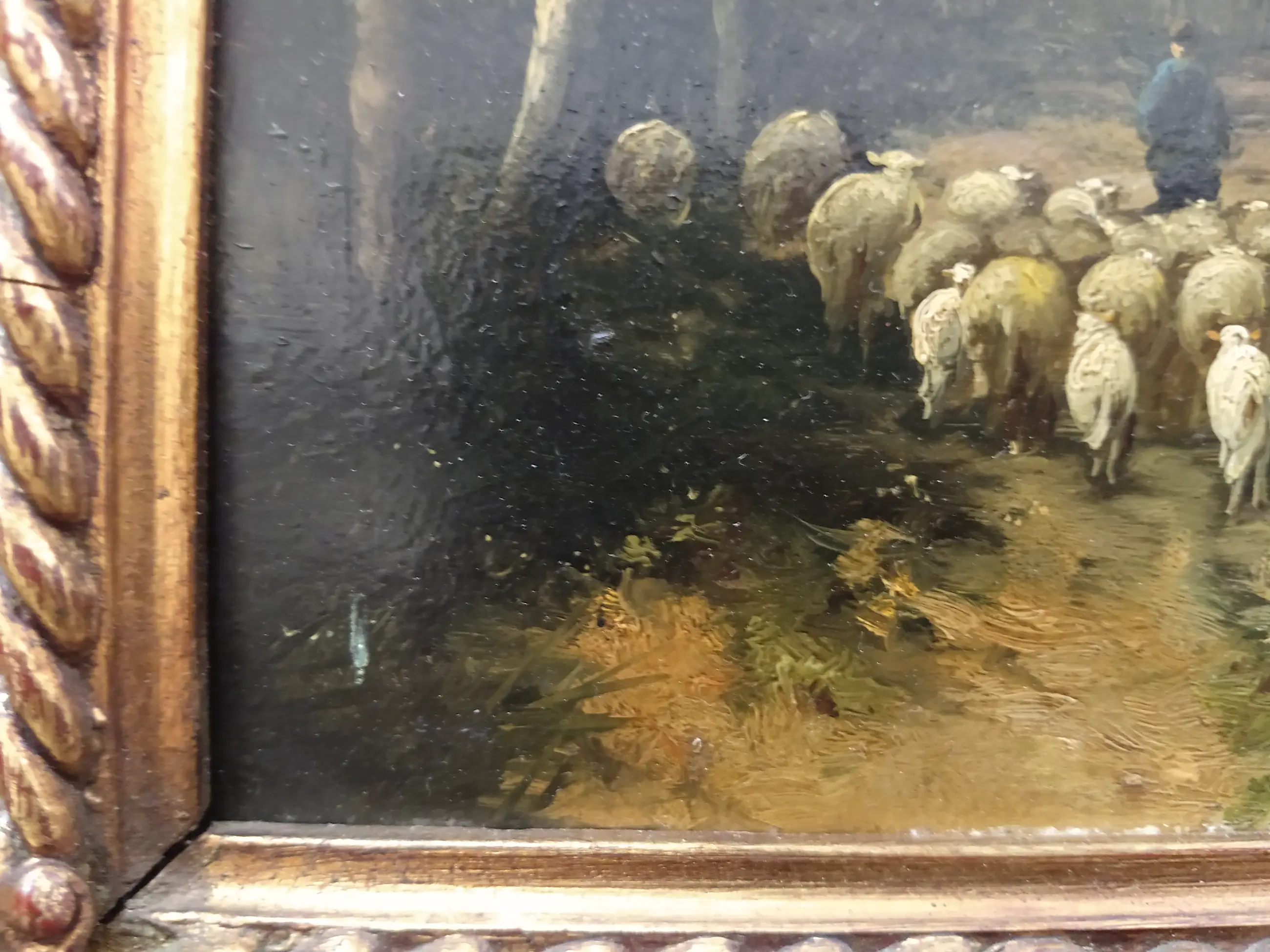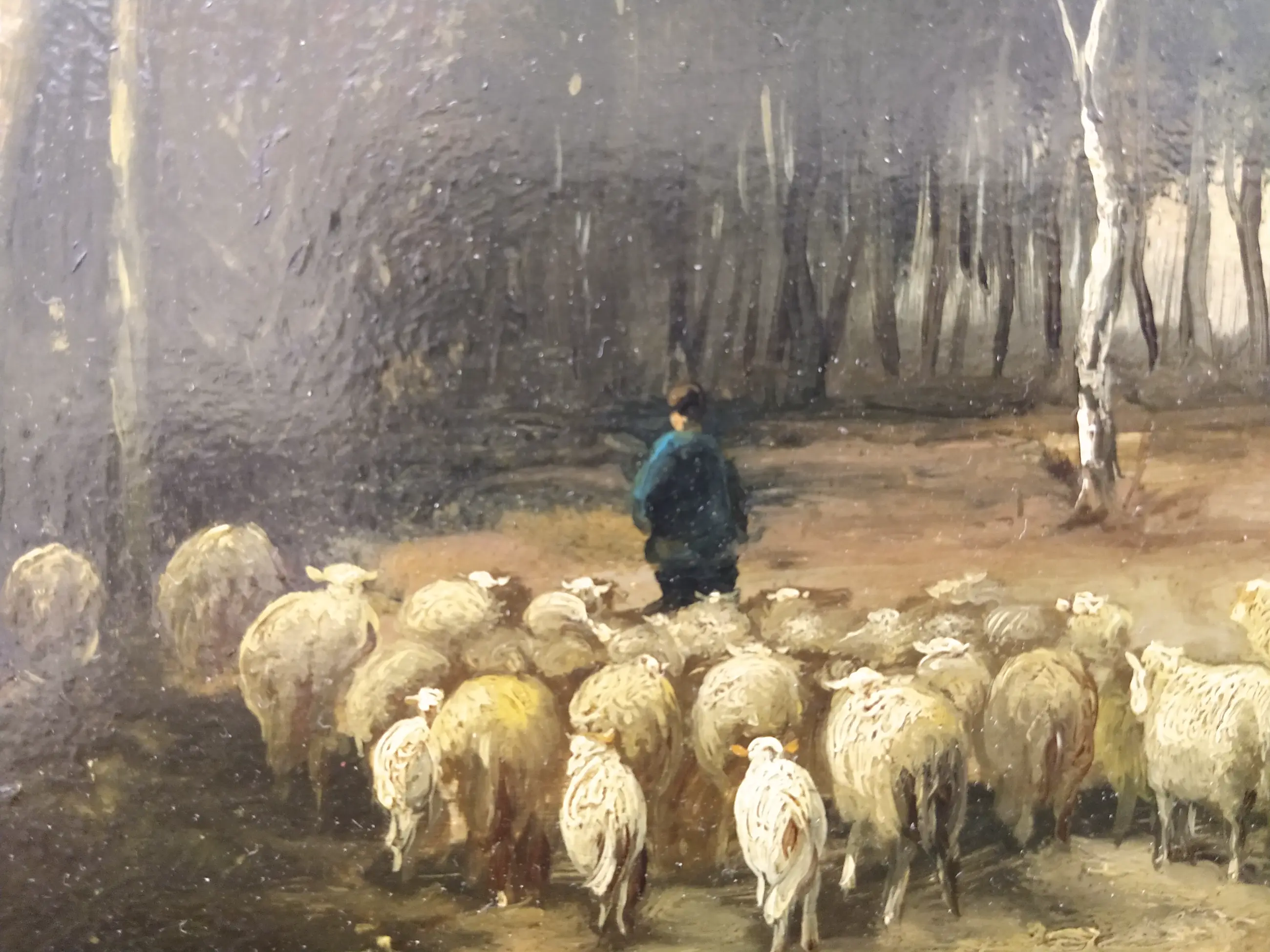 Am Geijp (1855-1926). Schaapsherder met kudde. Gesigneerd. Olieverf op paneel. Het schilderij is geplaatst in de originele lijst met paarlemoerkleurige binnenrand. Het schilderij en de lijst zijn in goede staat. Afmetingen: Inclusief lijst 35x40 cm. Exclusief lijst 18x24 cm.