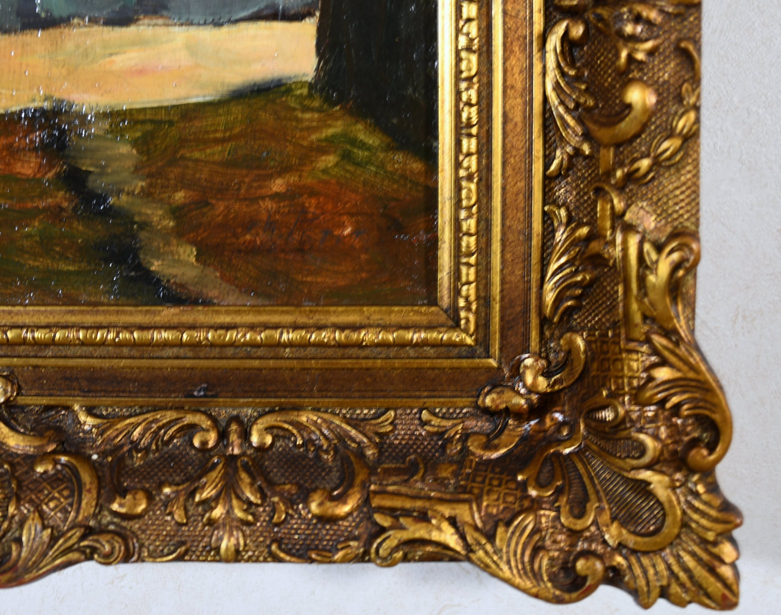 Fraai, kleurrijk geschilderde sfeerimpressie van : Oud woonhuis, gepleisterde muren en geverfde onderzijden, nauw straatje, geraniums in de vensterbank, geschilderd omstreeks 1940 en gesigneerd rechts onder met Ch. Petit.