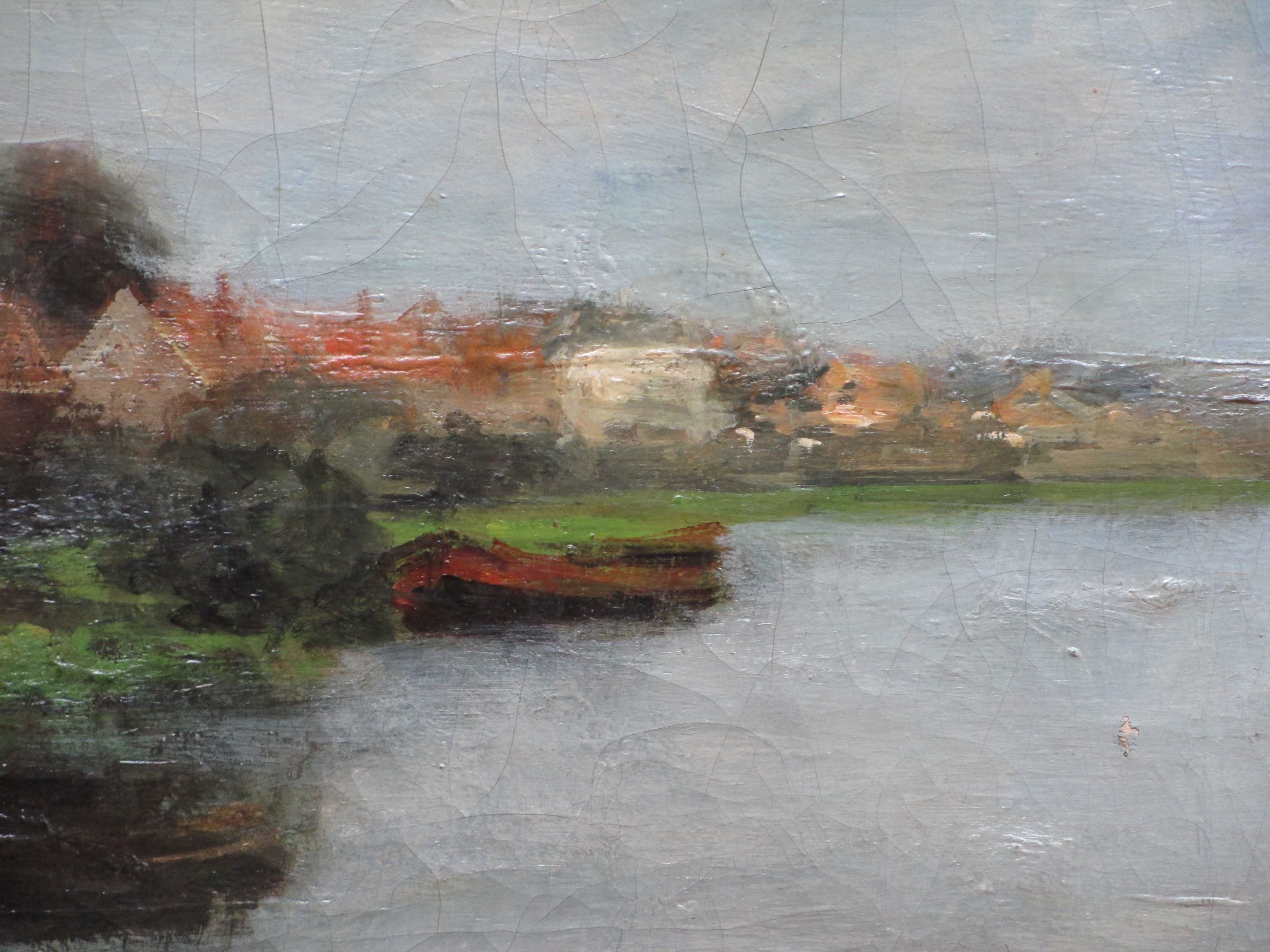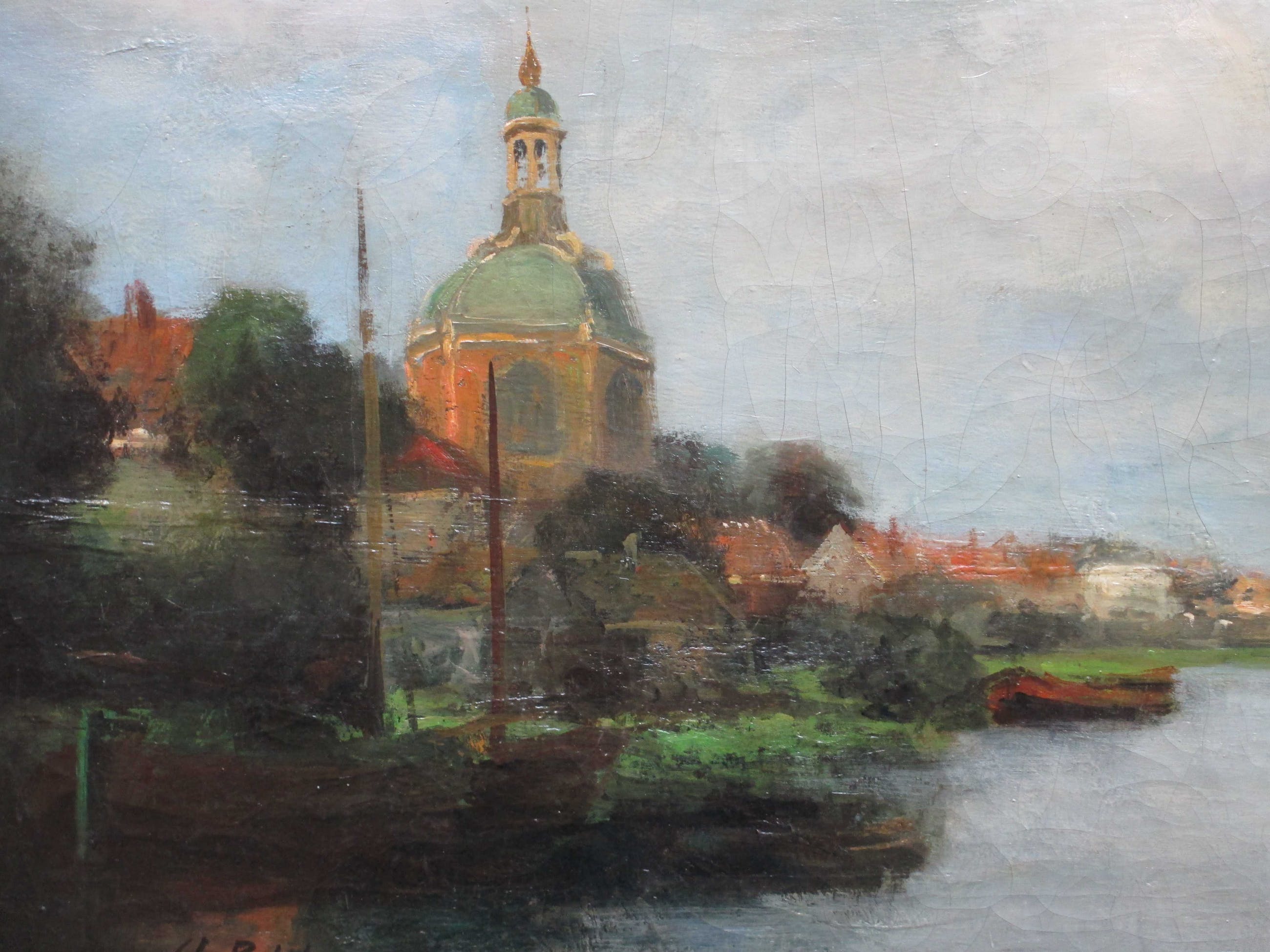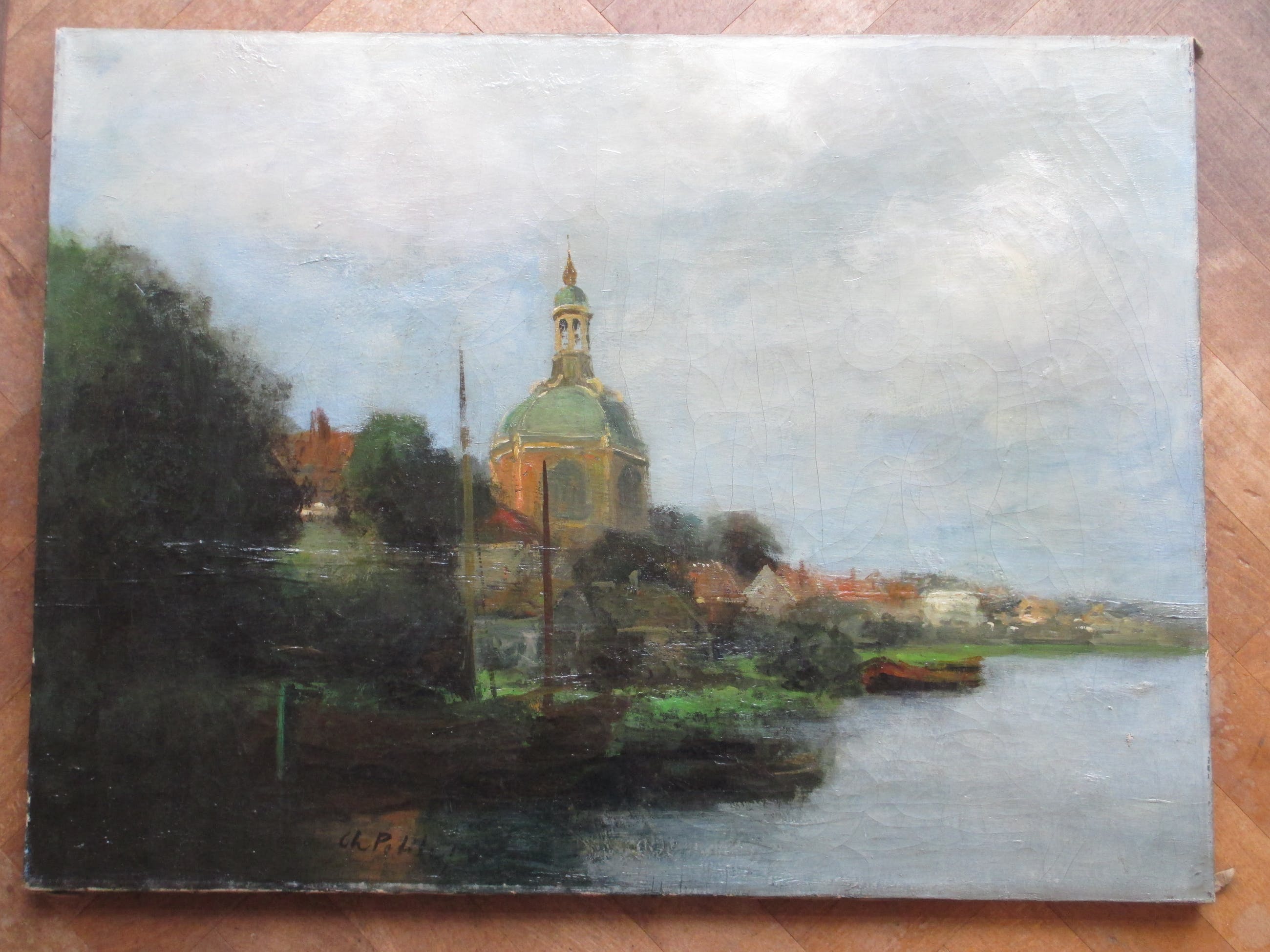 Olieverf op doek door Adriaan C.W. Terhell, gesigneerd Ch.Petit (Charles Petit was een veelgebruikt pseudoniem door A.C.W. Terhell). Gezicht op het Galgewater in Leiden en de Morspoort, gezien vanaf De Put. Niet gelijst, beeldmaat 60x80 Gesigneerd l.o.: 'Ch Petit' Getiteld op spieraam achterzijde: 'Galgewater te Leiden, gezien vanaf de Put' Het werk is in redelijke staat en heeft zichtbaar craquelé.