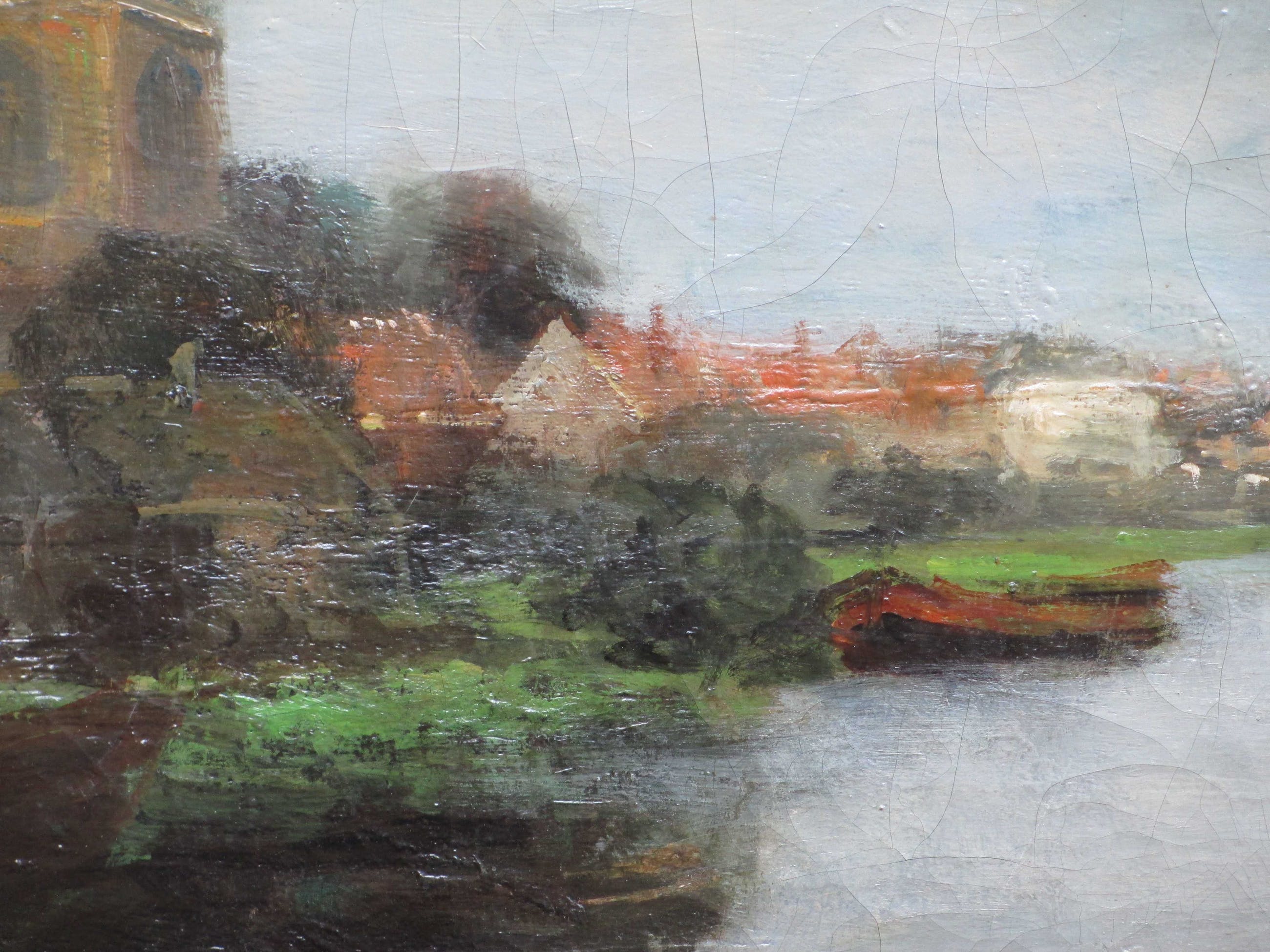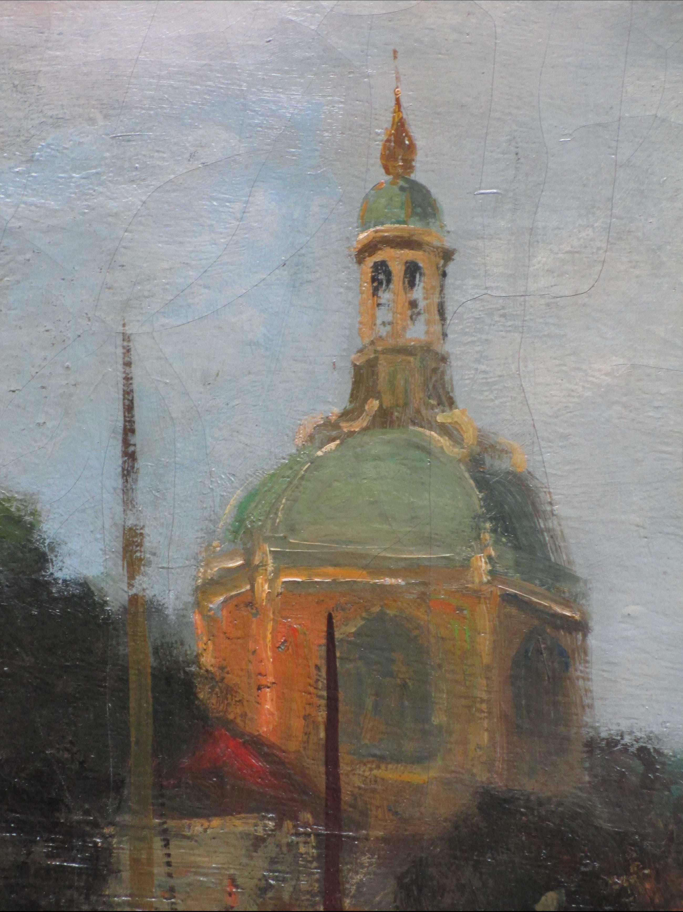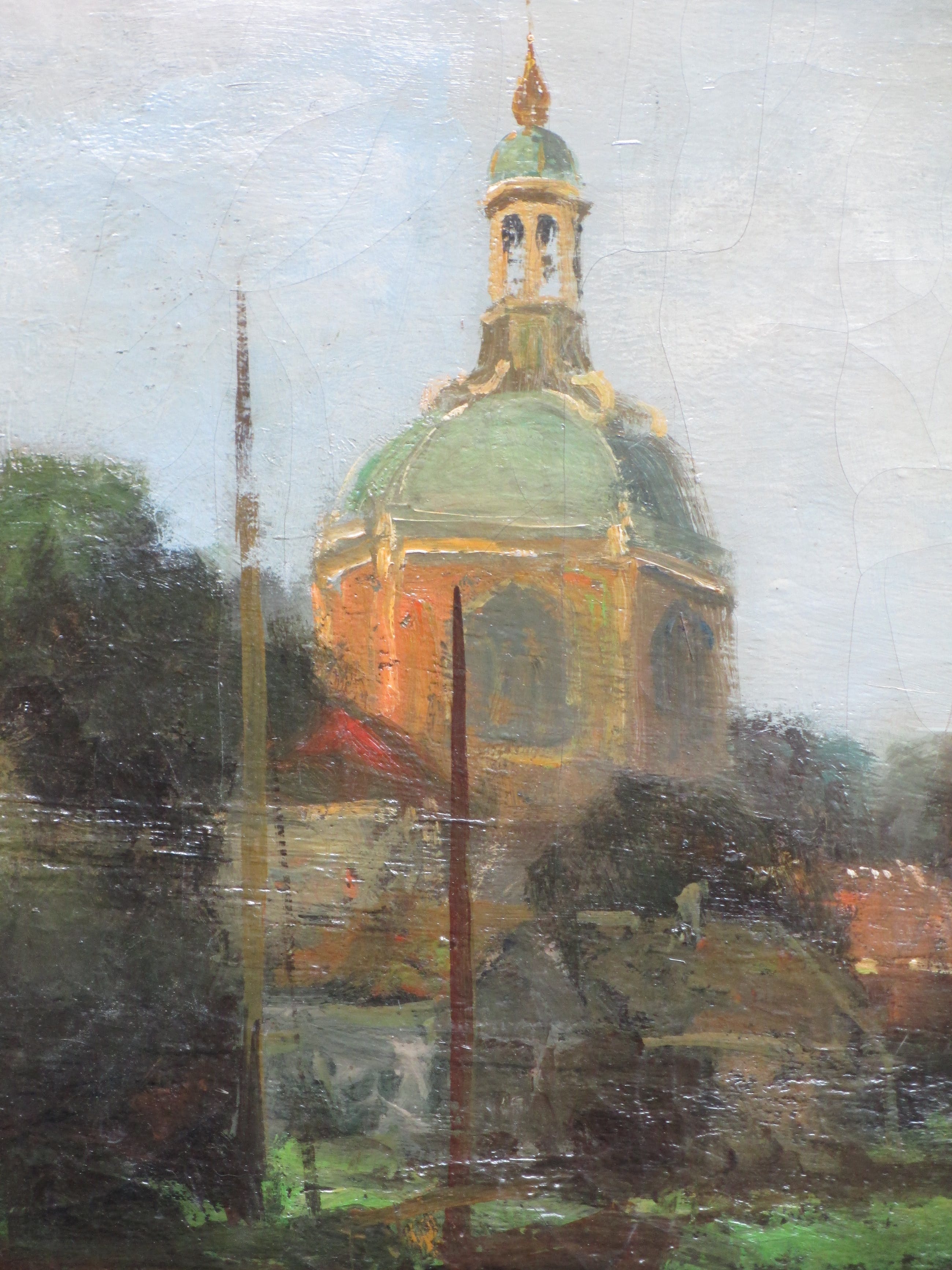 Olieverf op doek door Adriaan C.W. Terhell, gesigneerd Ch.Petit (Charles Petit was een veelgebruikt pseudoniem door A.C.W. Terhell). Gezicht op het Galgewater in Leiden en de Morspoort, gezien vanaf De Put. Niet gelijst, beeldmaat 60x80 Gesigneerd l.o.: 'Ch Petit' Getiteld op spieraam achterzijde: 'Galgewater te Leiden, gezien vanaf de Put' Het werk is in redelijke staat en heeft zichtbaar craquelé.