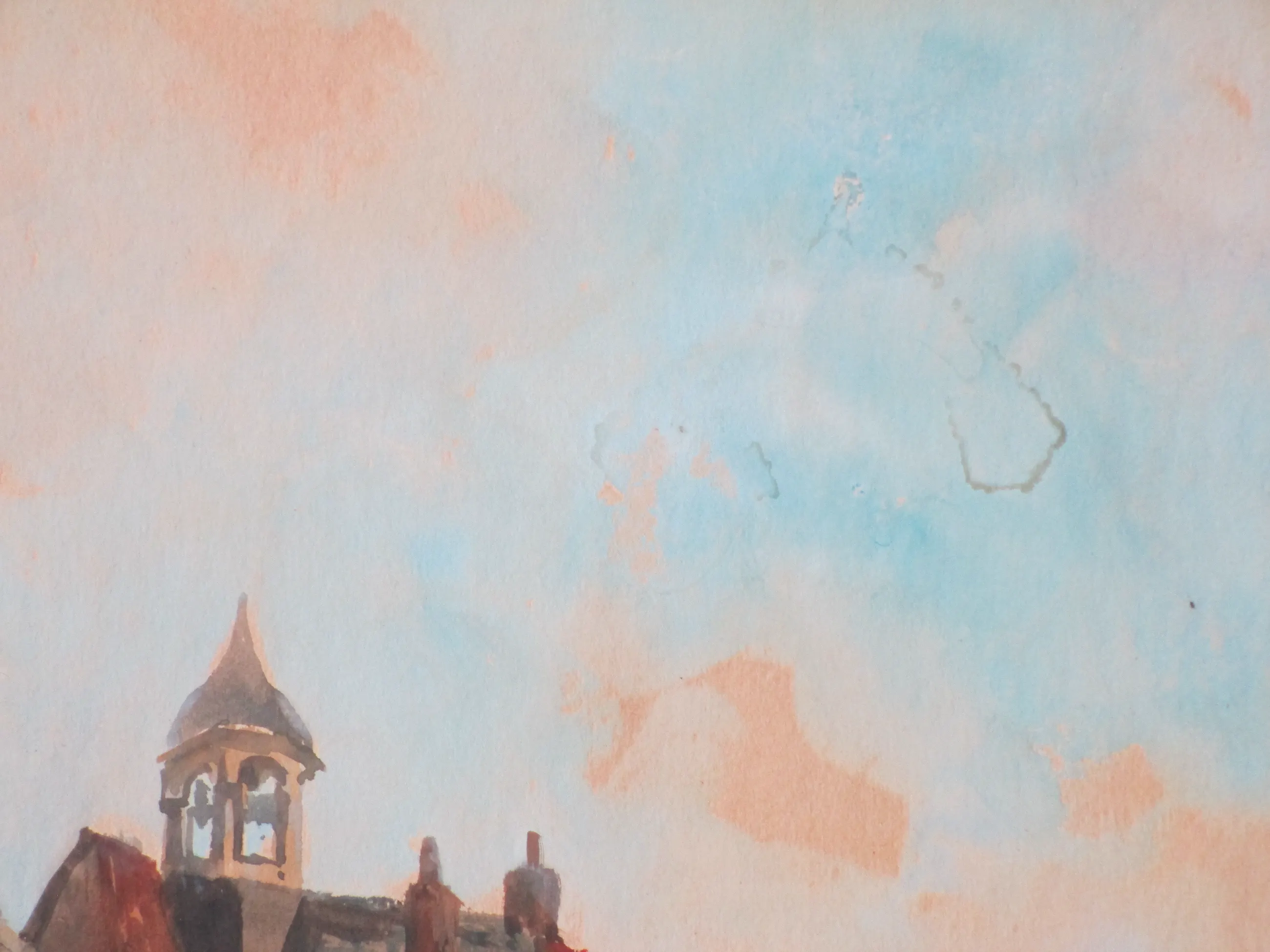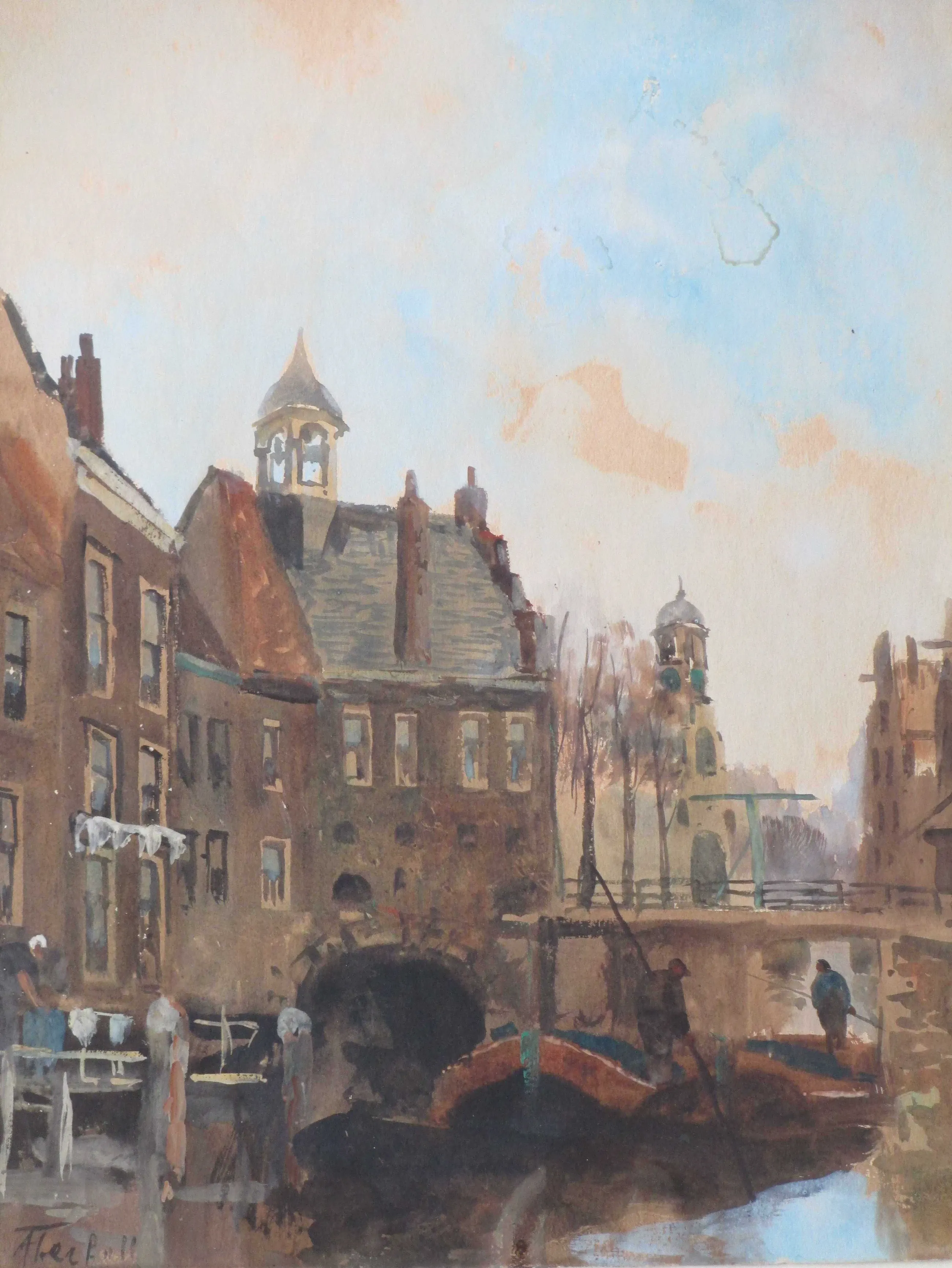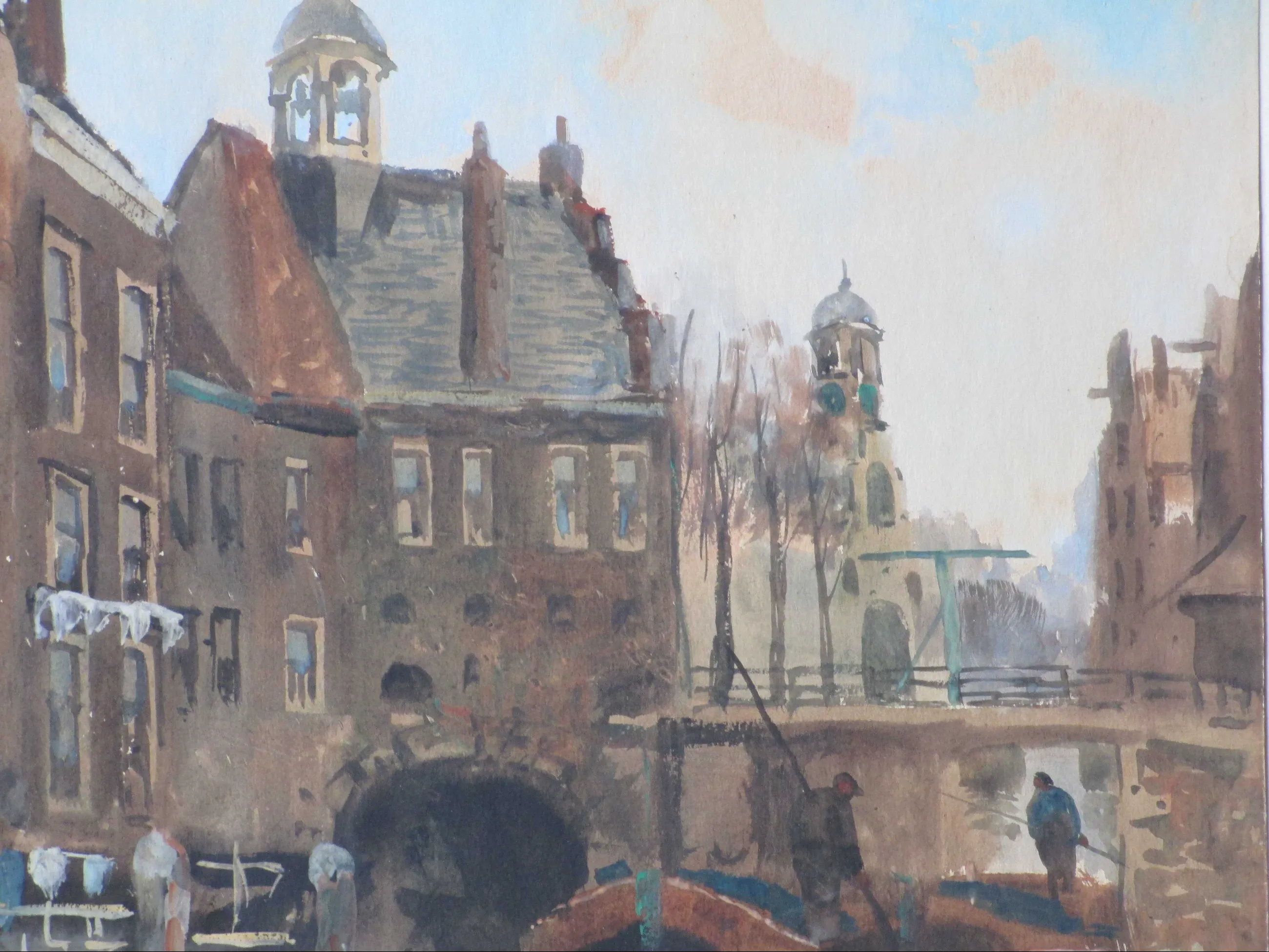 Aquarel door Adriaan Terhell Voorstelling van een Hollandse stad met schippers in de gracht Losbladig, beeldmaat 39x29 Gesigneerd l.o. 'A Terhell' Authenticiteit volledig gegarandeerd