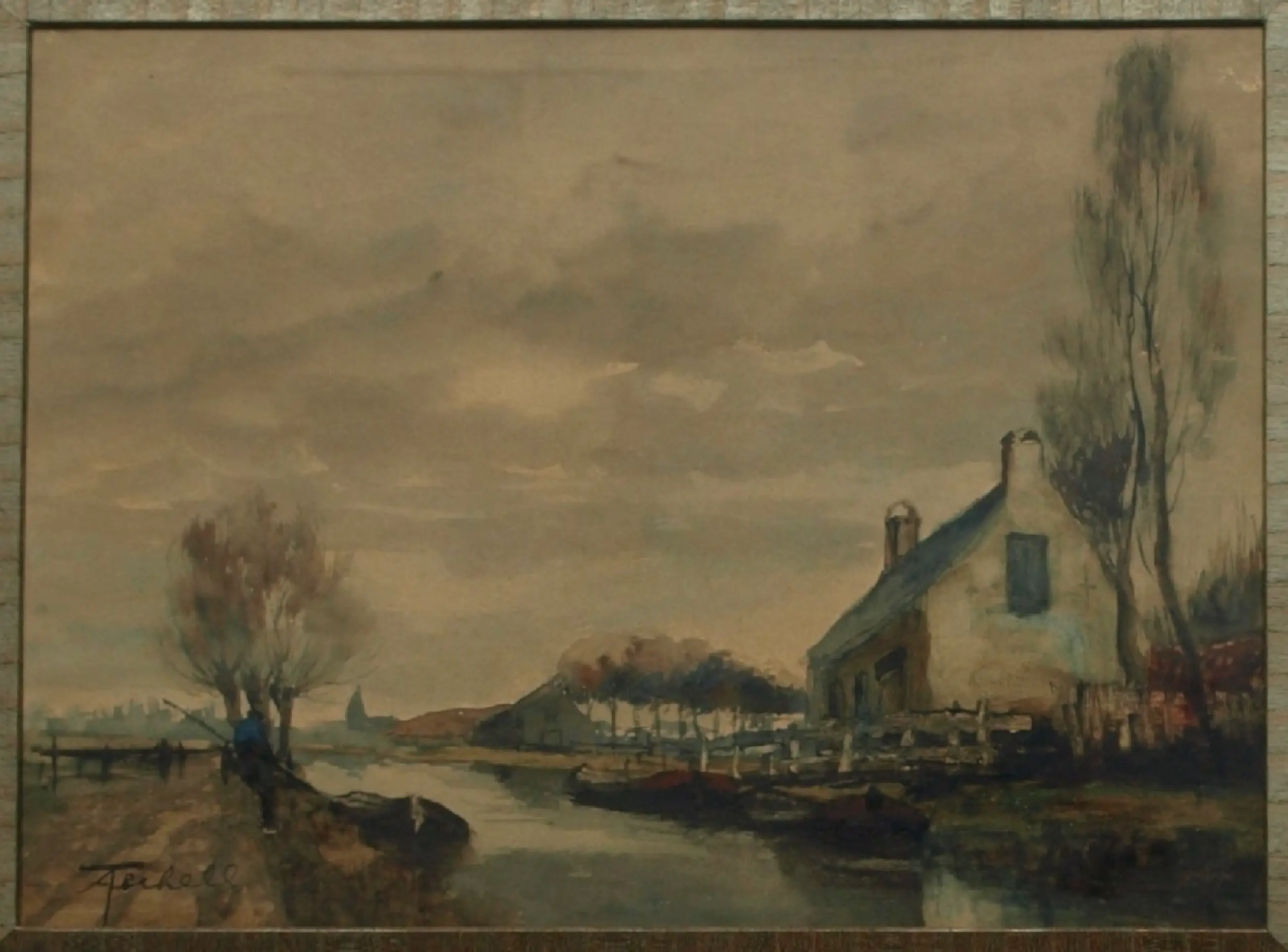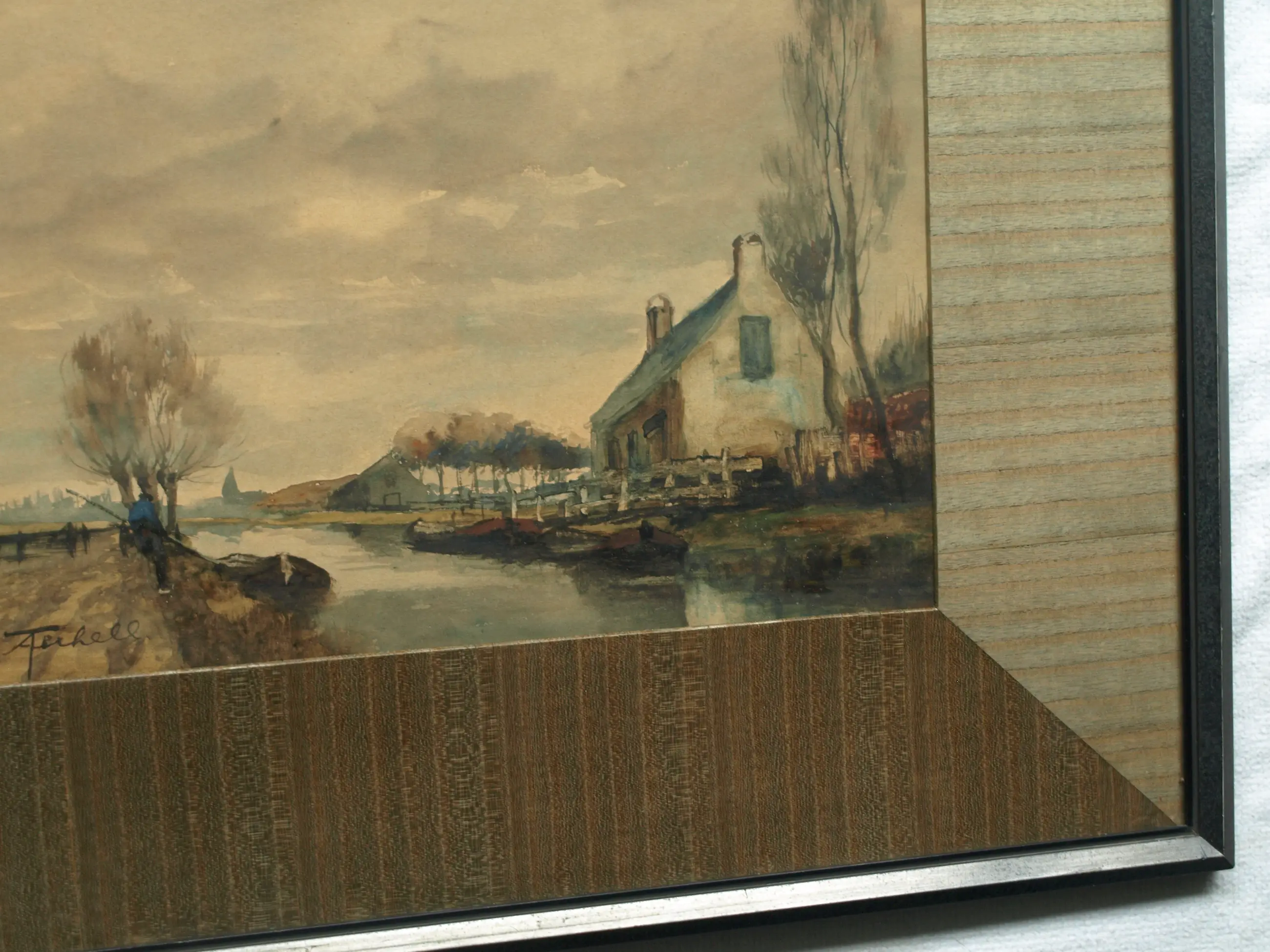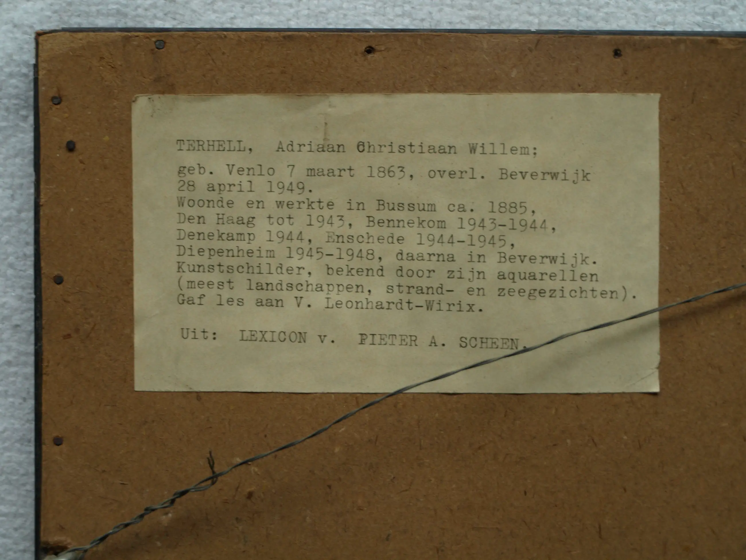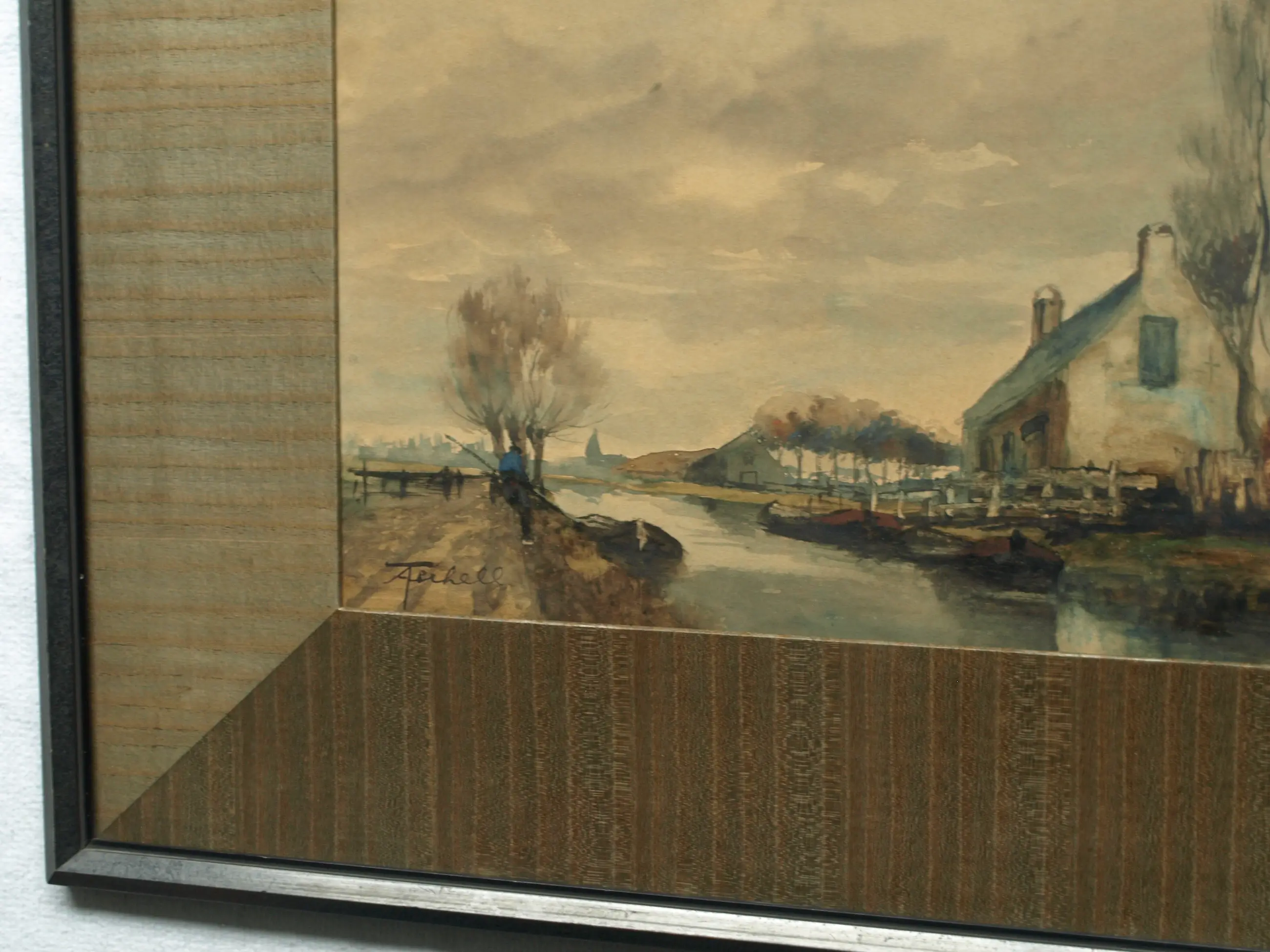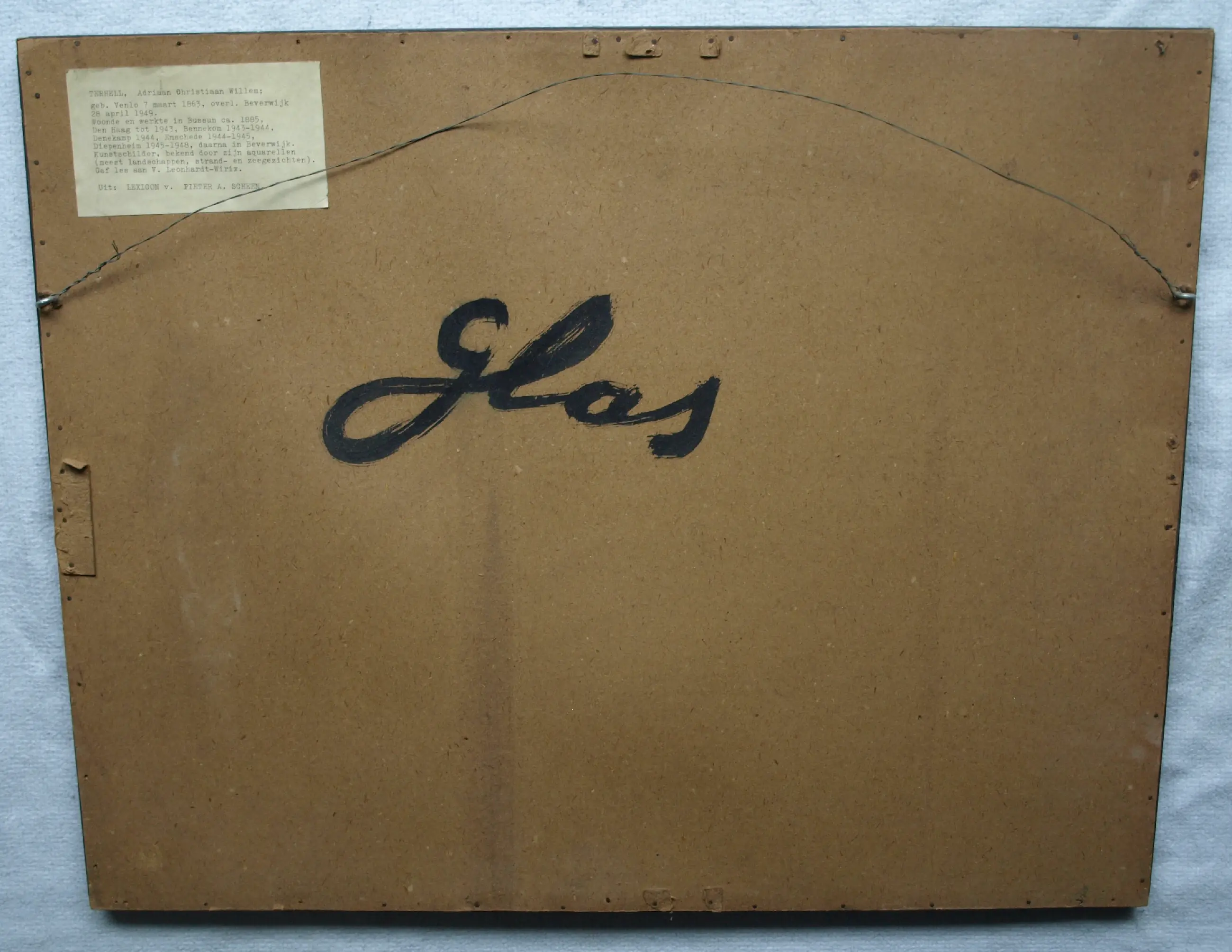 Informatie over de kunstenaar: Adriaan Christiaan Willem Terhell (Venlo, 7 maart 1863 - Beverwijk, 28 april 1949) was een Nederlandse kunstschilder en aquarellist die werkte in de romantische traditie. Hij woonde en werkte in Bussum tot 1885 en daarna in Den Haag tot 1943. Hier werd hij in 1899 voor vele jaren aangesteld als schilder van familiewapens door de Hoge Raad van Adel. Gedurende de laatste jaren van zijn leven verbleef hij in Twente, onder meer in Denekamp en Enschede. Terhell was een schilder die een groot oeuvre heeft nagelaten, bestaande uit landschappen, zee- en riviergezichten, dorps- en stadsgezichten. Naast olieverfschilderijen produceerde hij vele aquarellen en gouaches onder eigen naam, maar ook onder de pseudoniemen J. le Blanc, Ch. Petit, P. L. Jacoby en, in mindere mate, C. de Zeeuw. Terhell stierf op 86-jarige leeftijd in Beverwijk, zijn laatste woonplaats. Werken van Adriaan Terhell worden nog zeer regelmatig aangeboden op veilingen in binnen- en buitenland. Vooral in Amerika vinden zijn typisch, haast stereotypisch Nederlandse taferelen gretig aftrek. Literatuur: Scheen 1969-1970 ; Scheen 1981 , p. 516. (bron: Wikipedia, RKD)