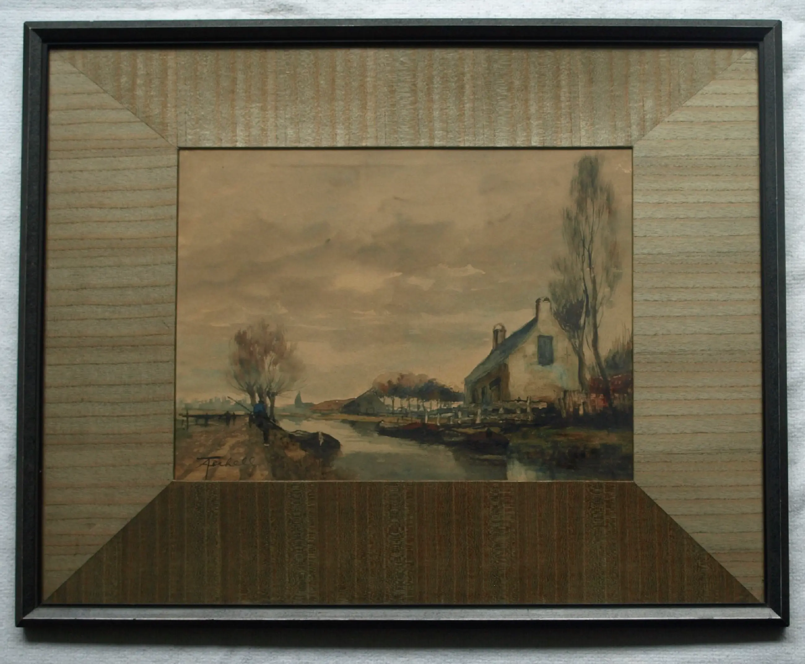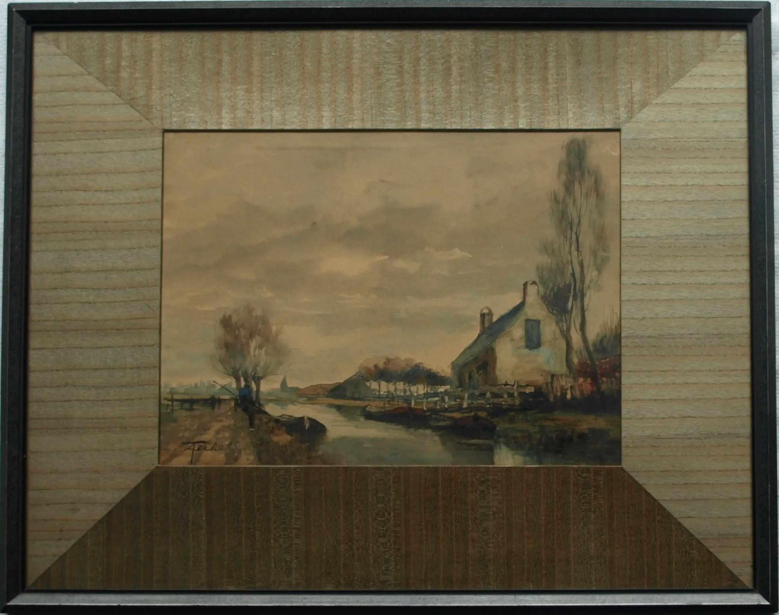 Een aquarel van de Nederlandse kunstenaar Adriaan Terhell (1863-1949). -Gesigneerd linksonder. -Ingelijst in de originele houten lijst met een passe-partout van fineerhout en met een glasplaat. -Afmetingen: Lijst, 50 x 63 x 2 cm. Beeld, 27½ x 37½ cm. -Herkomst: Uit een inboedel. -Conditie: In goede staat. Het papier van de aquarel is wat ‘verkleurd’ door de tand des tijds. De houten lijst heeft slijtplekjes. Zie ook de foto’s voor een eigen indruk. Kan zo aan de muur.