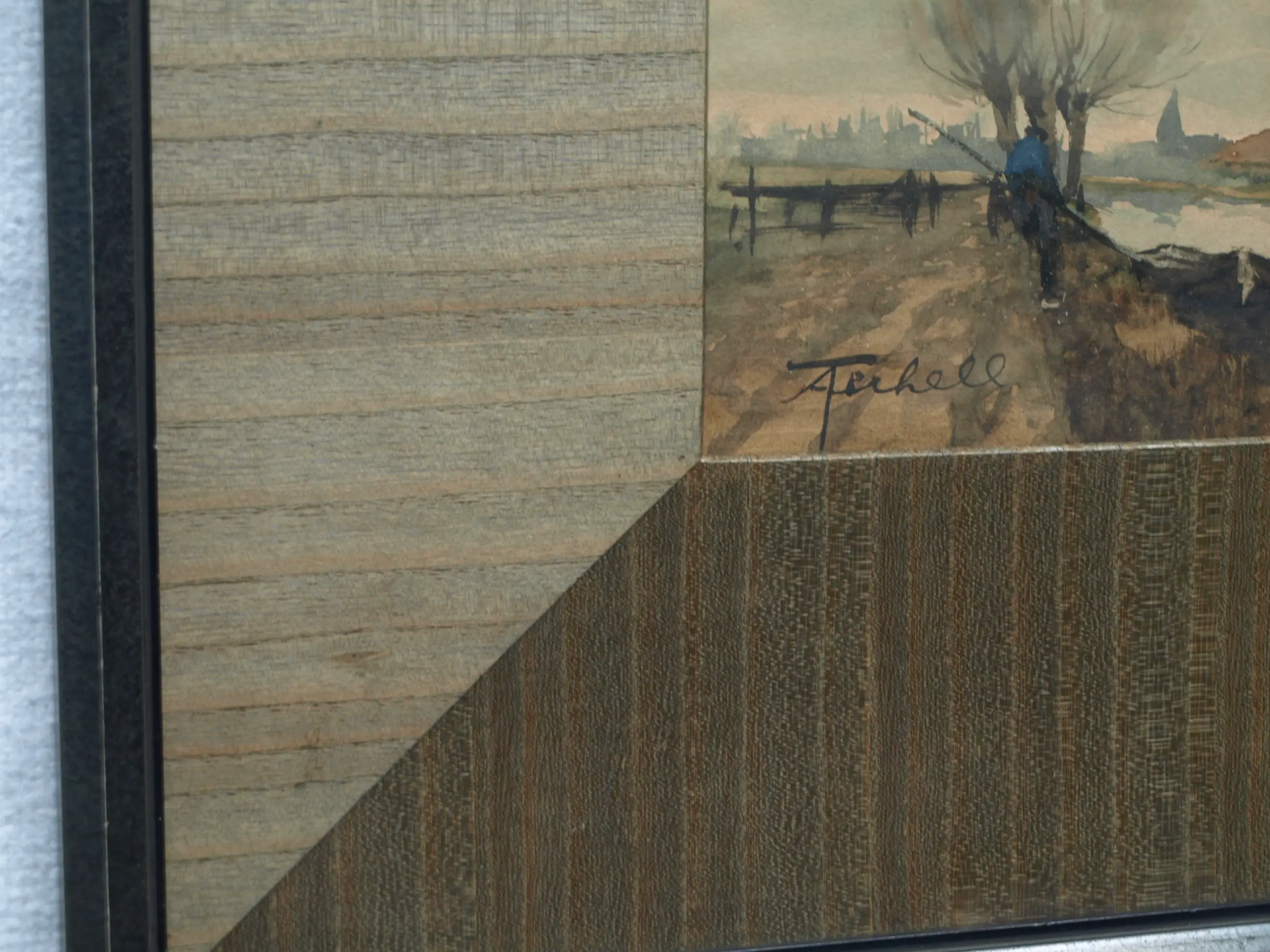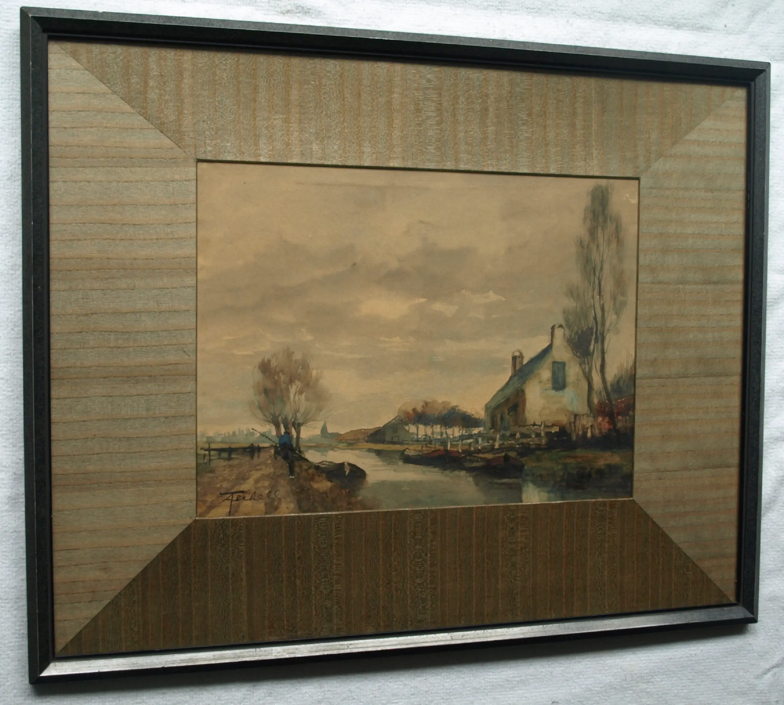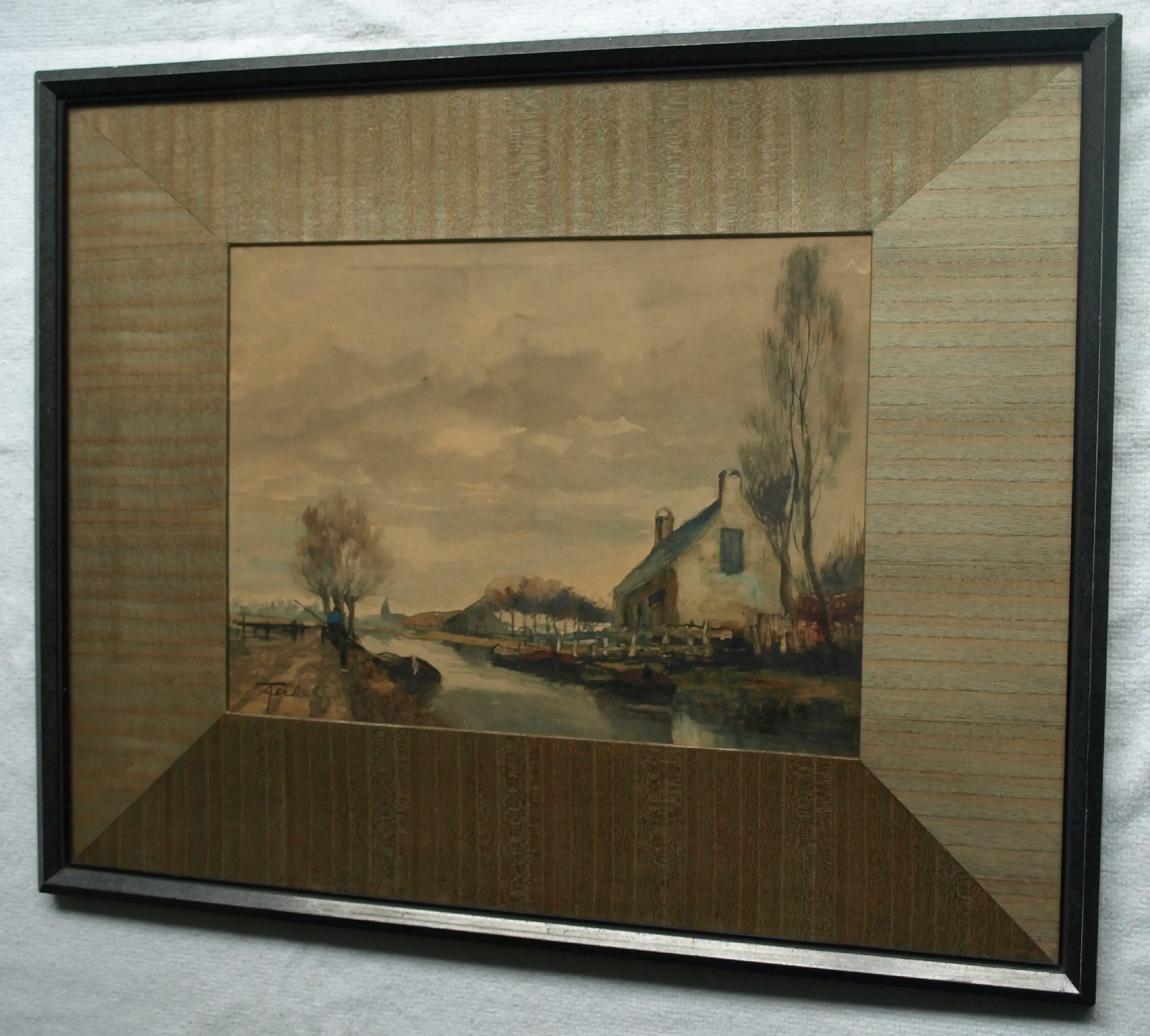 In goede staat. Het papier van de aquarel is wat ‘verkleurd’ door de tand des tijds. De houten lijst heeft slijtplekjes. Zie ook de foto’s voor een eigen indruk. Kan zo aan de muur.