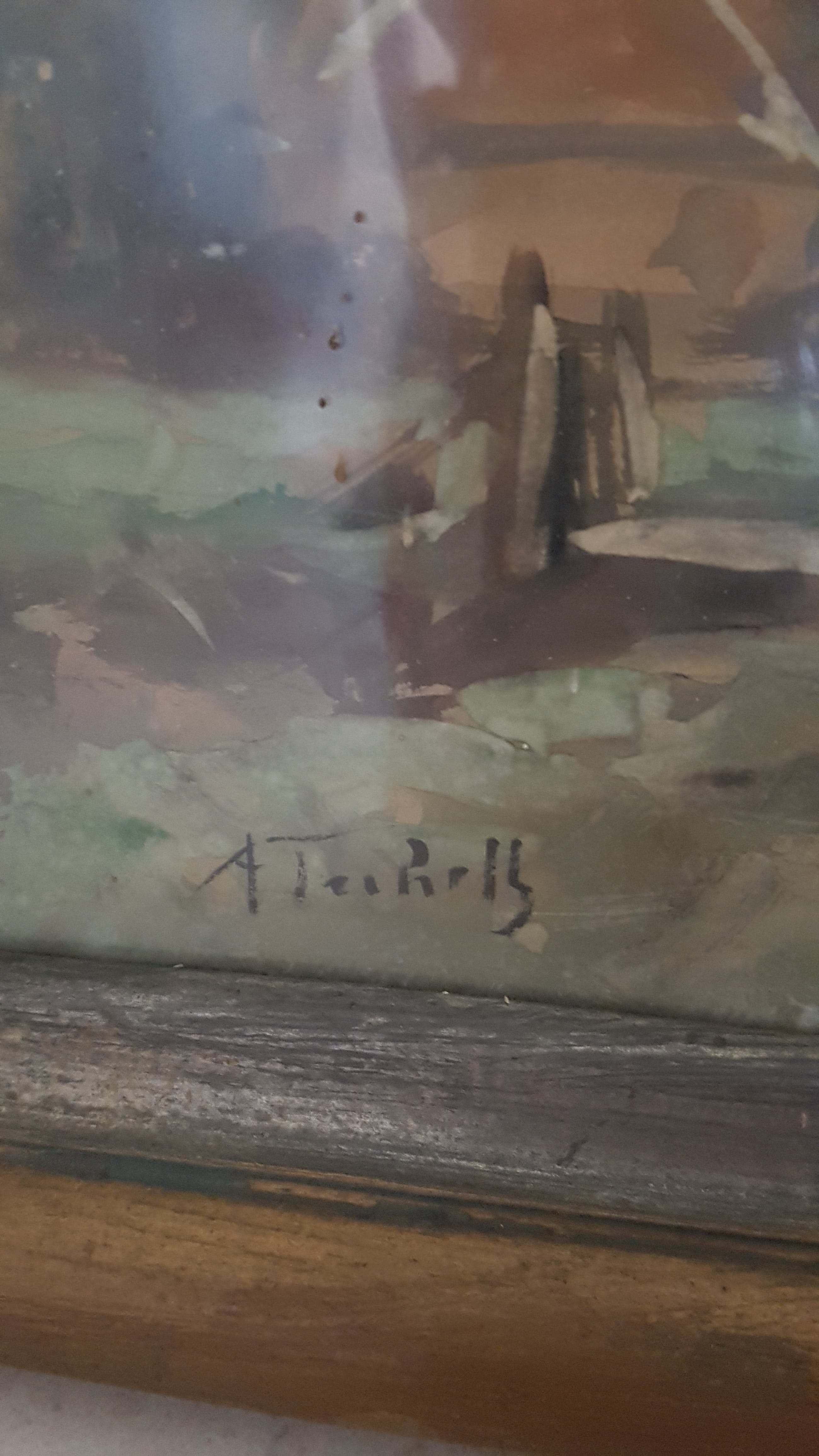 Een karakteristieke gouache van Adriaan Terhell. Gesigneerd onder zijn eigen naam. Ingelijst met glasplaat.