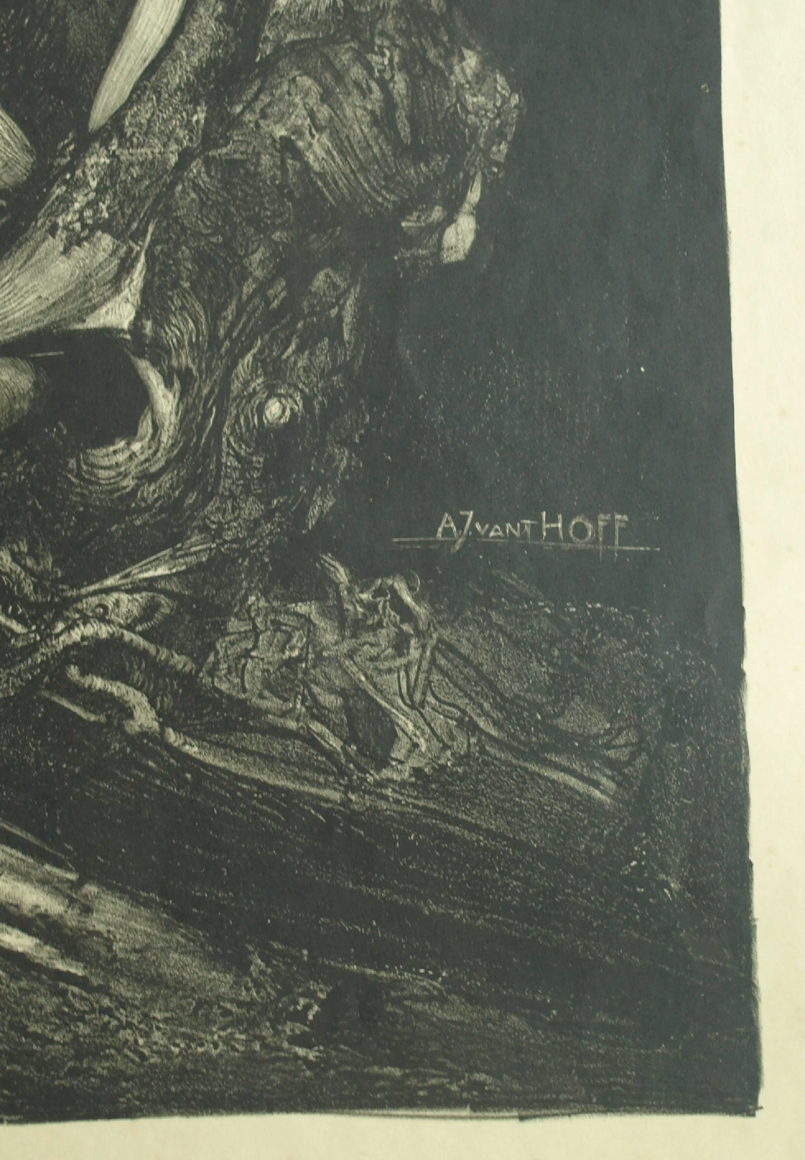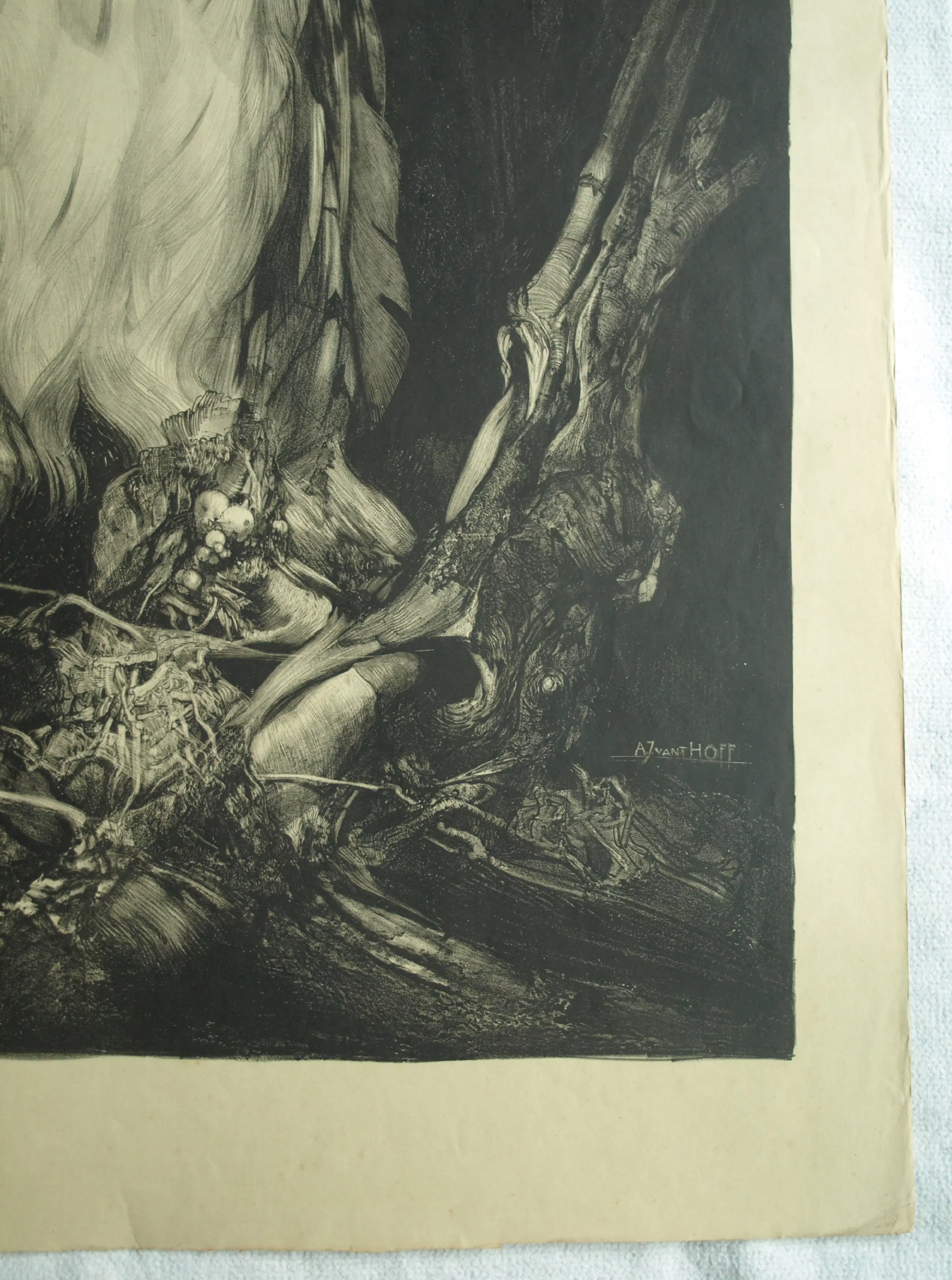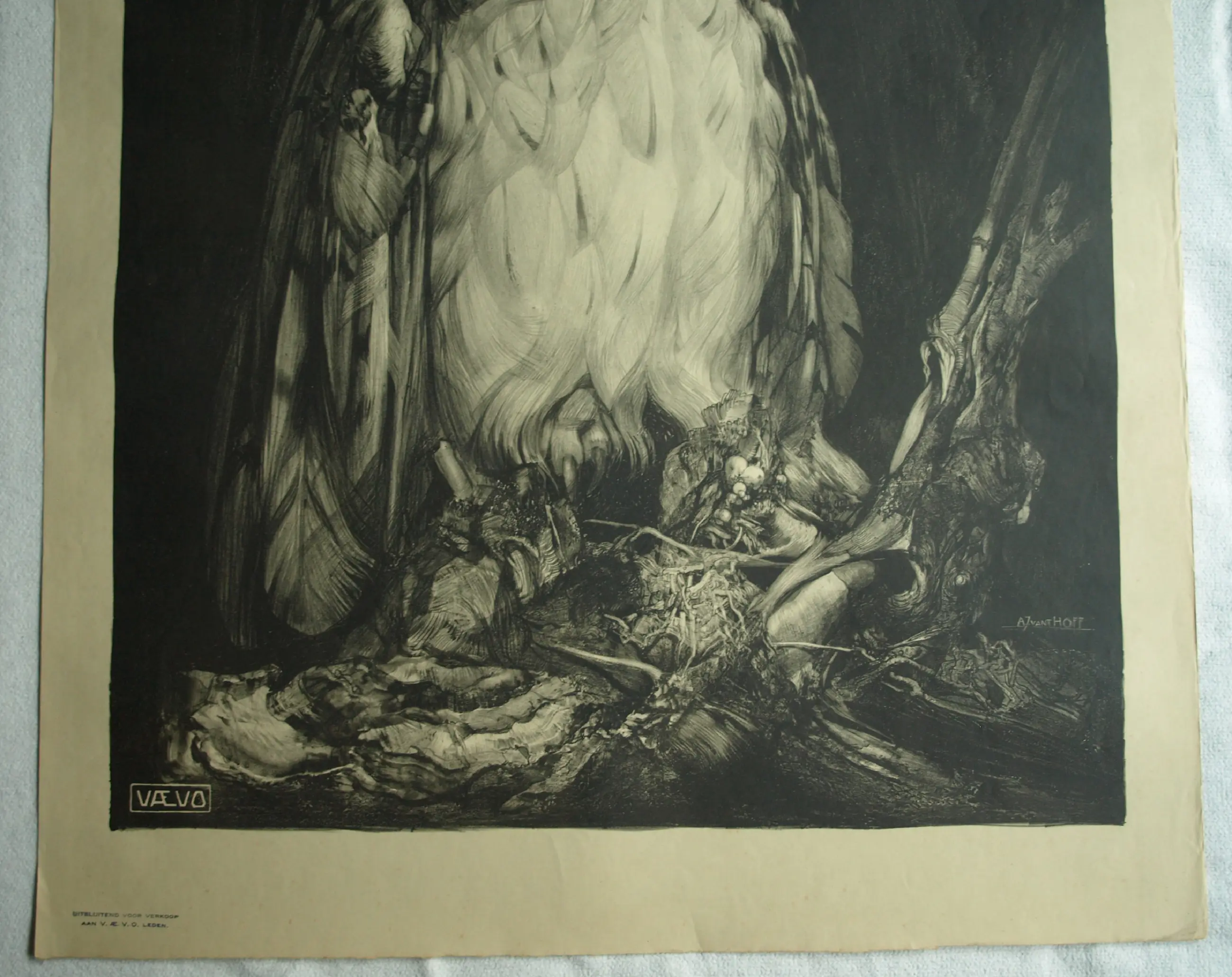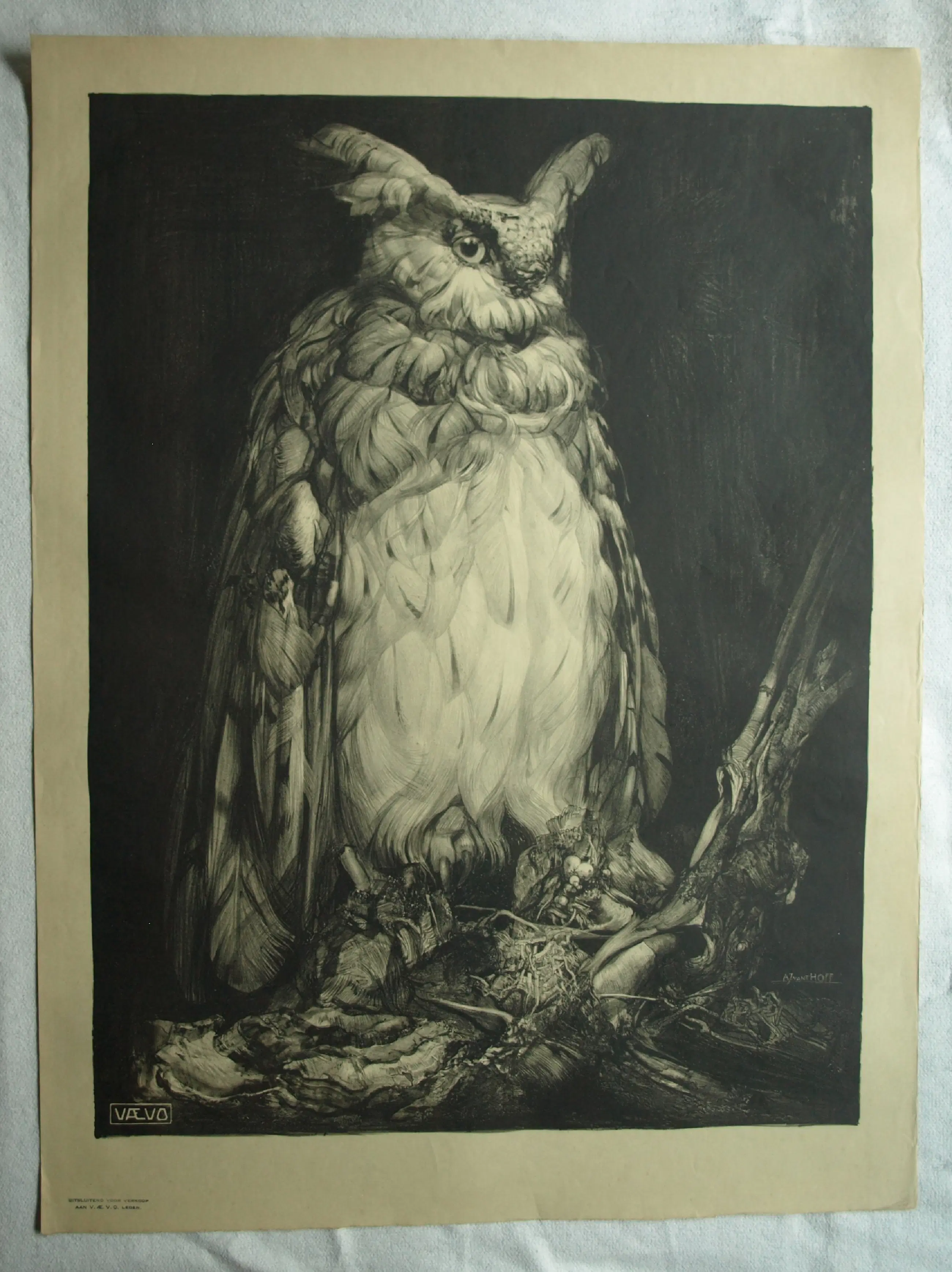 Een grote lithografische prent van de Nederlandse kunstenaar Adrianus (Adriaan) Johannes van ‘t Hoff (1893-1939), met een afbeelding van een Oehoe, met een spanwijdte van 170 cm de grootste uil van Europa. De prent is uitgegeven door de V.AE.V.O. (zie de informatie verderop in deze tekst). - Gesigneerd in de steen, rechtsonder in de afbeelding. Linksonder het logo en tekst van de V.AE.V.O. -Afmetingen: Blad, 100 x 75 cm. Beeld, 86 x 64 cm. -Herkomst: Uit een inboedel. -Conditie: De prent is in goede staat. Het papier is licht ‘vergeeld’ en heeft aan de randen wat kreukjes (buiten beeld). Zie ook de foto’s voor een eigen indruk.