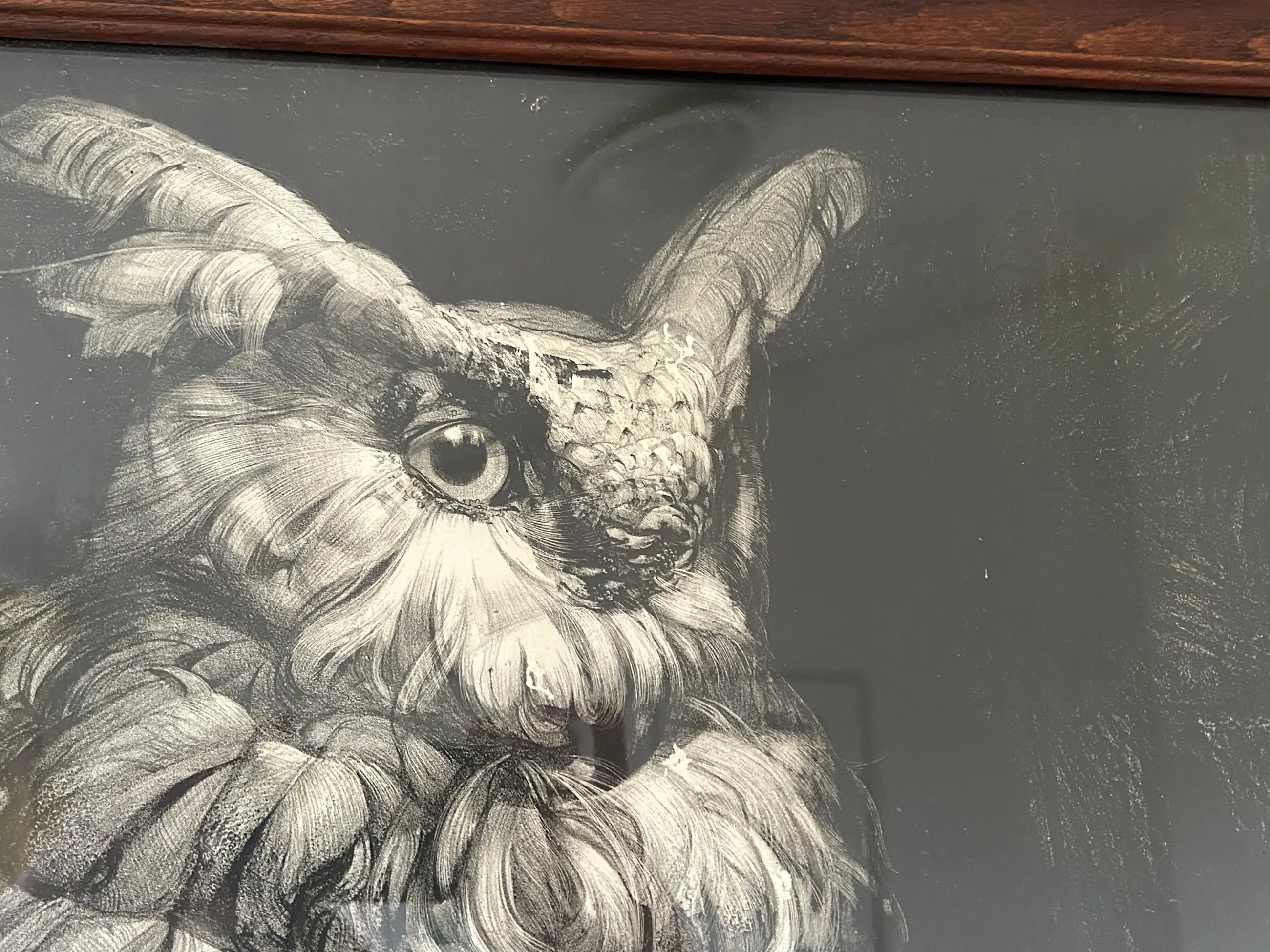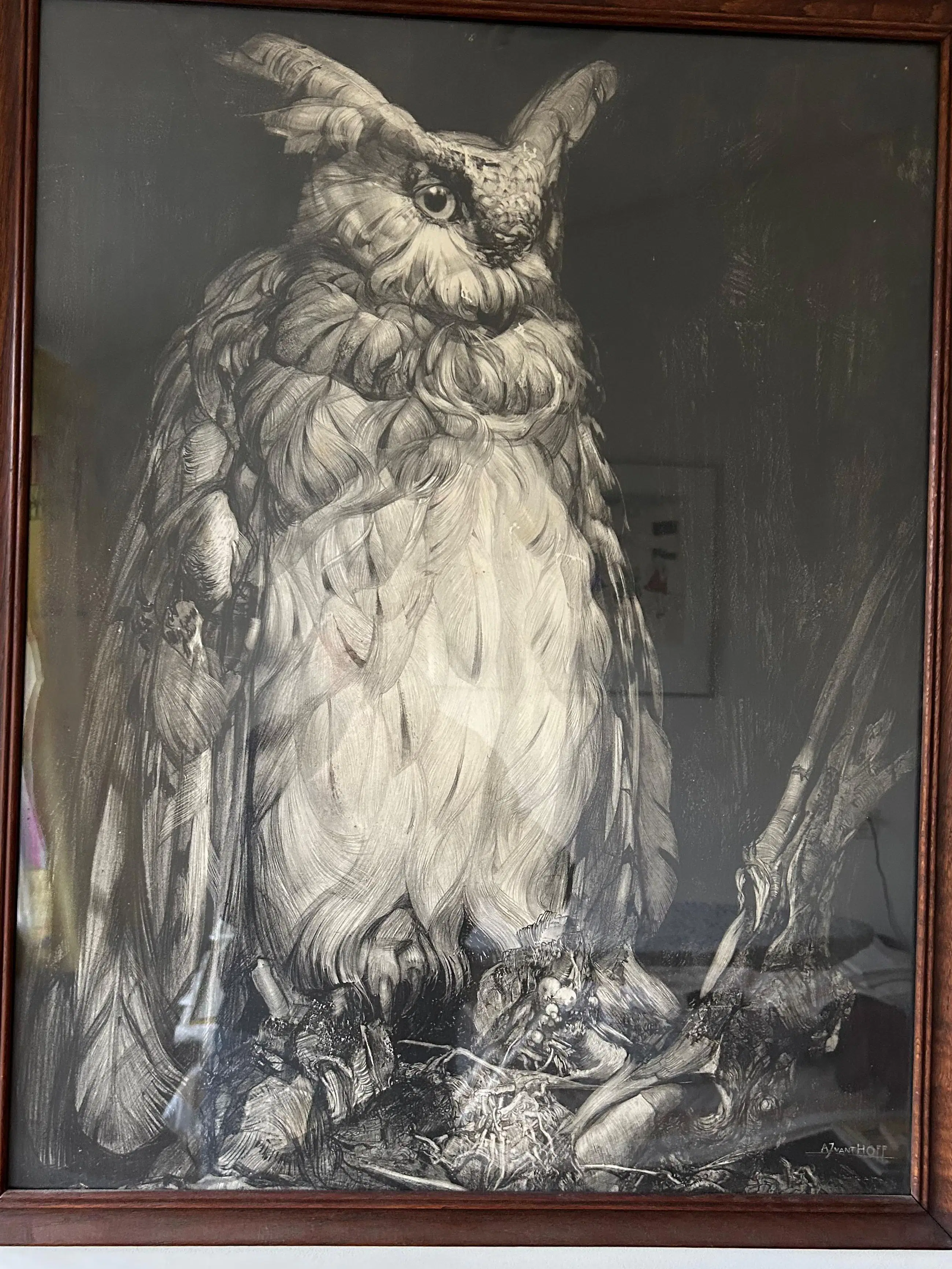 Lithografie van A.J. van 't Hoff (1893-1939), voorstellende een zittende Oehoe. De litho is gemaakt rond 1928. De afmetingen zijn 83 x 65 cm.