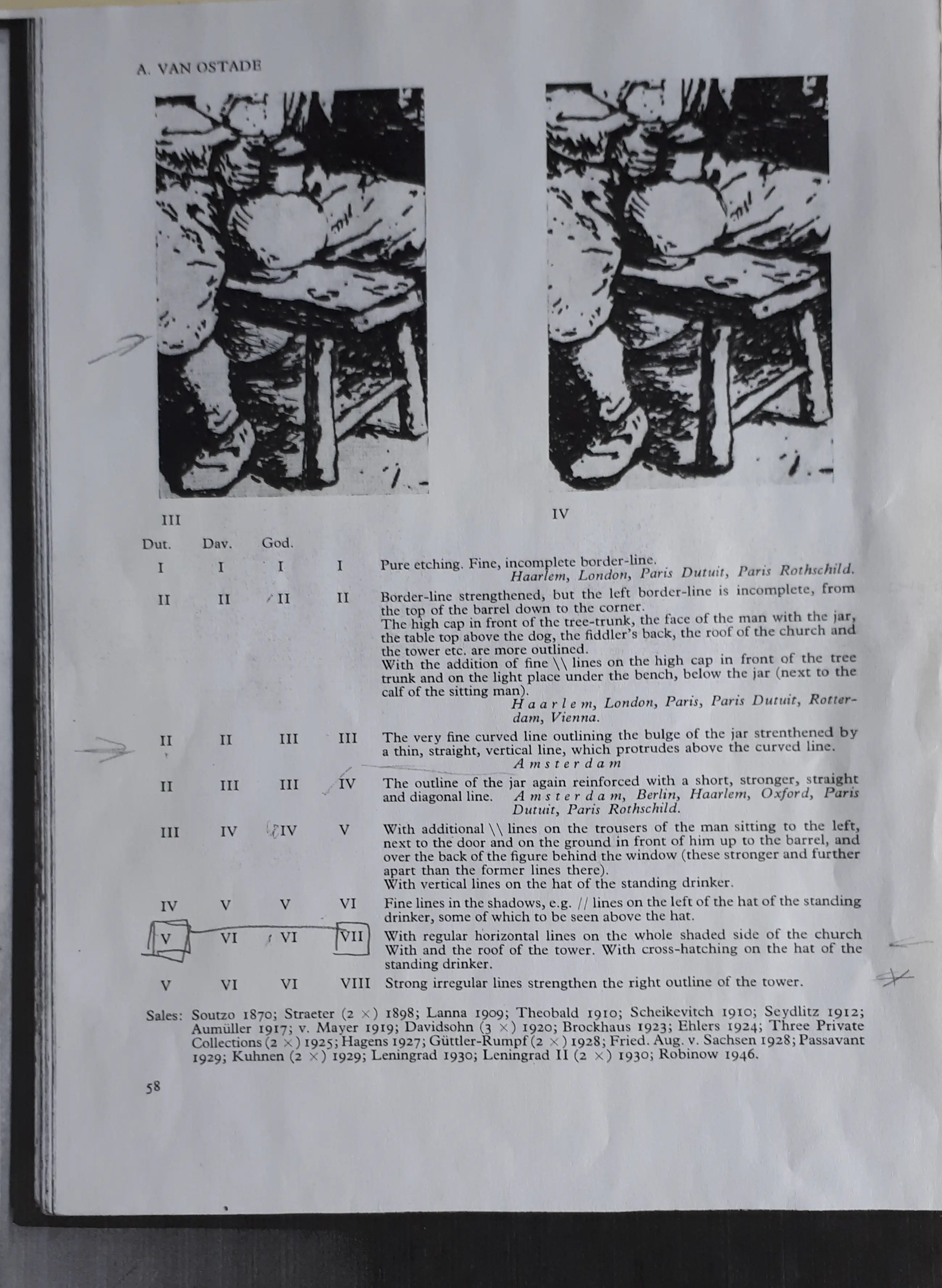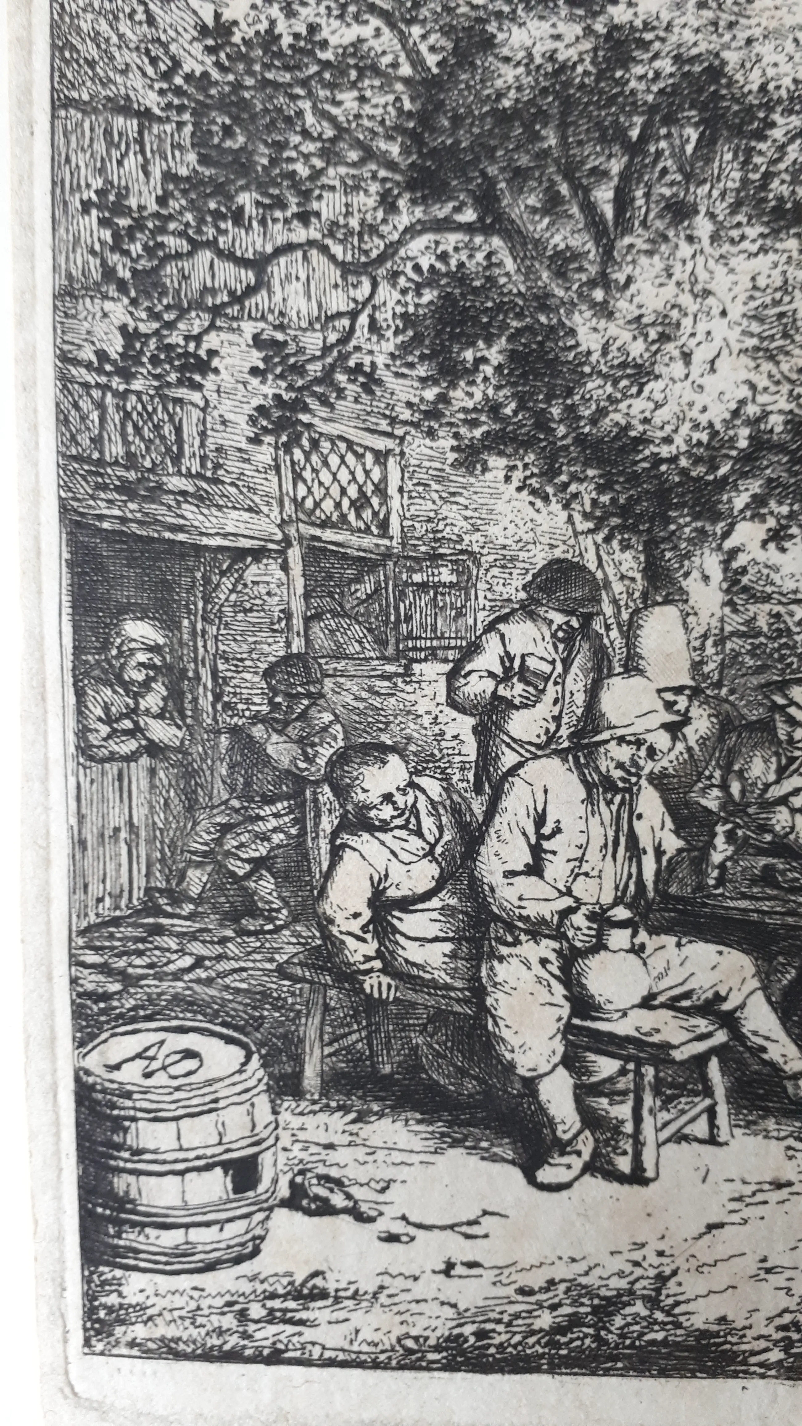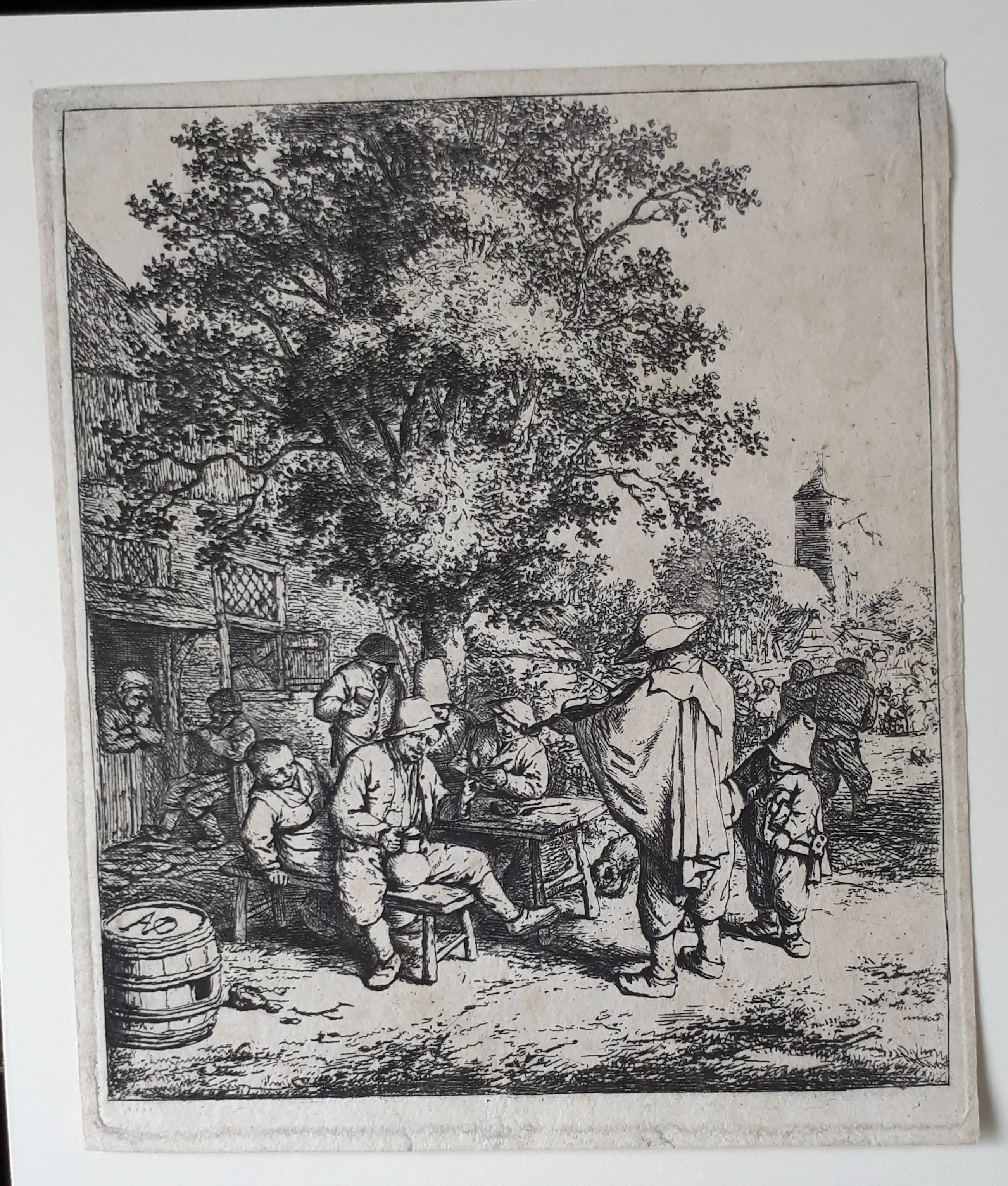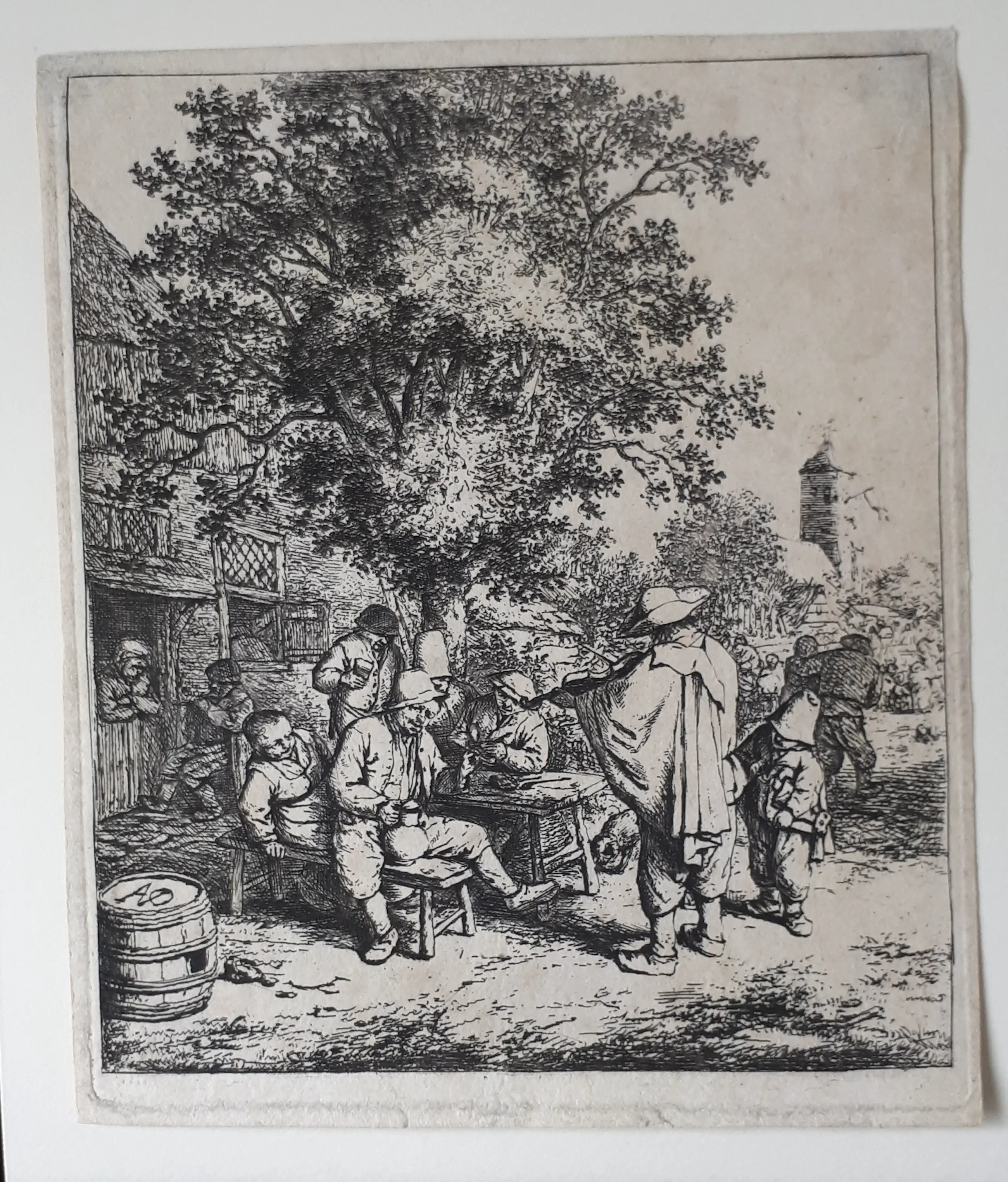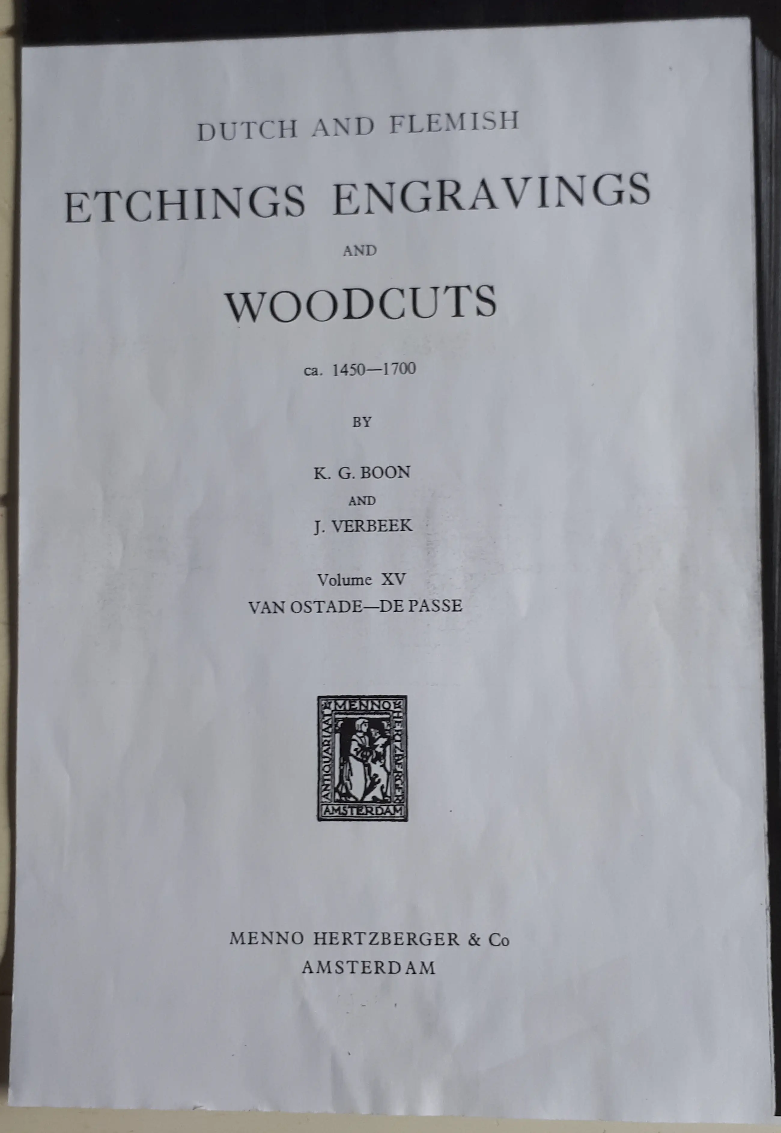 Inclusief copieën blz. 57 en 58 van 'Dutch and Flemish ETCHINGS ENGRAVINGS and WOODCUTS ca. 1450-1700'. Beschrijving op blz. 58: 'With regular horizontal lines on the whole shaded side of the church With and the roof of the tower. With cross-hatching on the hat of the standing drinker. Geheel in een hard plastic opbergmap.
