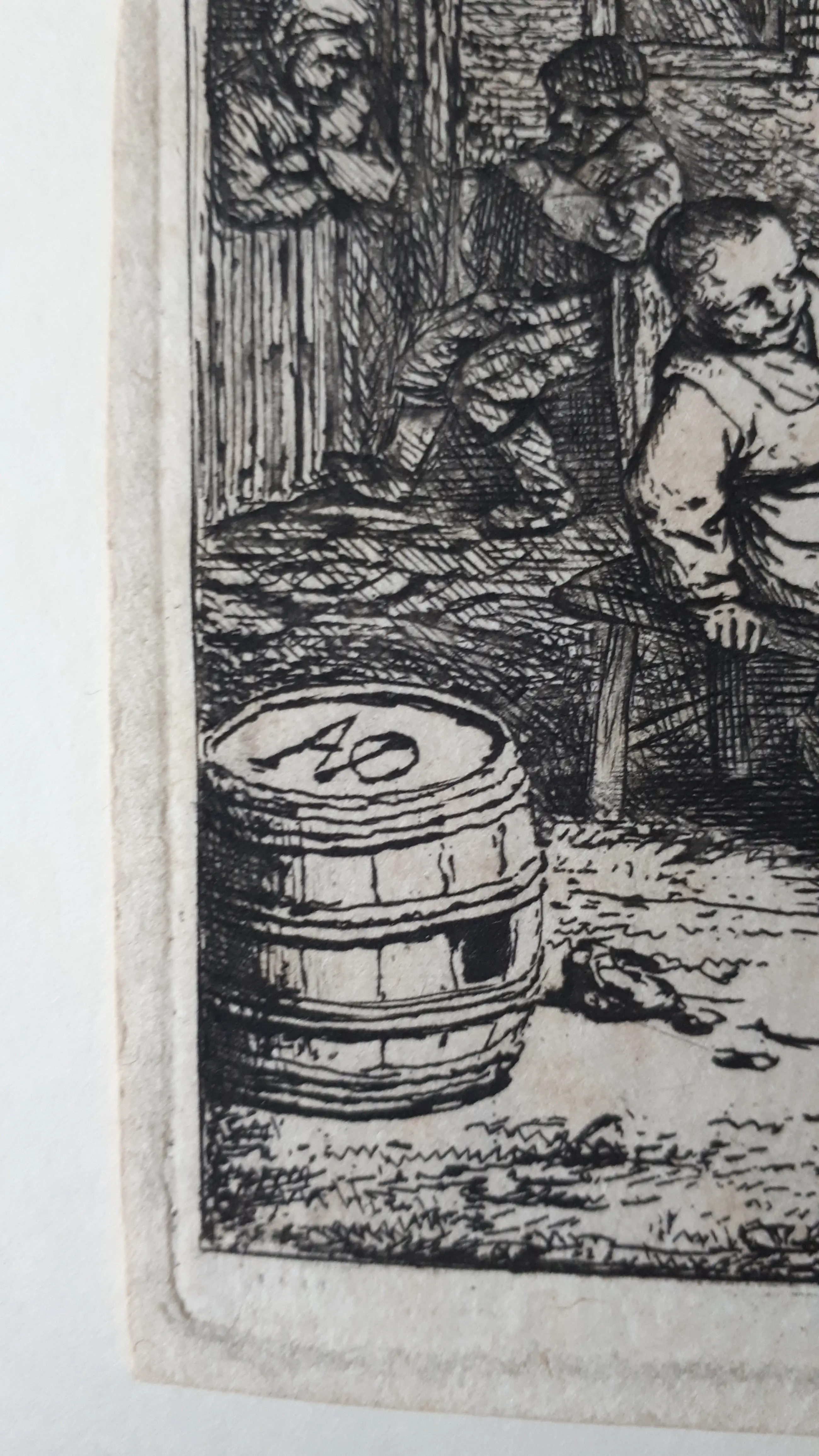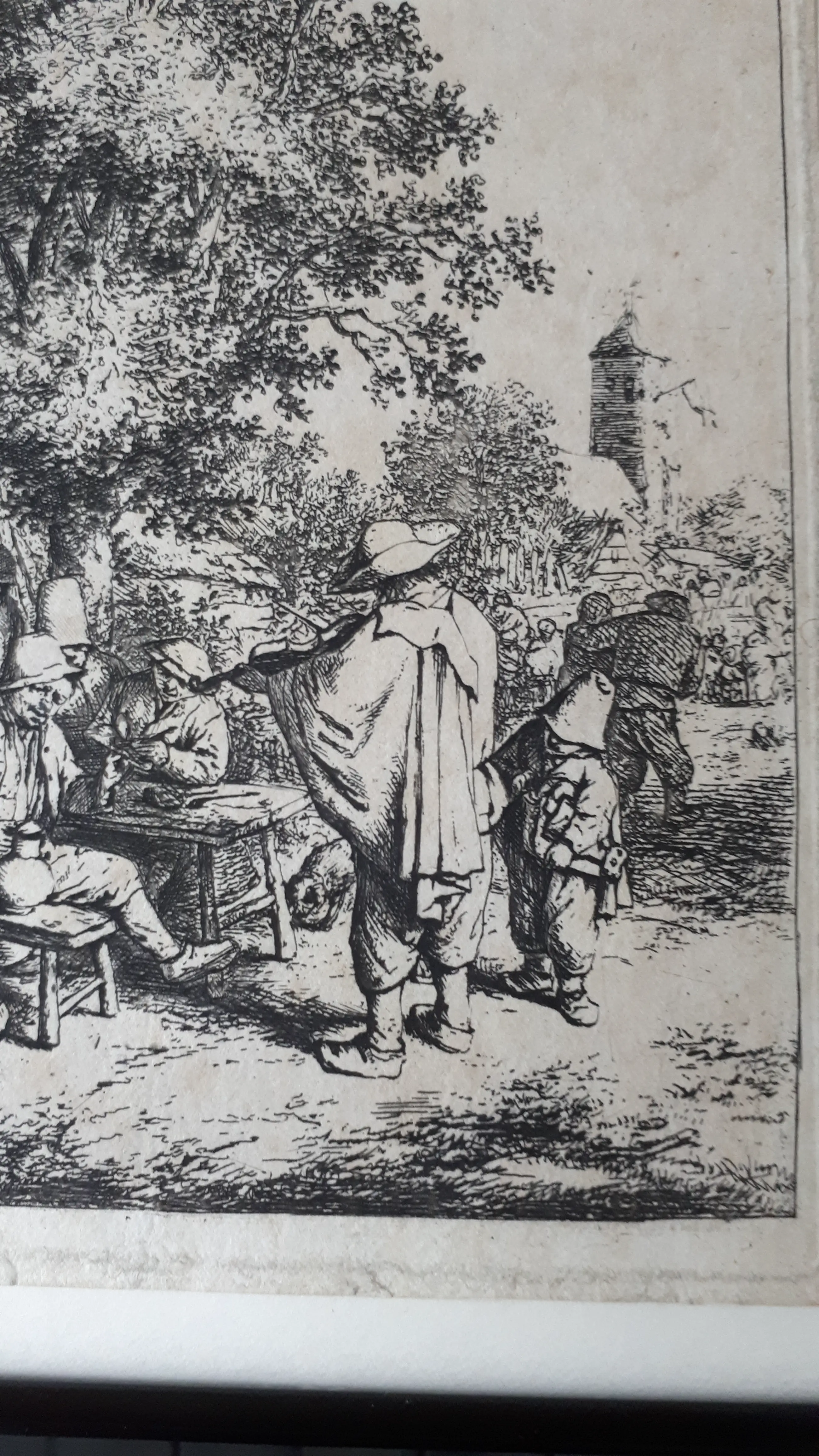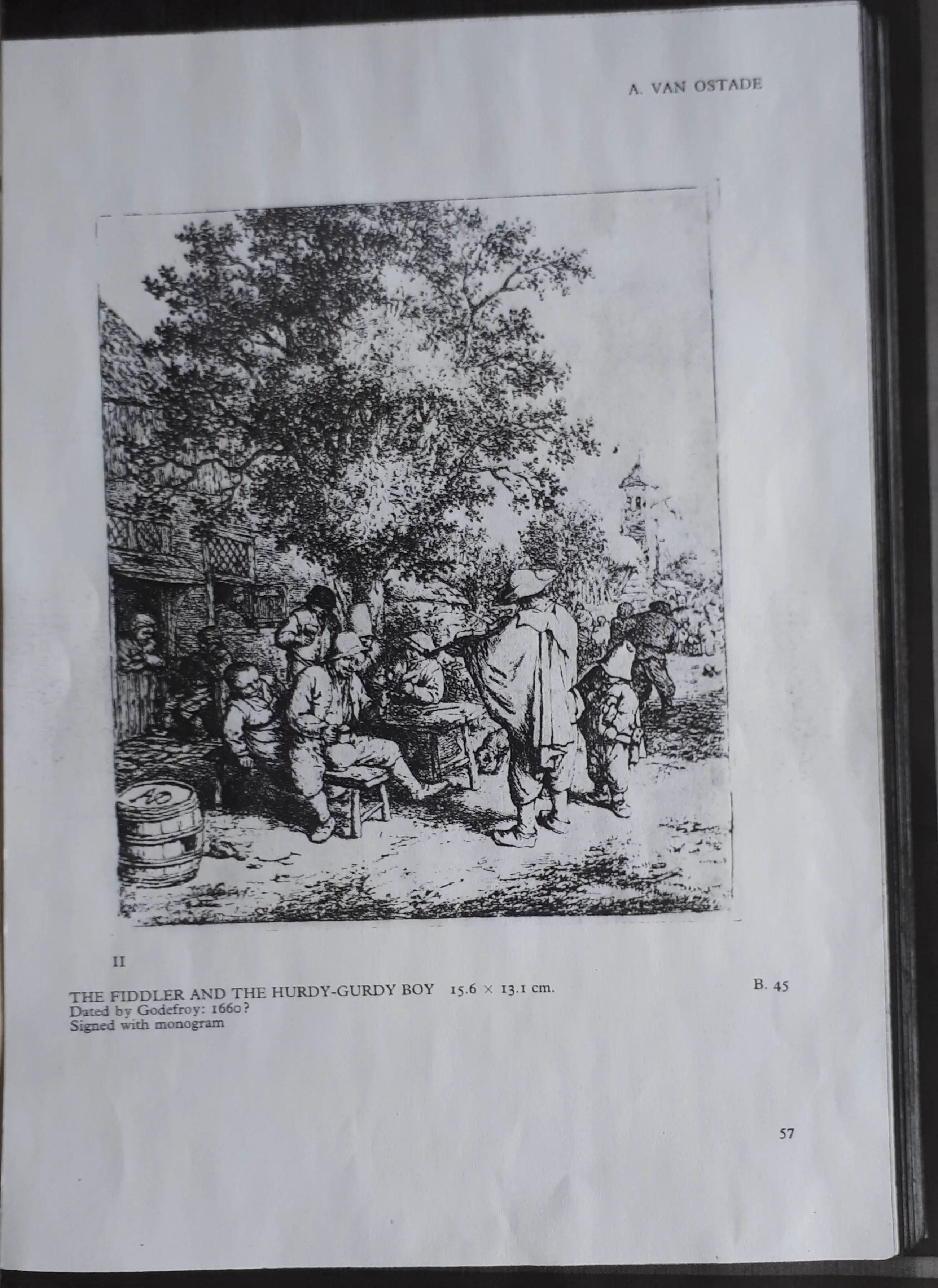 'De vioolspeler en de draailierspeler' ('The fiddler and the hurdy gurdy boy'), Bartsch/Hollstein 45, zevende staat van acht. Fragment watermerk: Top van een wapen (waarschijnlijk een wapen met een Franse lelie). Het papier en de drukkwaliteit wijzen op een latere druk uit de achttiende eeuw. Het betreft een afdruk van de echte koperplaat.