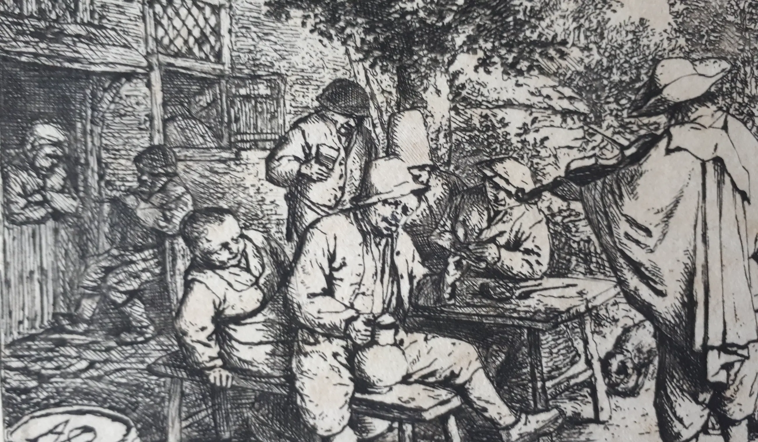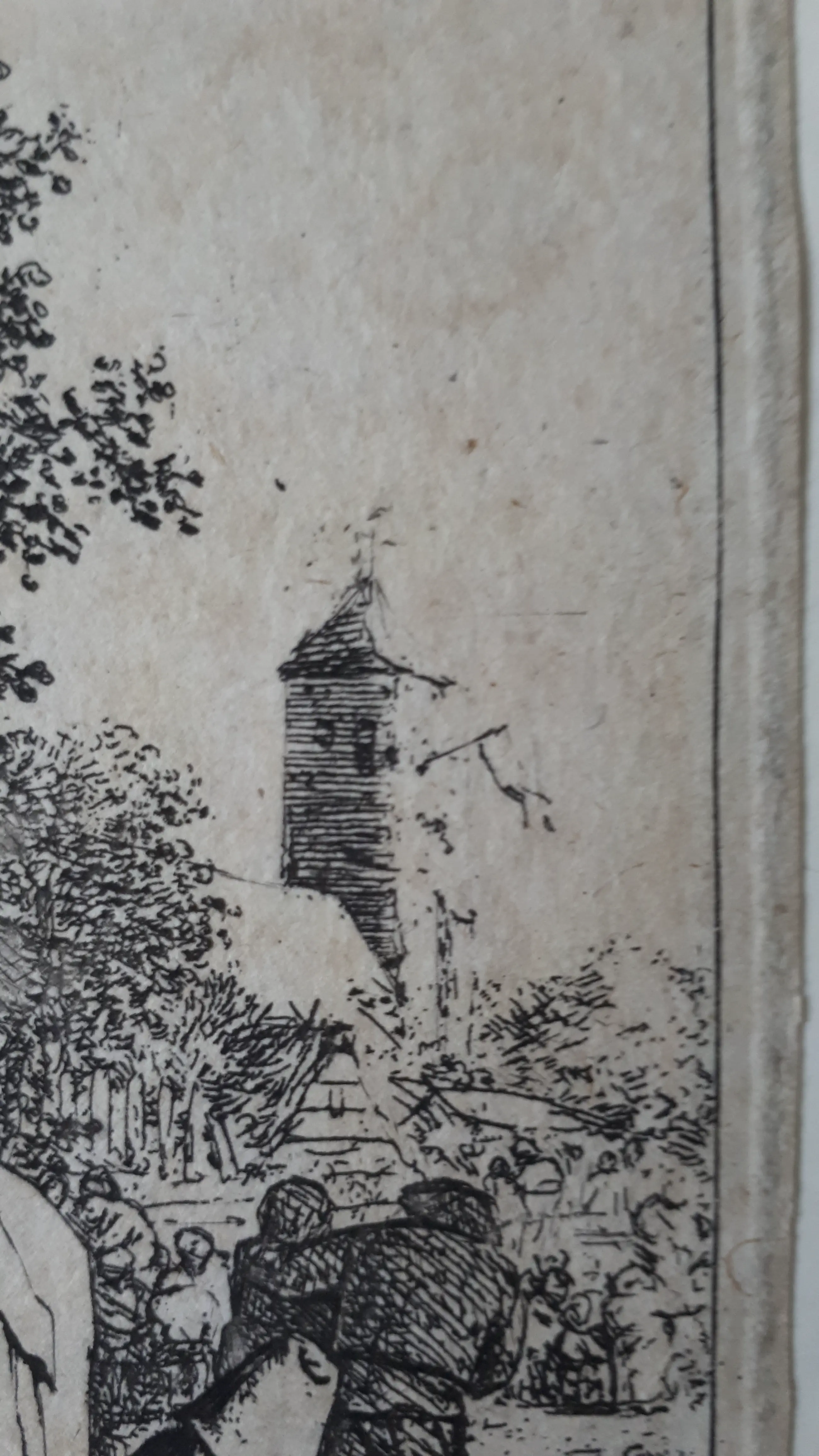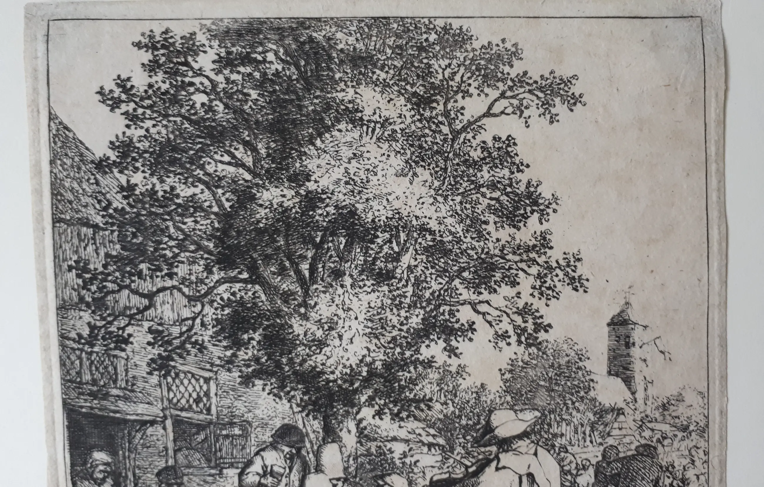 'De vioolspeler en de draailierspeler' ('The fiddler and the hurdy gurdy boy'), Bartsch/Hollstein 45, zevende staat van acht. Fragment watermerk: Top van een wapen (waarschijnlijk een wapen met een Franse lelie). Het papier en de drukkwaliteit wijzen op een latere druk uit de achttiende eeuw. Het betreft een afdruk van de echte koperplaat.