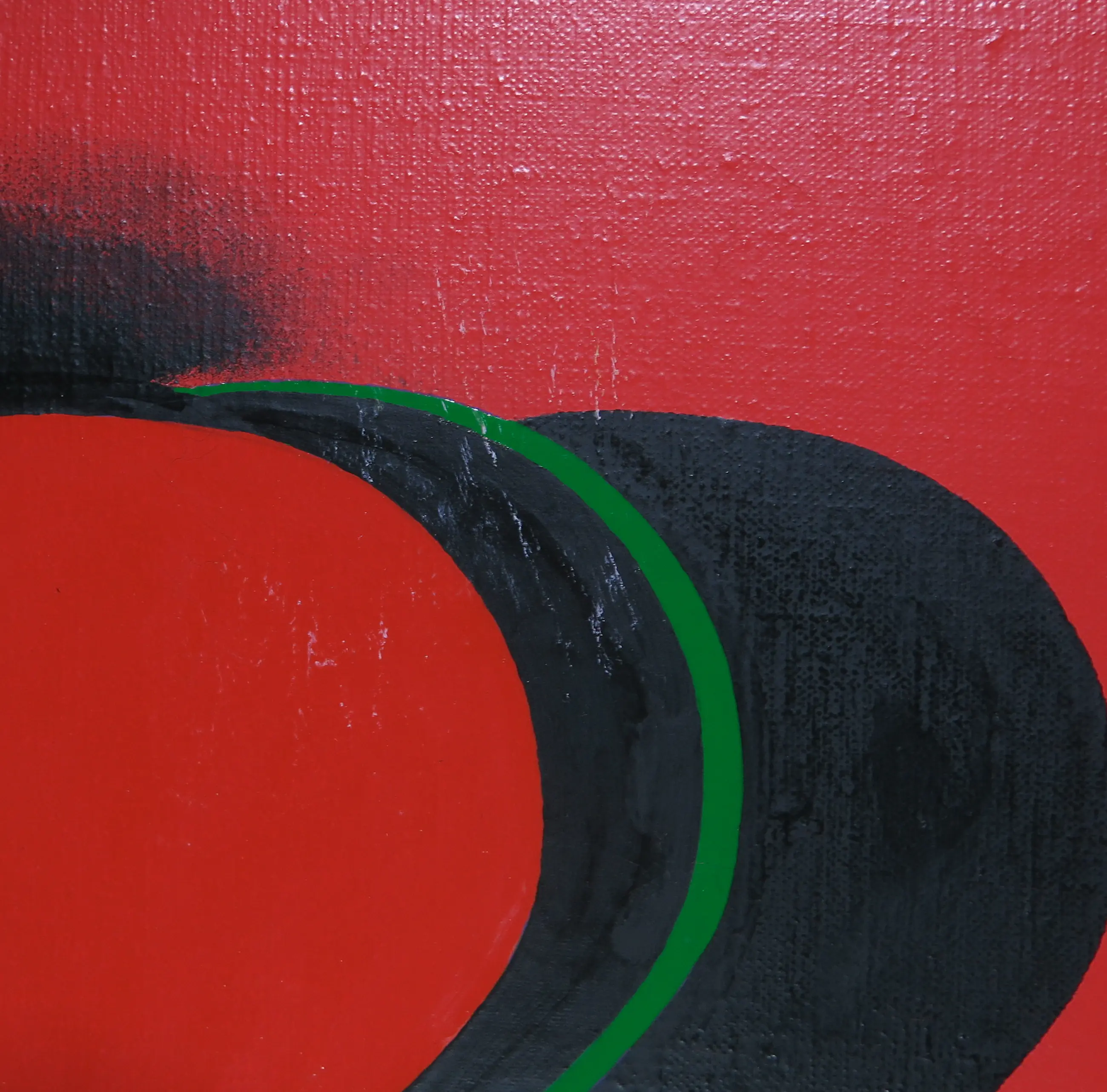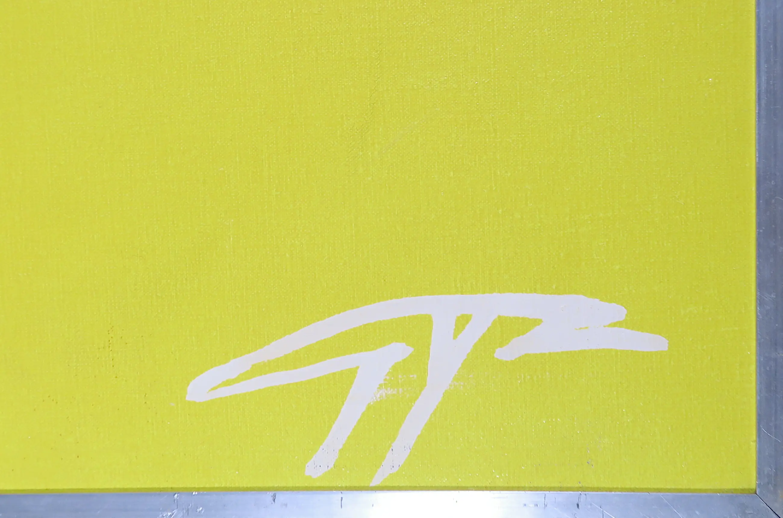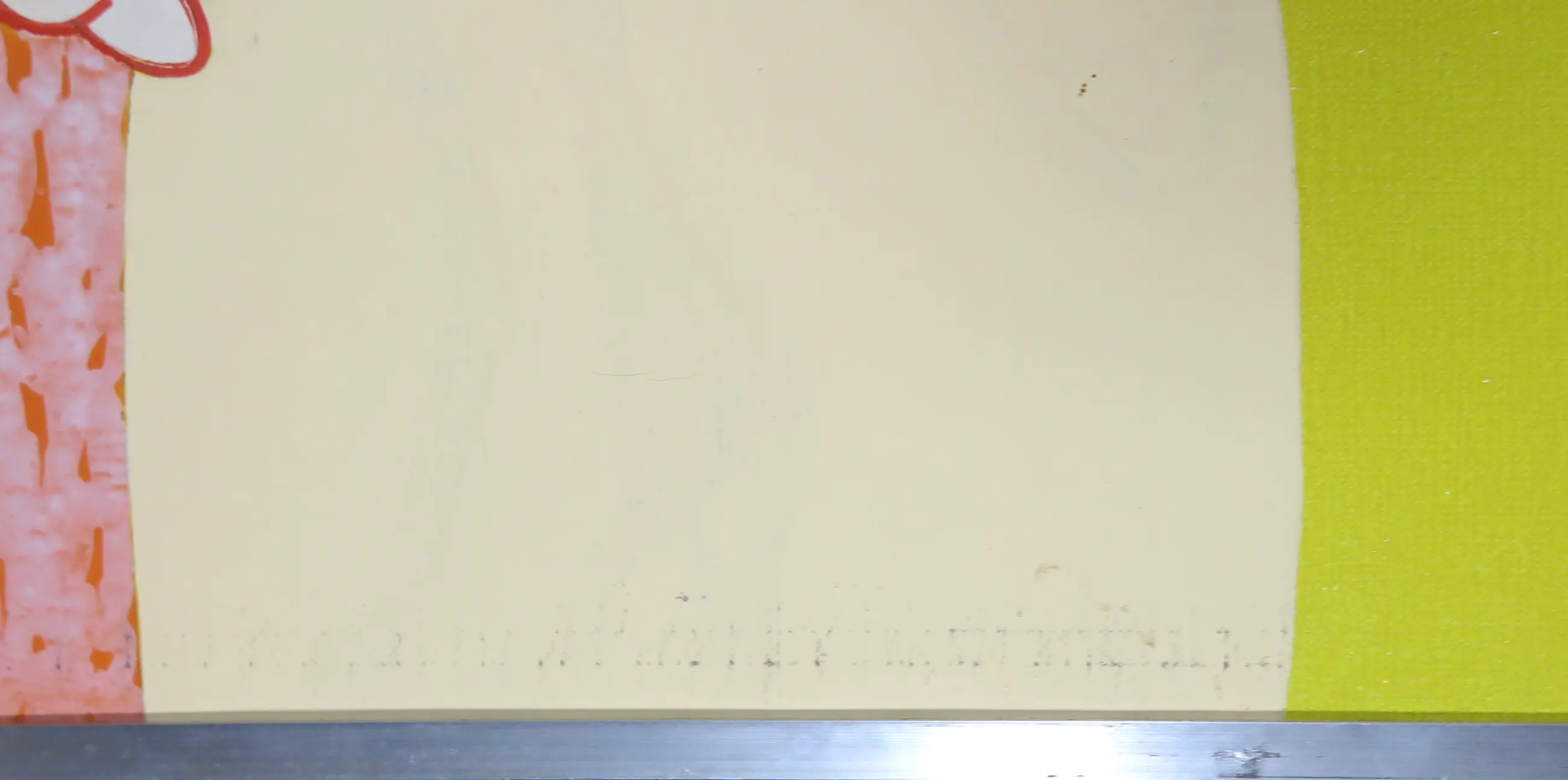 | Diverse schaafplekken op het doek en een lichte deuk in het gele vlak. | |