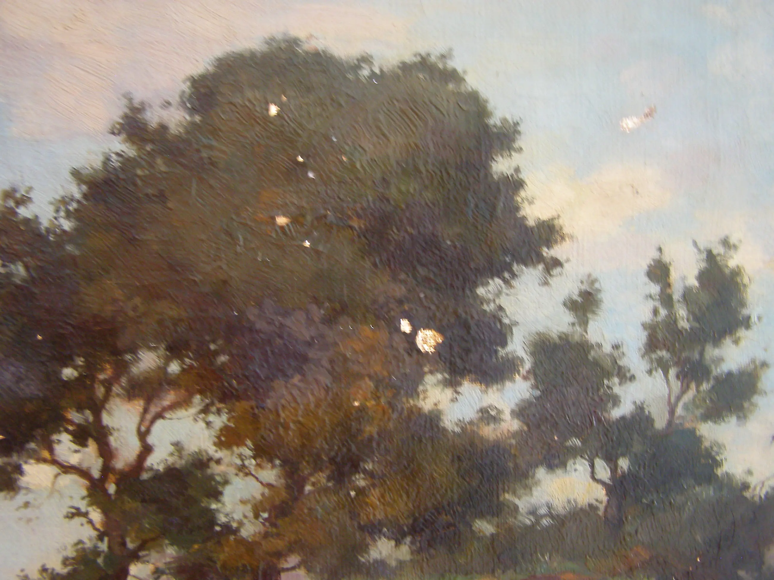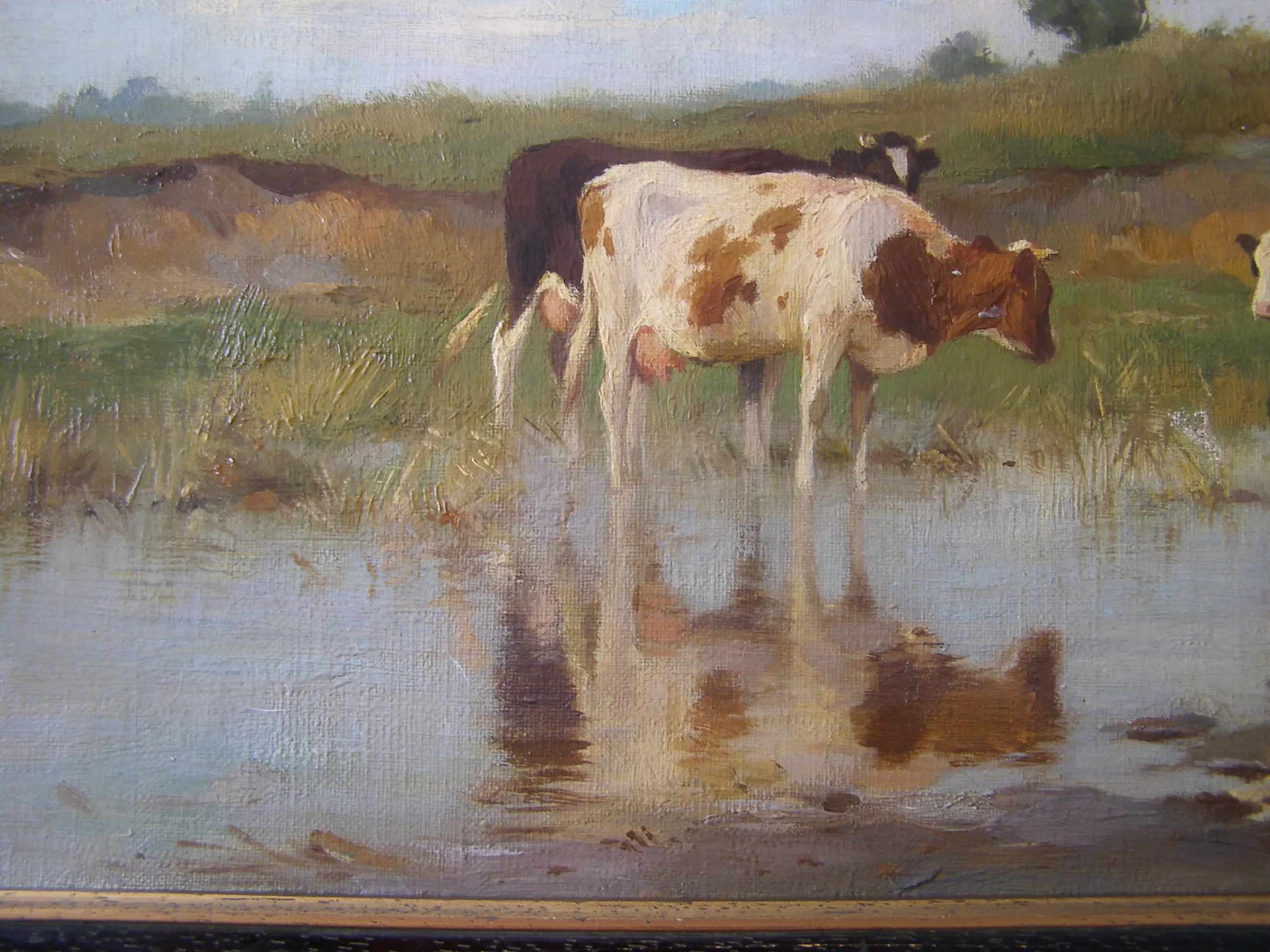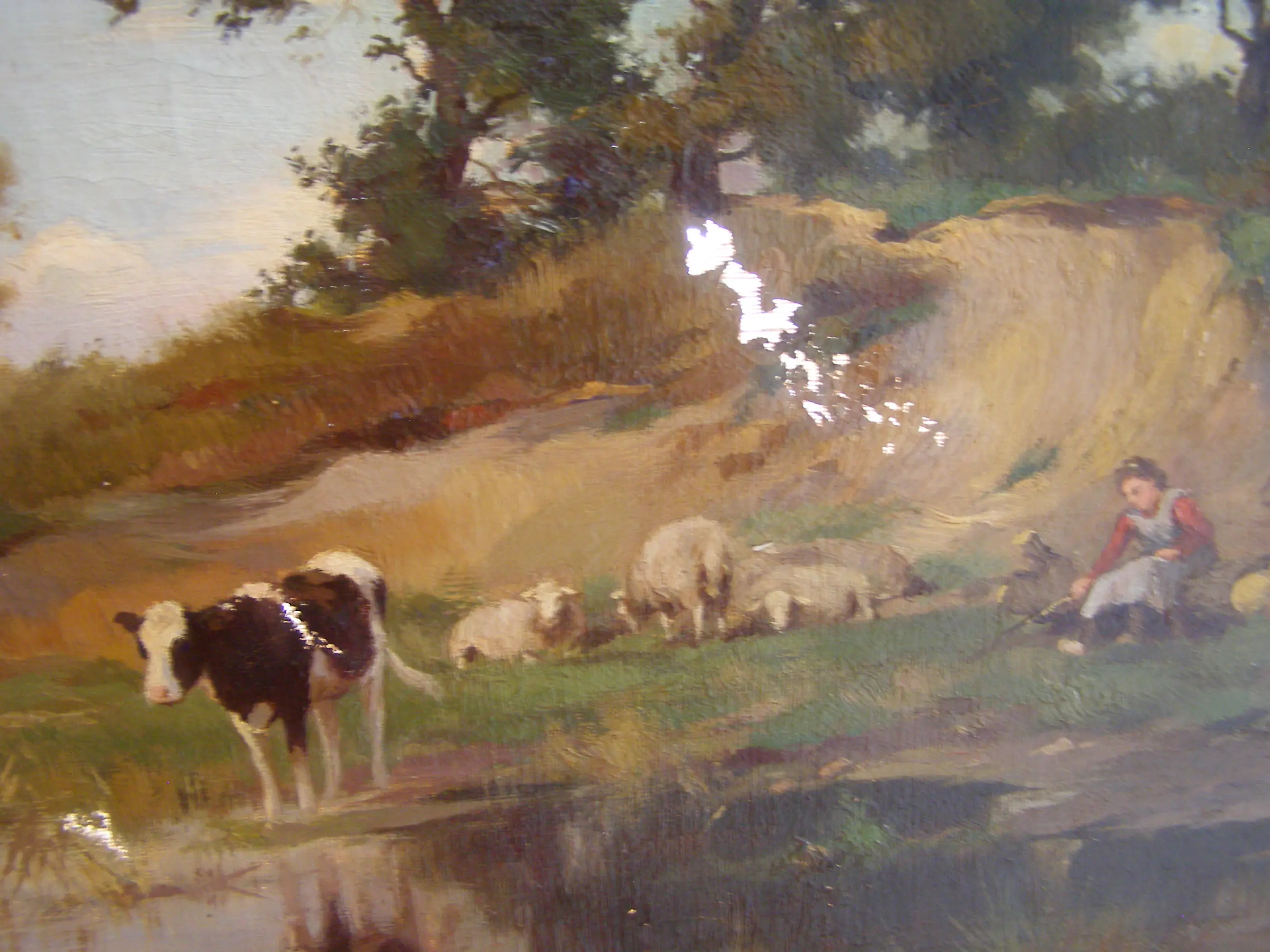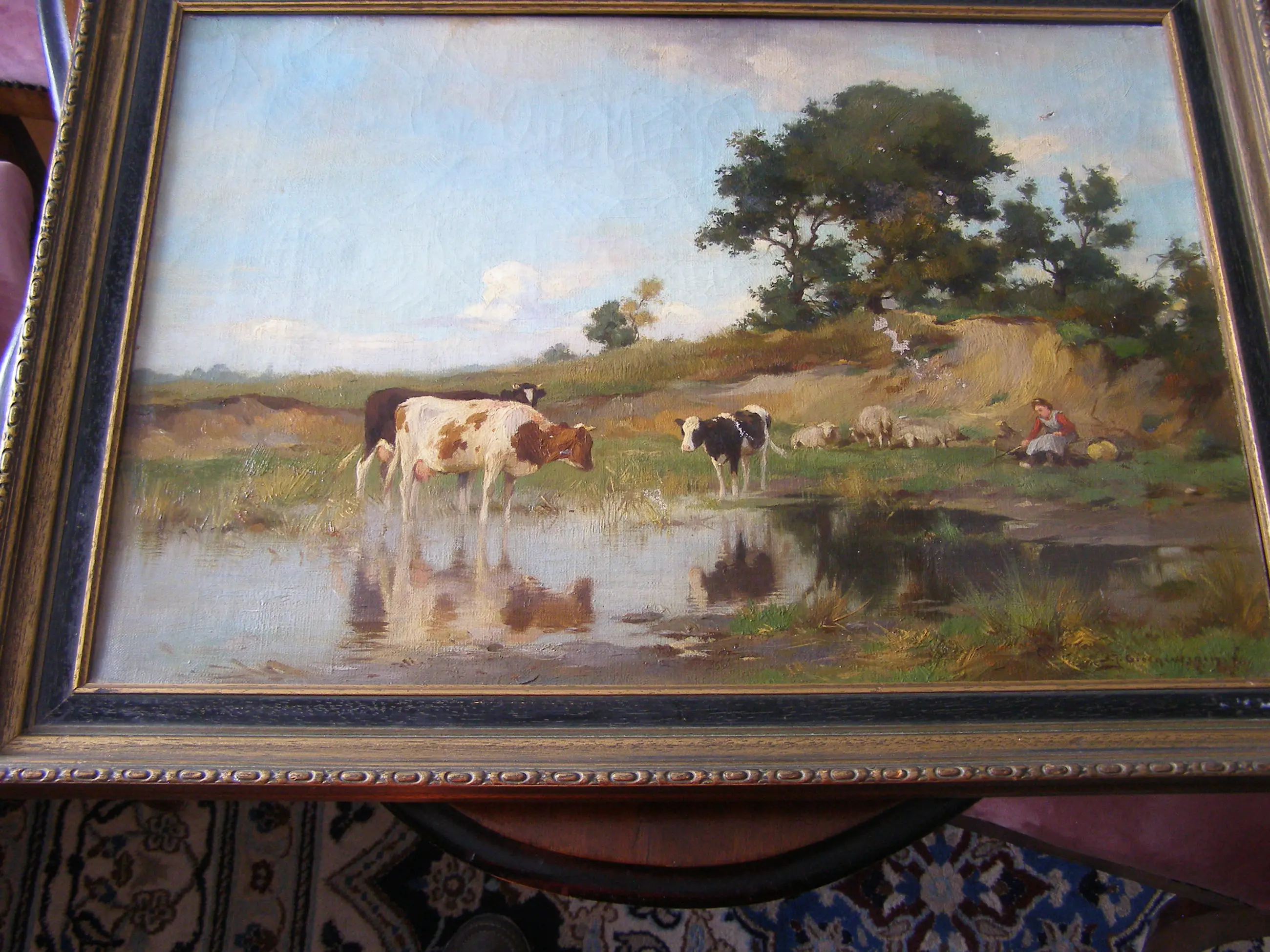 Koeien en kalf en schapen met een boerin in en landschap bij een waterplasje. Olieverf op doek. Gesigneerd ro A.J.Groenewegen. Er is in het schilderij enig verfverlies op verschillende plaatsen. Zie aub de foto's voor een beeld of kom u bij mij thuis op de hoogte stellen