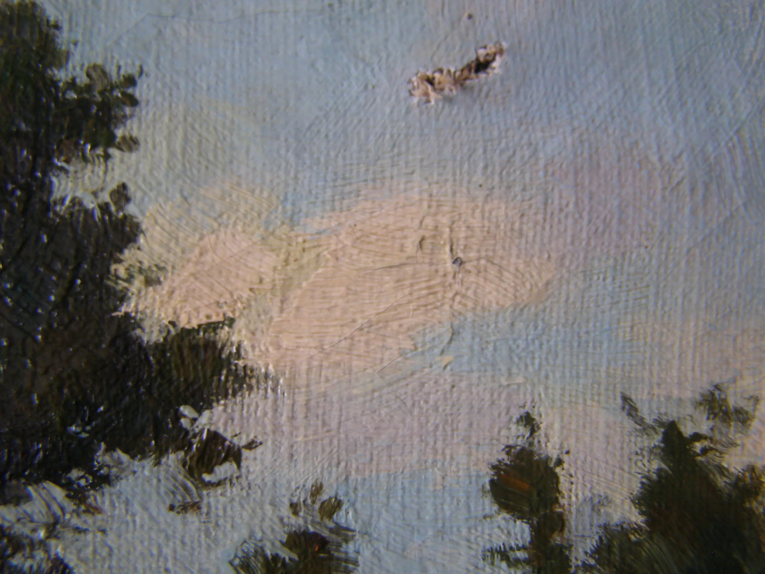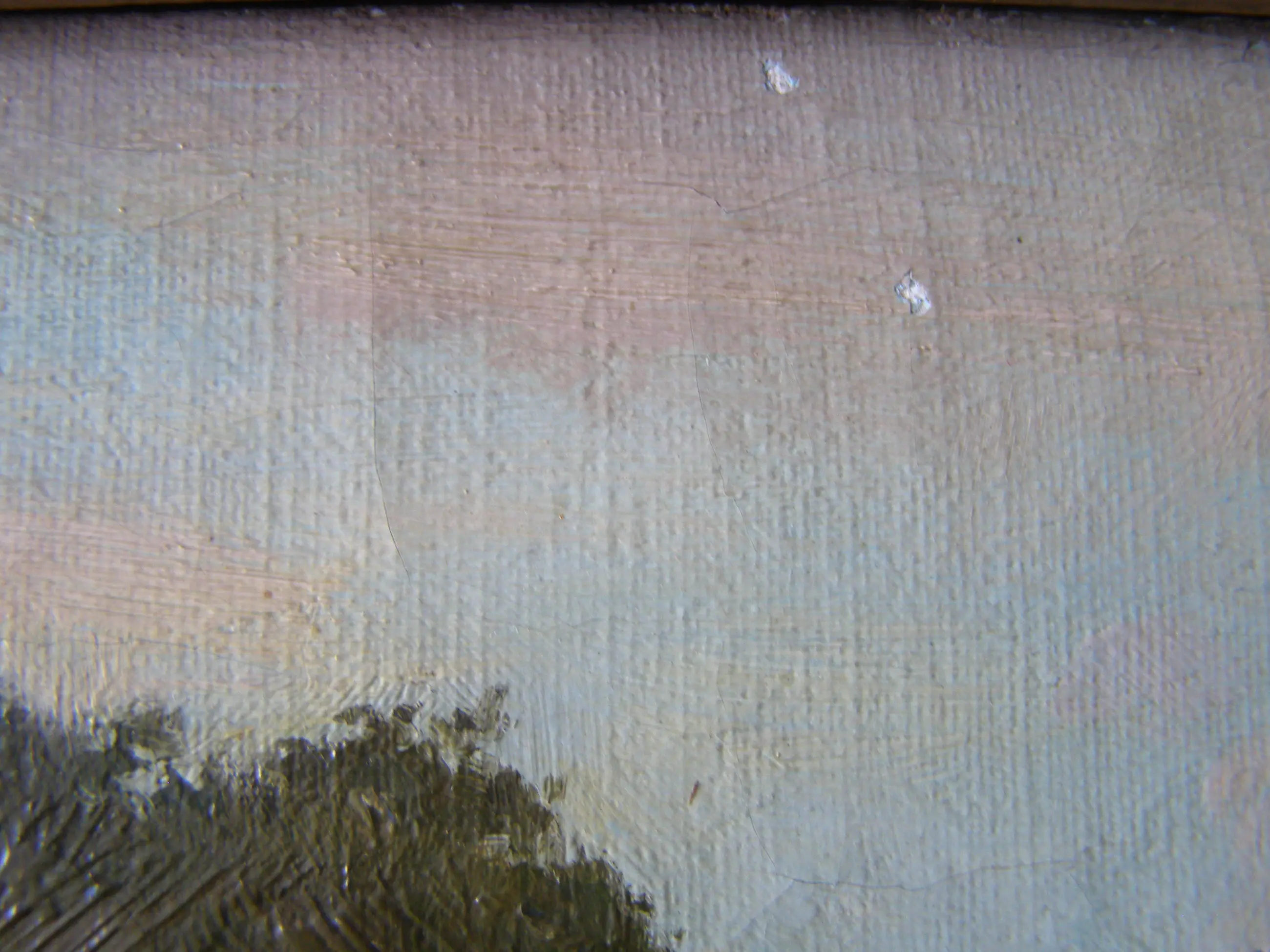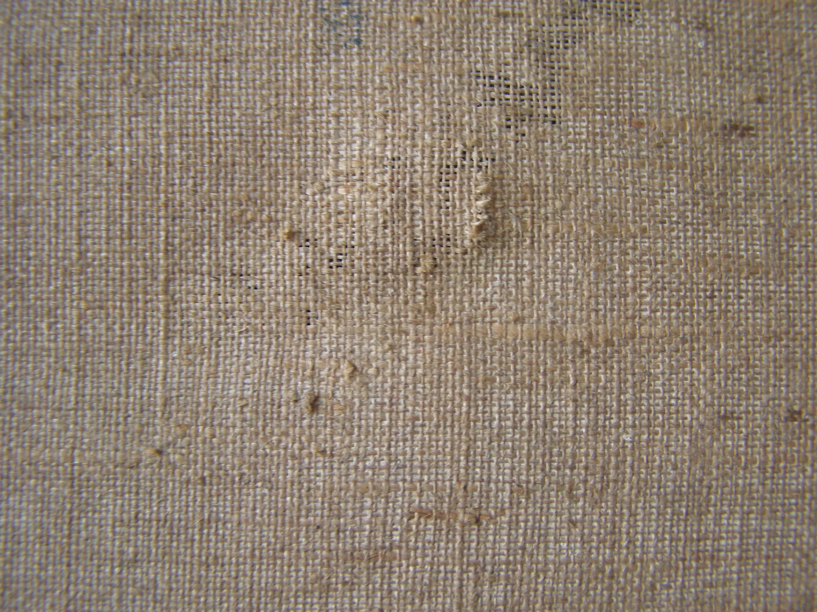In het doek verfverlies op verschillende plaatsen. Zie aub de foto's