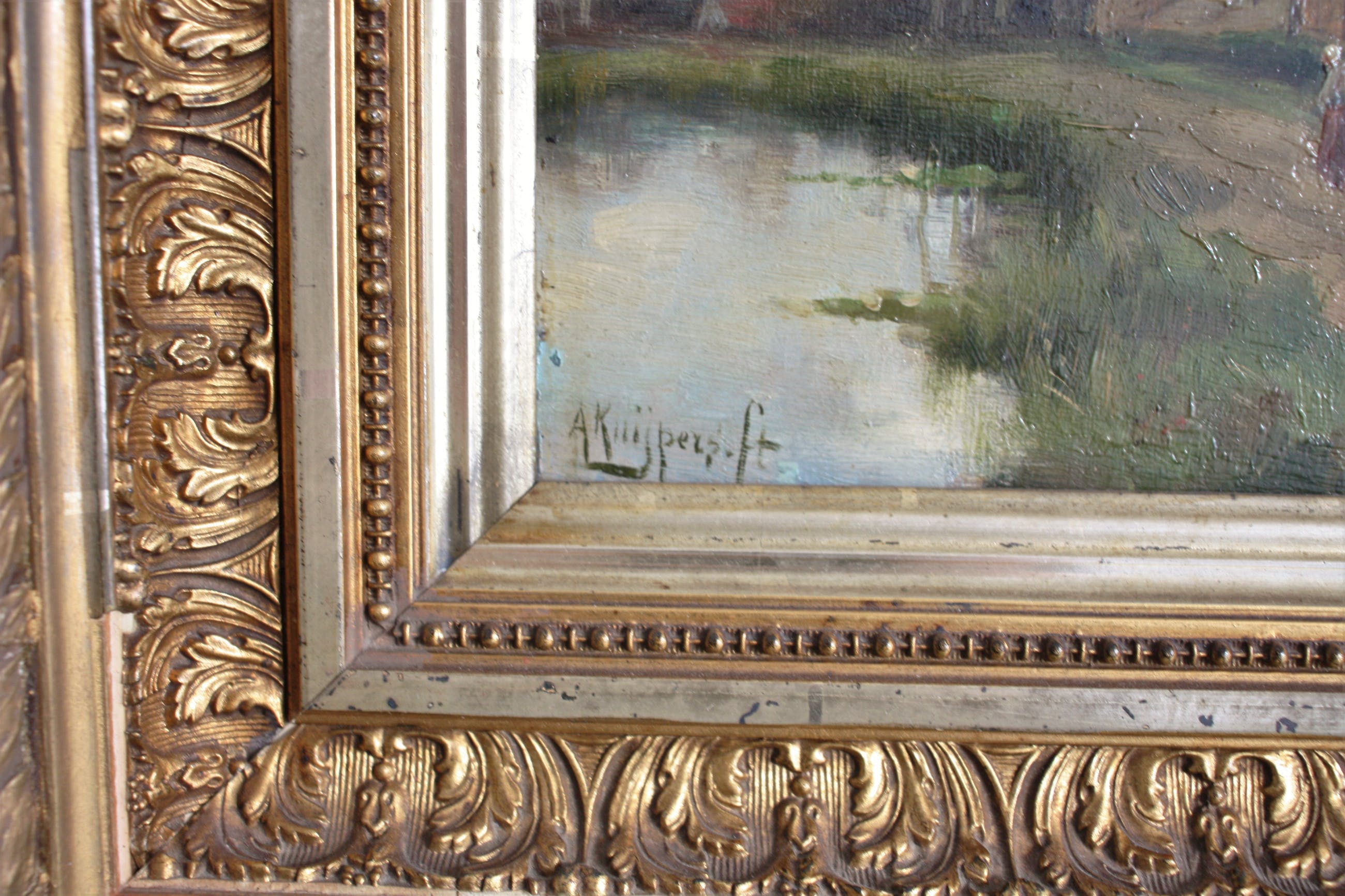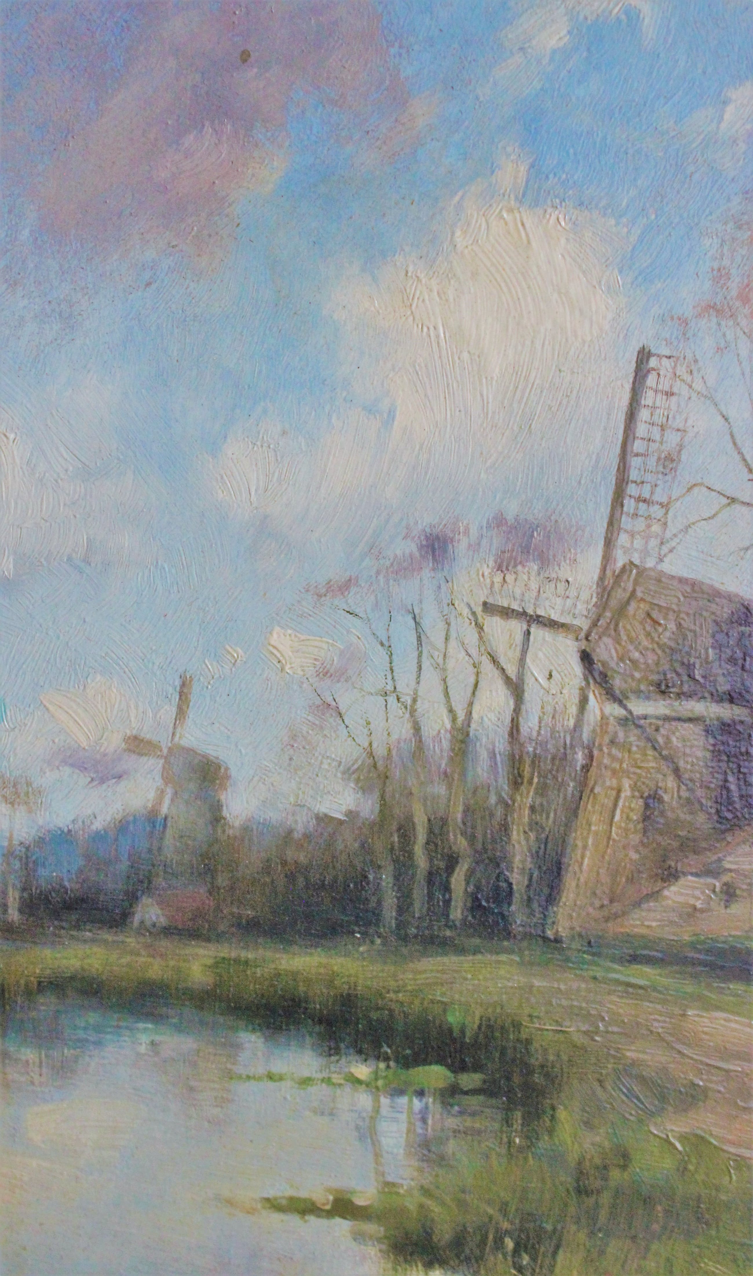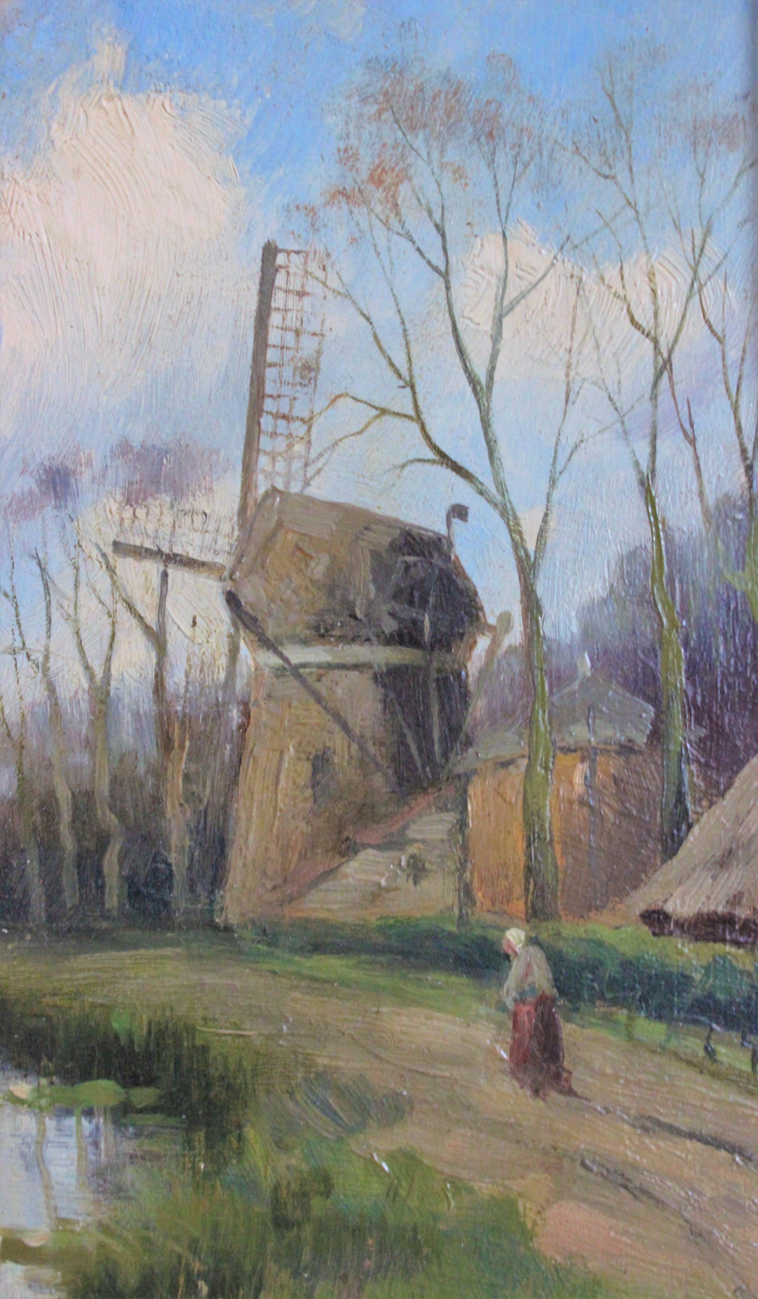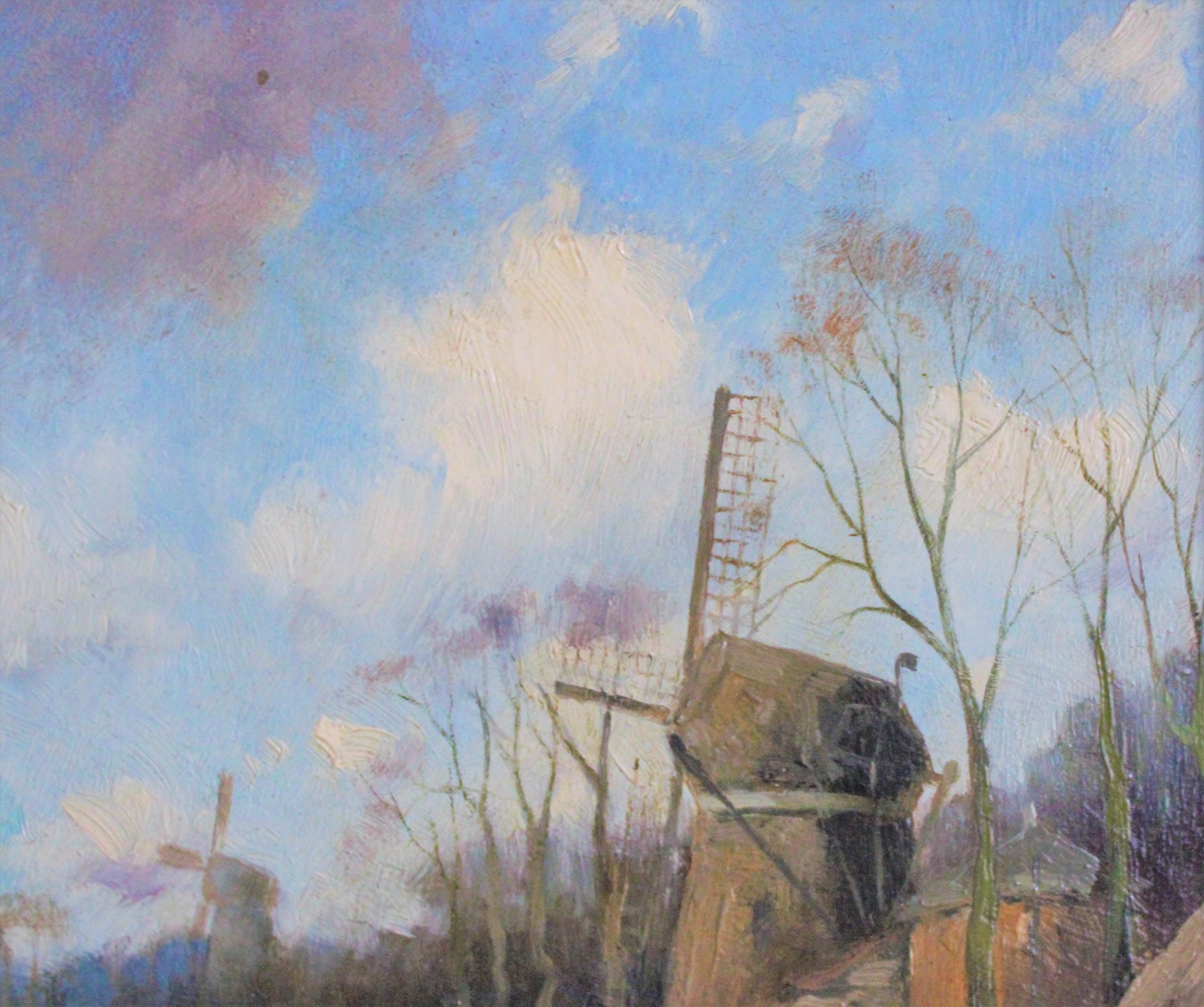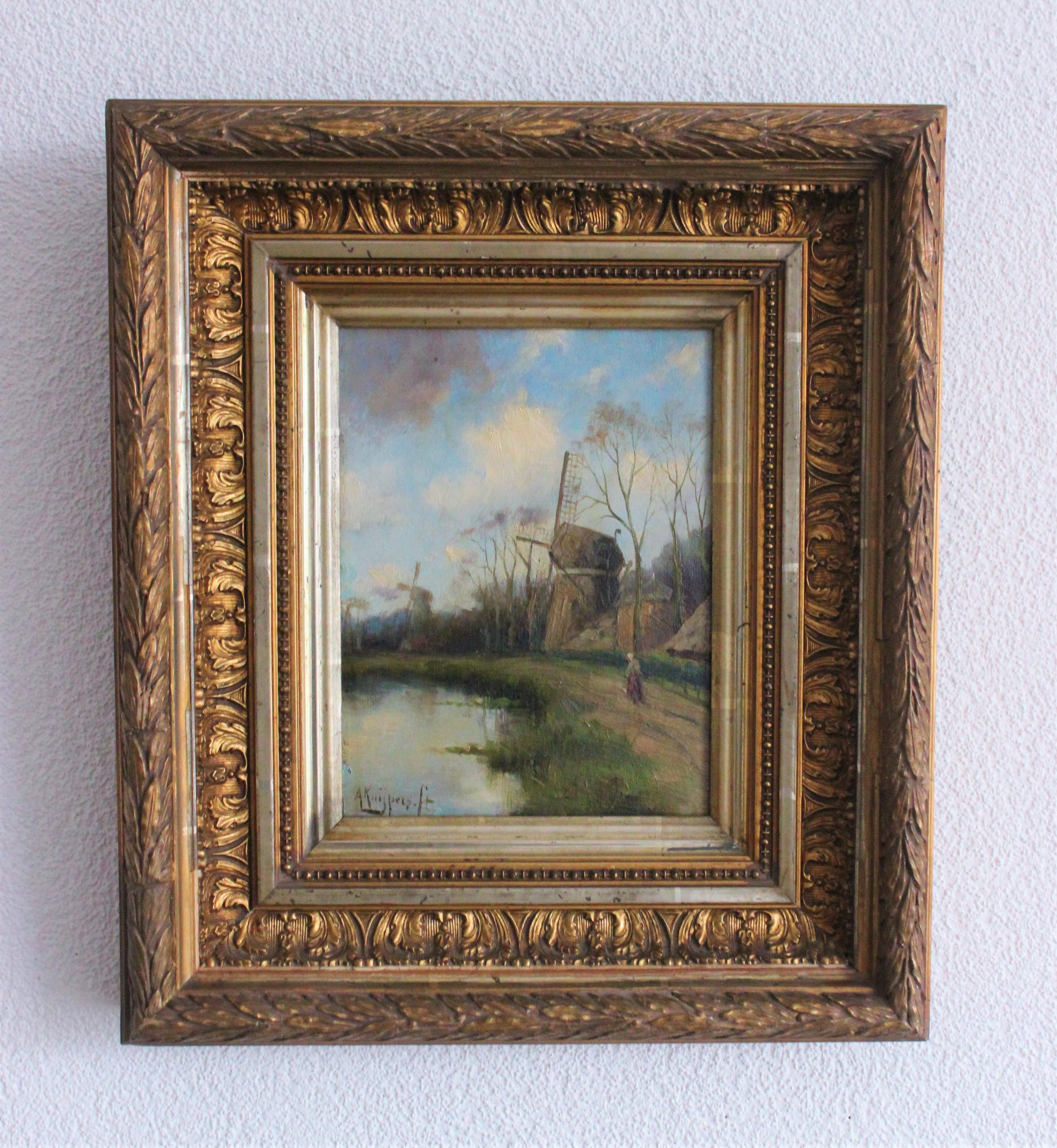 Dit werk is van de Nederlandse kunstenaar Adrianus Kuypers. Op het paneel zijn twee molens aan het water te zien en een wandelaarster op een zandpad. Het werk is rechtsonder gesigneerd en komt in een vergulde lijst met floraal bandwerk.