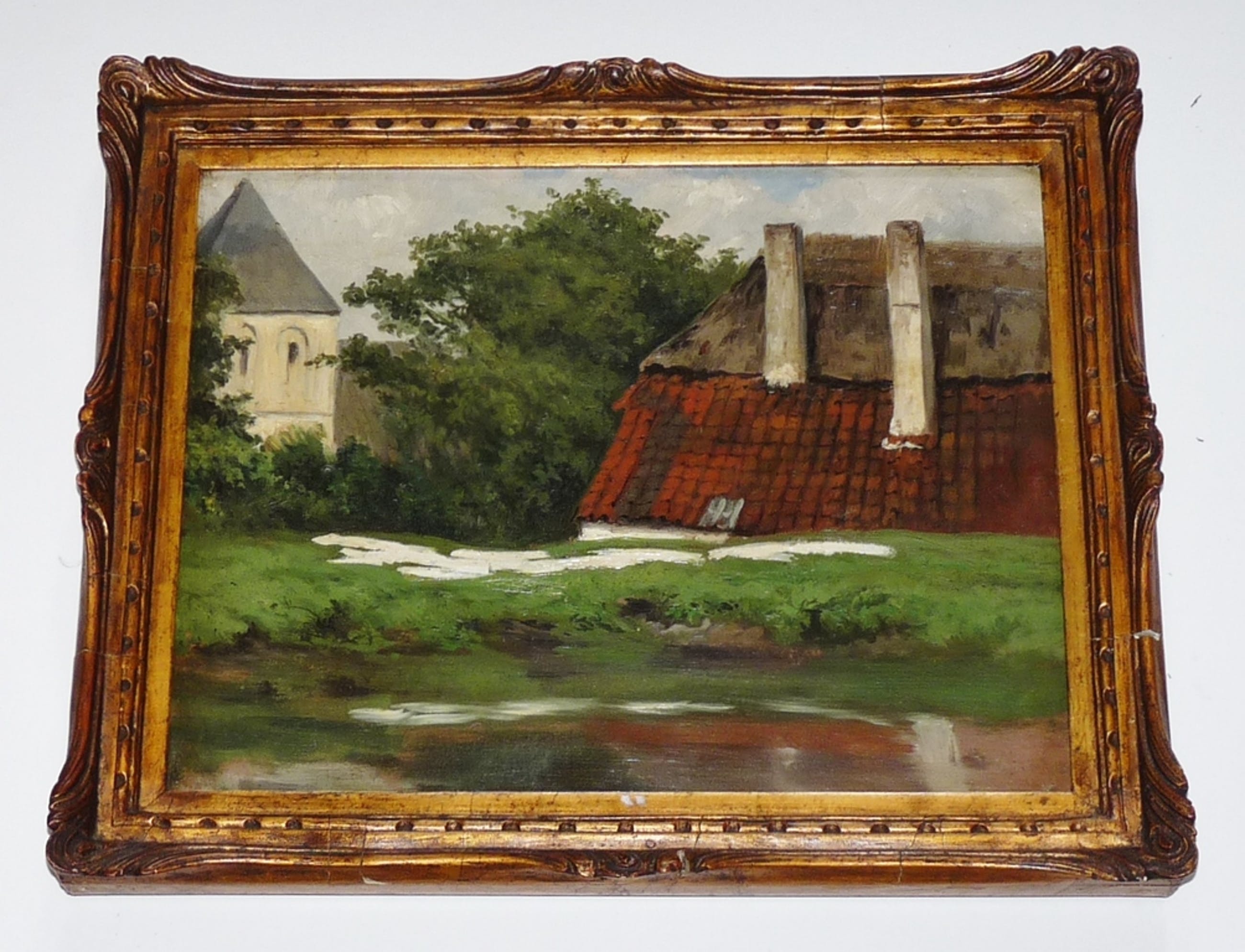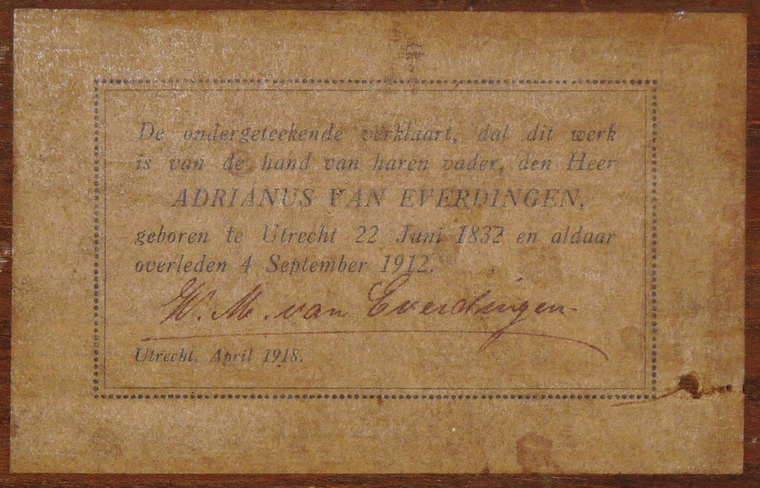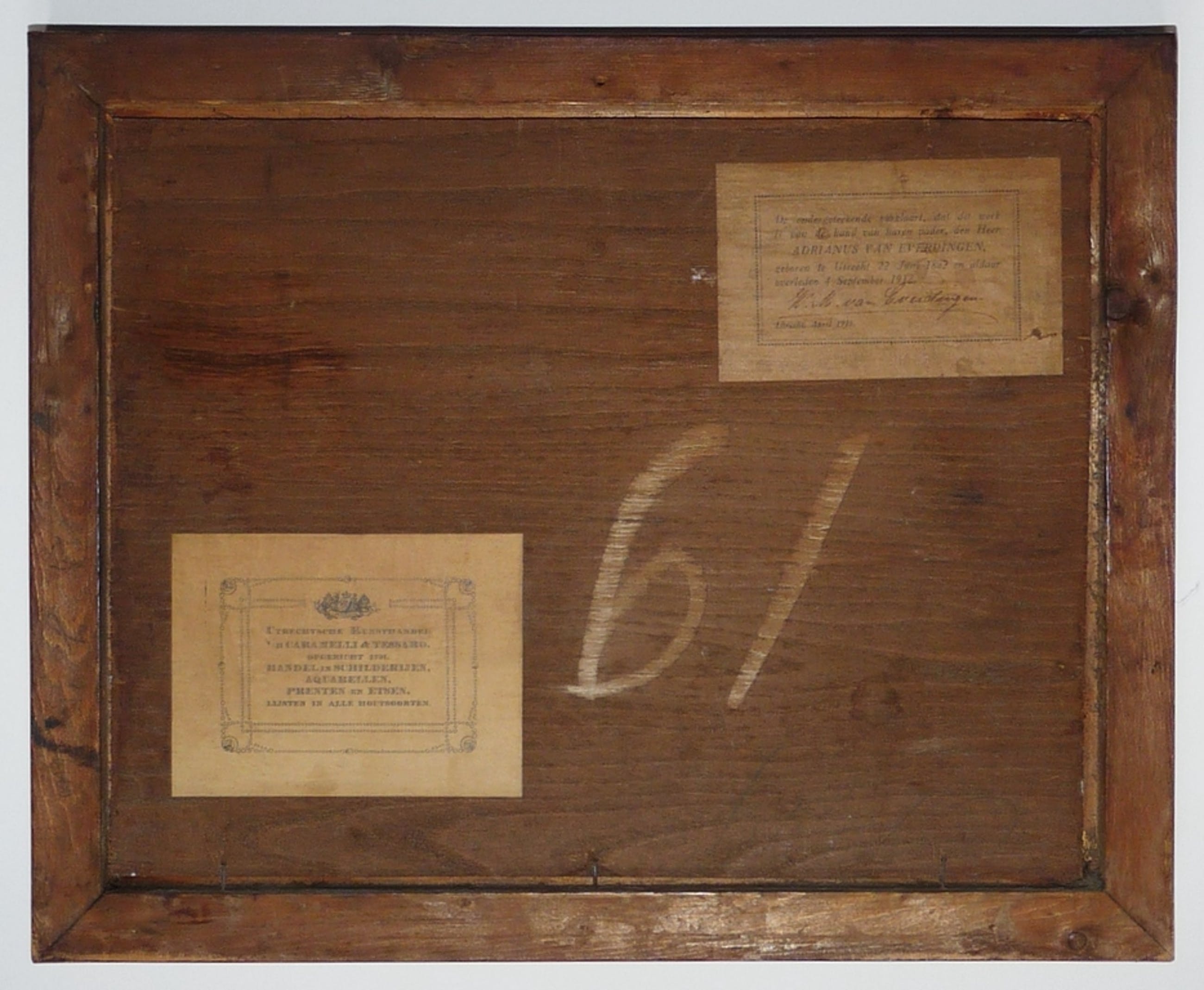 *Het schilderij is in goede conditie. Het betreft een maroufle (papier op paneel verlijmd) De oude lijst is aan de zijkanten beschadigd.