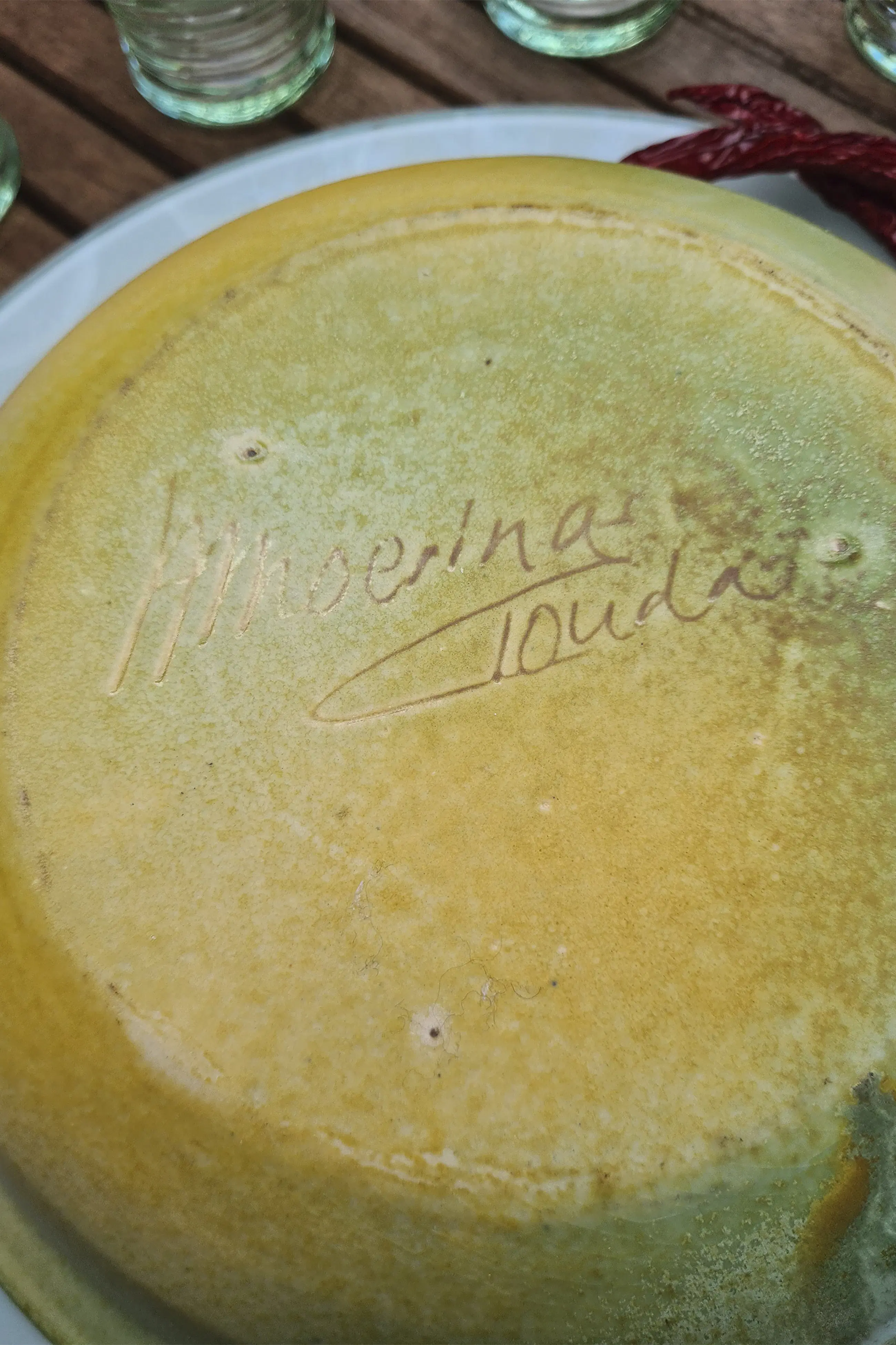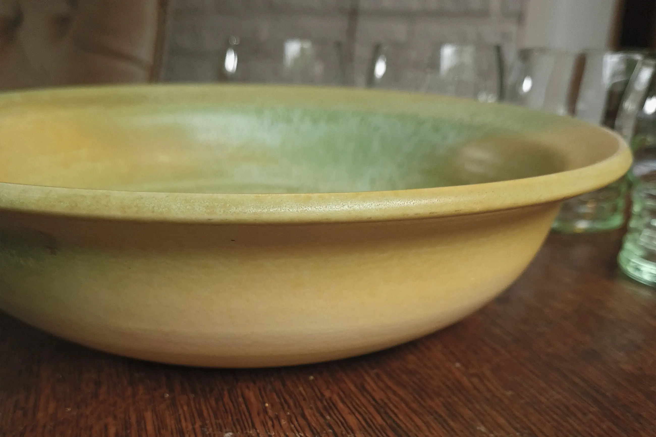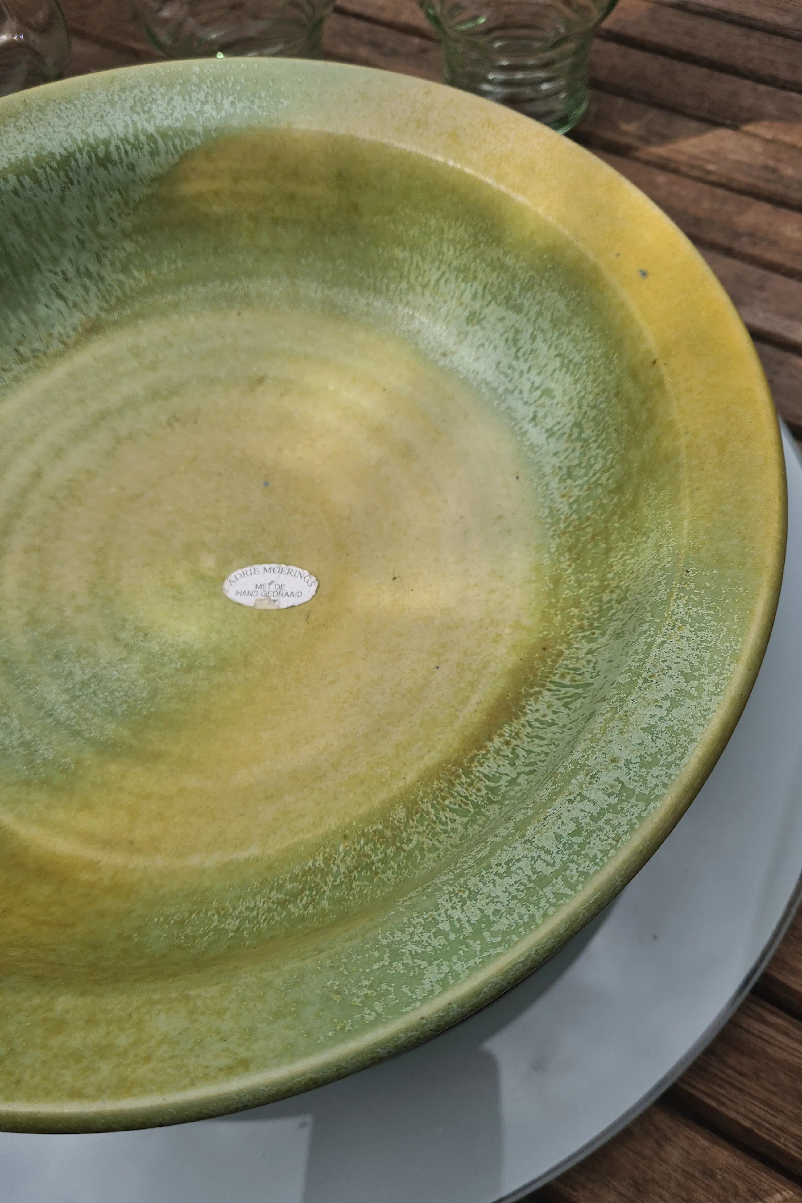 in de kleuren groen-creme-room geel van Potterie Adrie Moerings uit Gouda. In uitstekende conditie, met de hand gesigneerd aan de achterzijde en voorzien van een merksticker.