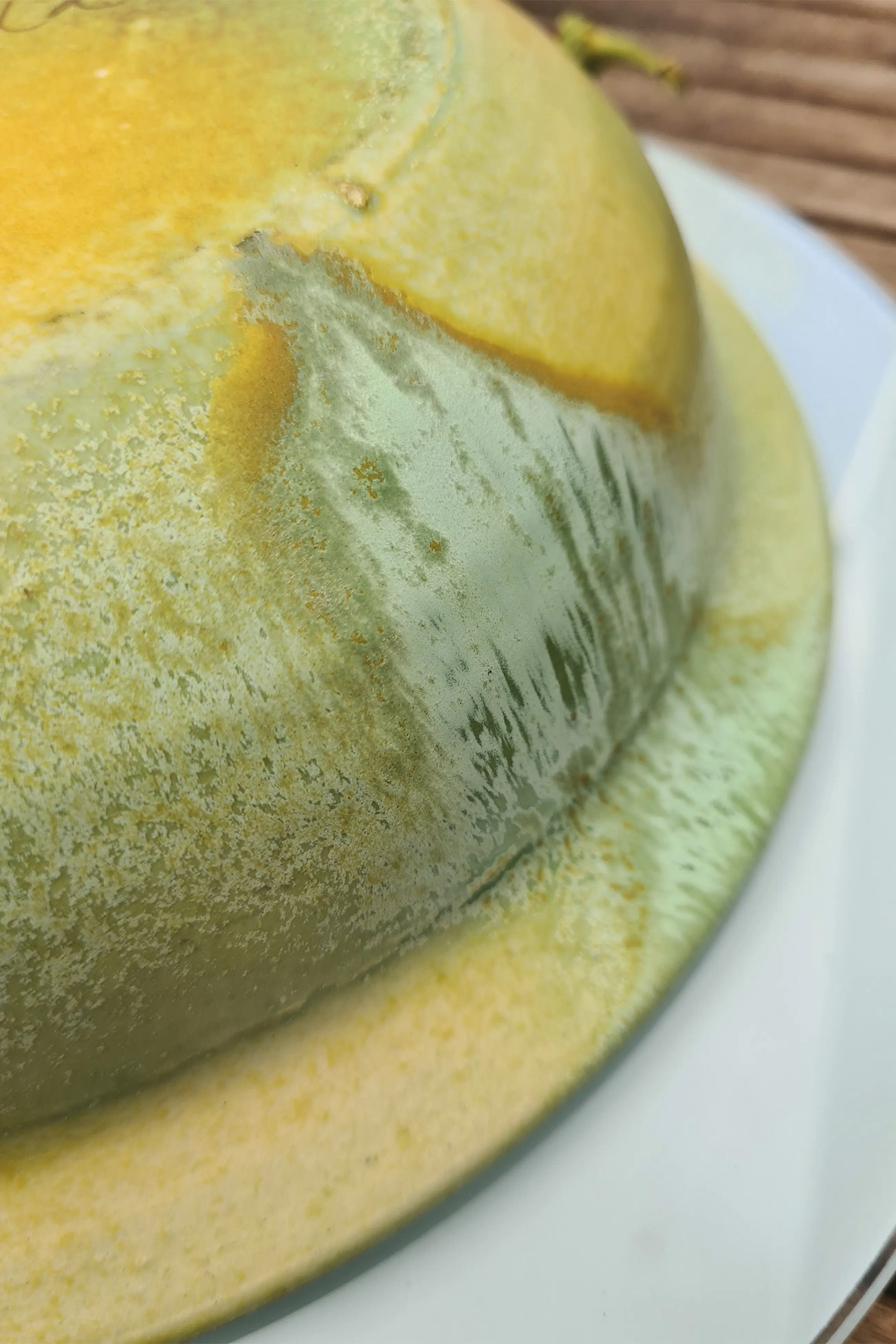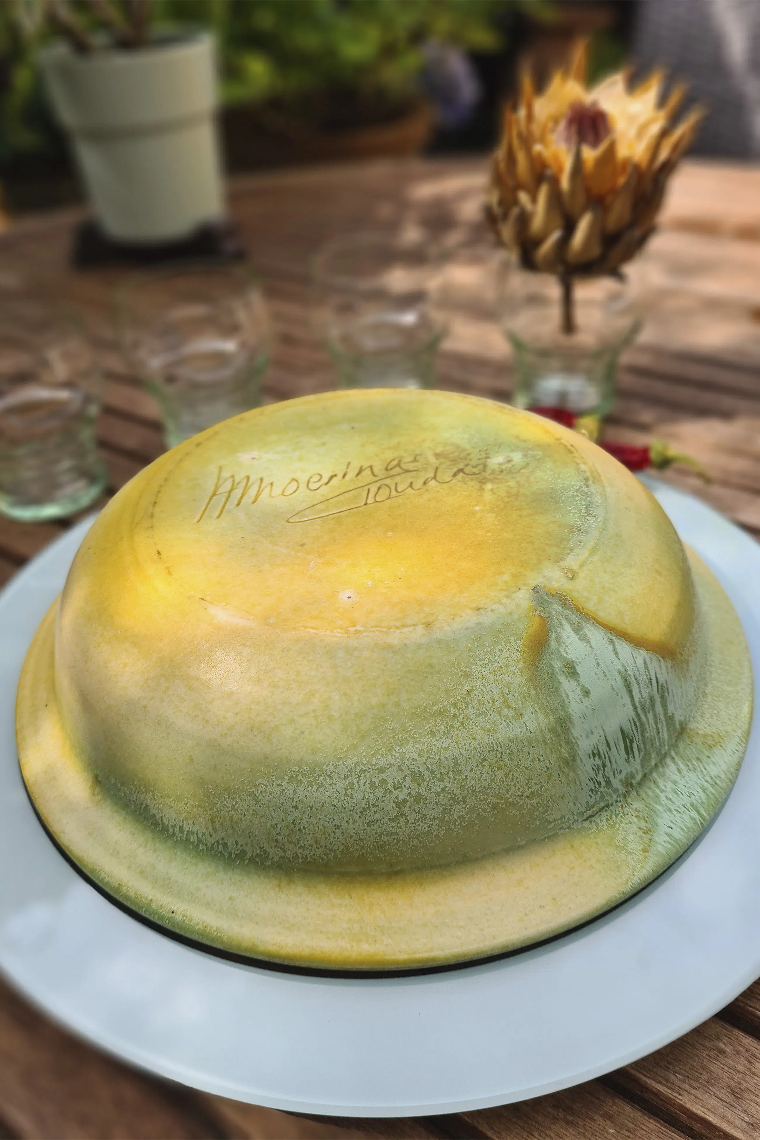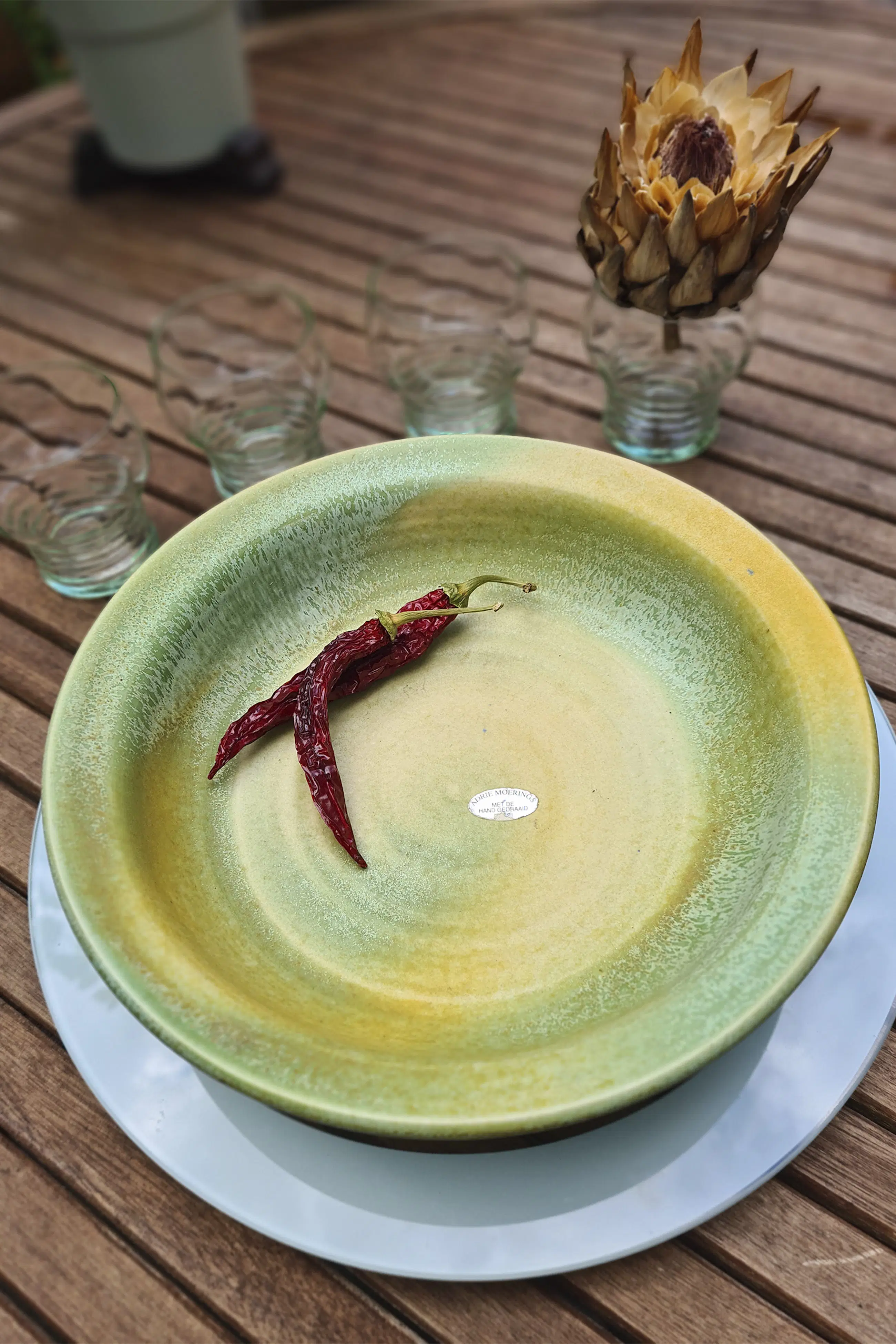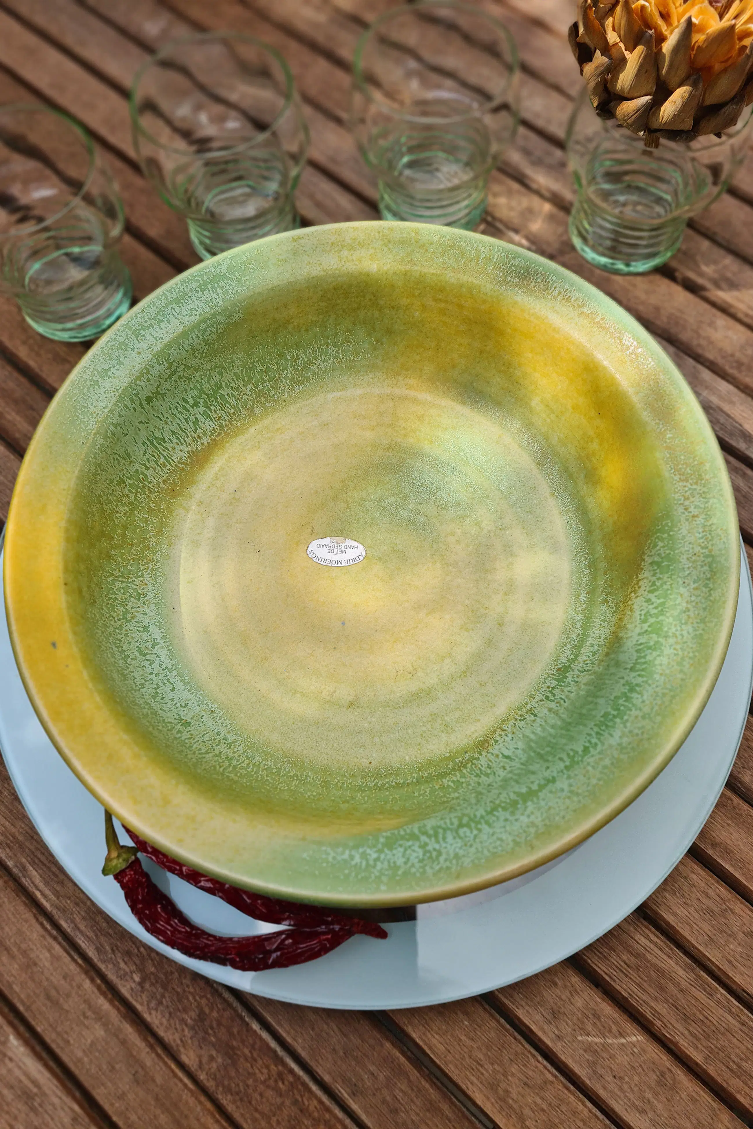 in de kleuren groen-creme-room geel van Potterie Adrie Moerings uit Gouda. In uitstekende conditie, met de hand gesigneerd aan de achterzijde en voorzien van een merksticker.