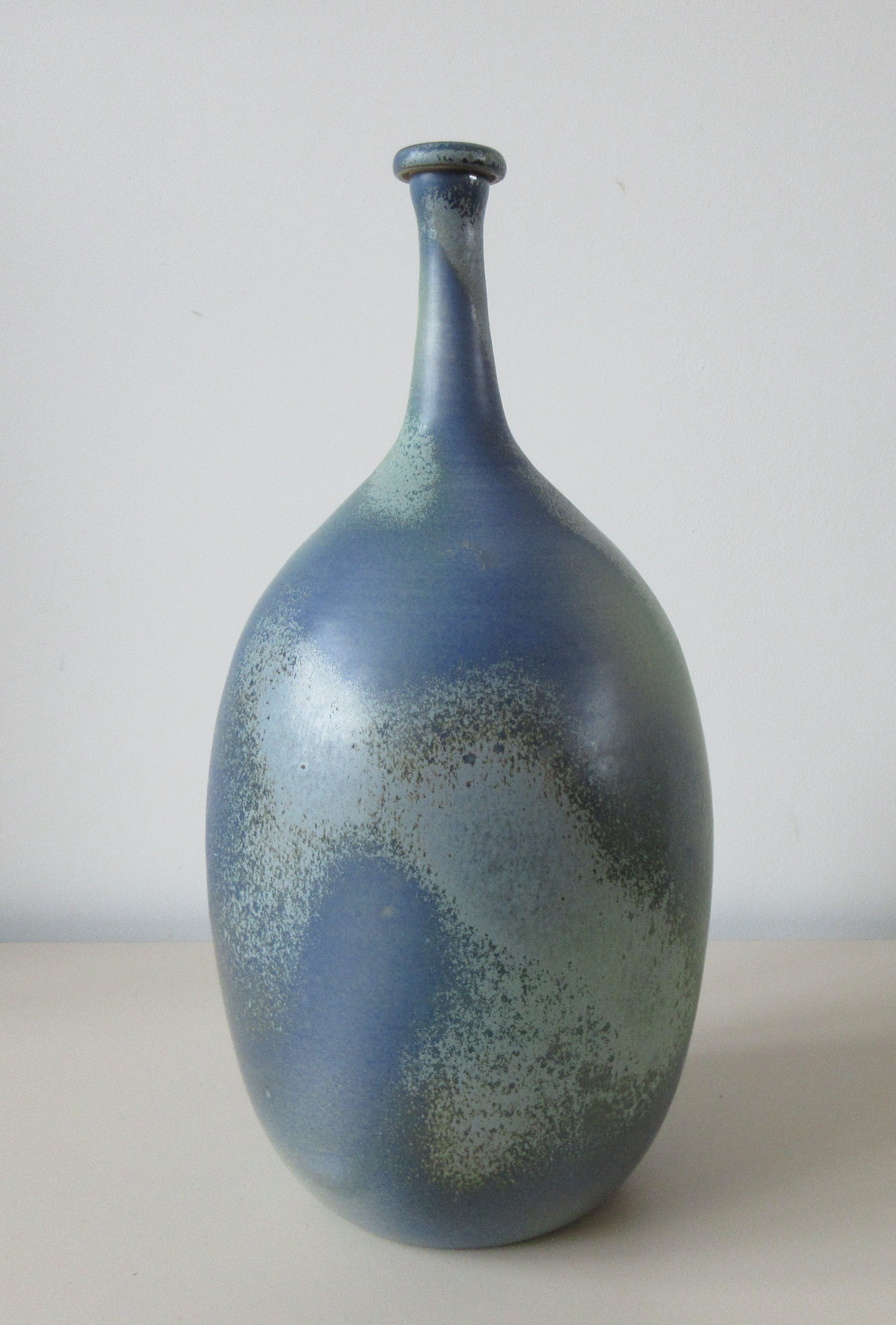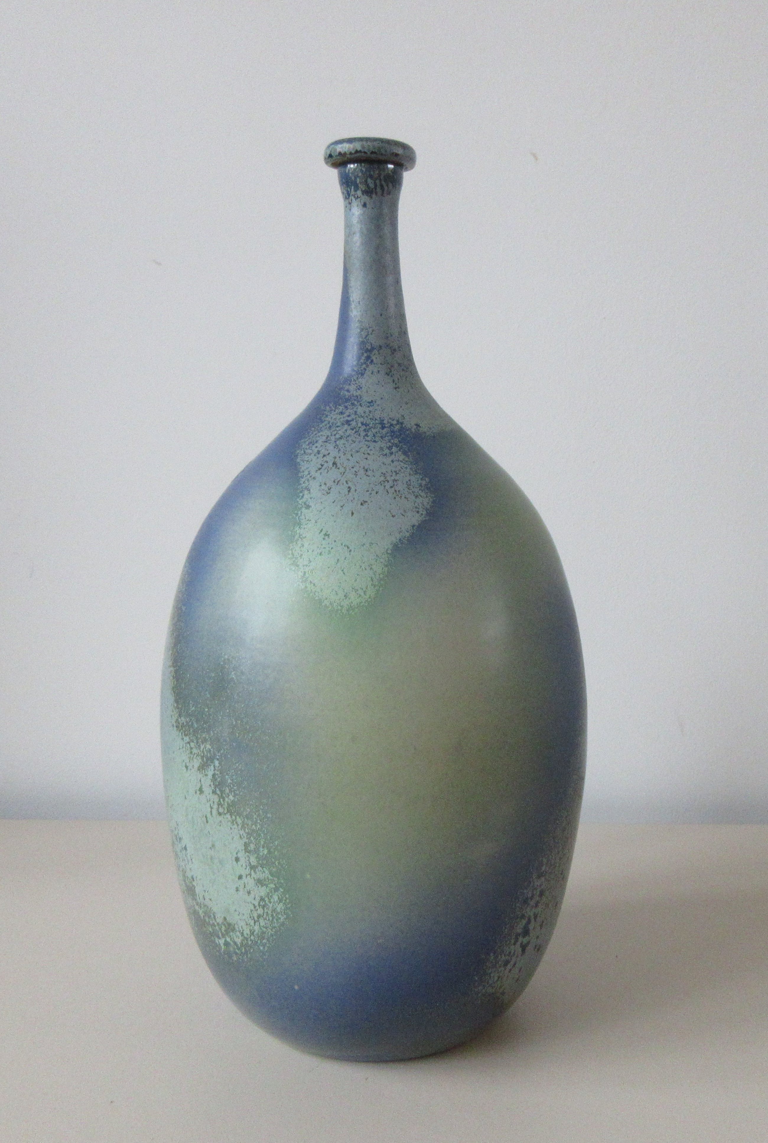 Grote aardewerken Flesvaas met groen/blauw glazuur uitgevoerd door Adrie Moerings in eigen atelier in Gouda. Gesigneerd aan de achterzijde.