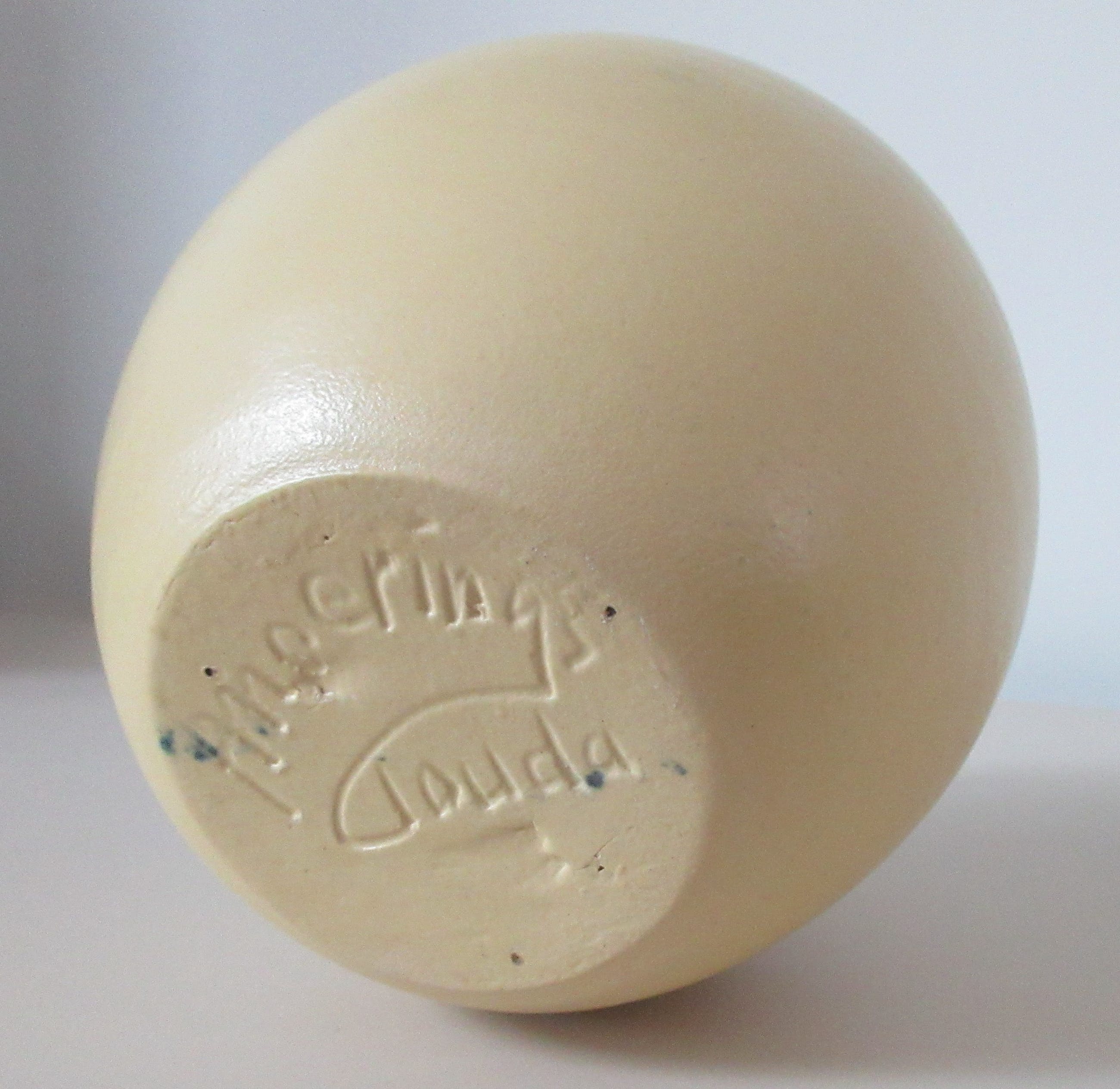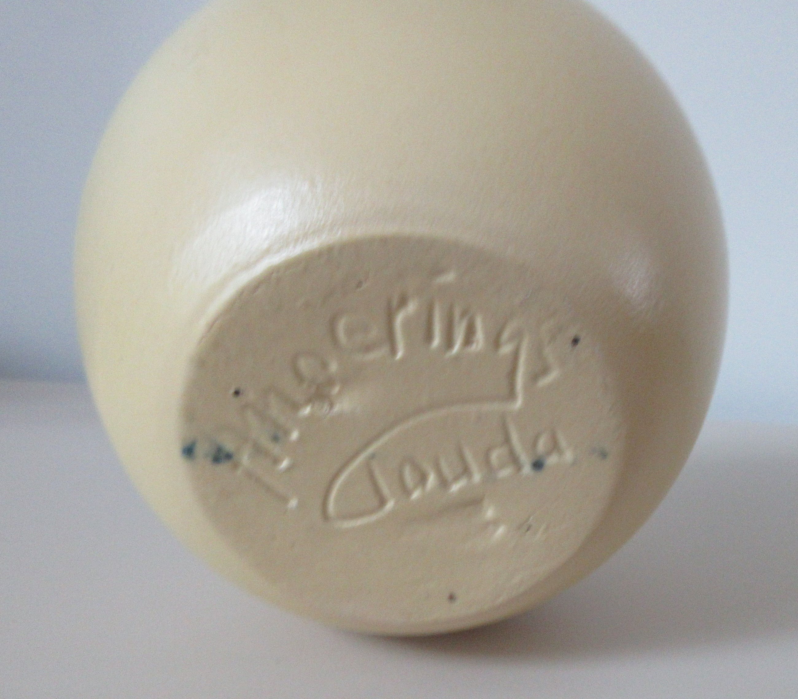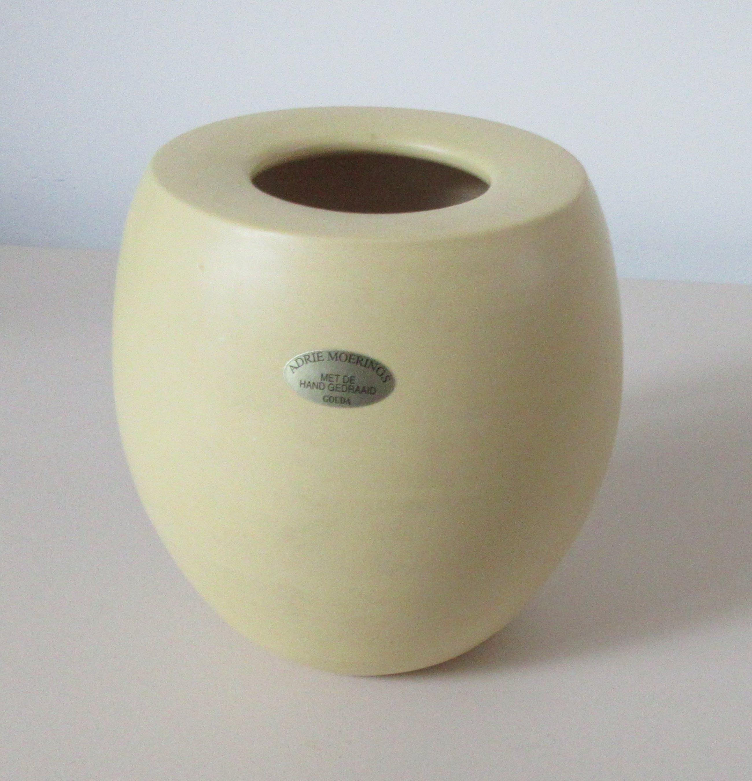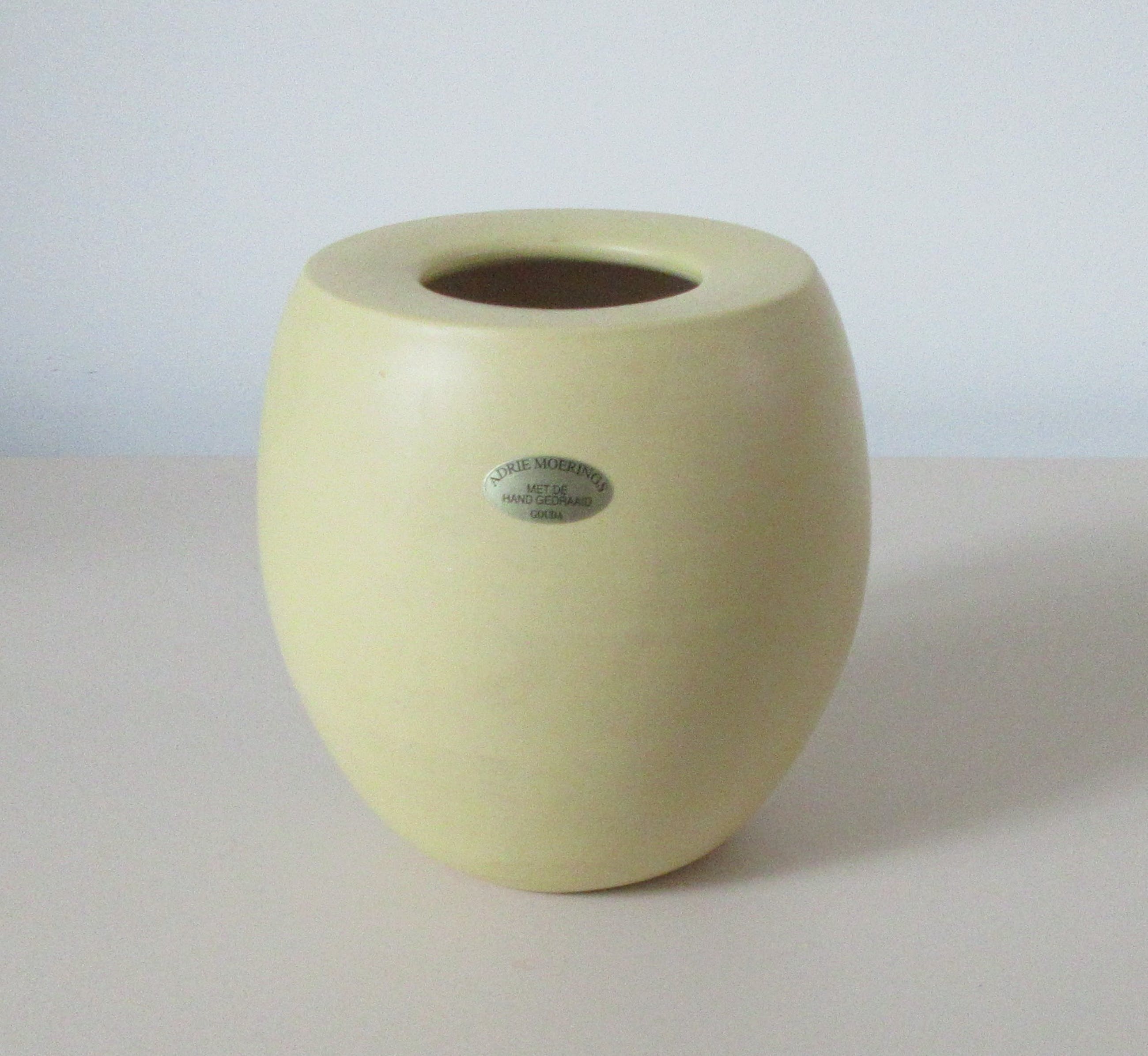 Zacht geel keramisch vaasje van keramisch Atelier Adrie Moerings uit Gouda. in perfecte conditie en met de hand gesigneerd en nog voorzien van een merksticker.