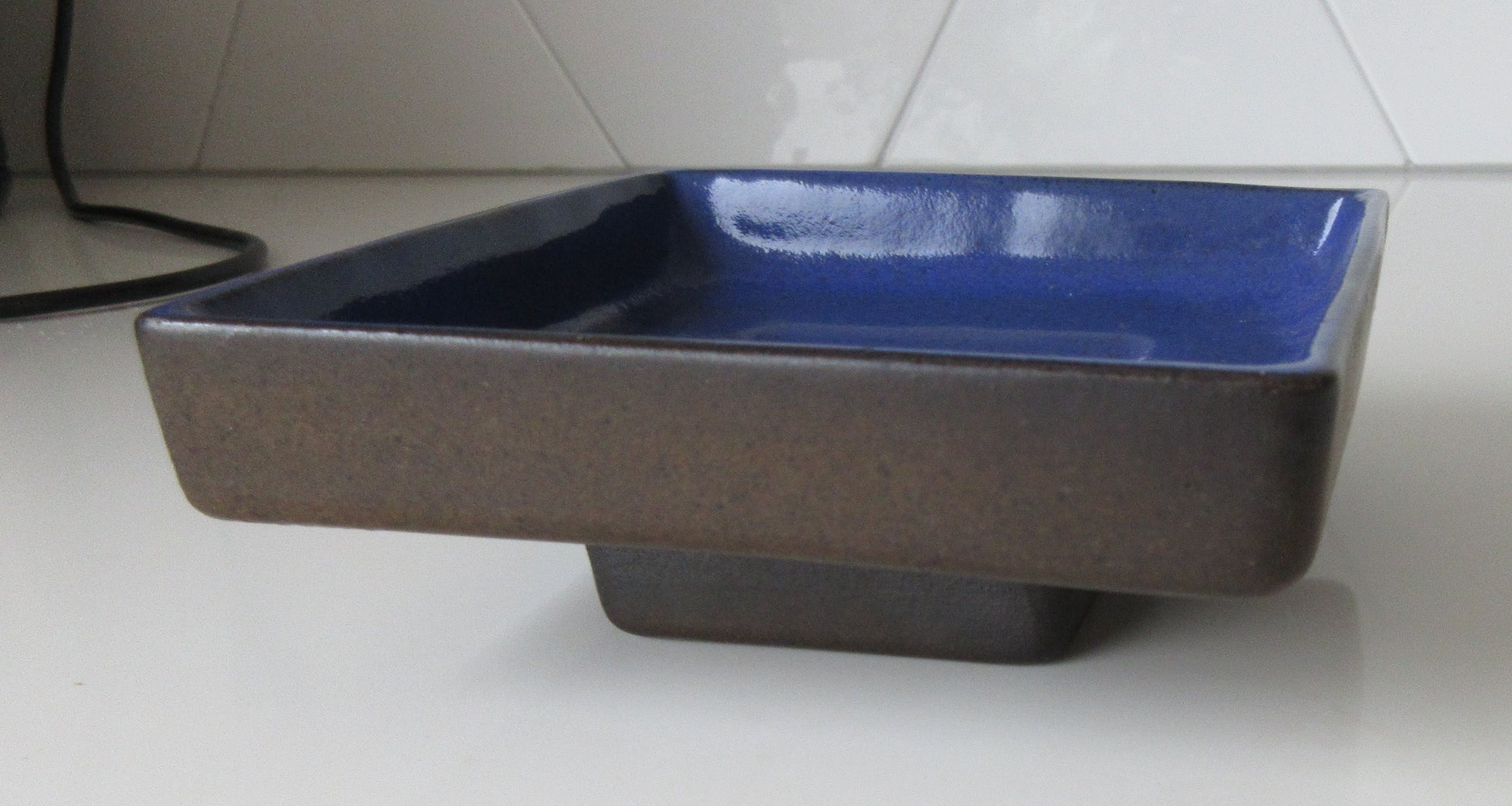 Aardewerk blokkandelaar van Afina uit Rijnsburg met aan de binnenzijde blauw glans glazuur en aan de buitenzijde bruin mat glazuur. Niet gemerkt.