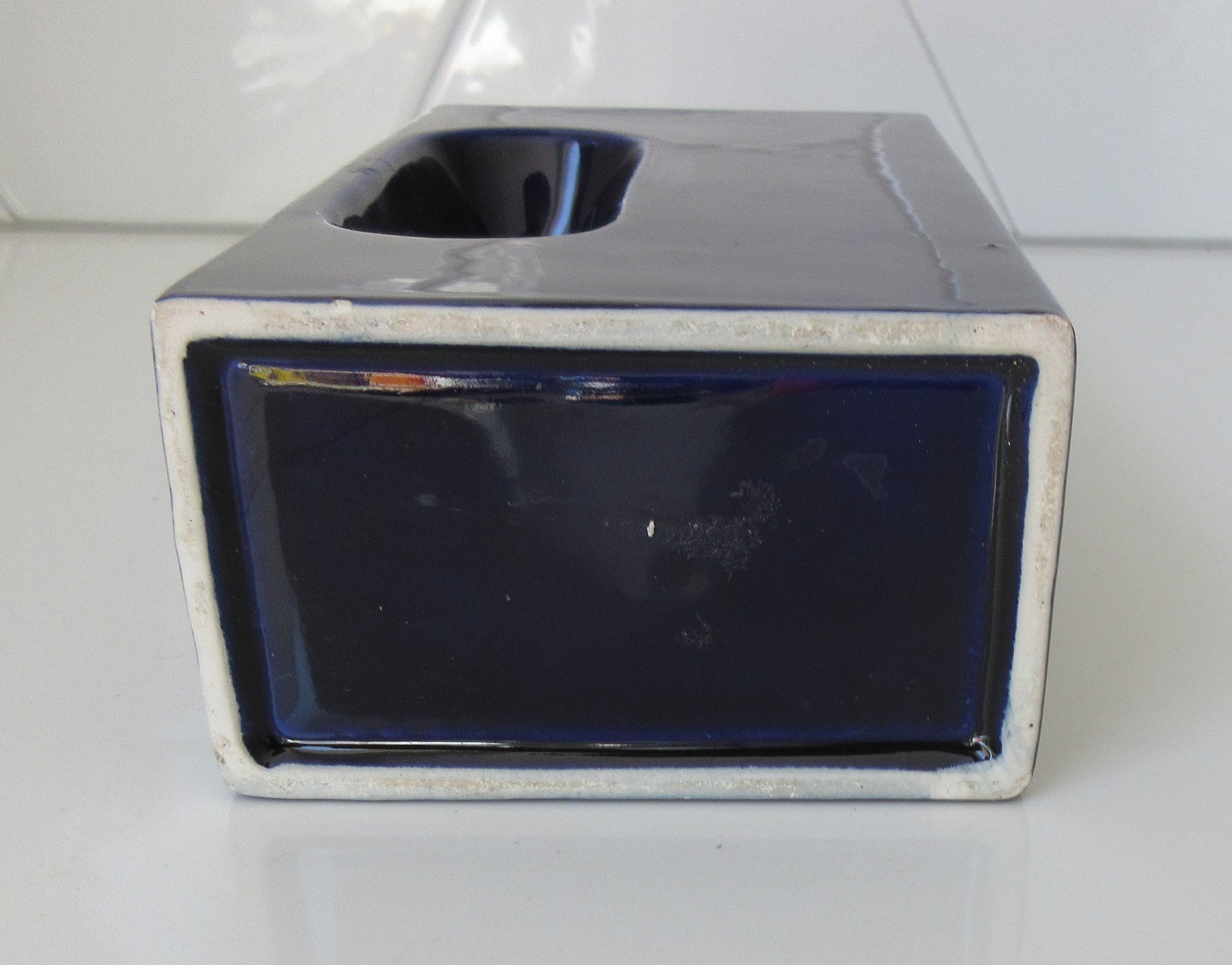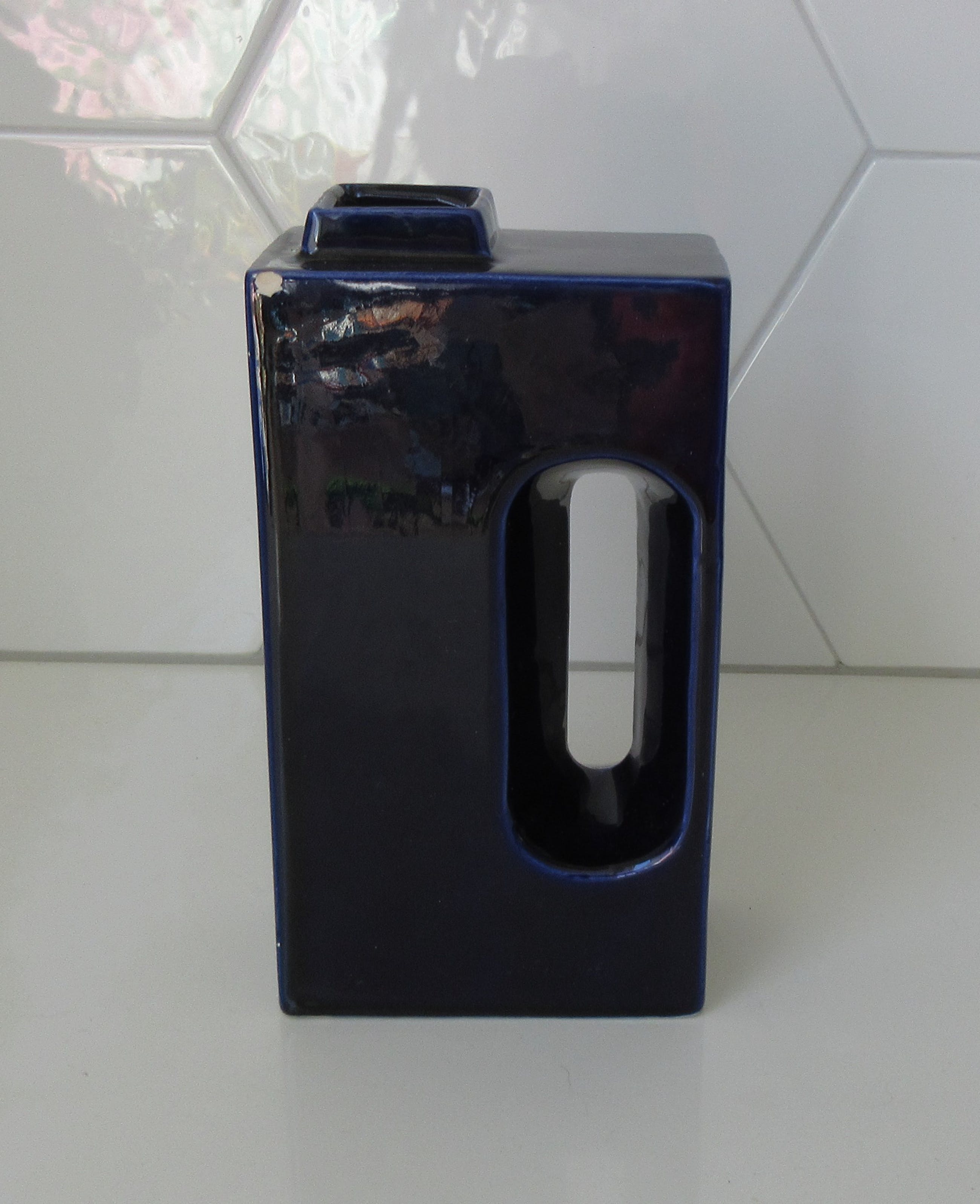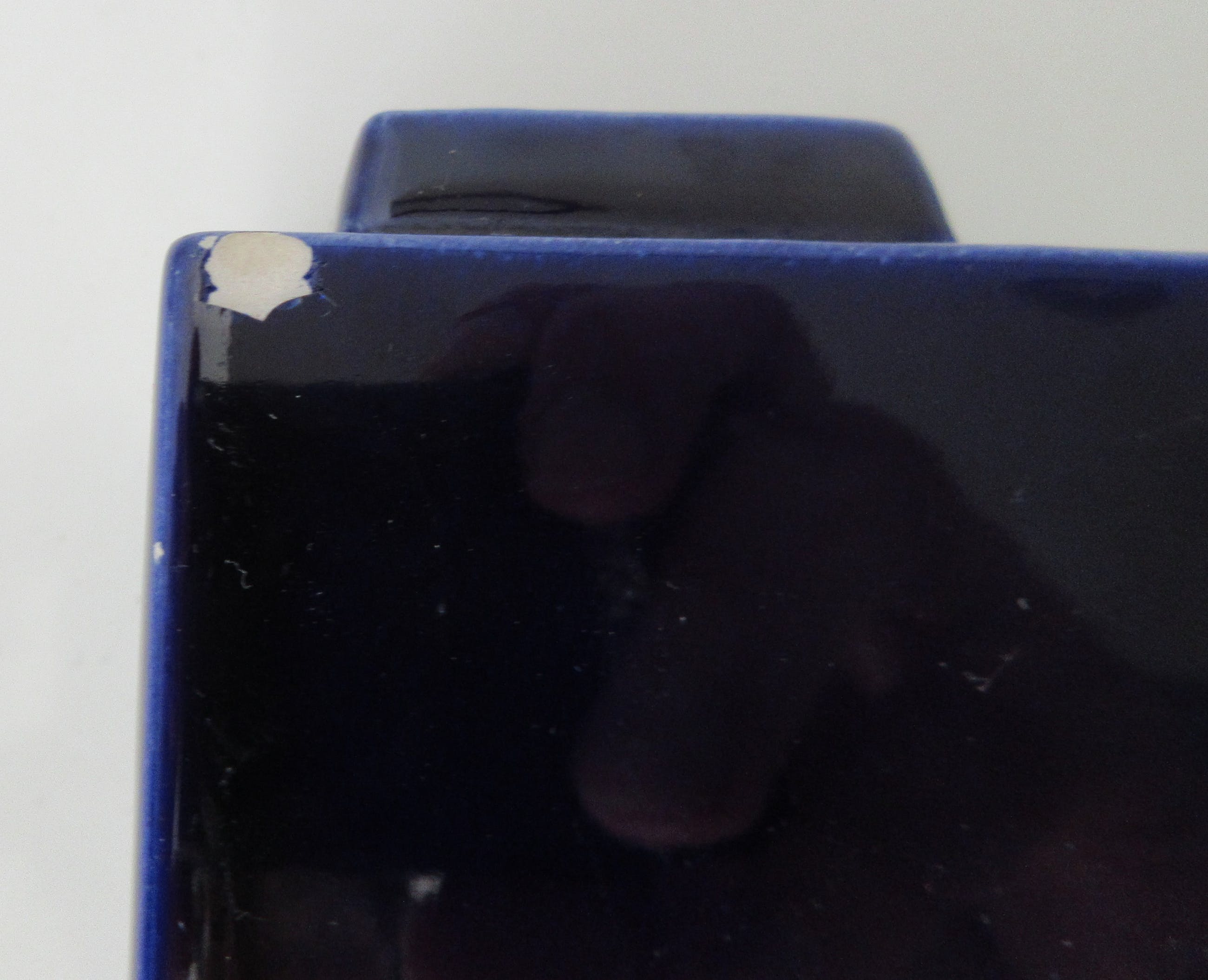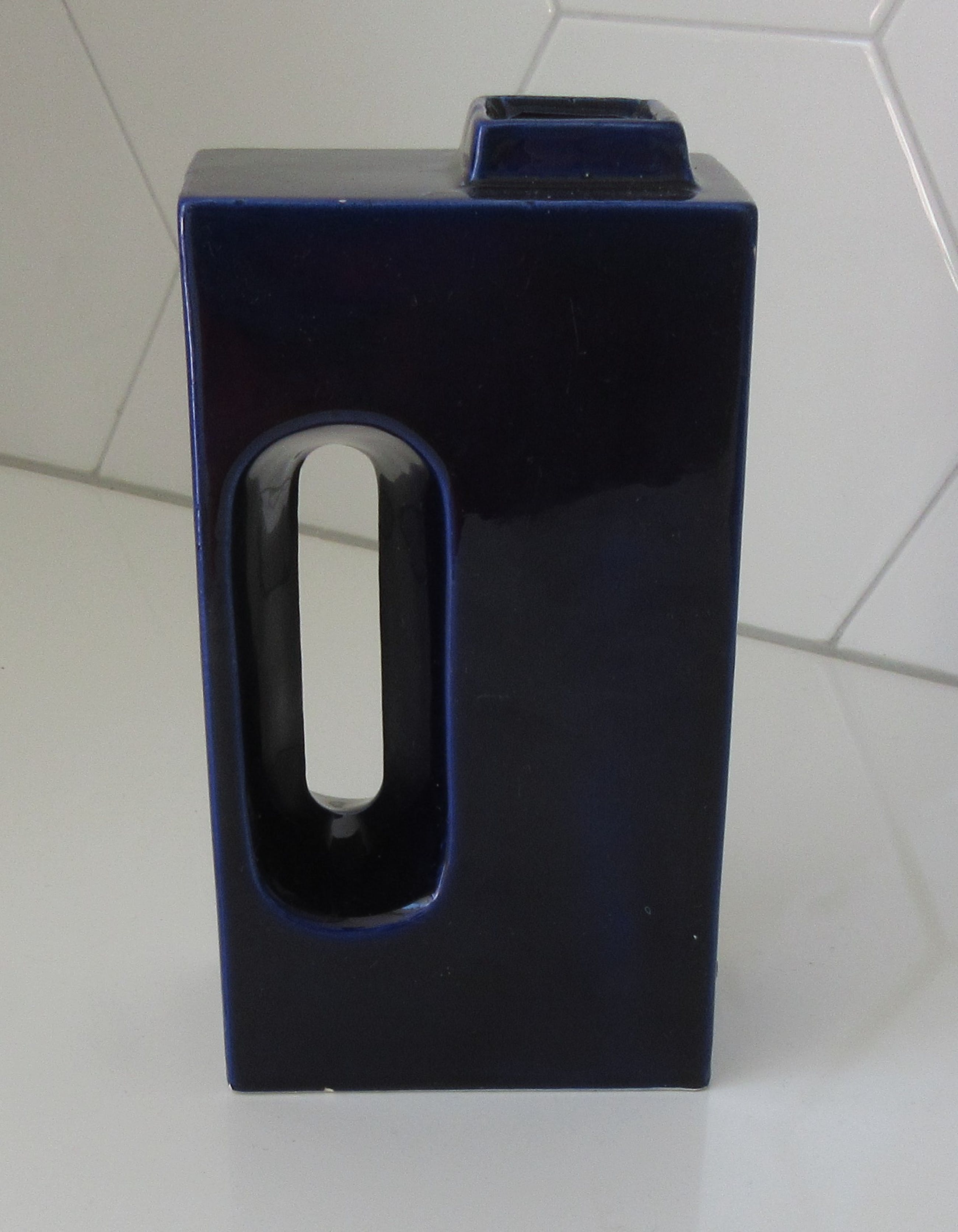 Blauwe aardewerk Schoorsteen vaas van Afina uit Rijnsburg. Heeft helaas een chip op een van de bovoenhoeken en vier fleebites. Niet gemerkt. Ondanks de lichte schade een mooi vaasje!