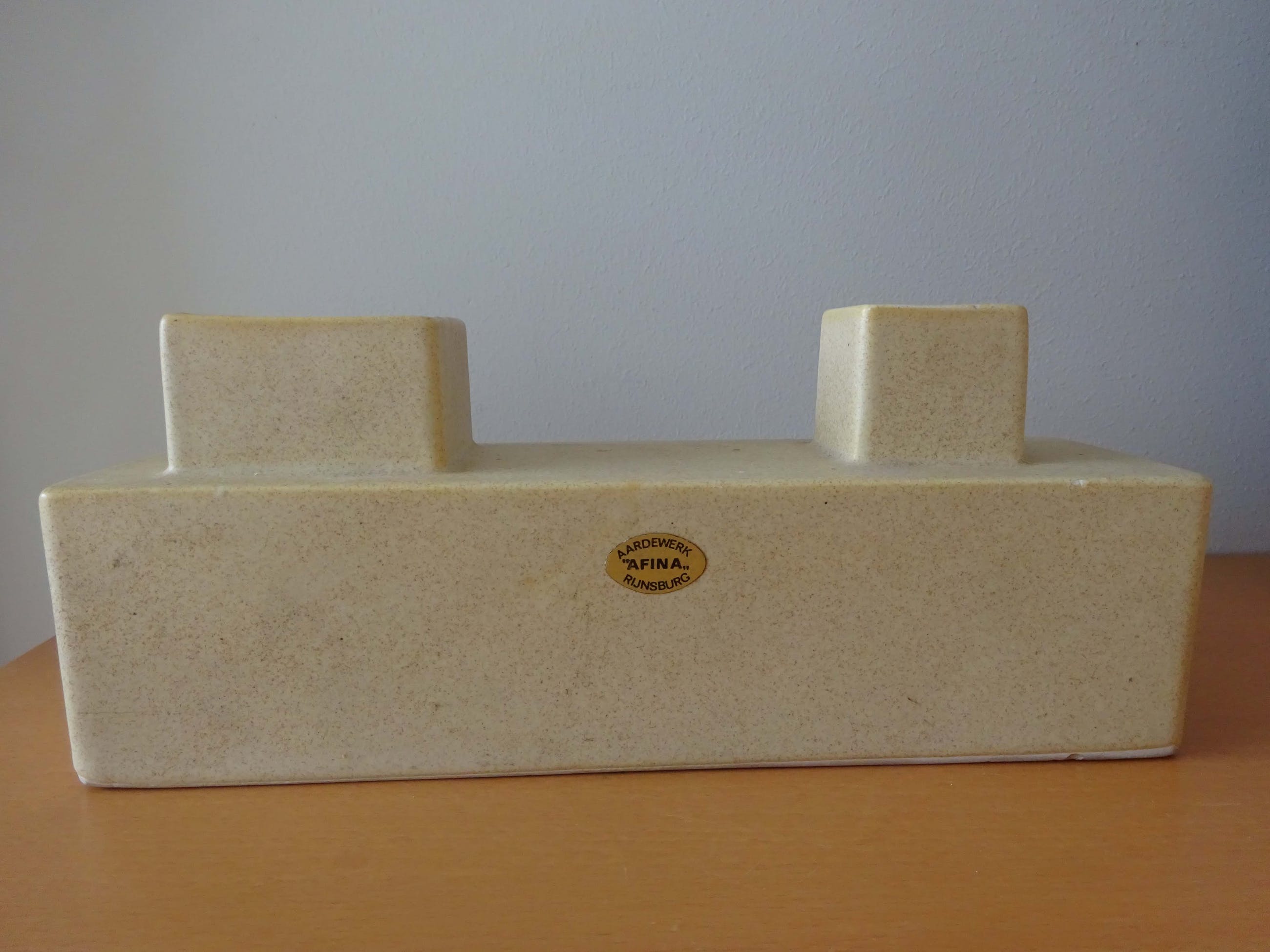 Blokvaas vaas langwerpig twee gaten voor bloemen Ontwerp/uitvoering: Afina Rijnsburg Sticker: Afina Aardewerk Rinsburg Hoogte: 6 cm Breed: 24.5 cm Diep: 7 cm Kleur: lichtgeel Conditie: mooie staat, 2 kleine stootchips onderrand( zie foto's)