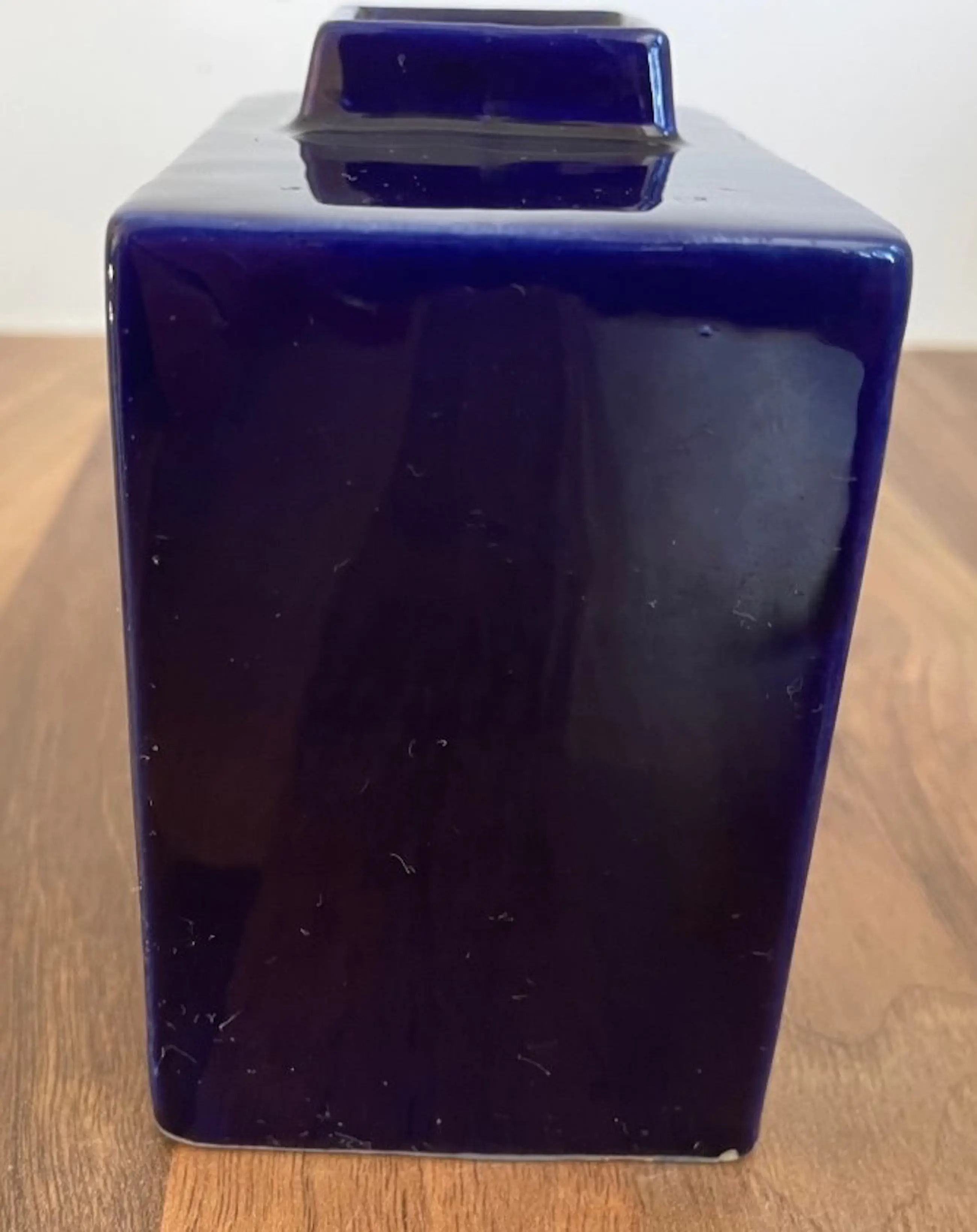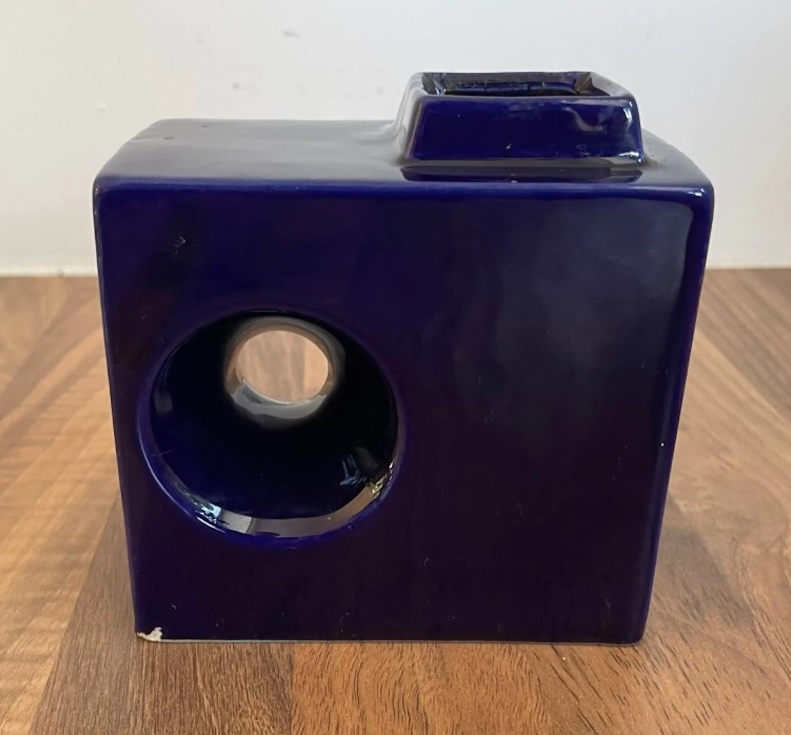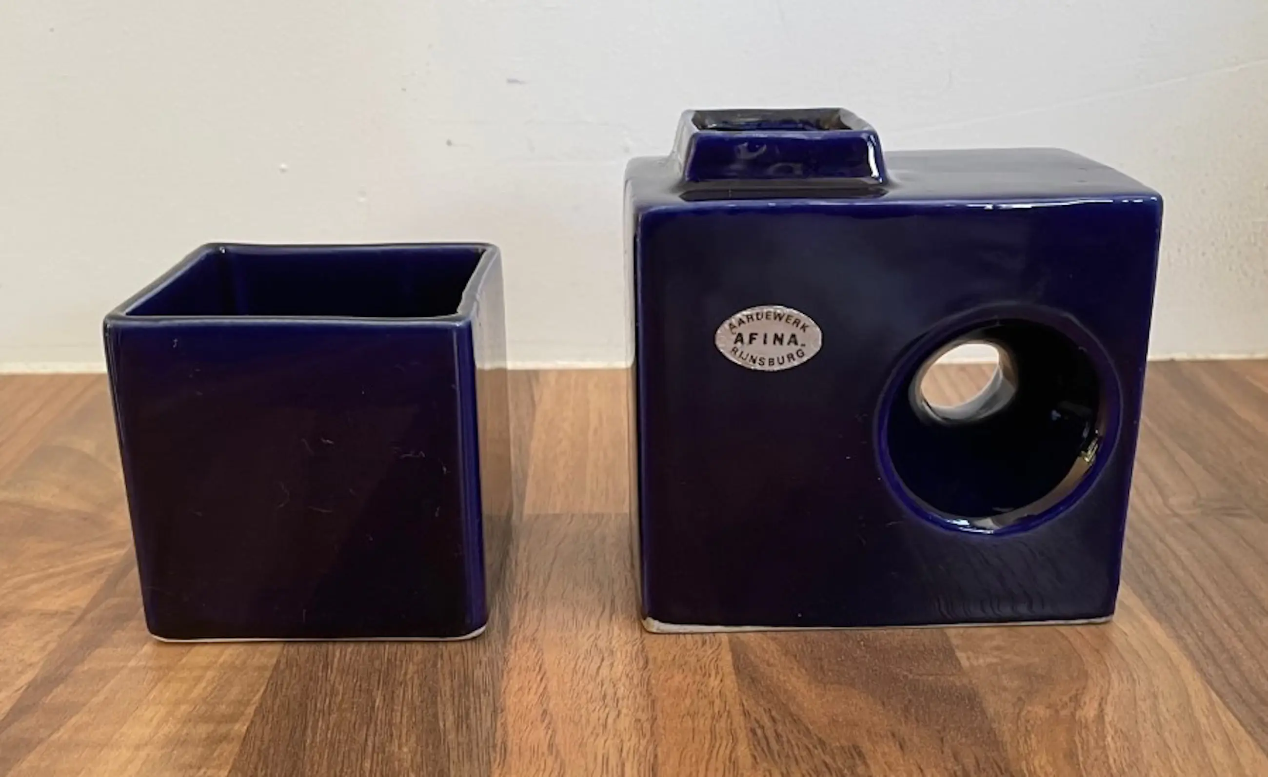 Afina Aardewerk Rijnsburg - Vintage Sixties Blokvaasje + Cactuspotje in donkerblauw glanzend glazuur. Het vaasje heeft op een rand een chipje (zie foto) en is gemerkt met een merksticker. Het potje is onbeschadigd en ongemerkt.
