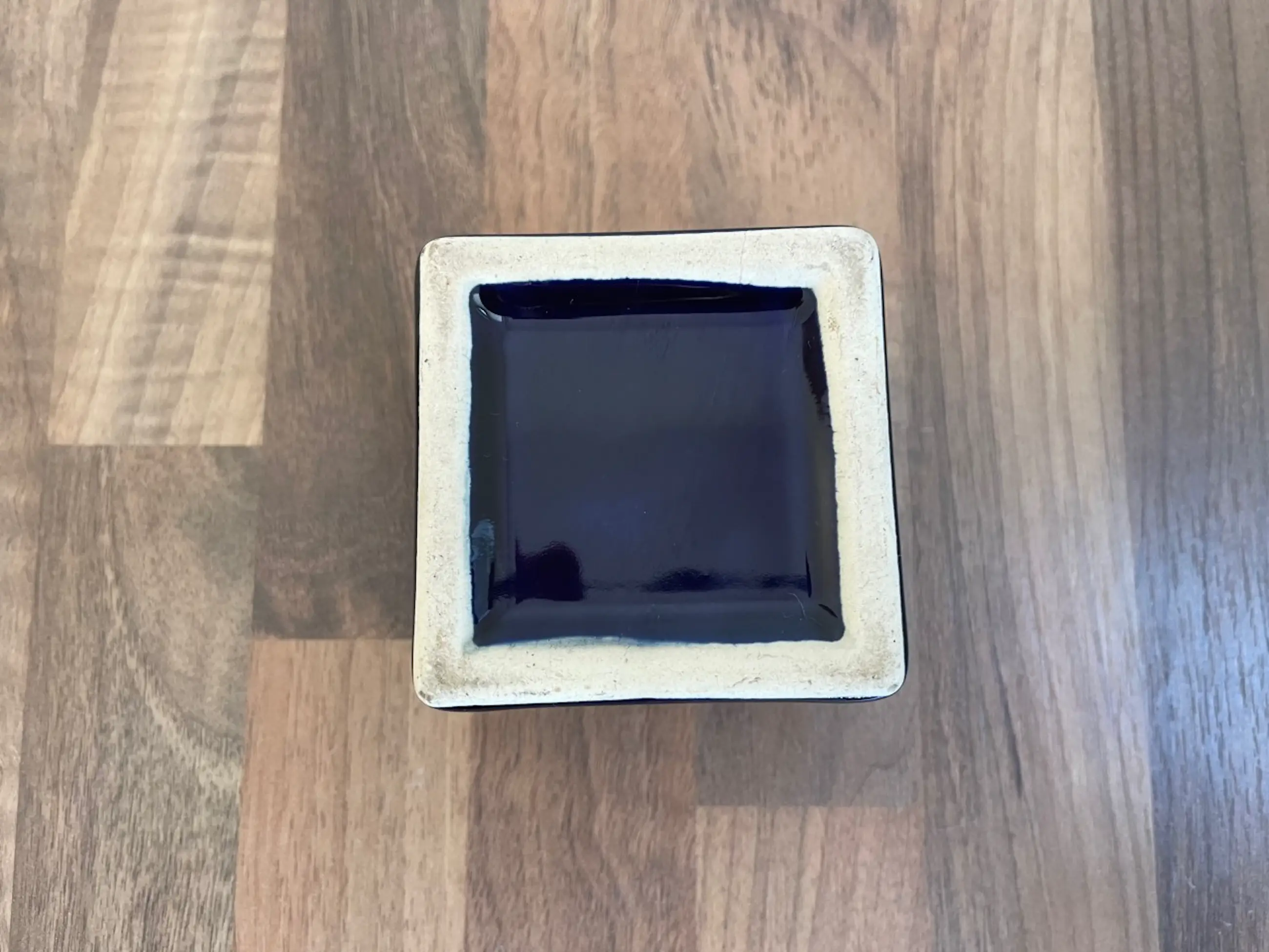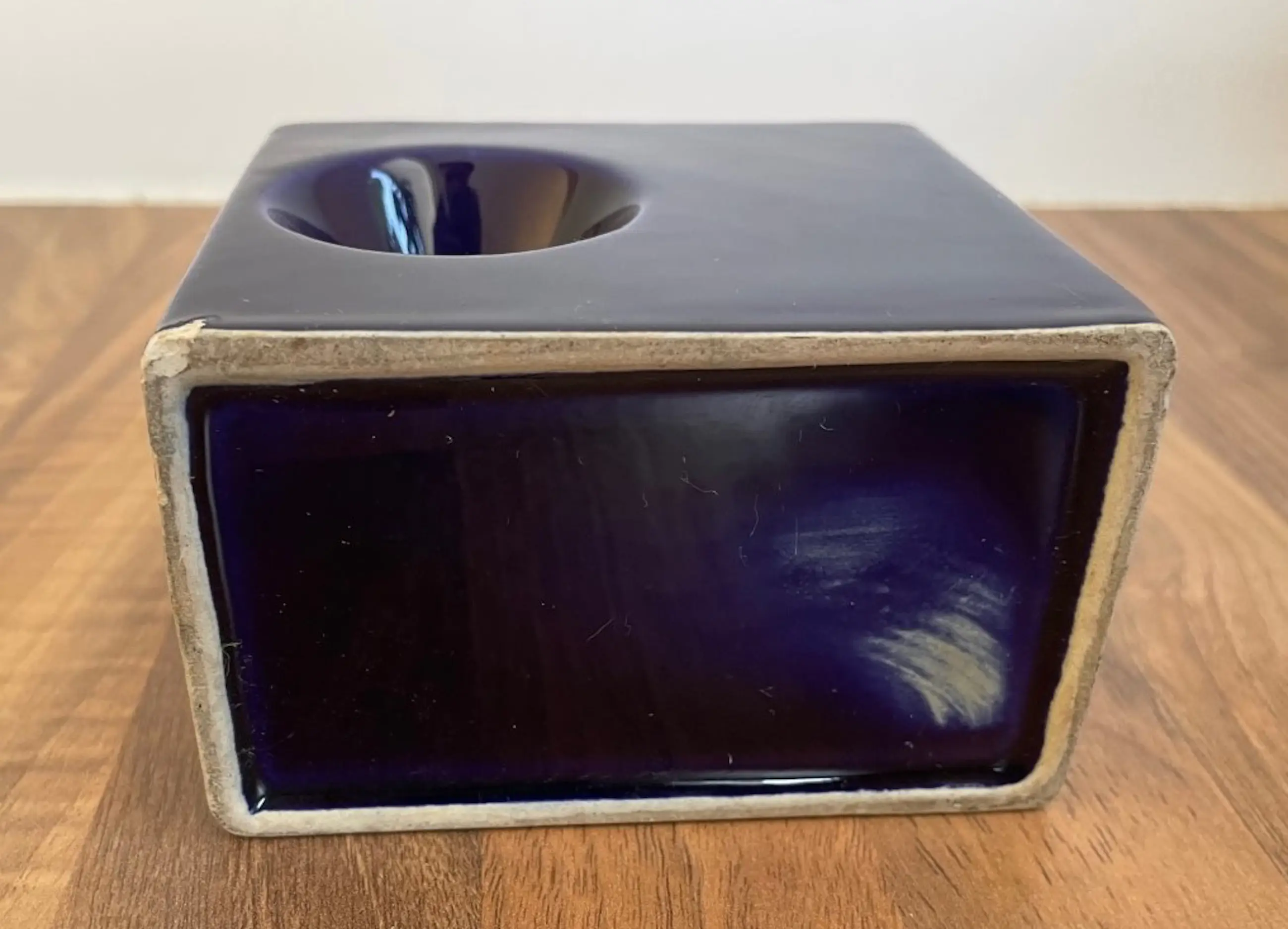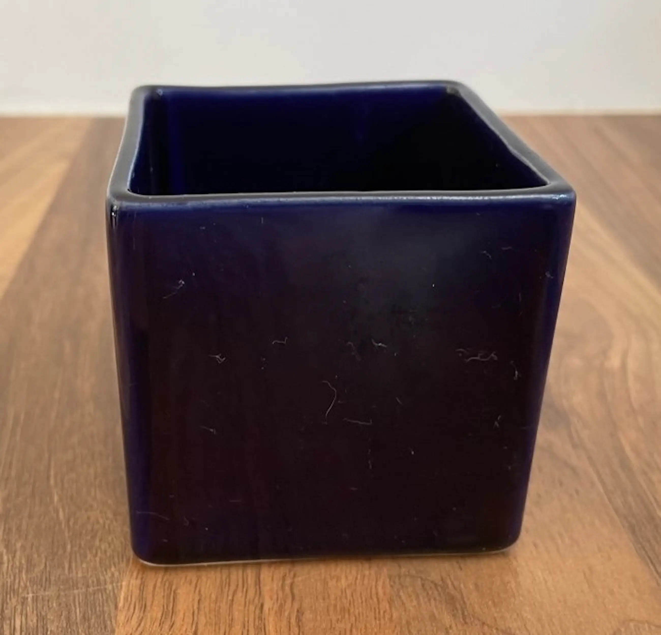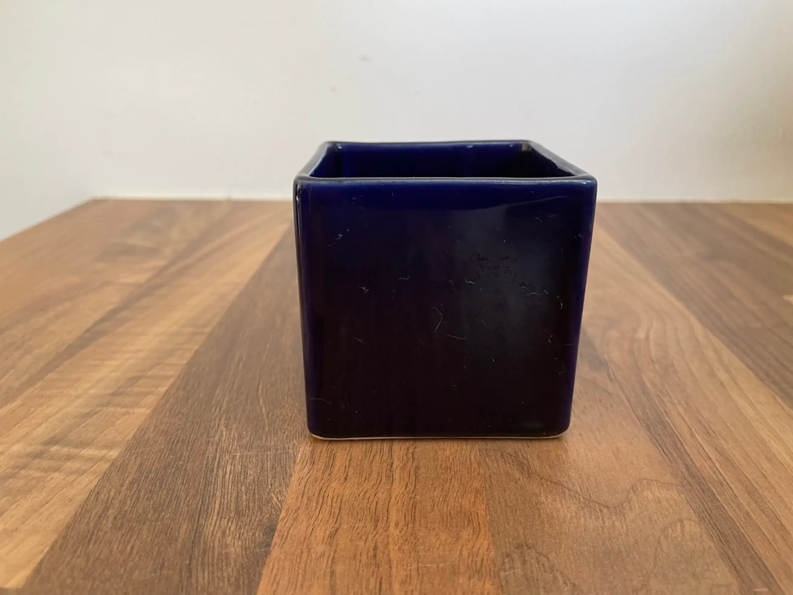 Afina Aardewerk Rijnsburg - Vintage Sixties Blokvaasje + Cactuspotje in donkerblauw glanzend glazuur. Het vaasje heeft op een rand een chipje (zie foto) en is gemerkt met een merksticker. Het potje is onbeschadigd en ongemerkt.