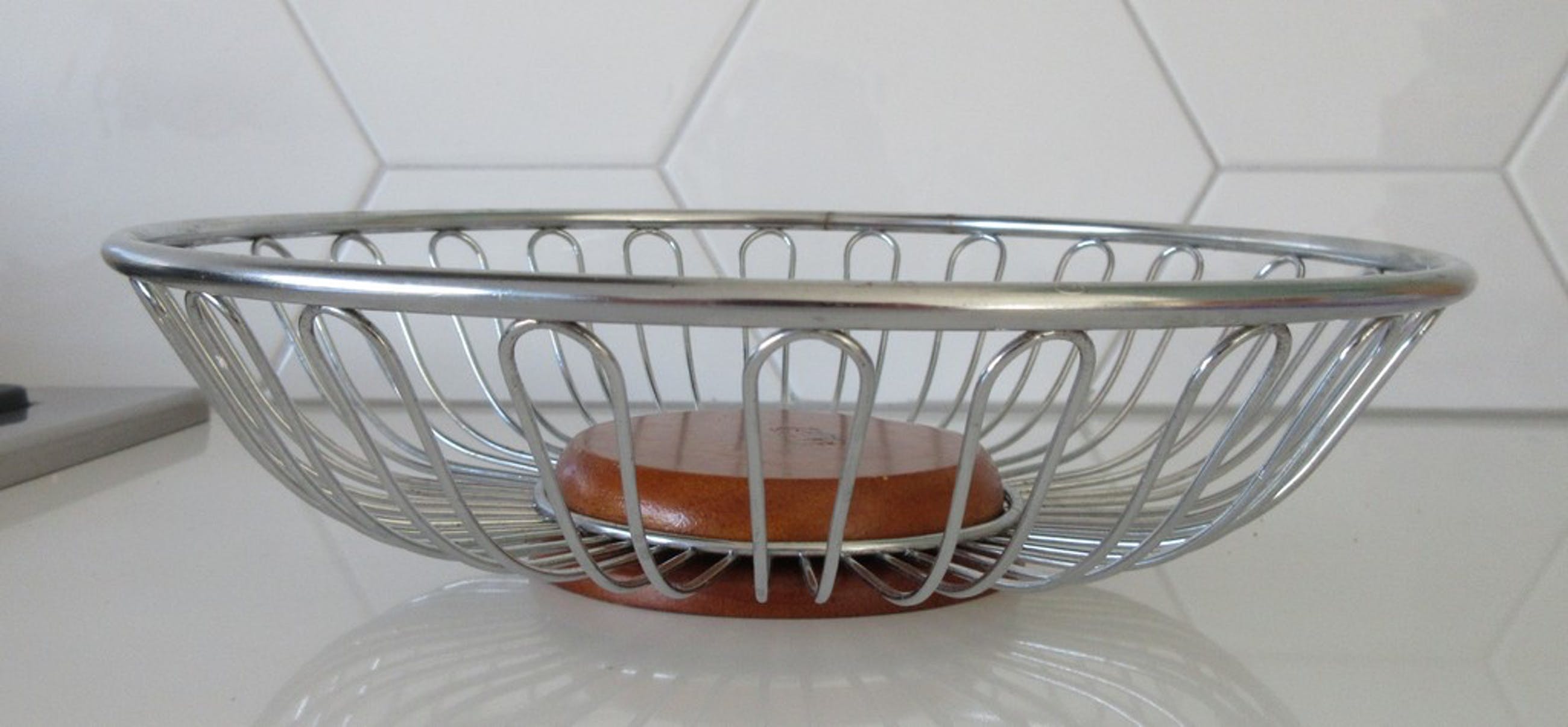 Afra Alessi - Draadmetalen fruitmandje met gelakt houten bodem. In prima conditie, alleen een klein deukje aan de bovenzijde van het hout. Niet gemerkt.