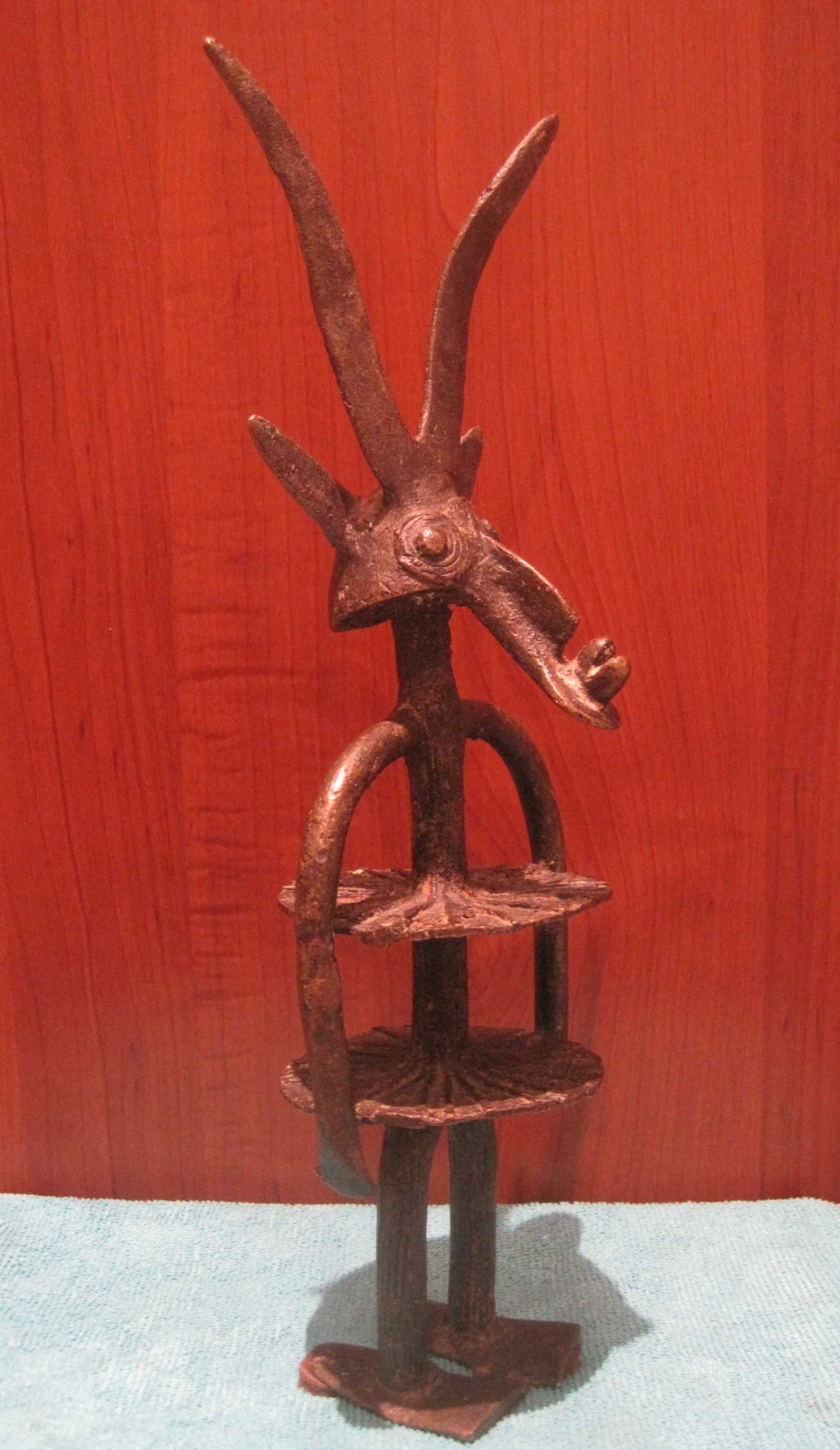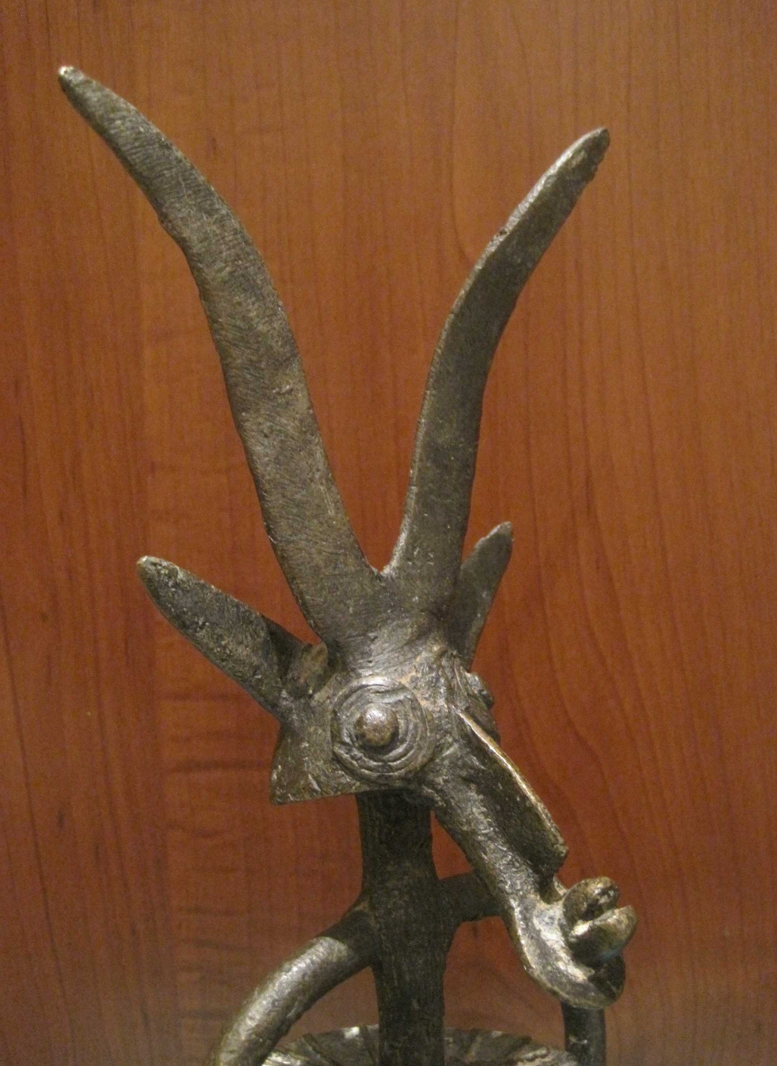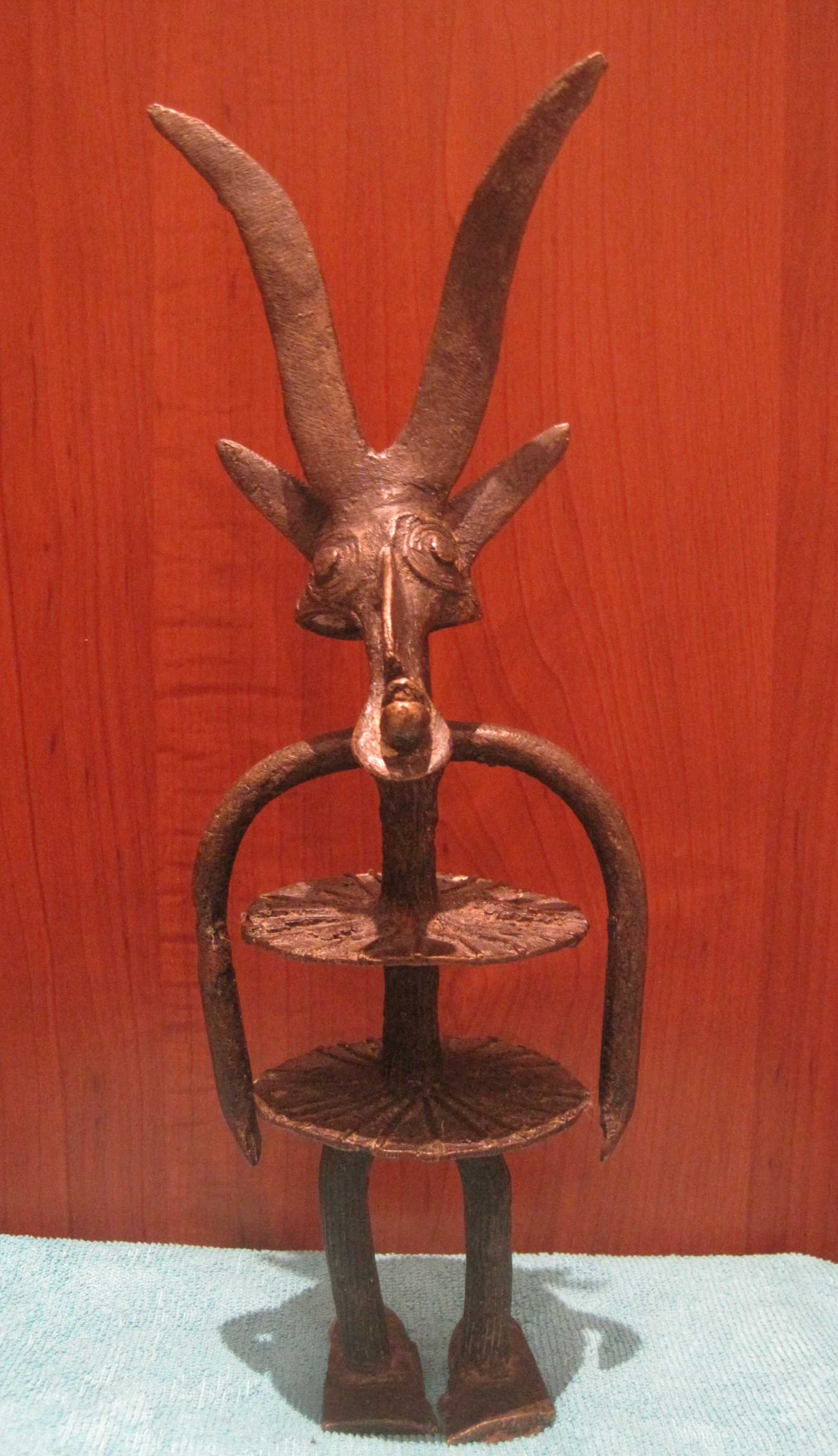 Een bijzonder bronzen beeld uit Burkina Fasso Afrika. Dit beeld symboliseert de verbondenheid en dankbaarheid tussen de mens en het dier de antiloop, waar op gejaagd wordt.
