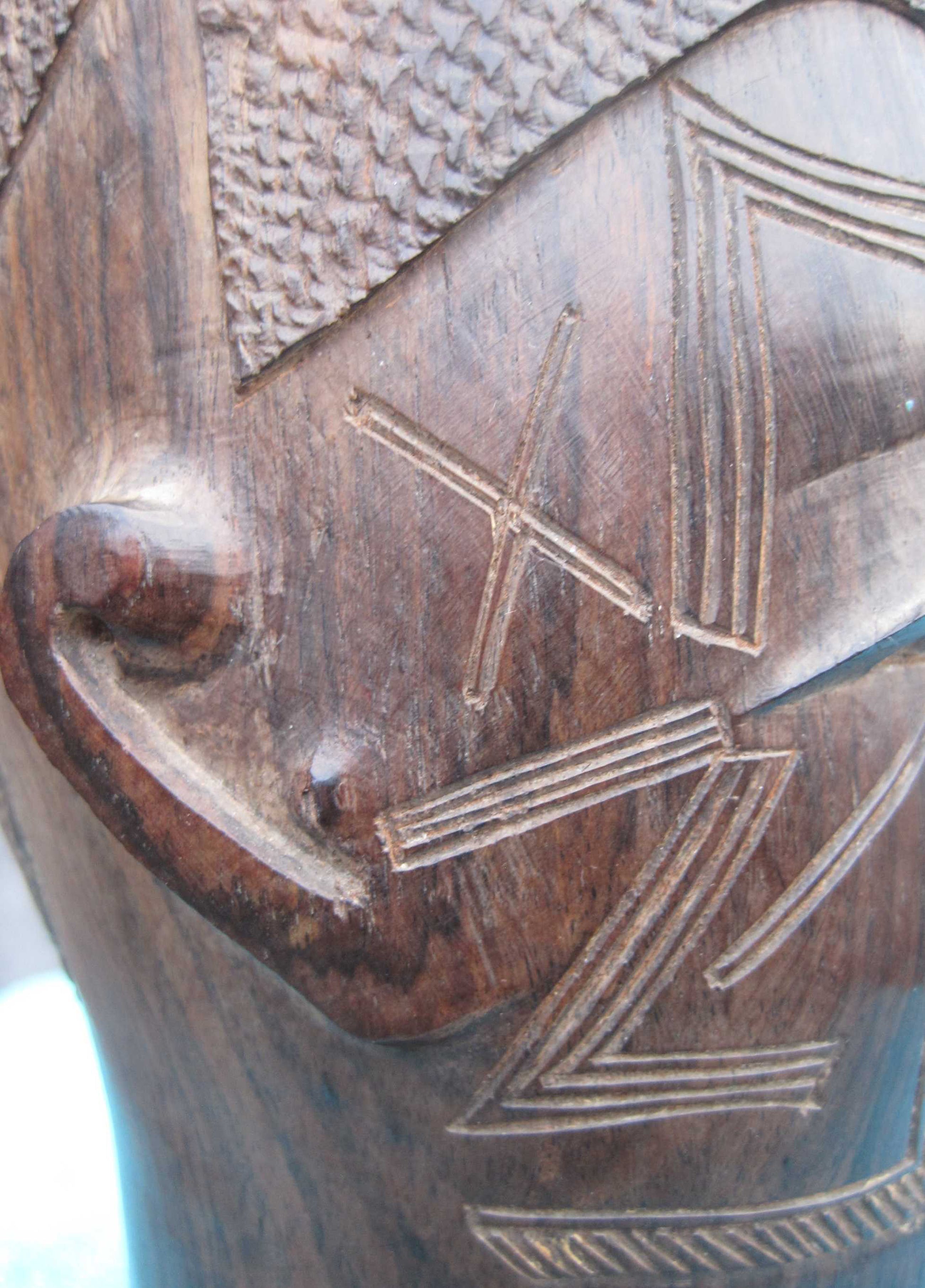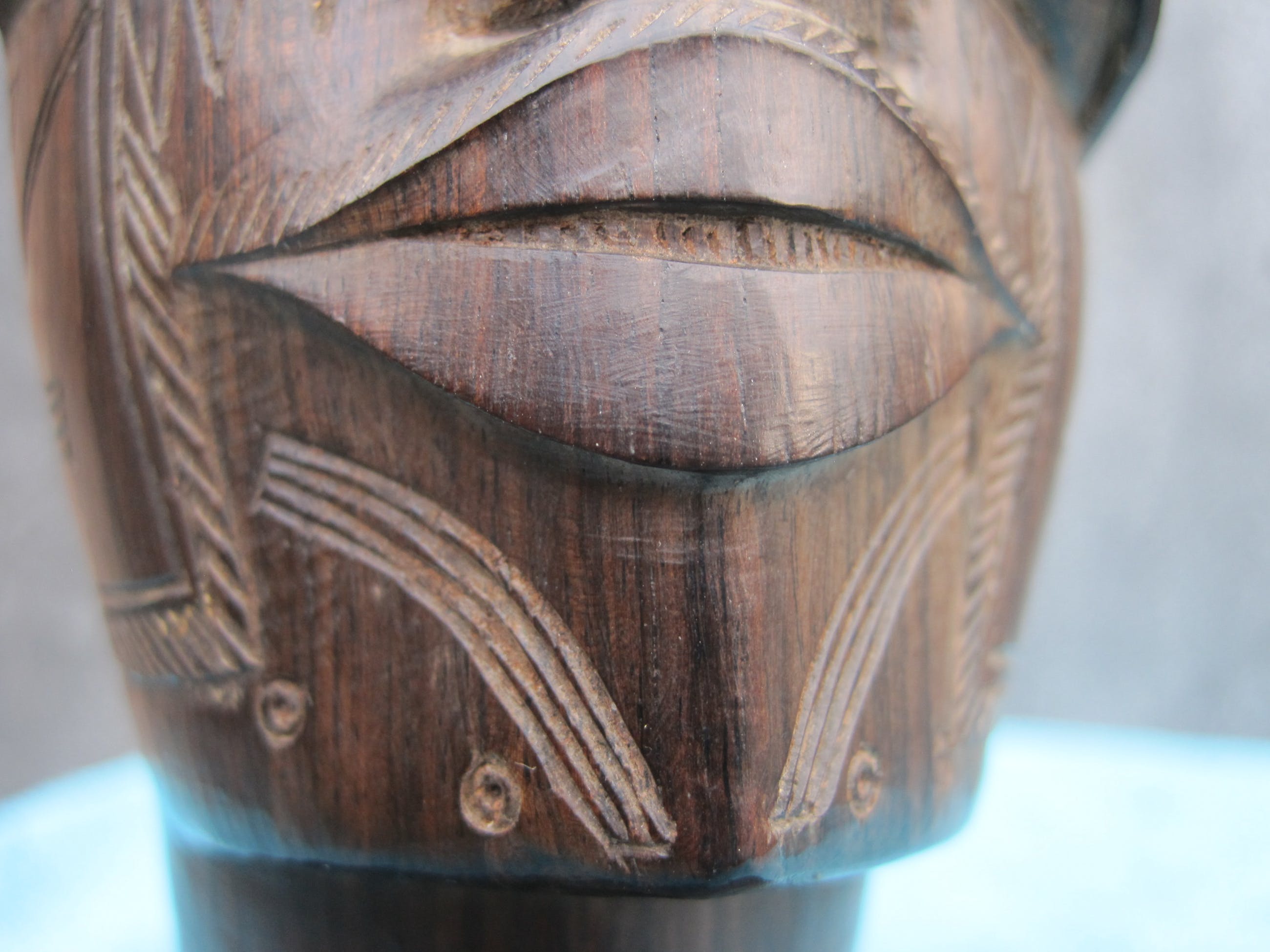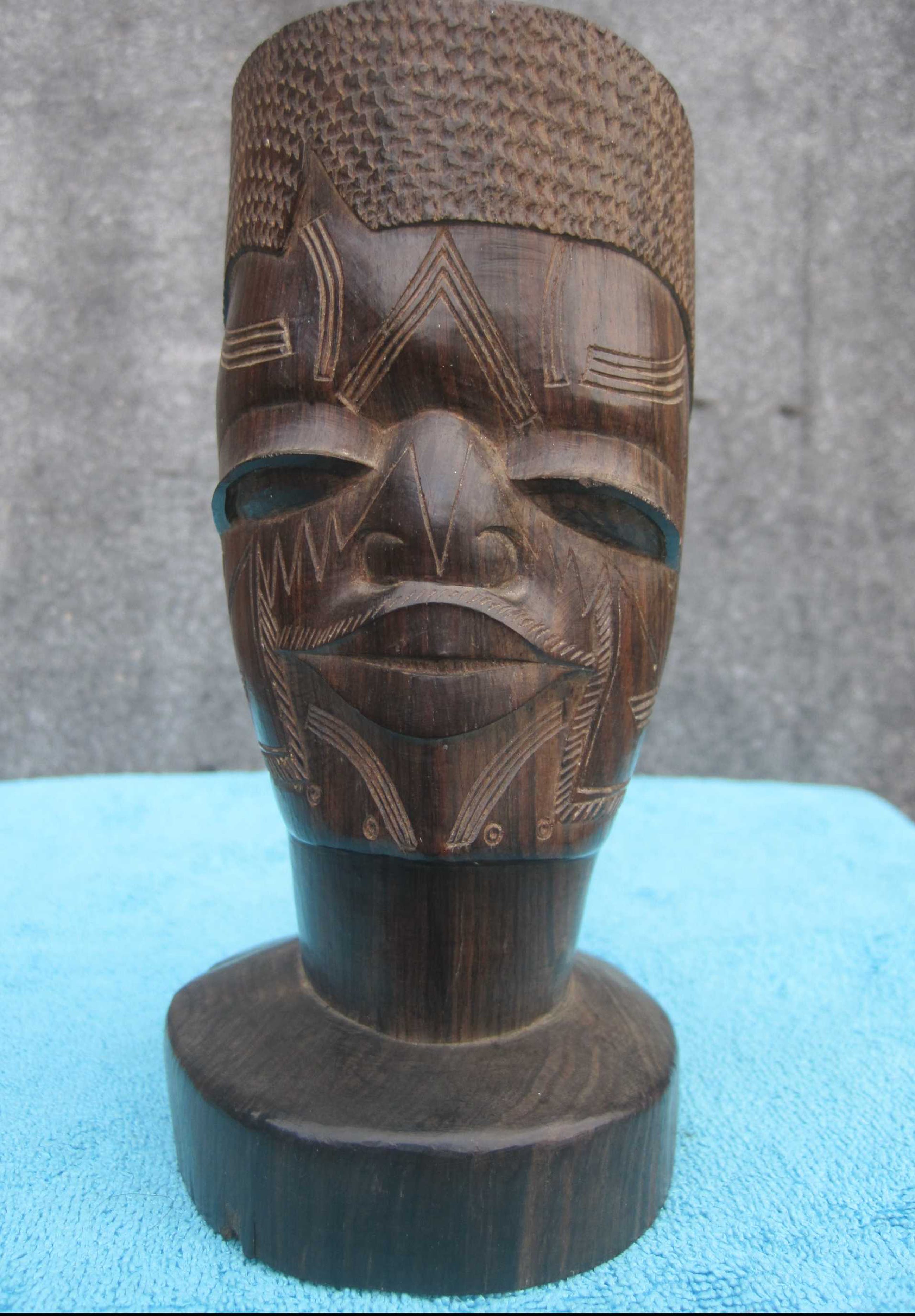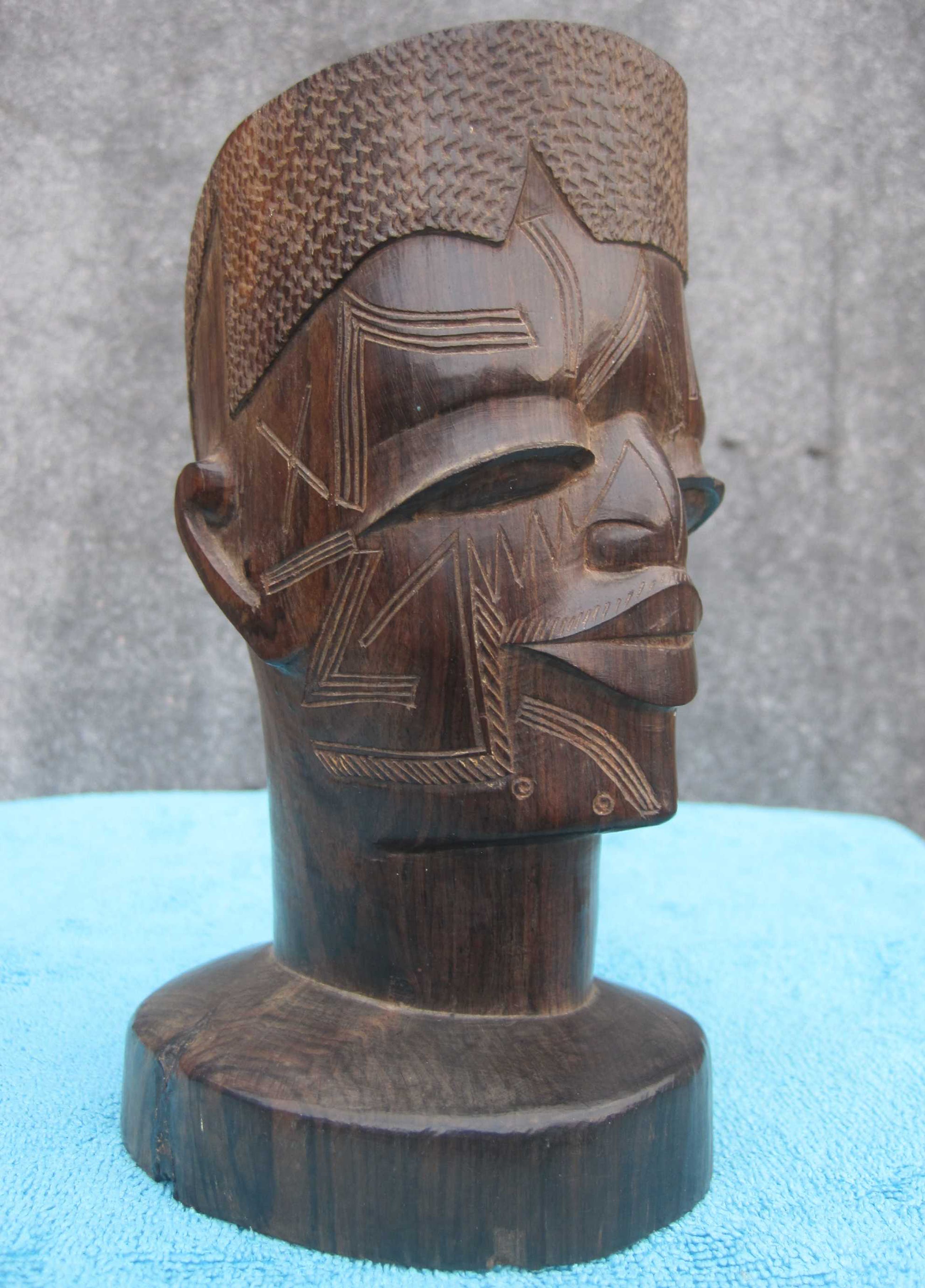 Een zwaar massief houten beeld gesneden in een strakke gestileerde stijl. Het gelaat is versierd met tribale tatoeages en het haar is strak in model geschoren. Het is duidelijk een uit Afrika afkomstig beeld, maar welk land of regio is mij niet bekend.