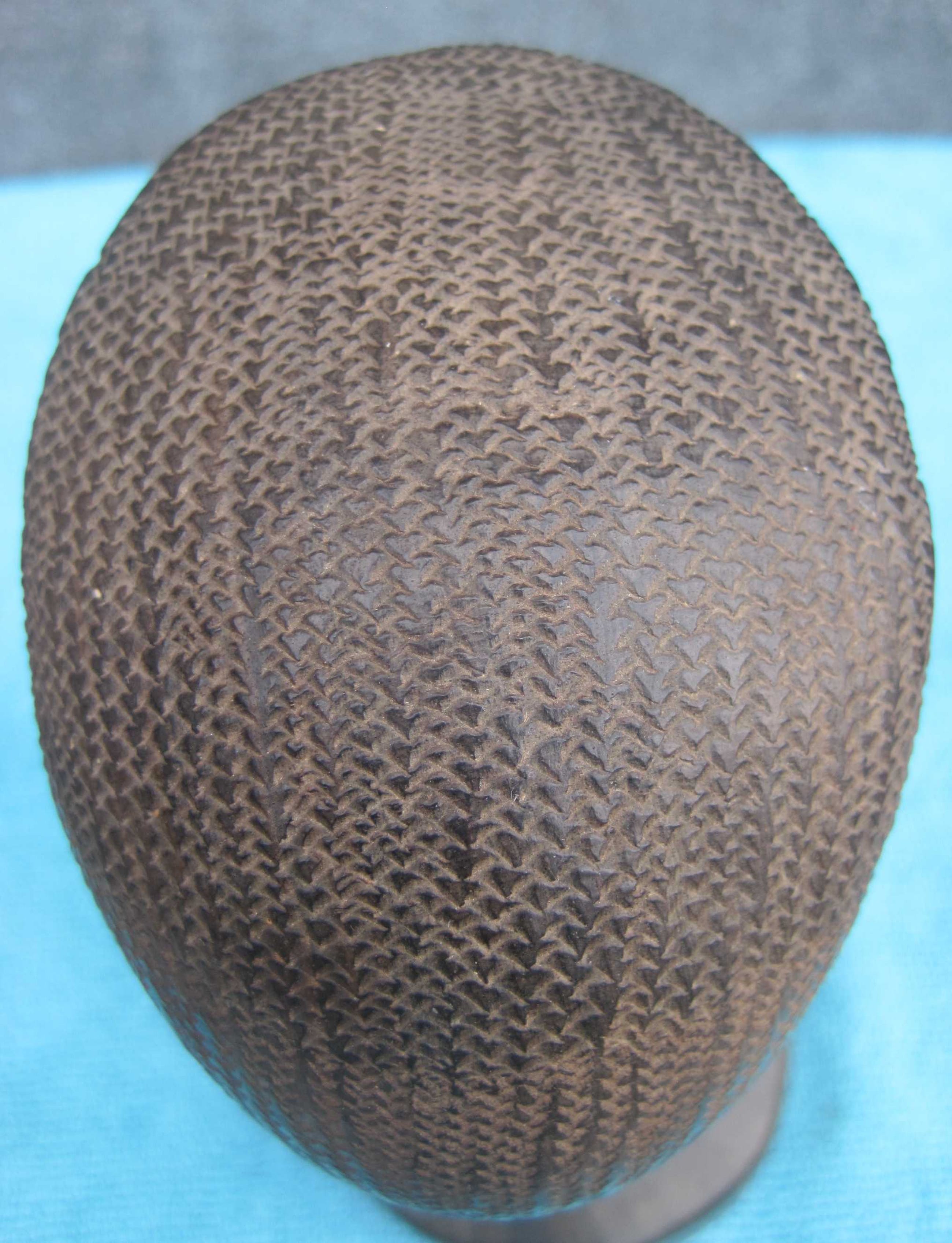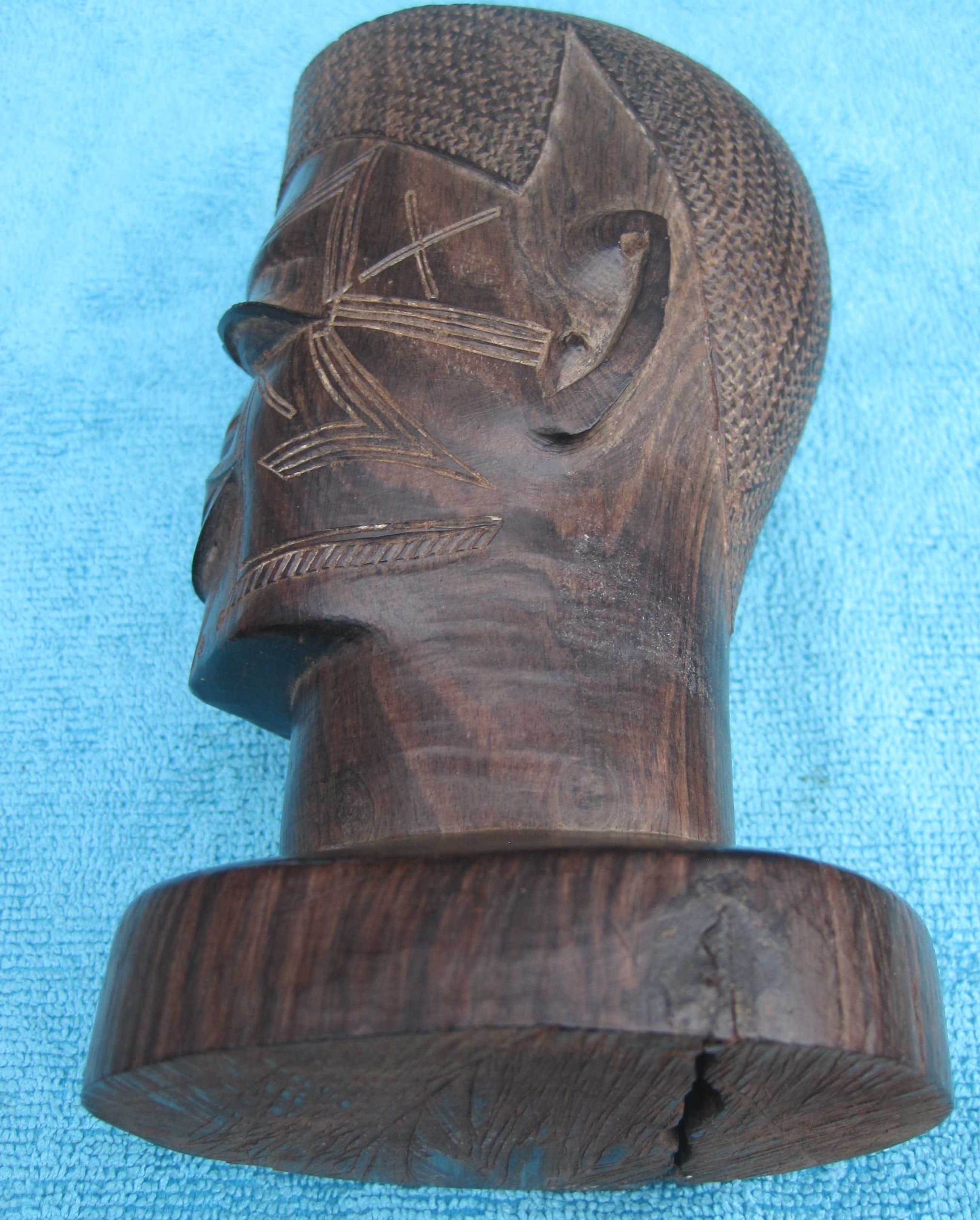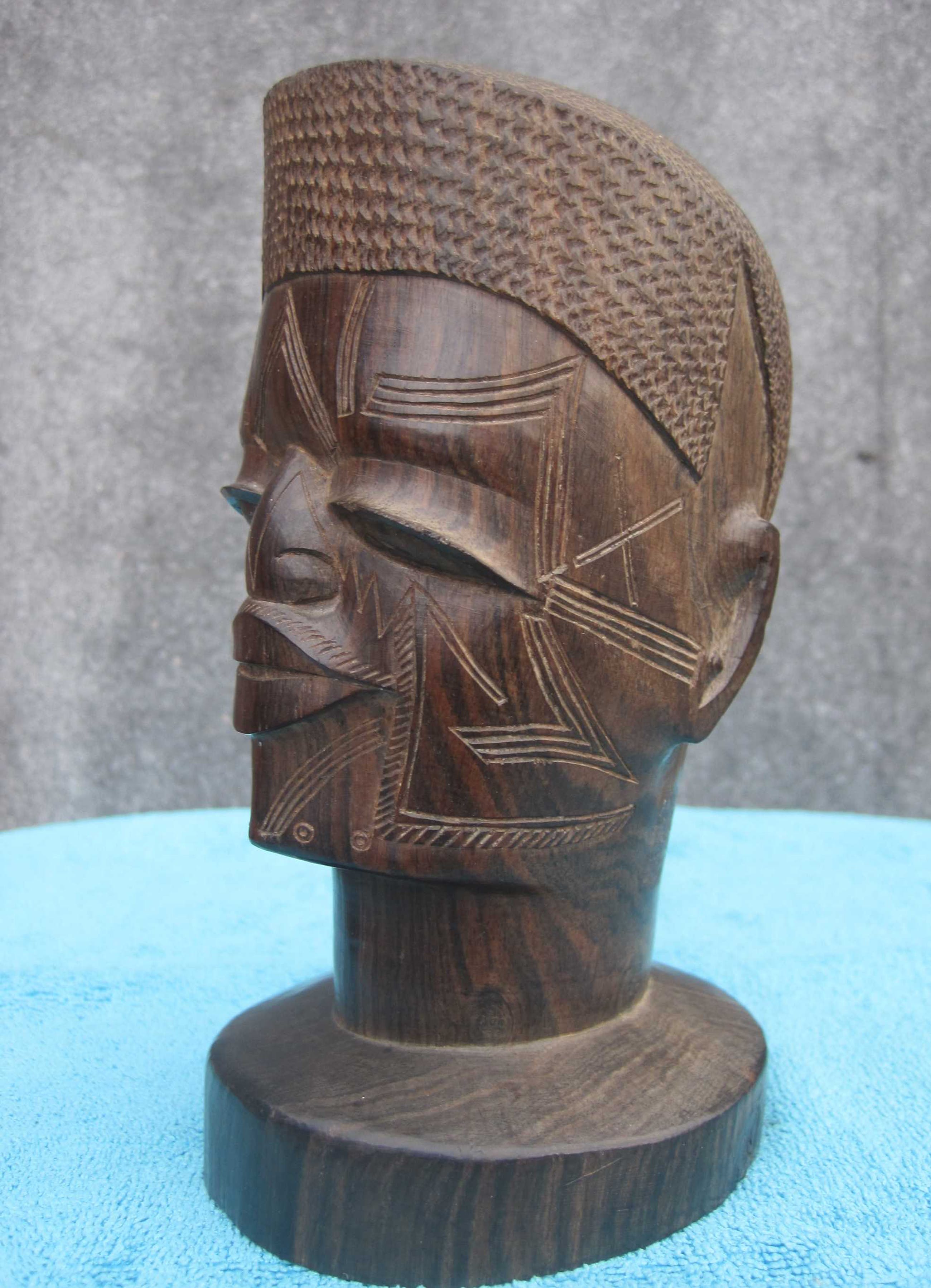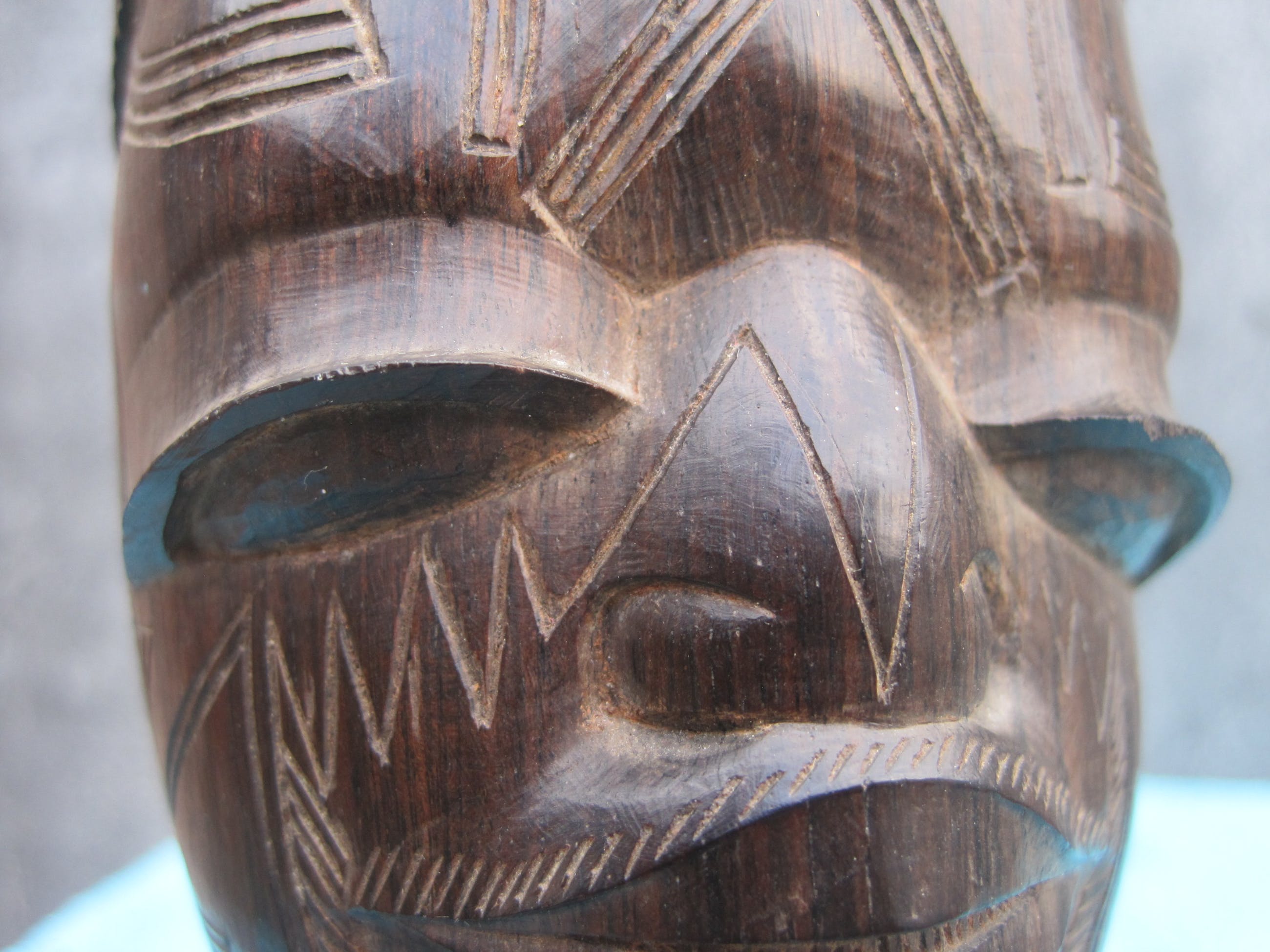Een zwaar massief houten beeld gesneden in een strakke gestileerde stijl. Het gelaat is versierd met tribale tatoeages en het haar is strak in model geschoren. Het is duidelijk een uit Afrika afkomstig beeld, maar welk land of regio is mij niet bekend.