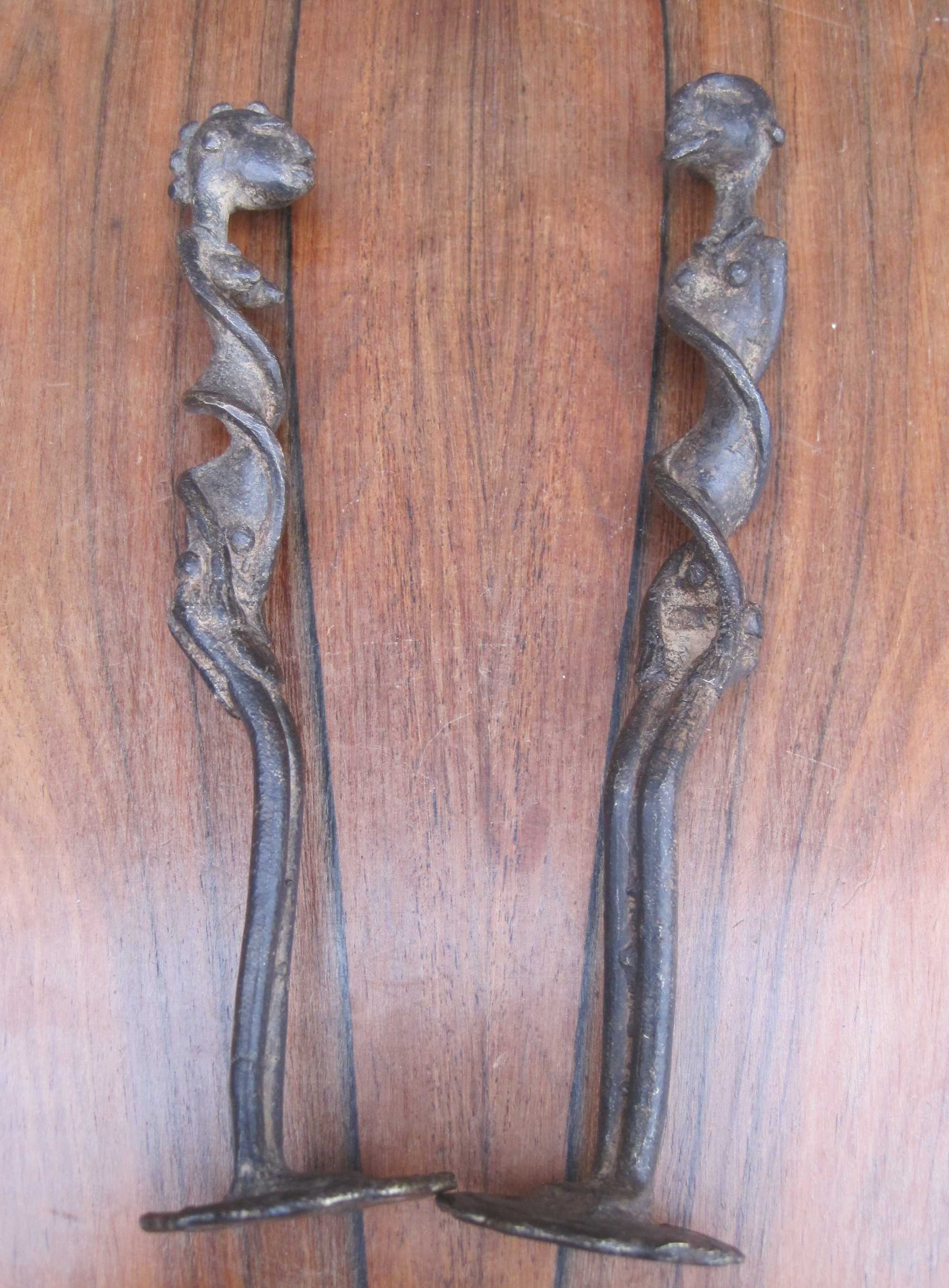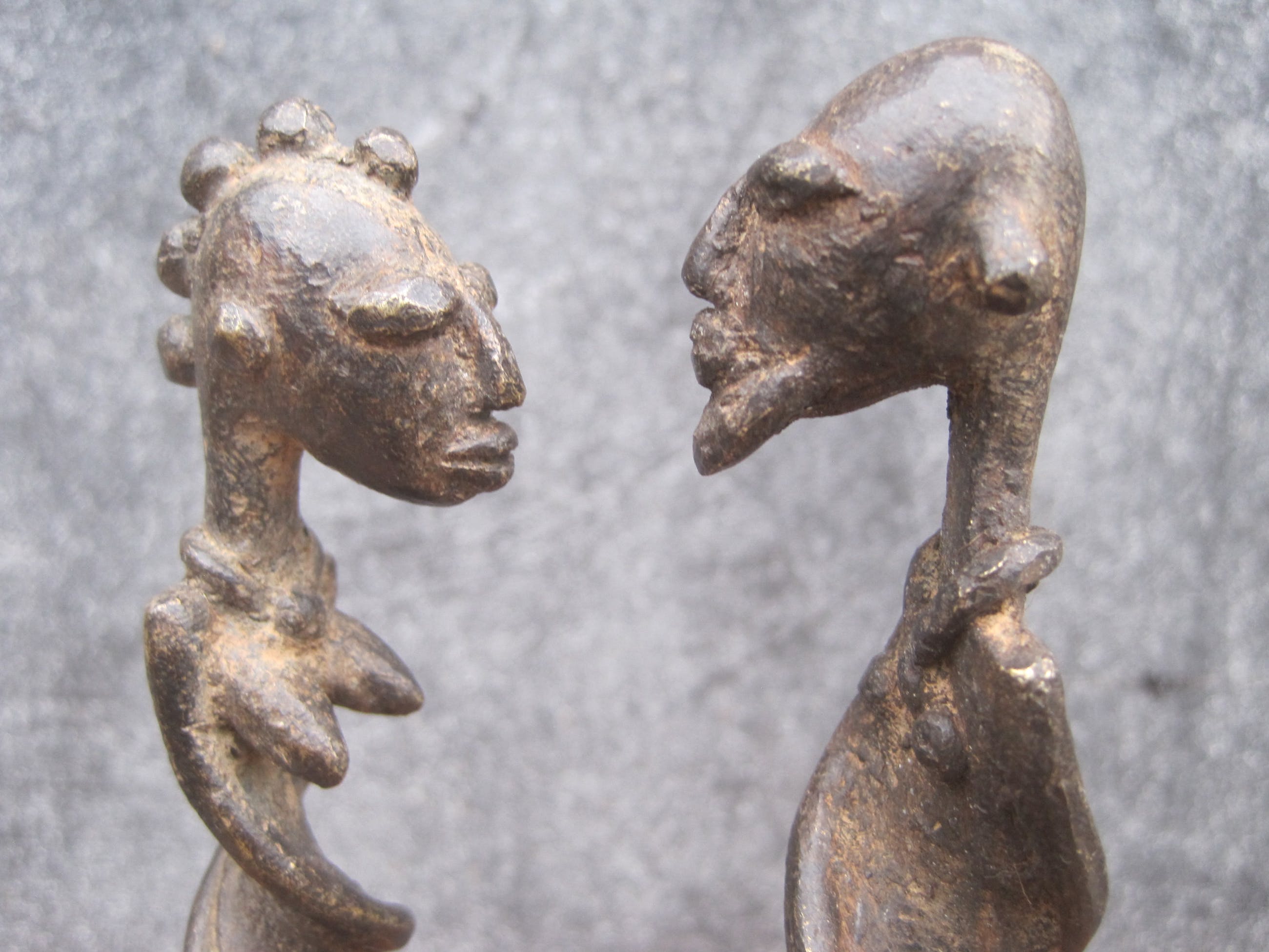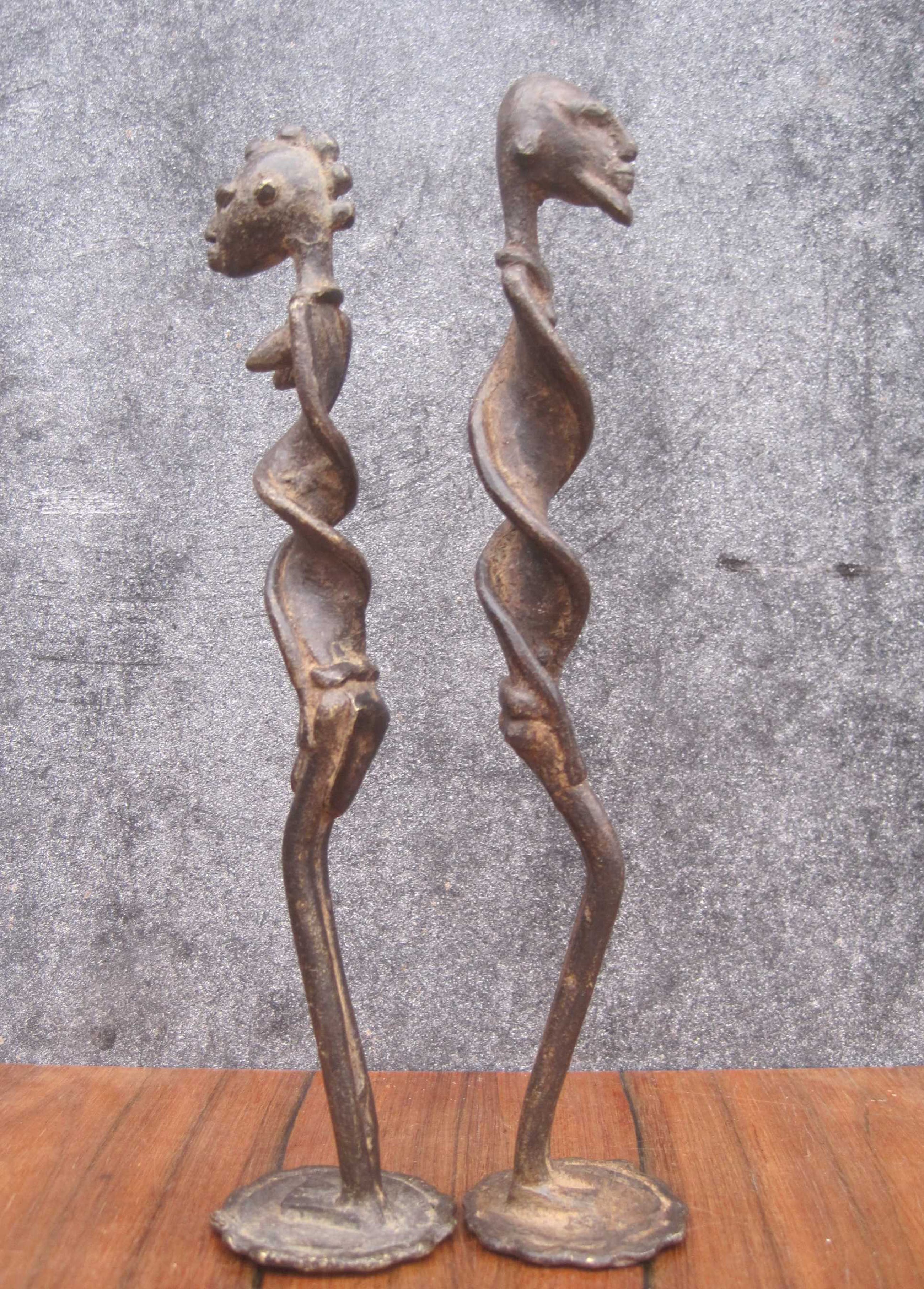 Twee prachtige voorouder beeldjes van het Dogon volk uit Mali in Afrika. Deze beeldjes zijn gegoten uit brons en hebben een mooi donker patina. Ze zijn zorgvuldig afgewerkt. Door hun speciale vorm passen ze ook goed in een modern interieur.