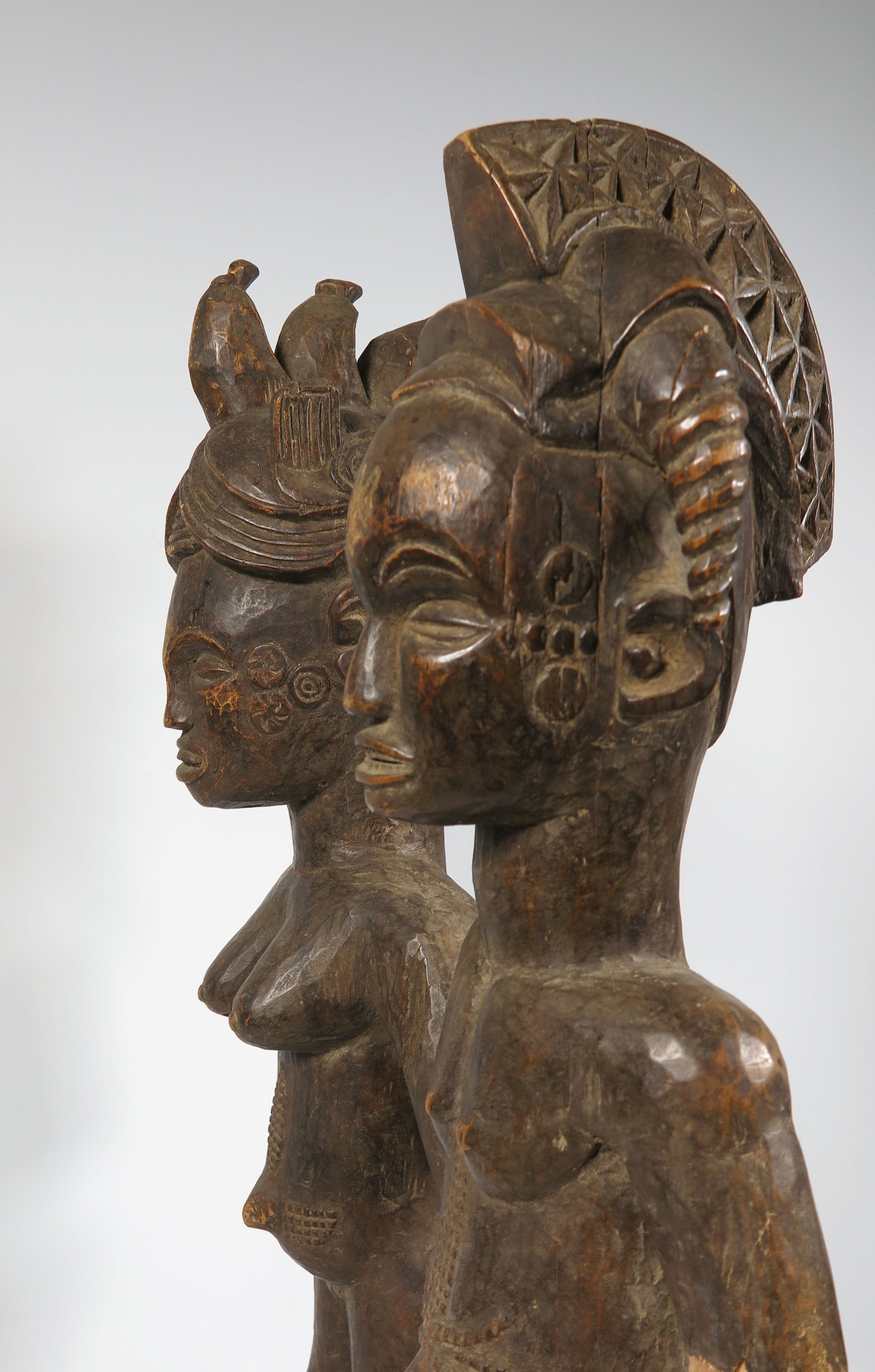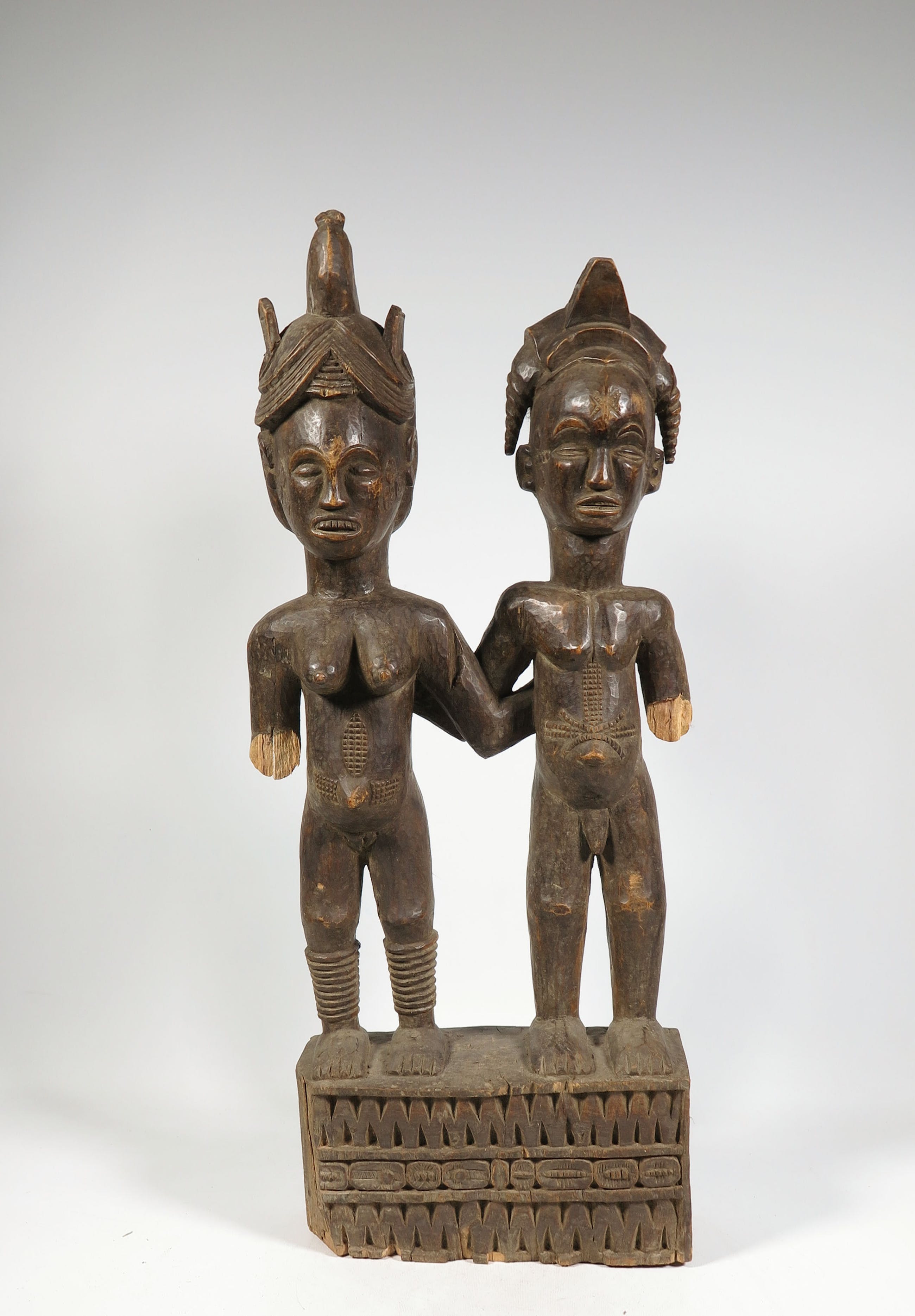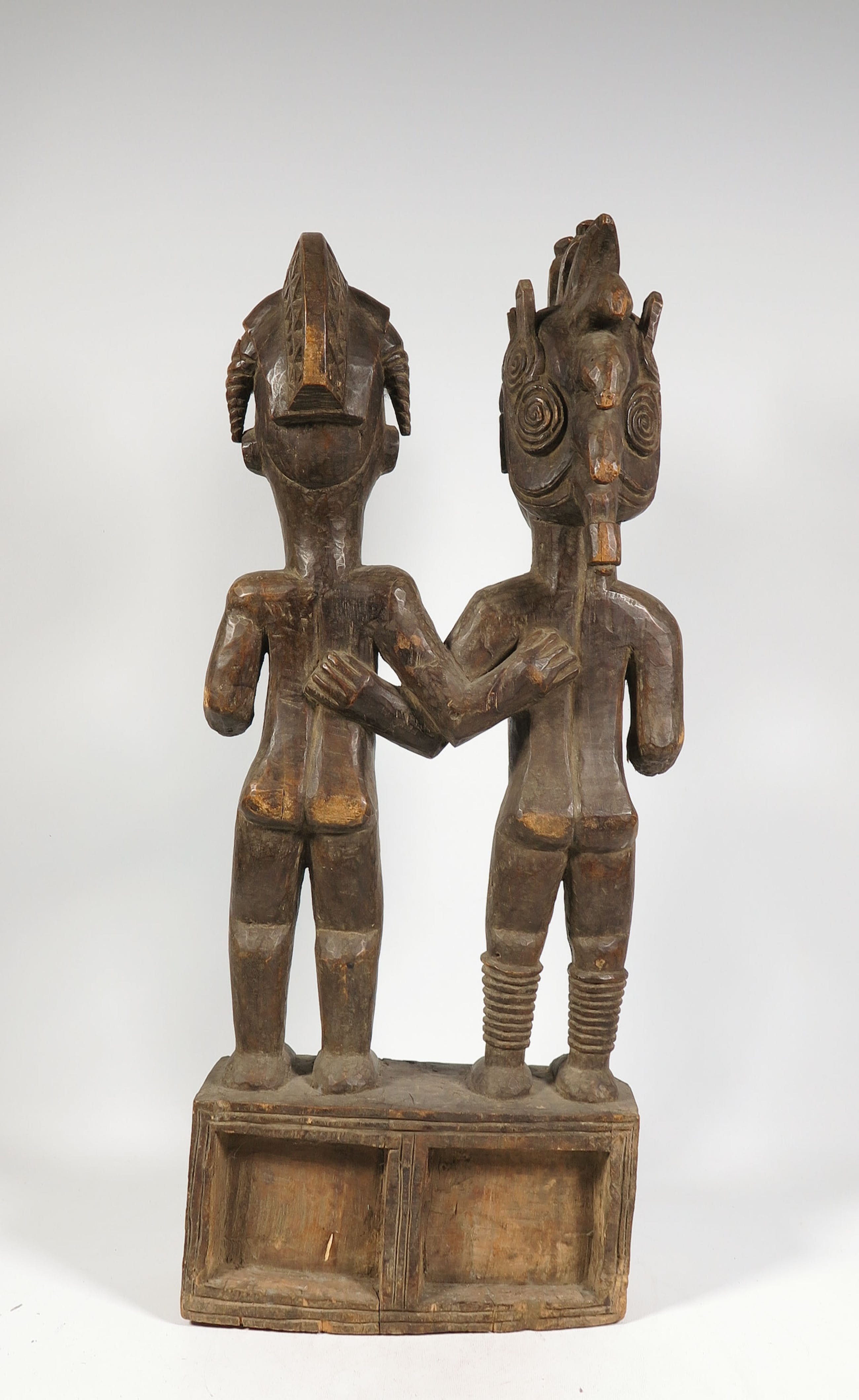 Houten gestoken altaarornament bekroond met staand gearmd man- en vrouwfiguur, beiden aangekleed met hoofdtooi.