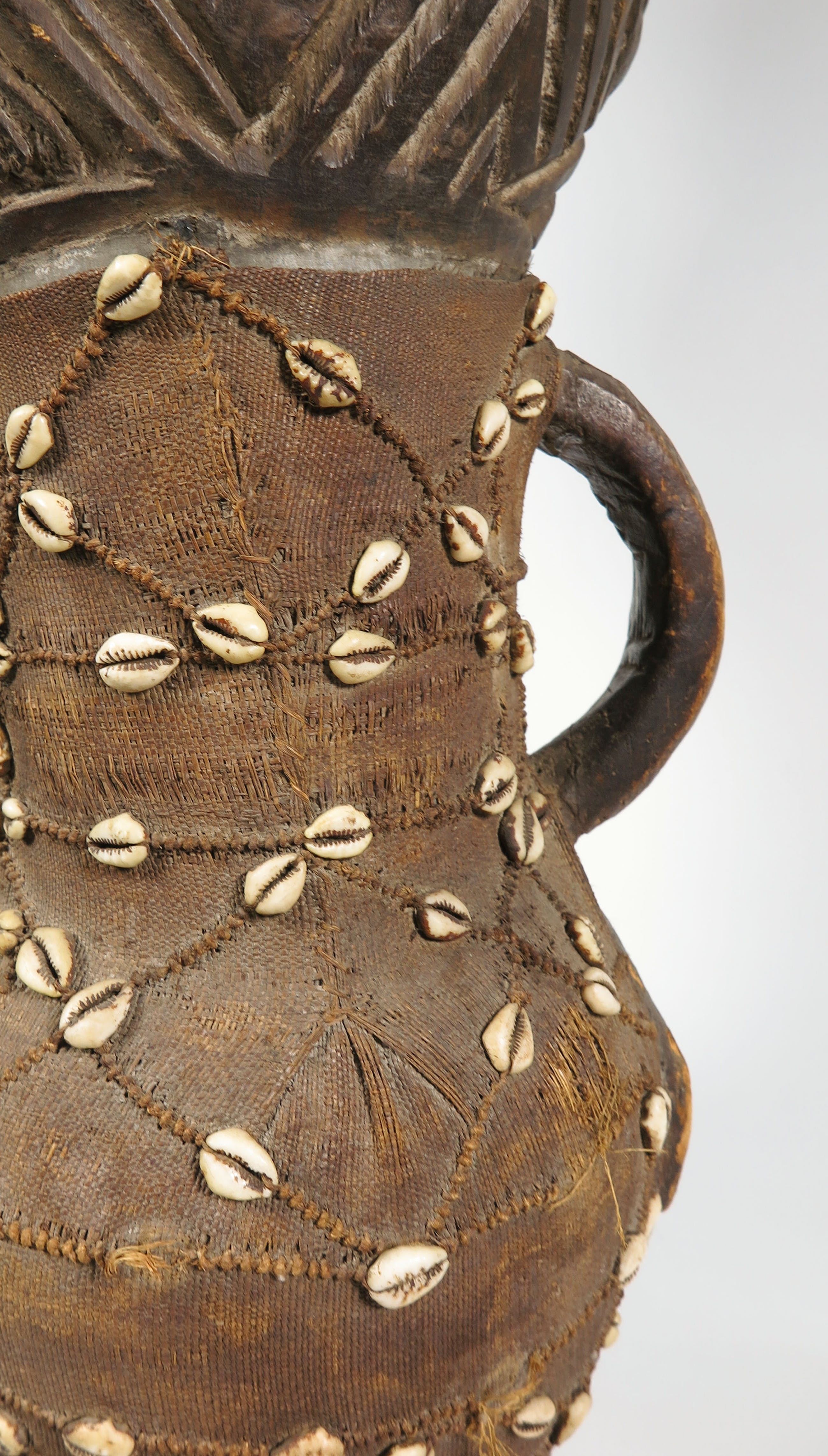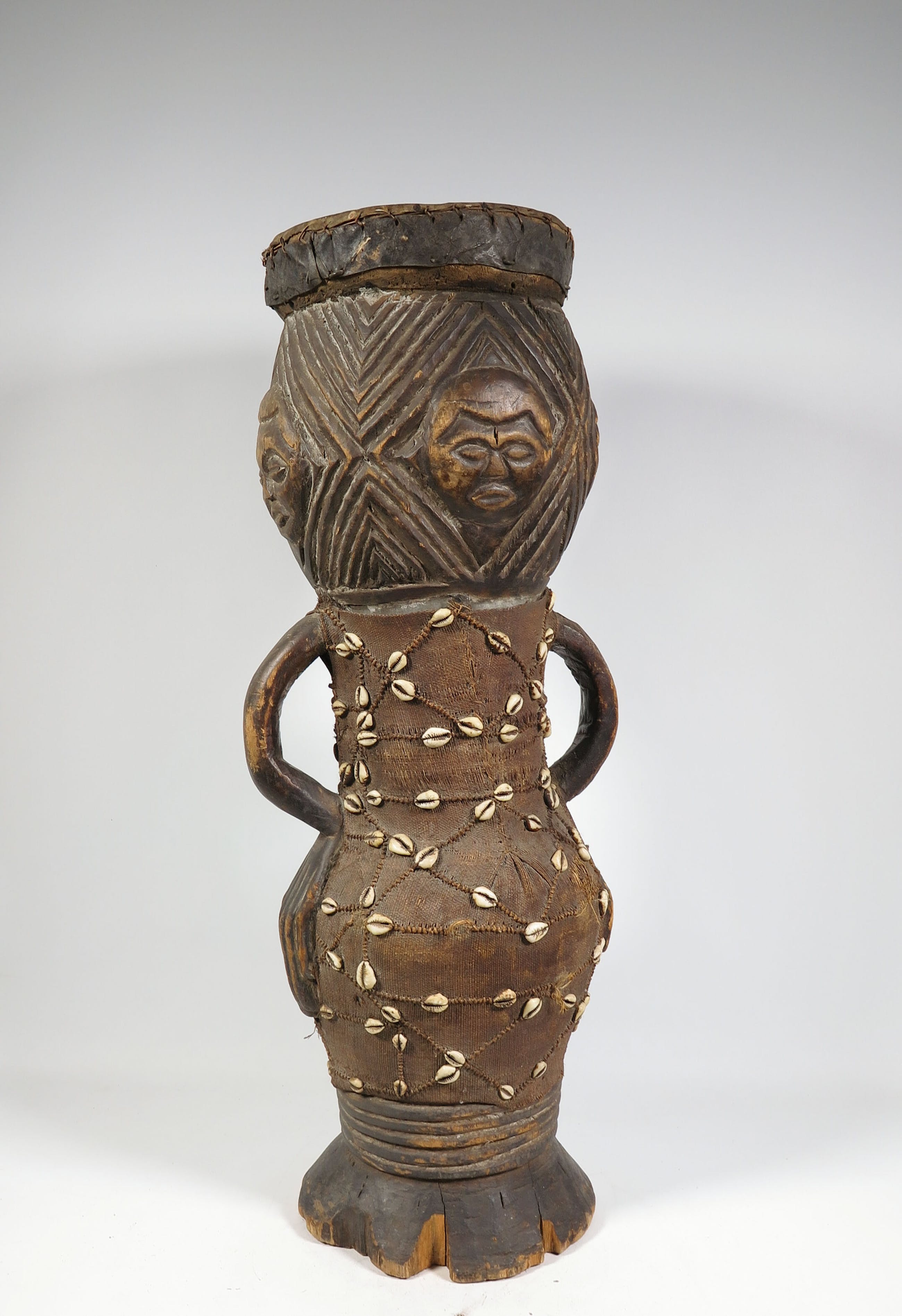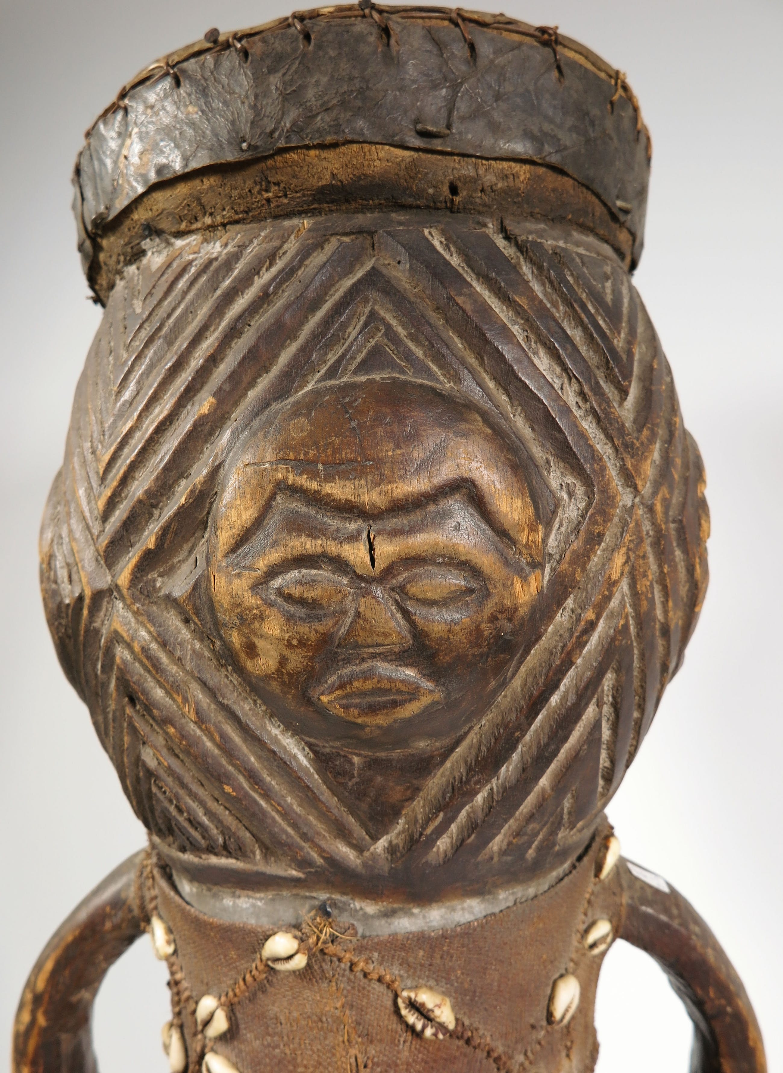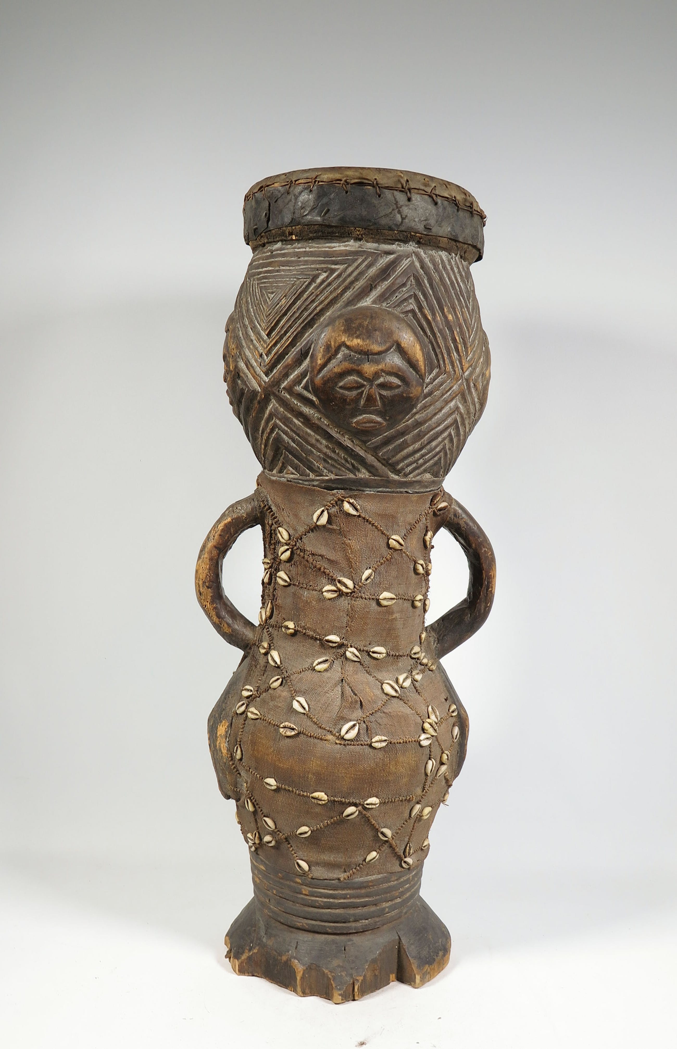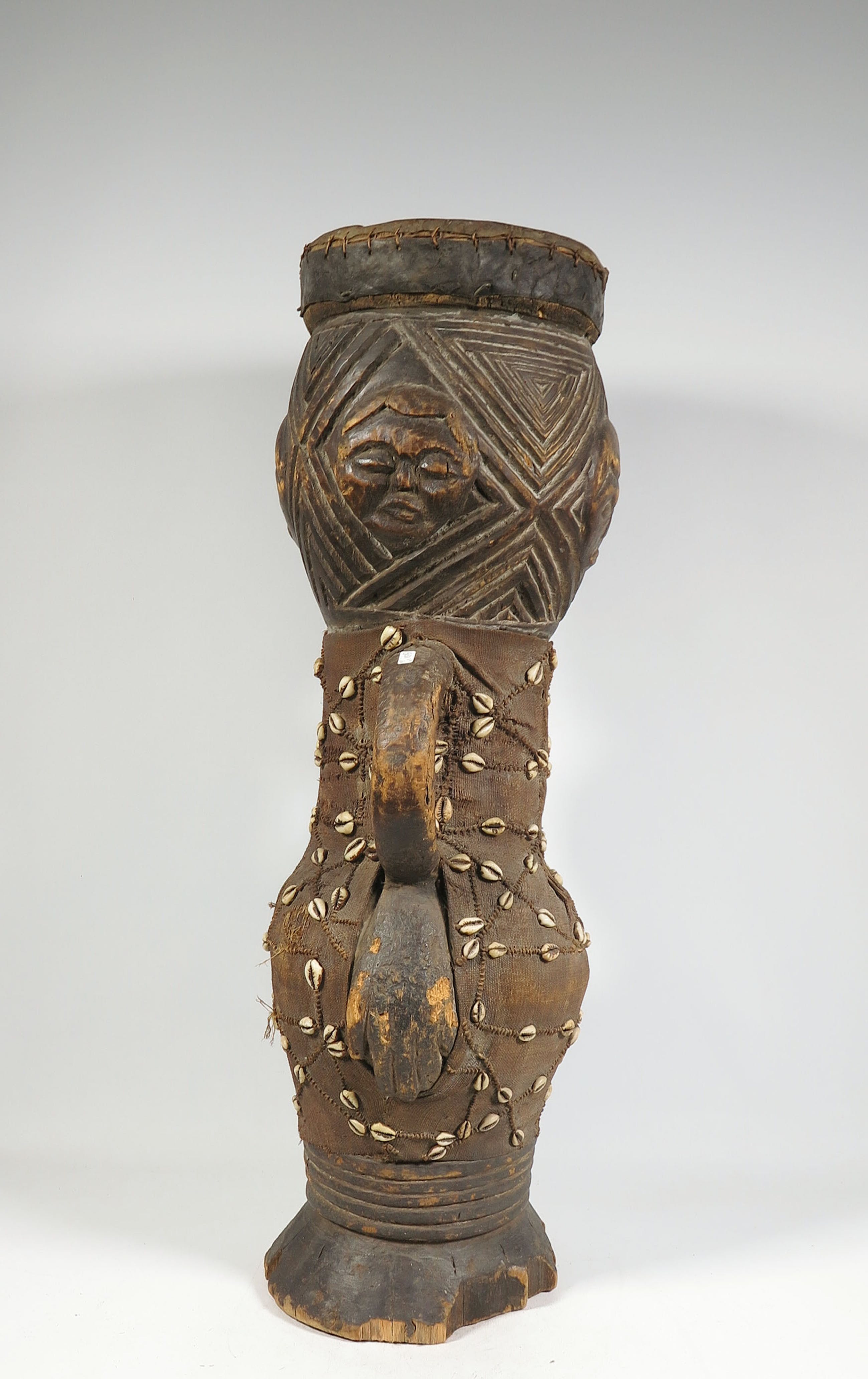 Houten gestoken trommel met lederen membraan en met kauri-schelpen versierd lichaam.