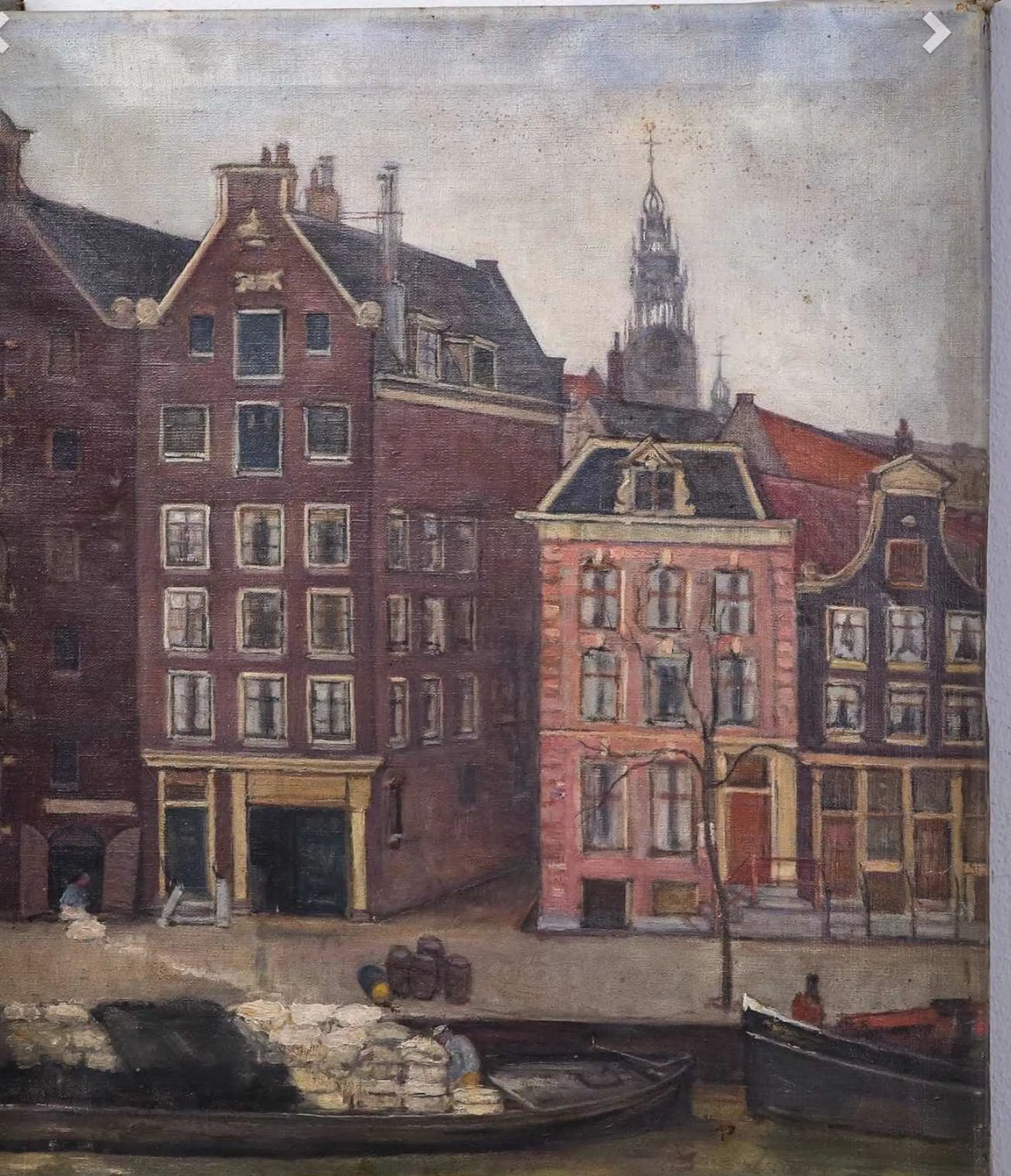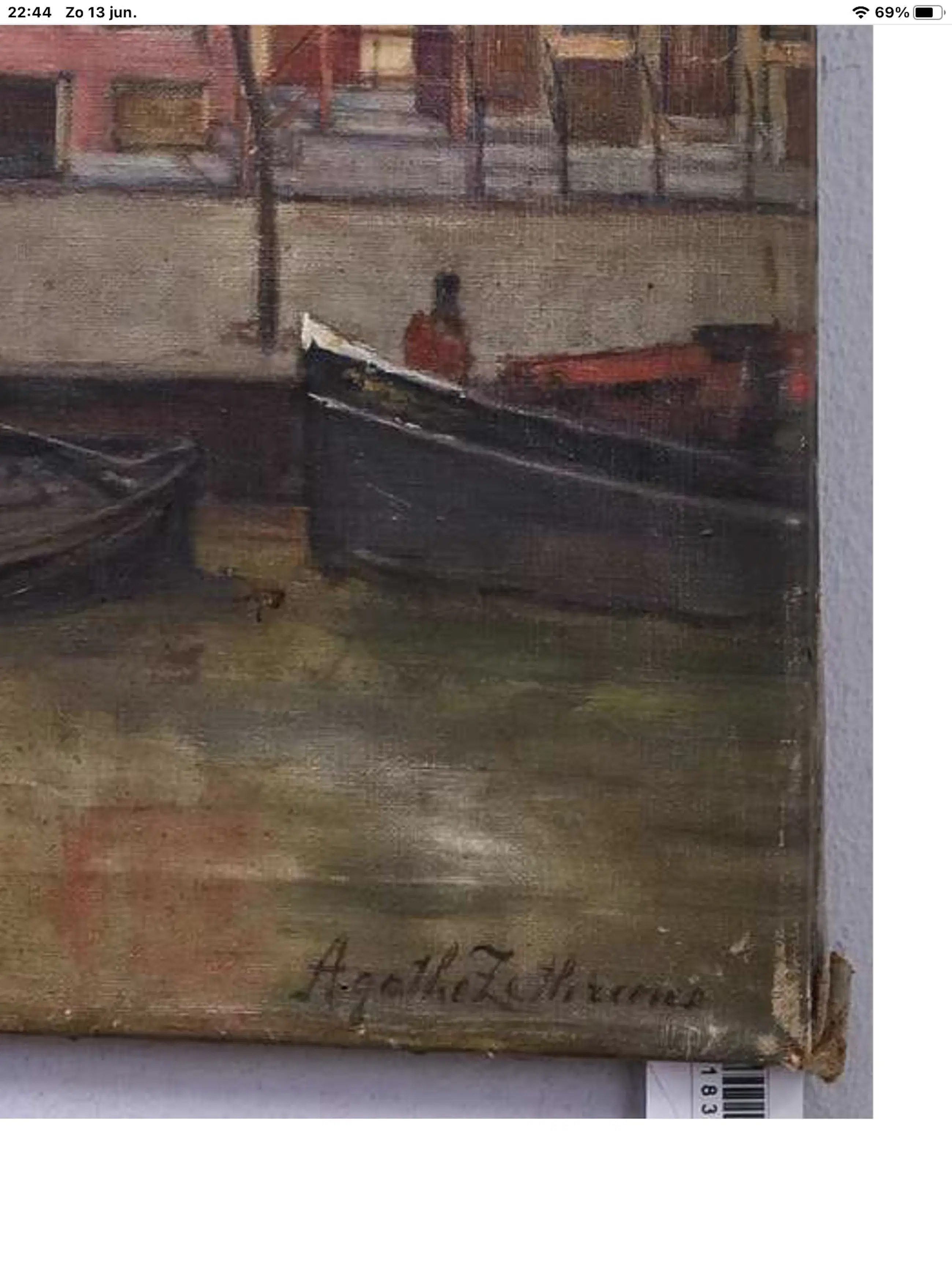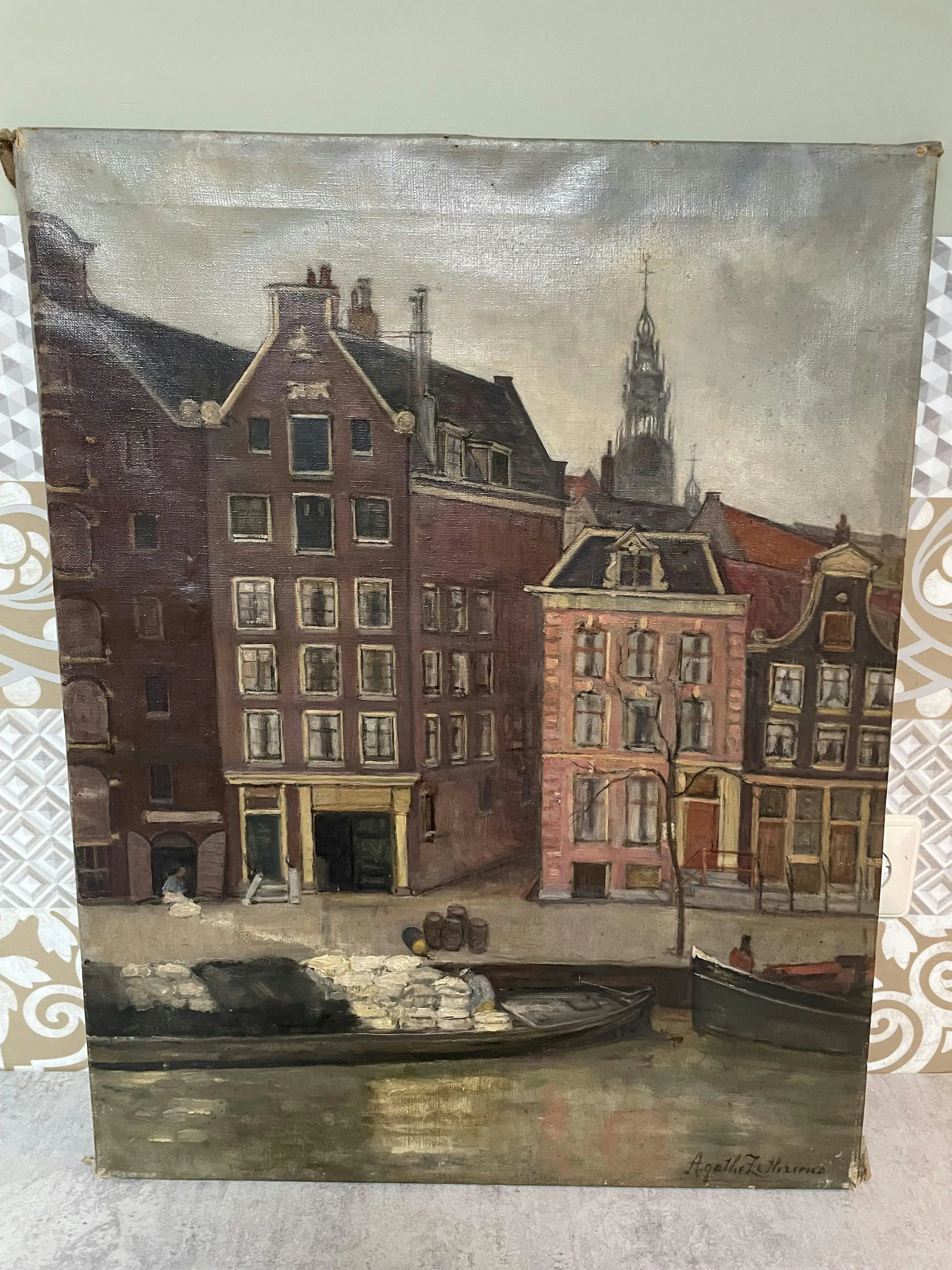 Mooi stadsgezicht van de bekende kunsternaares Agatha Zethraeus 1872-1966 Ze was een Zweeds Nederlandse kunstenaares geboren in Amsterdam. Ze was een leerling en goede vriendin van Piet Mondriaan en legde zich toe op voornamelijk stadsgezichten van Amsterdam. Het schilderij is wat beschadigd op de hoeken zie foto,s