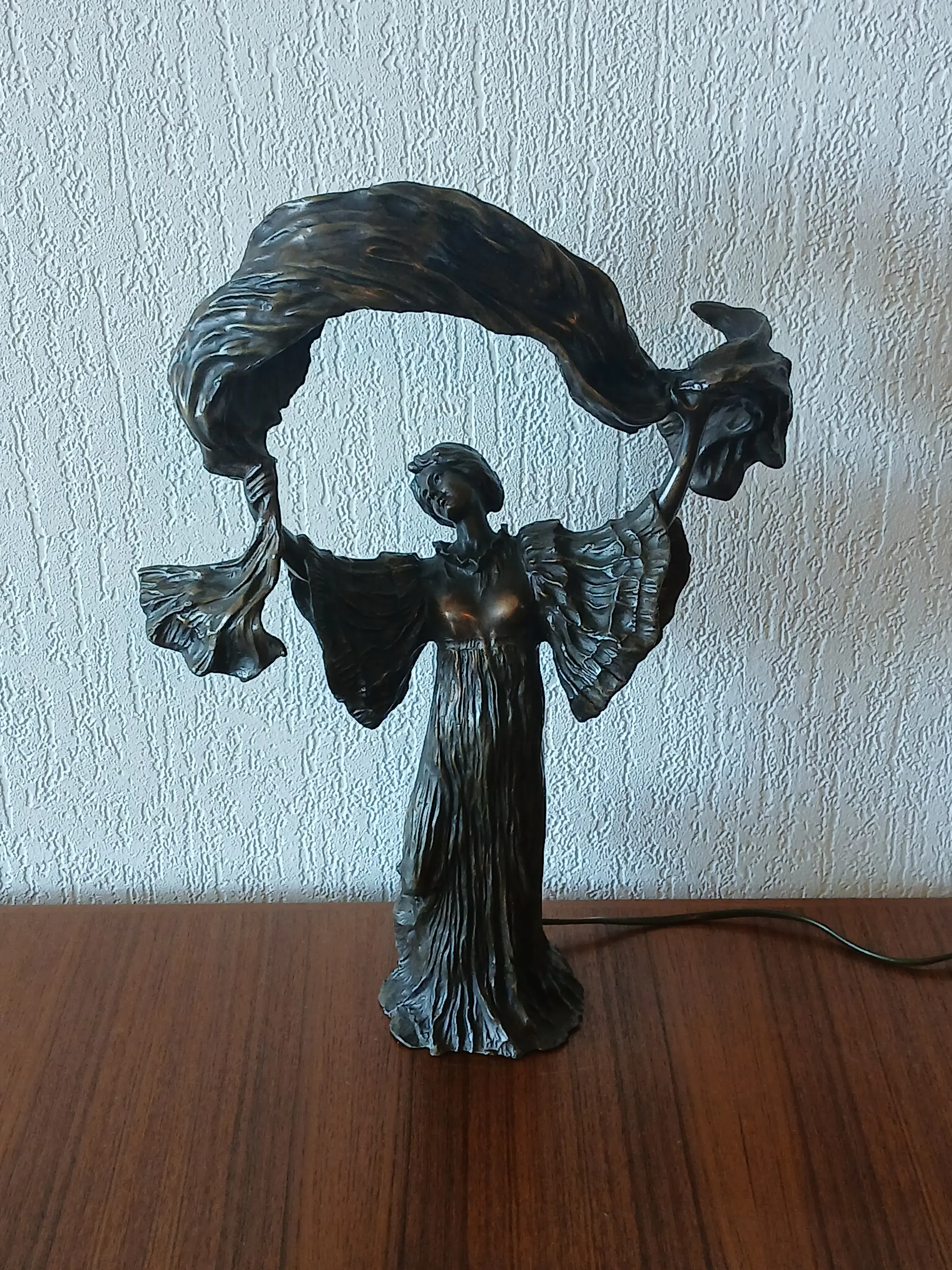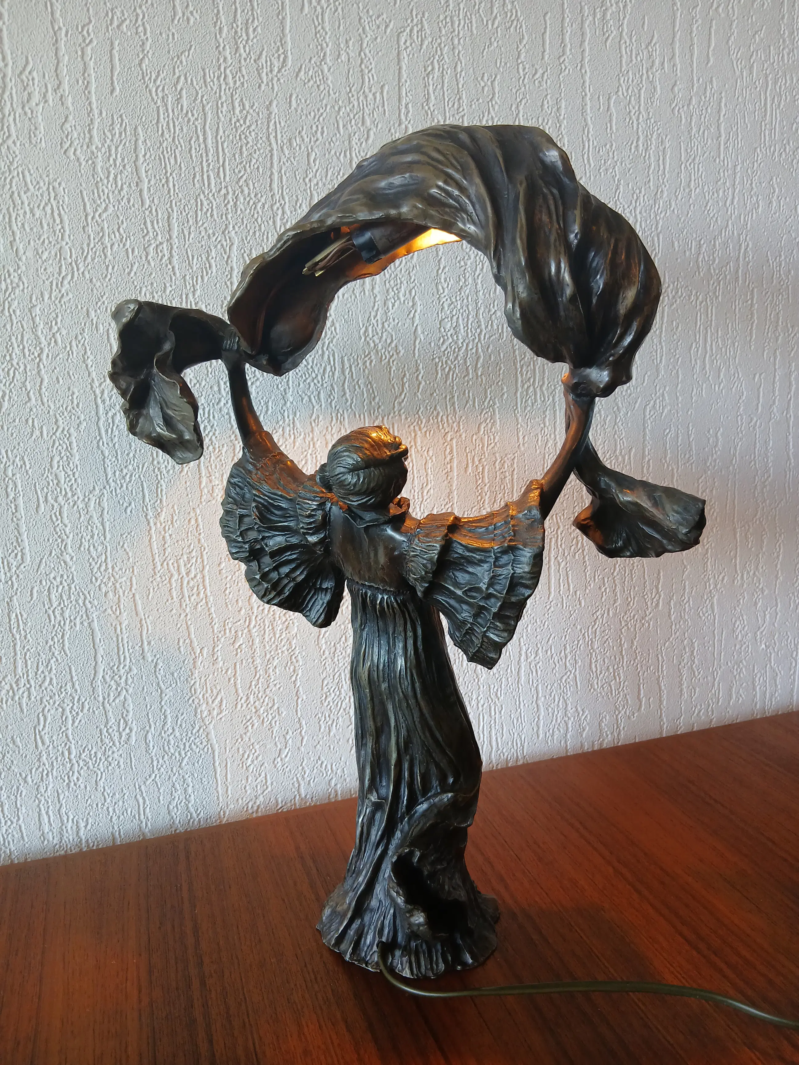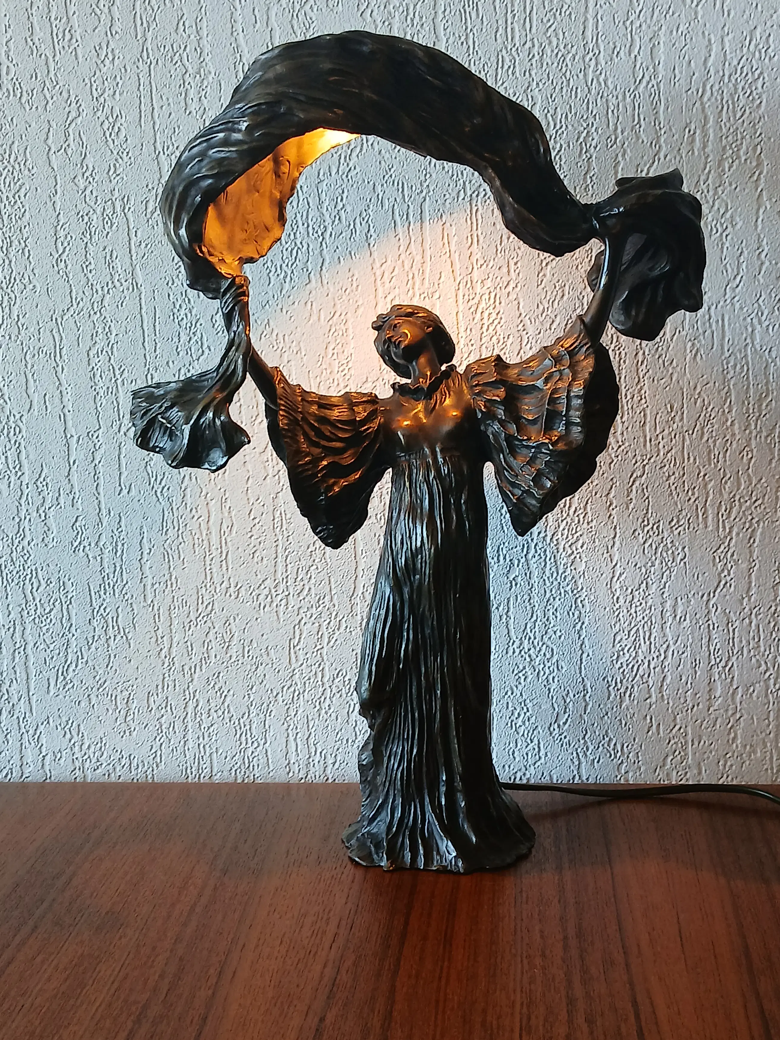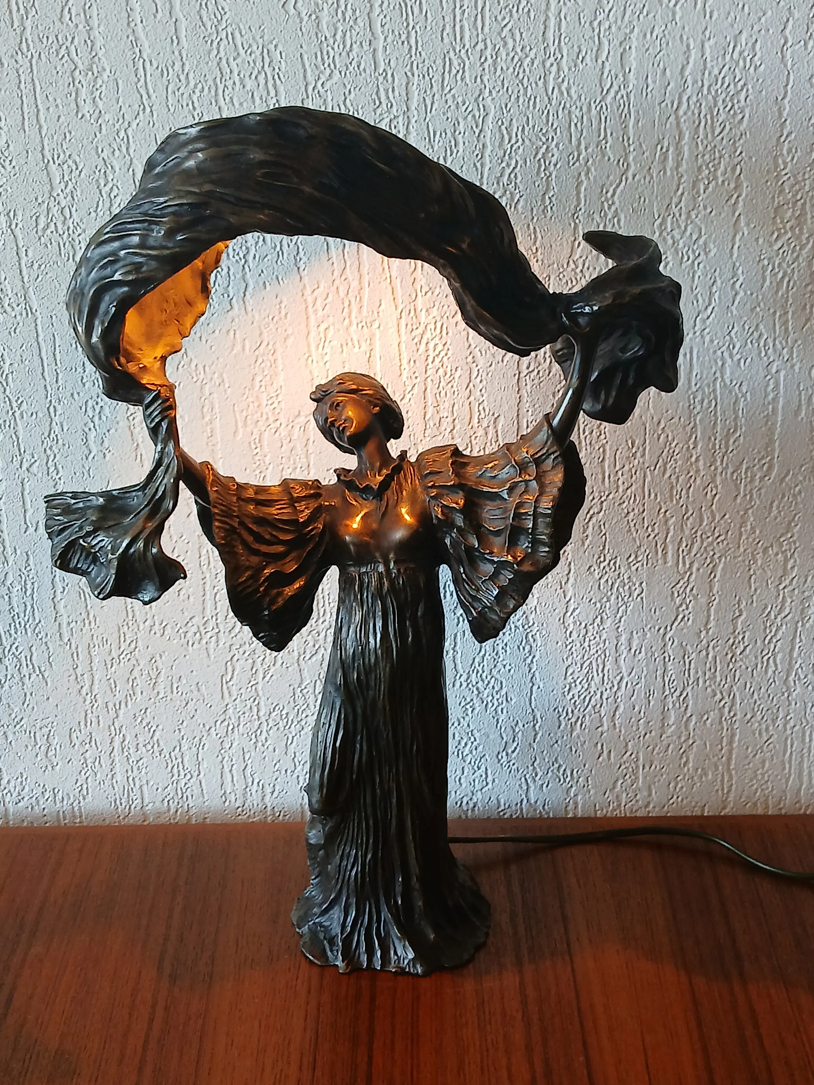 De lamp stelt Loîe Fuller voor, geboren 15 januari 1862, overleden 1 januari 1928, zij was een Amerikaanse danseres en actrice , actief in Frankrijk , een pionier in moderne hedendaagse dans. Zij gebruikte doeken bedekt met radioactieve stoffen om kleurrijke effecten op het podium te creëren.