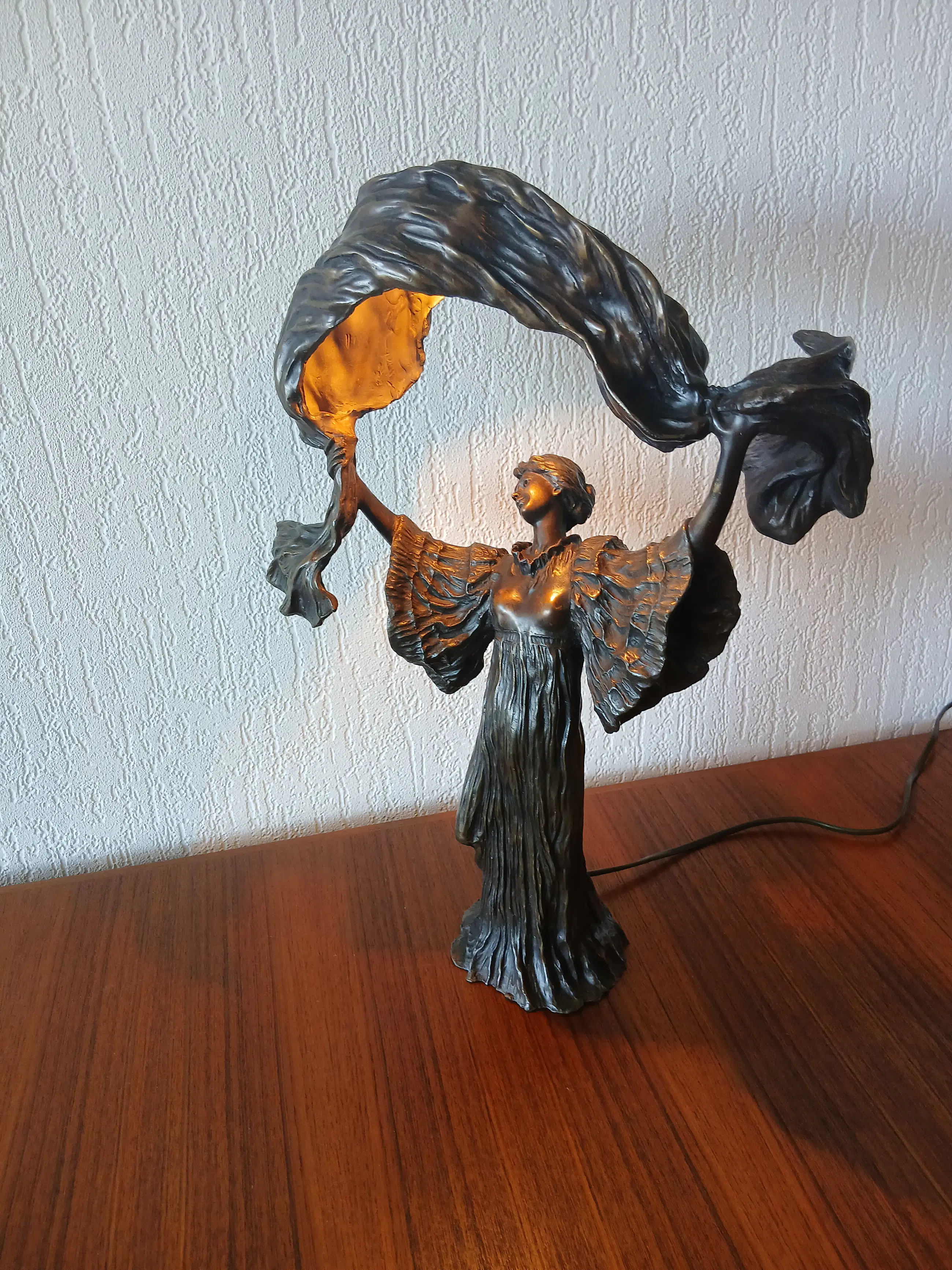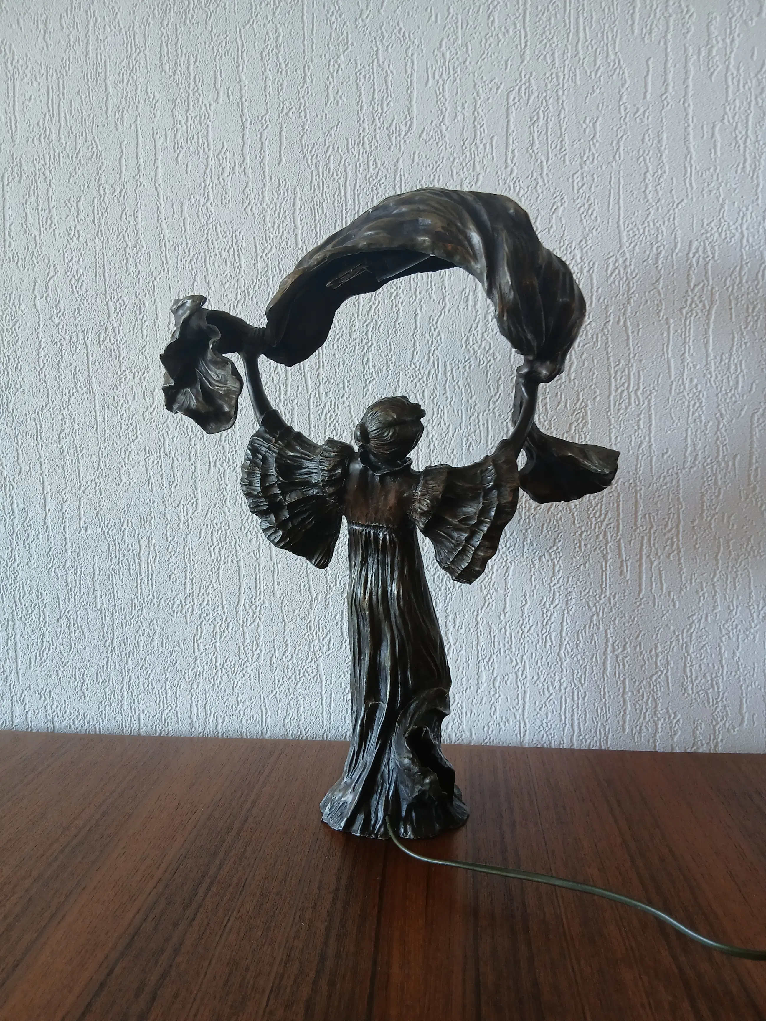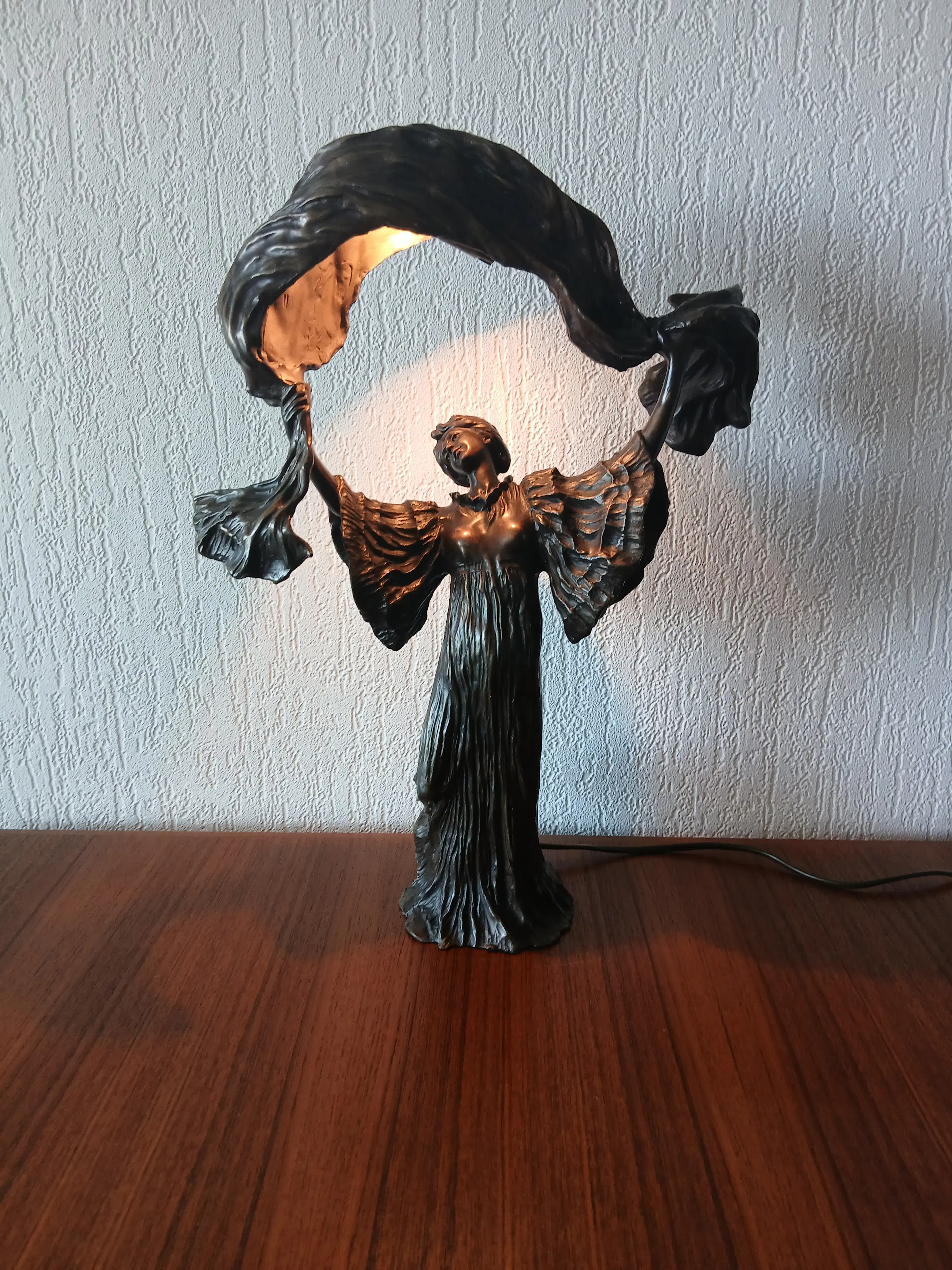 De lamp stelt Loîe Fuller voor, geboren 15 januari 1862, overleden 1 januari 1928, zij was een Amerikaanse danseres en actrice , actief in Frankrijk , een pionier in moderne hedendaagse dans. Zij gebruikte doeken bedekt met radioactieve stoffen om kleurrijke effecten op het podium te creëren.