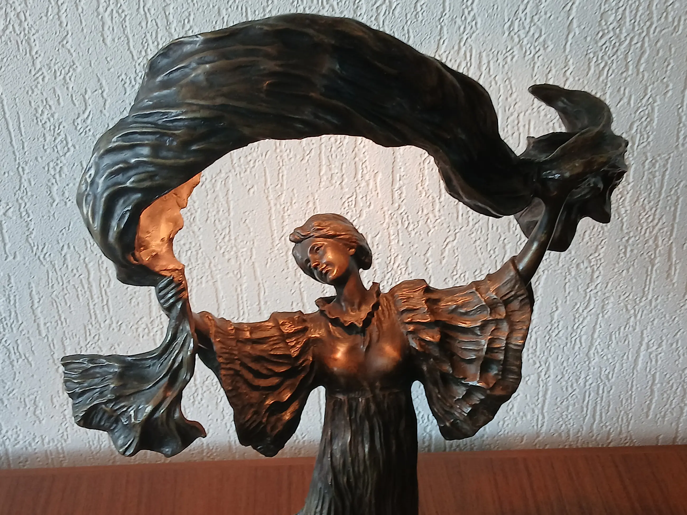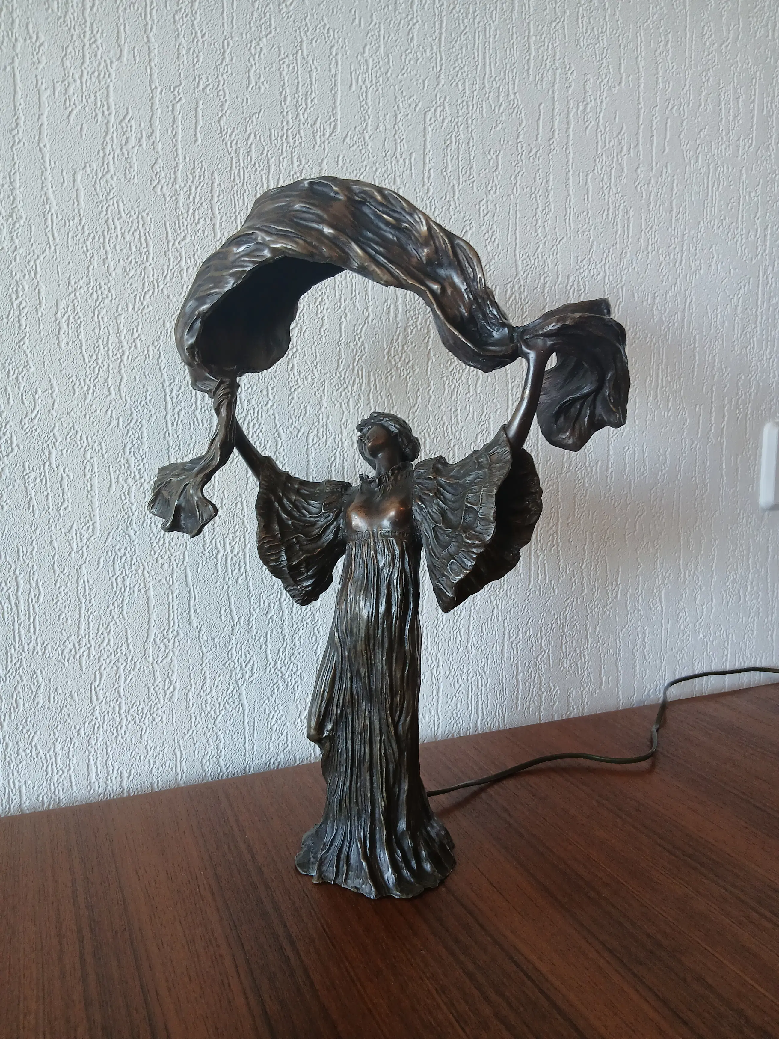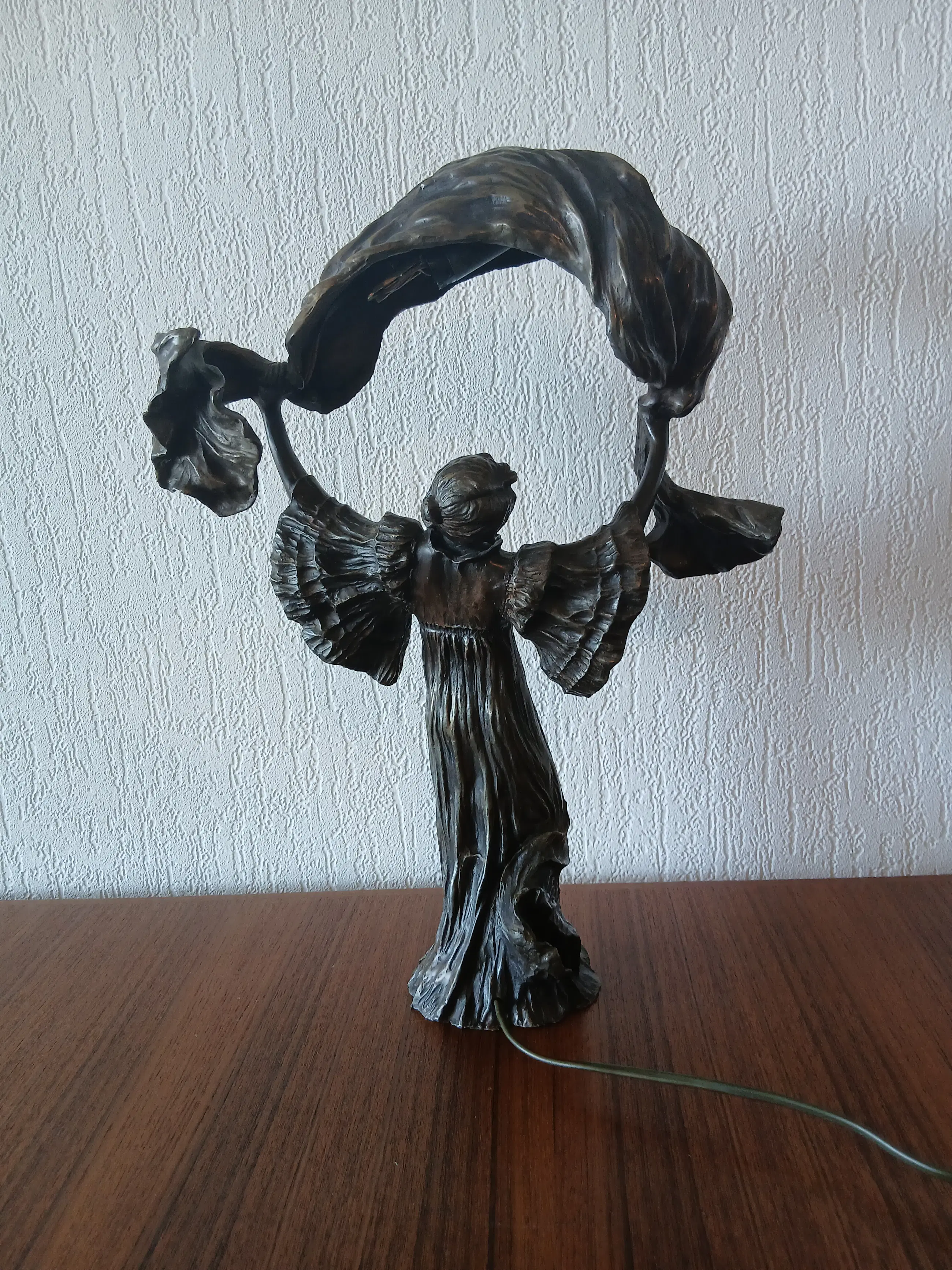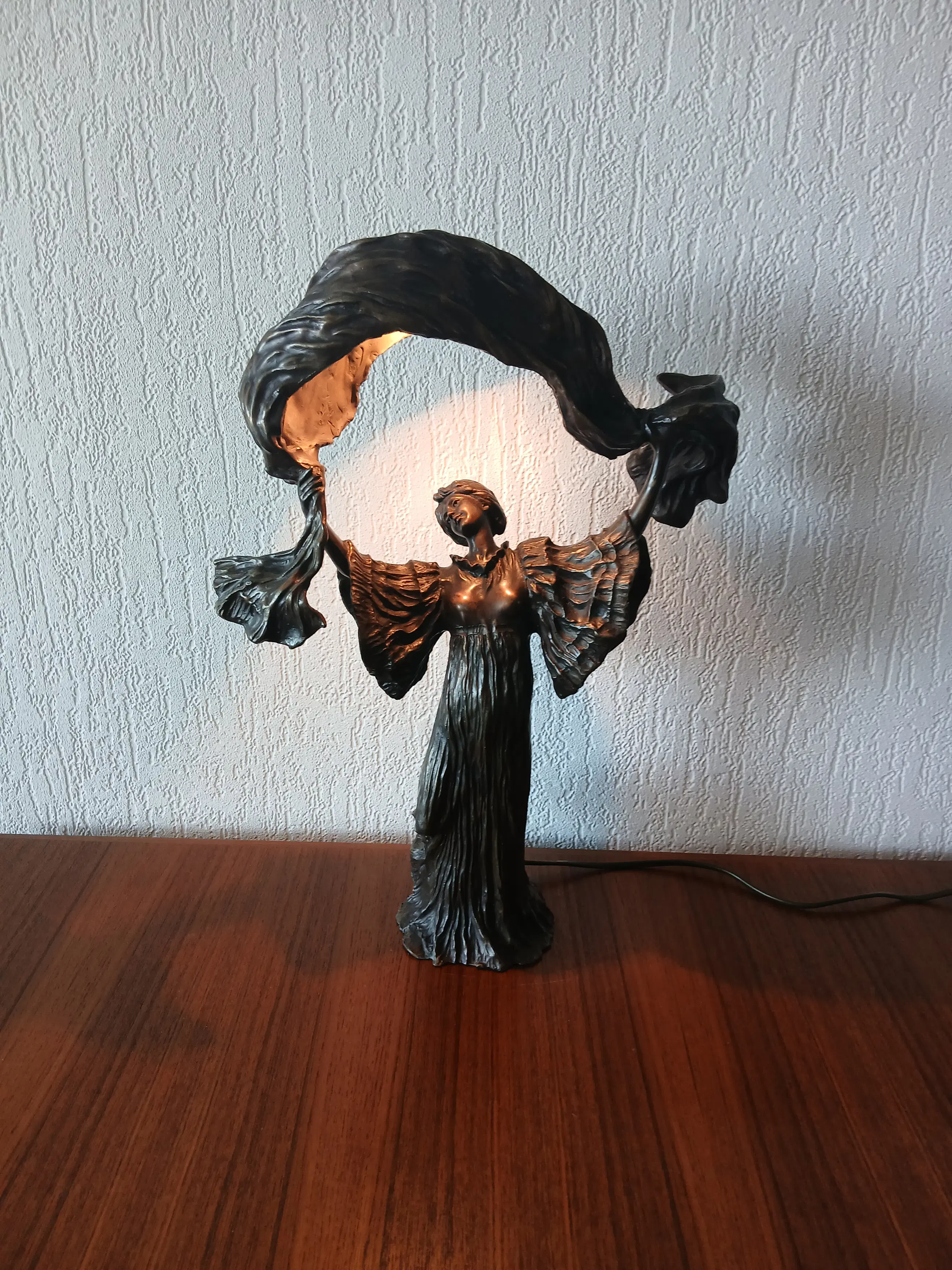 De lamp stelt Loîe Fuller voor, geboren 15 januari 1862, overleden 1 januari 1928, zij was een Amerikaanse danseres en actrice , actief in Frankrijk , een pionier in moderne hedendaagse dans. Zij gebruikte doeken bedekt met radioactieve stoffen om kleurrijke effecten op het podium te creëren.